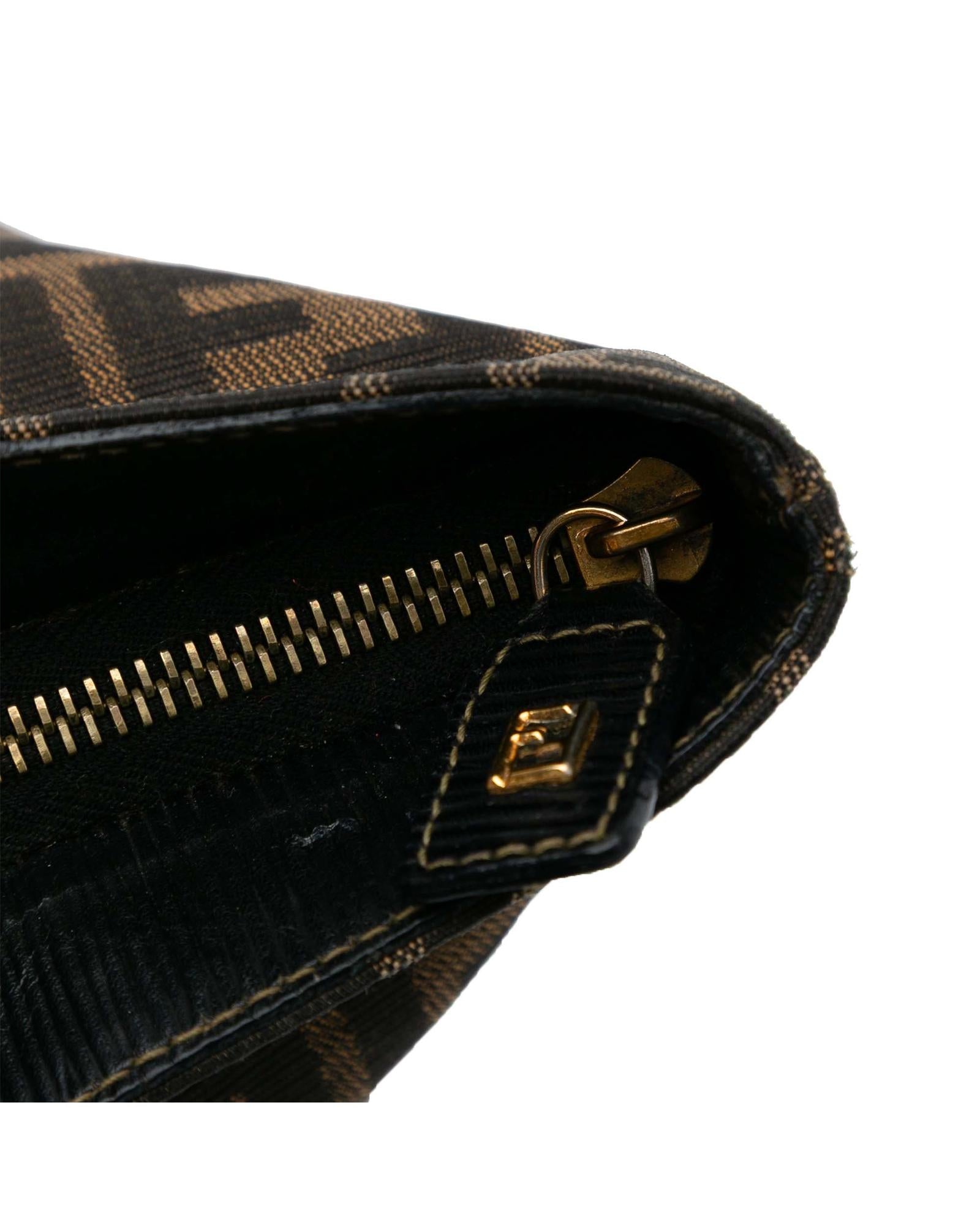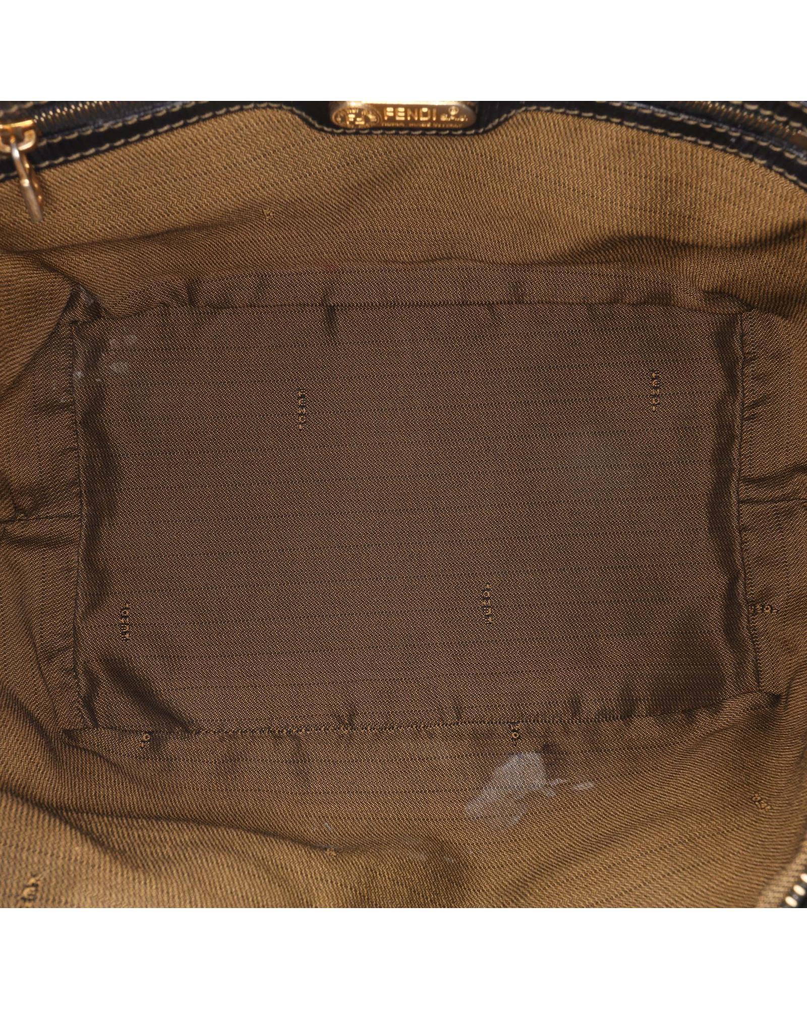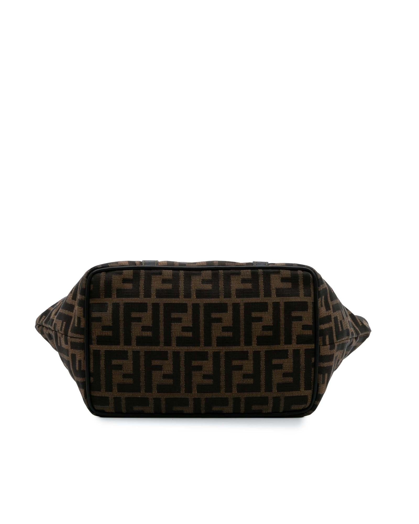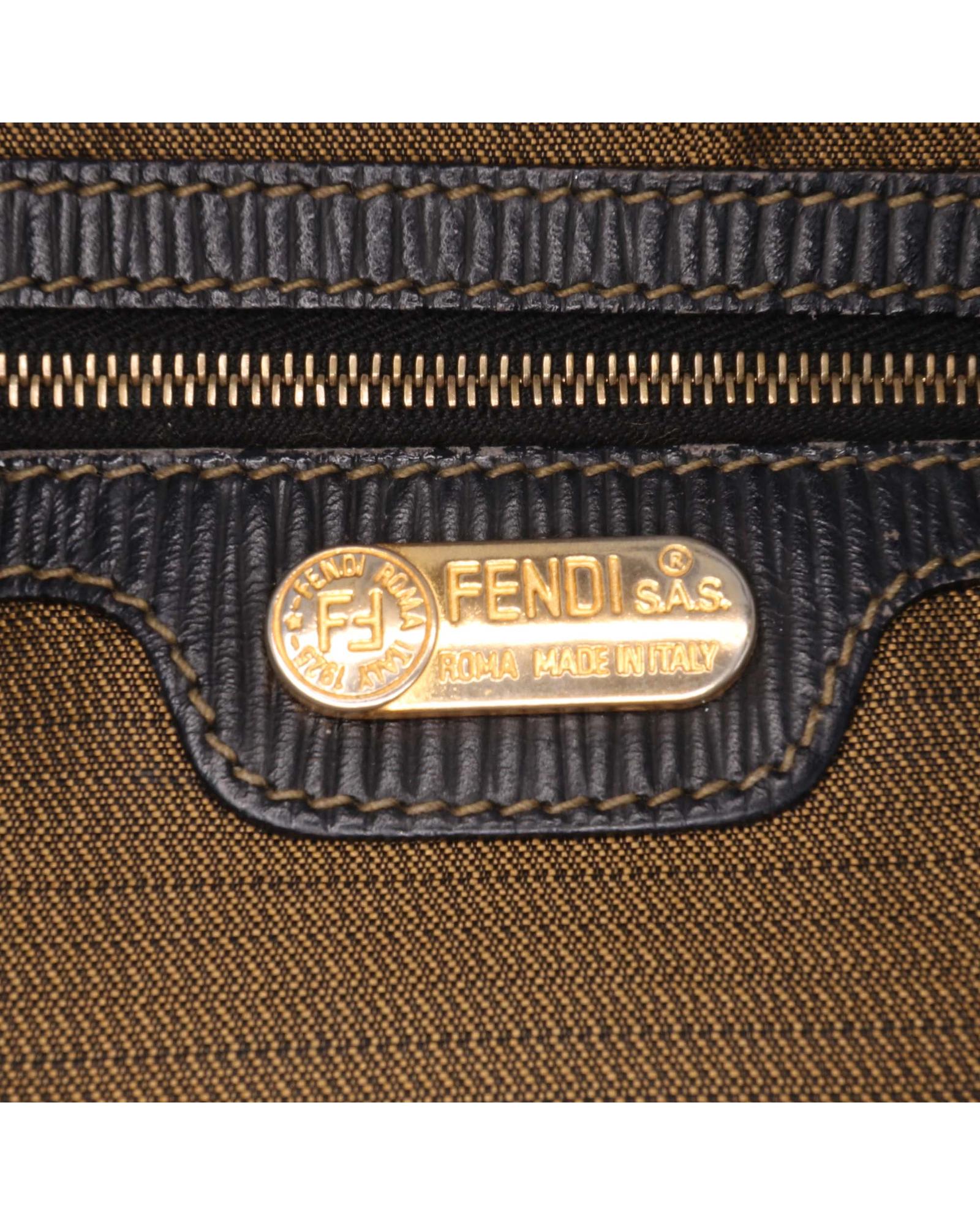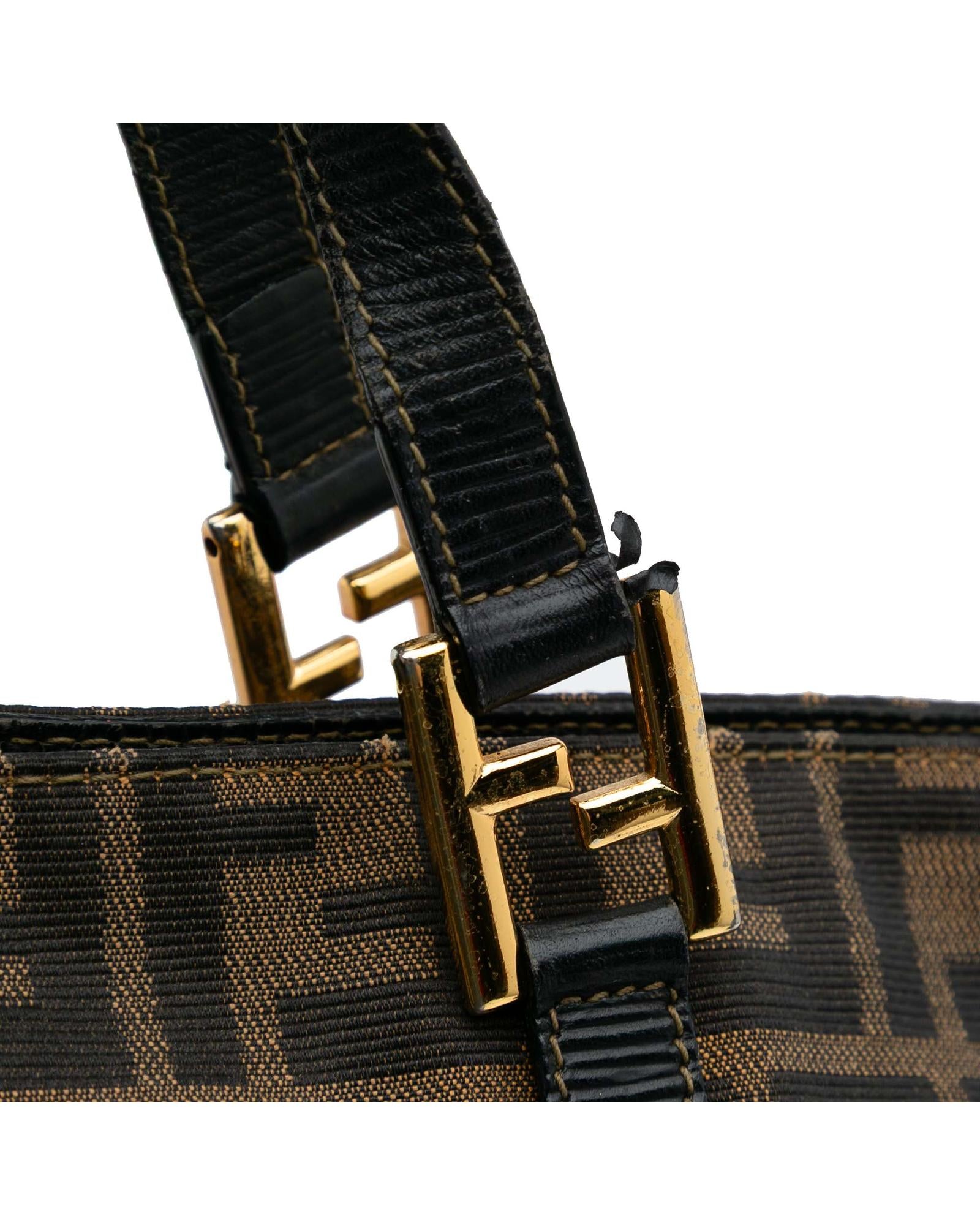 This tote bag features a canvas body with leather trim flat leather handles a top zip closure and an interior zip pocket.Brand: Fendi