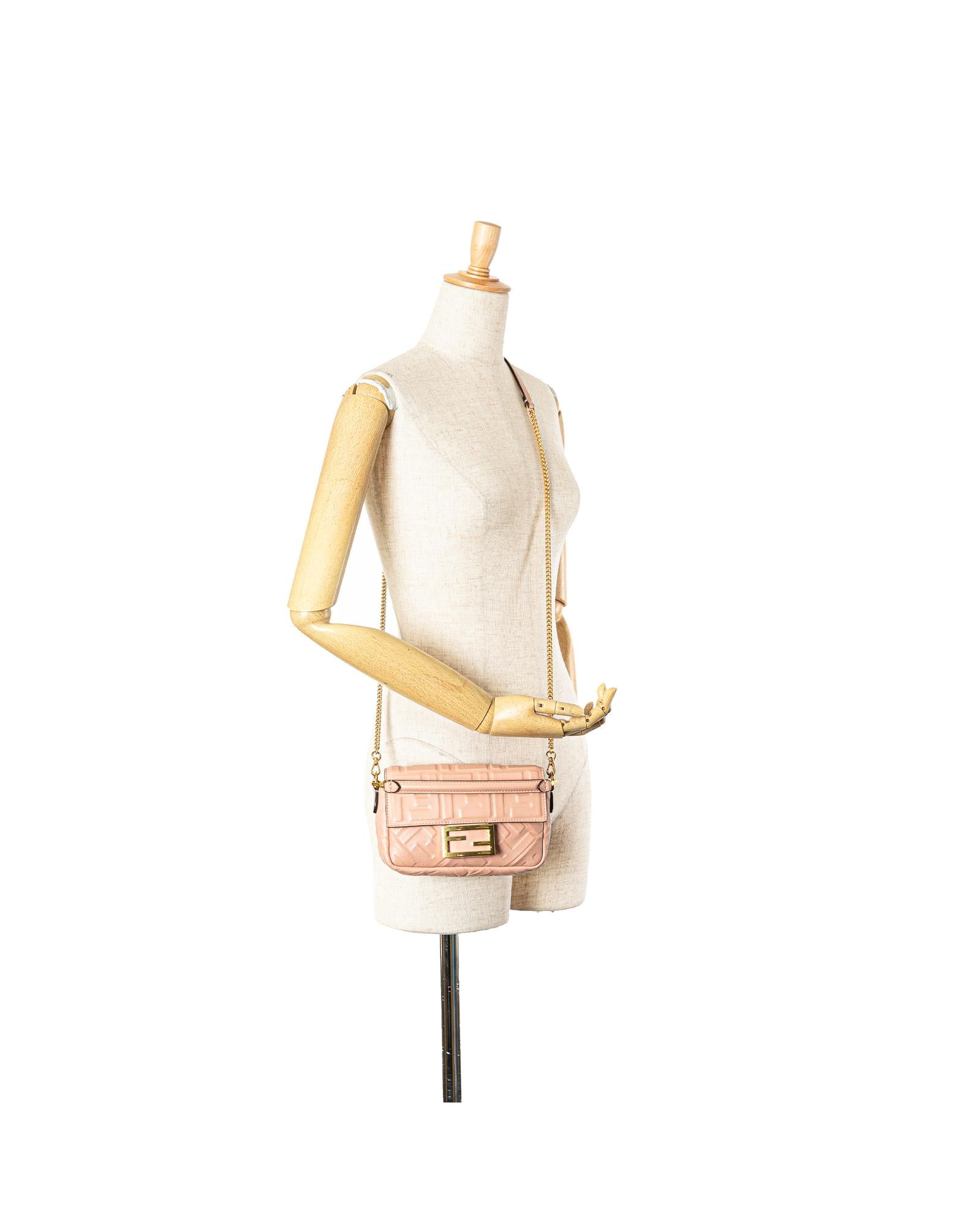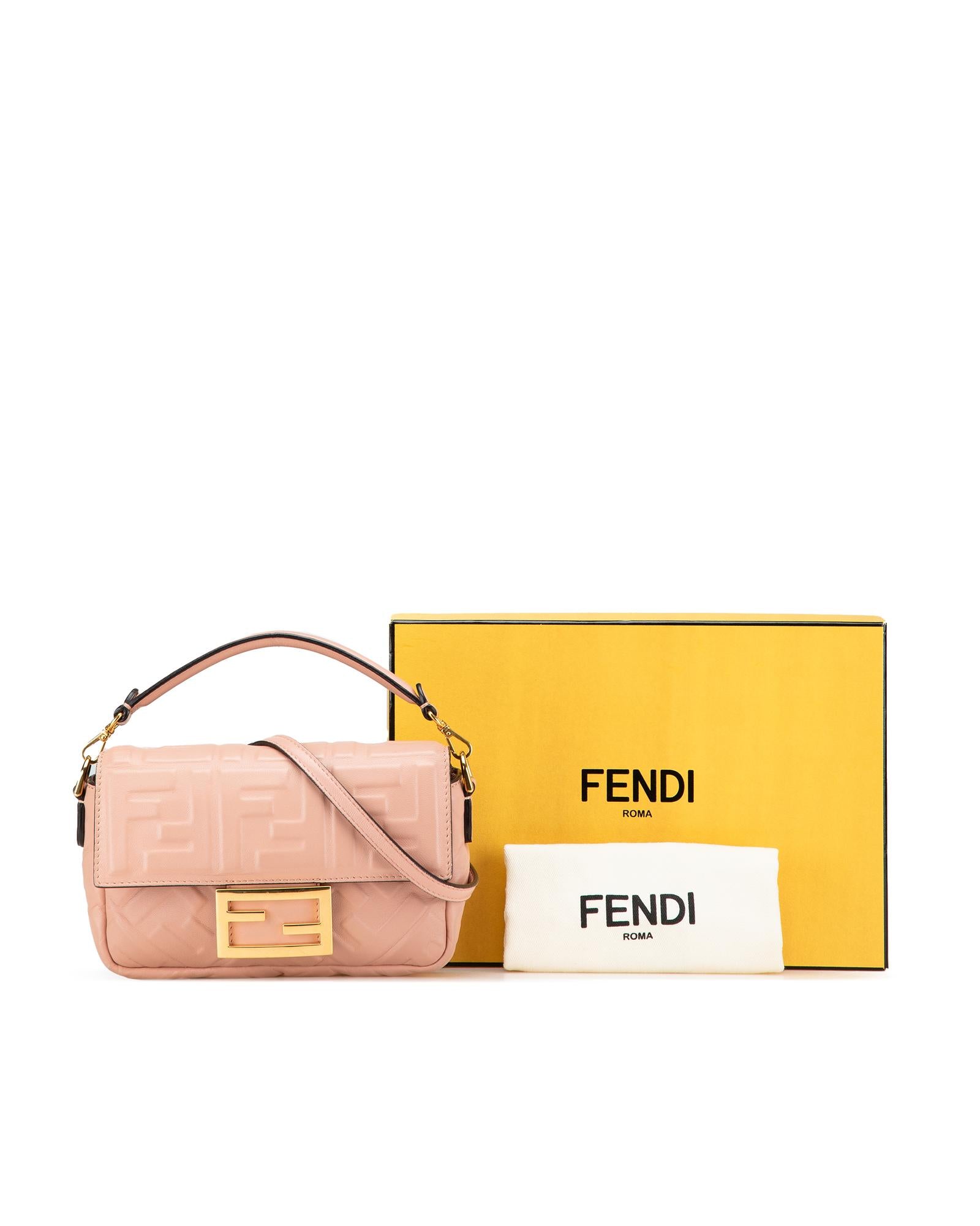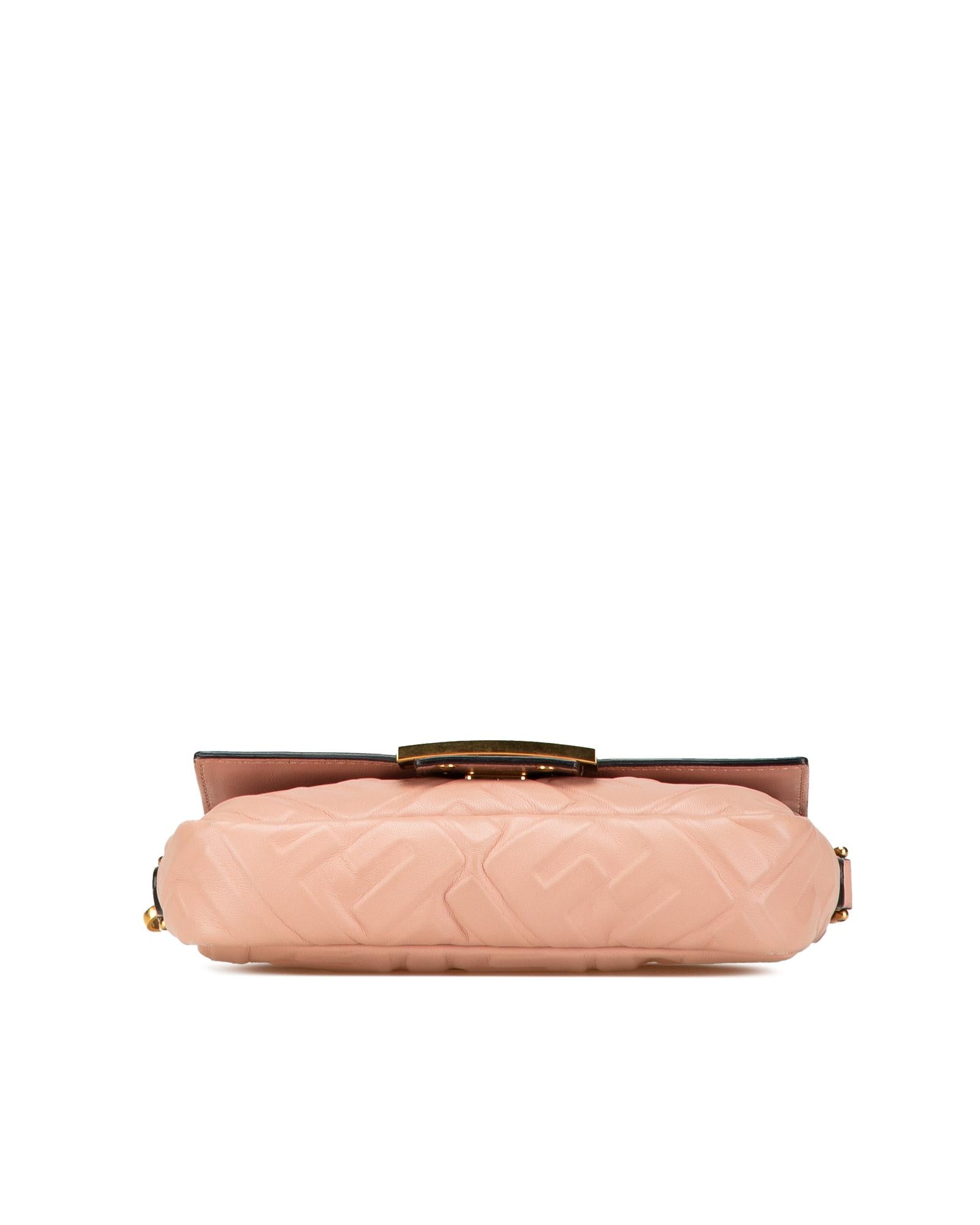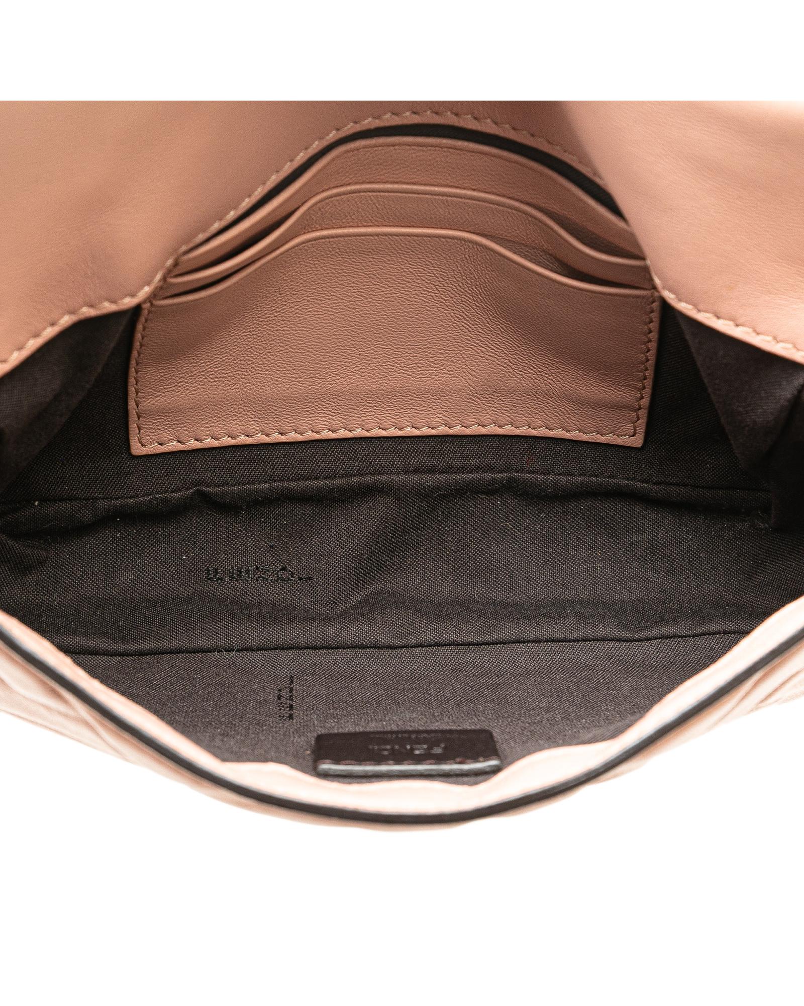The Baguette features an embossed leather body a detachable flat leather handle a detachable chain link strap with leather guard a front flap with magnetic snap closure and interior slip pockets.