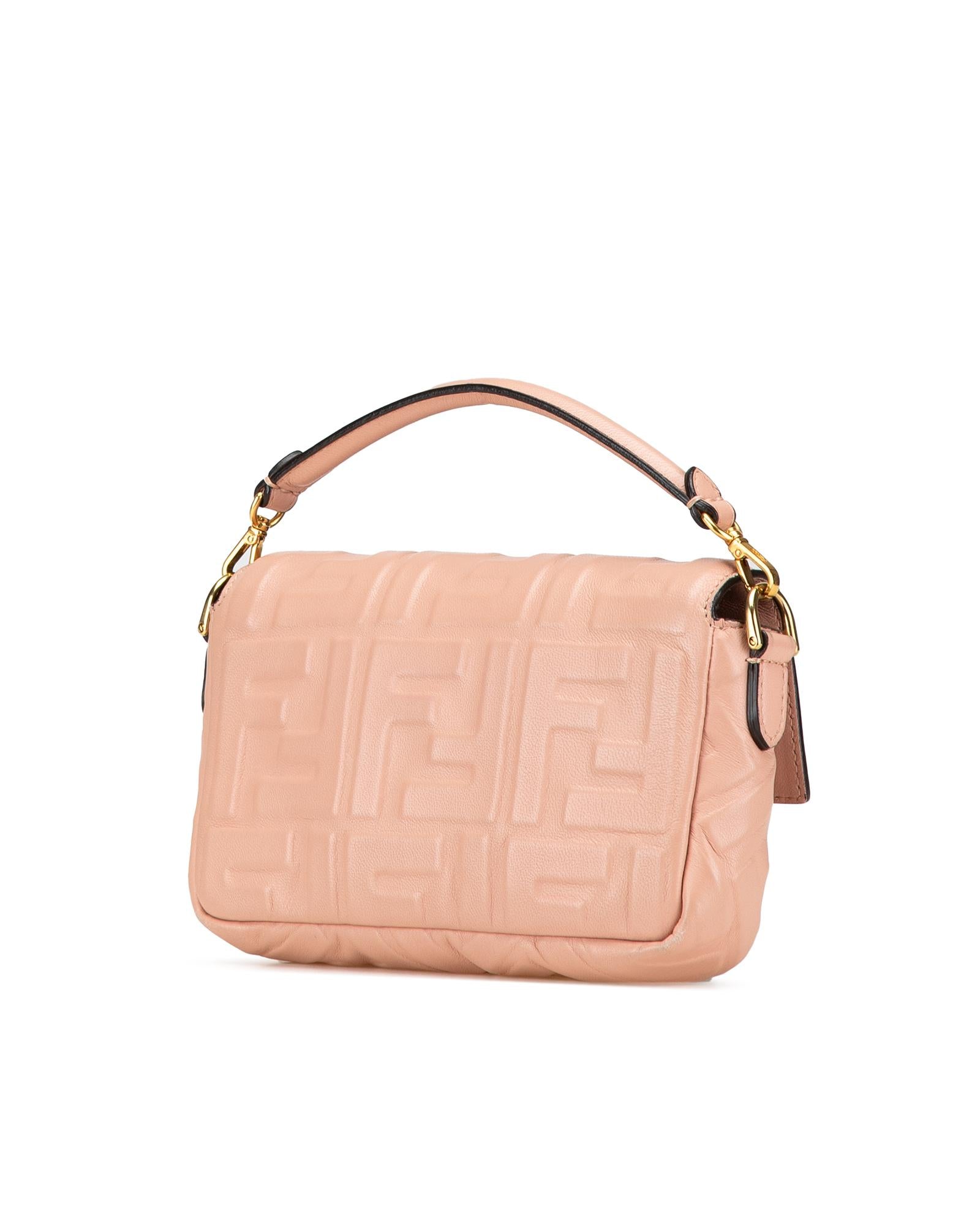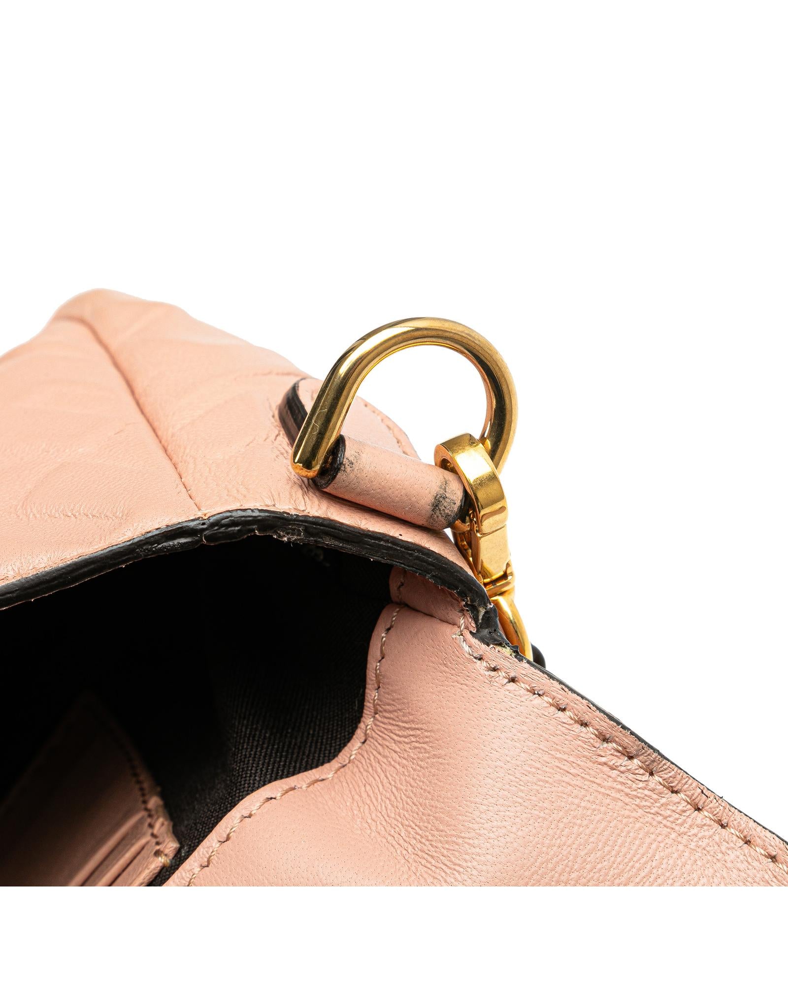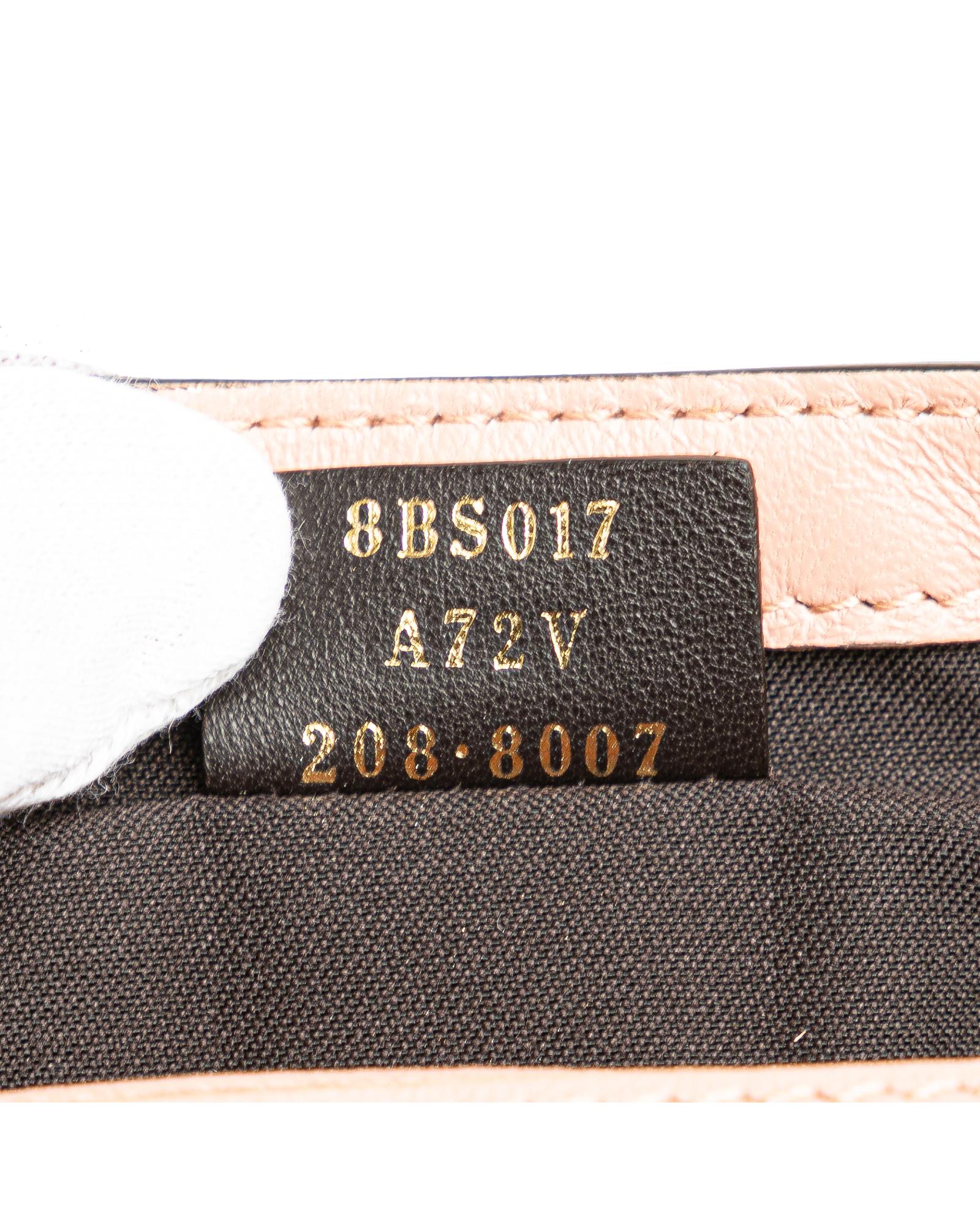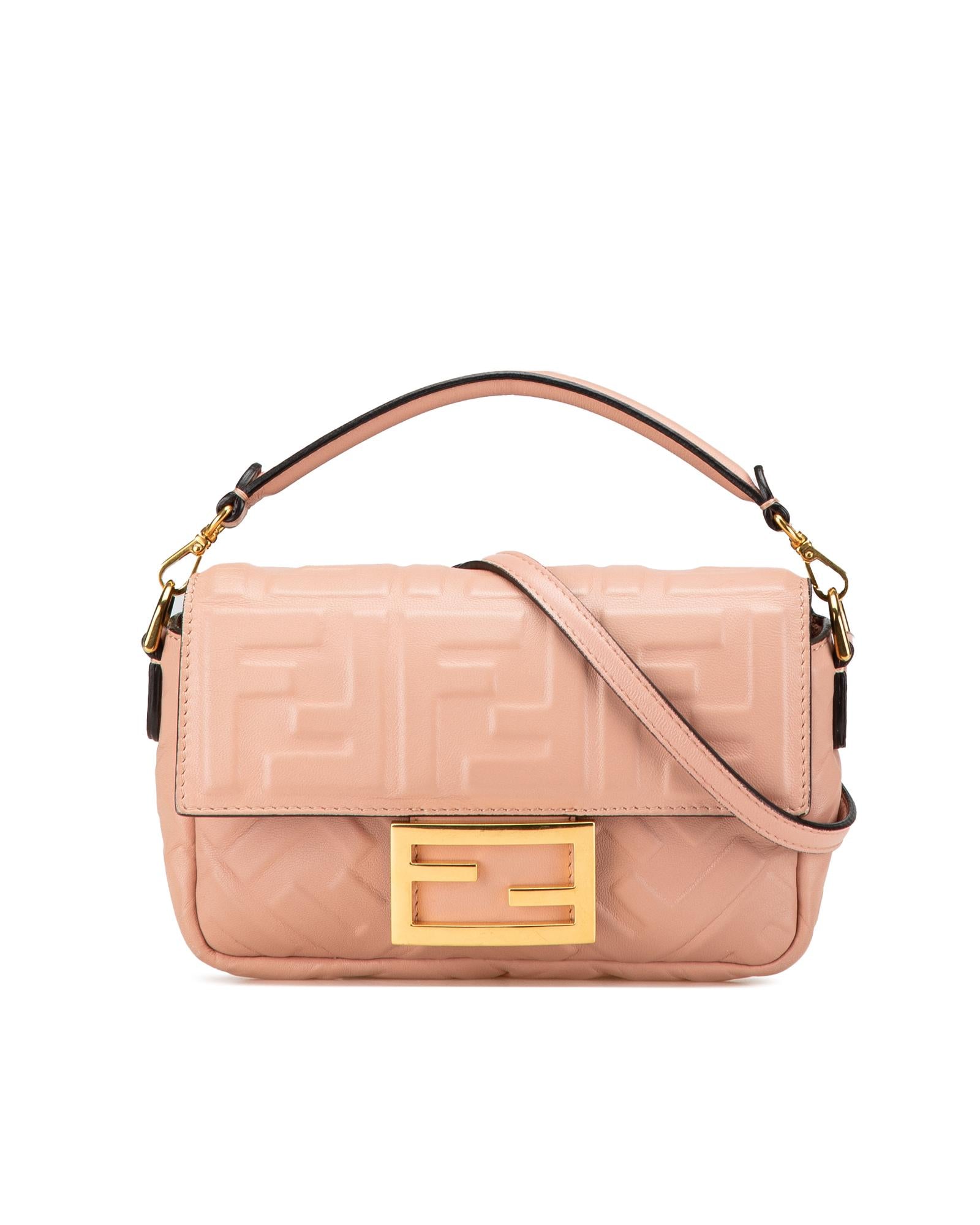The Baguette features an embossed leather body a detachable flat leather handle a detachable chain link strap with leather guard a front flap with magnetic snap closure and interior slip pockets.