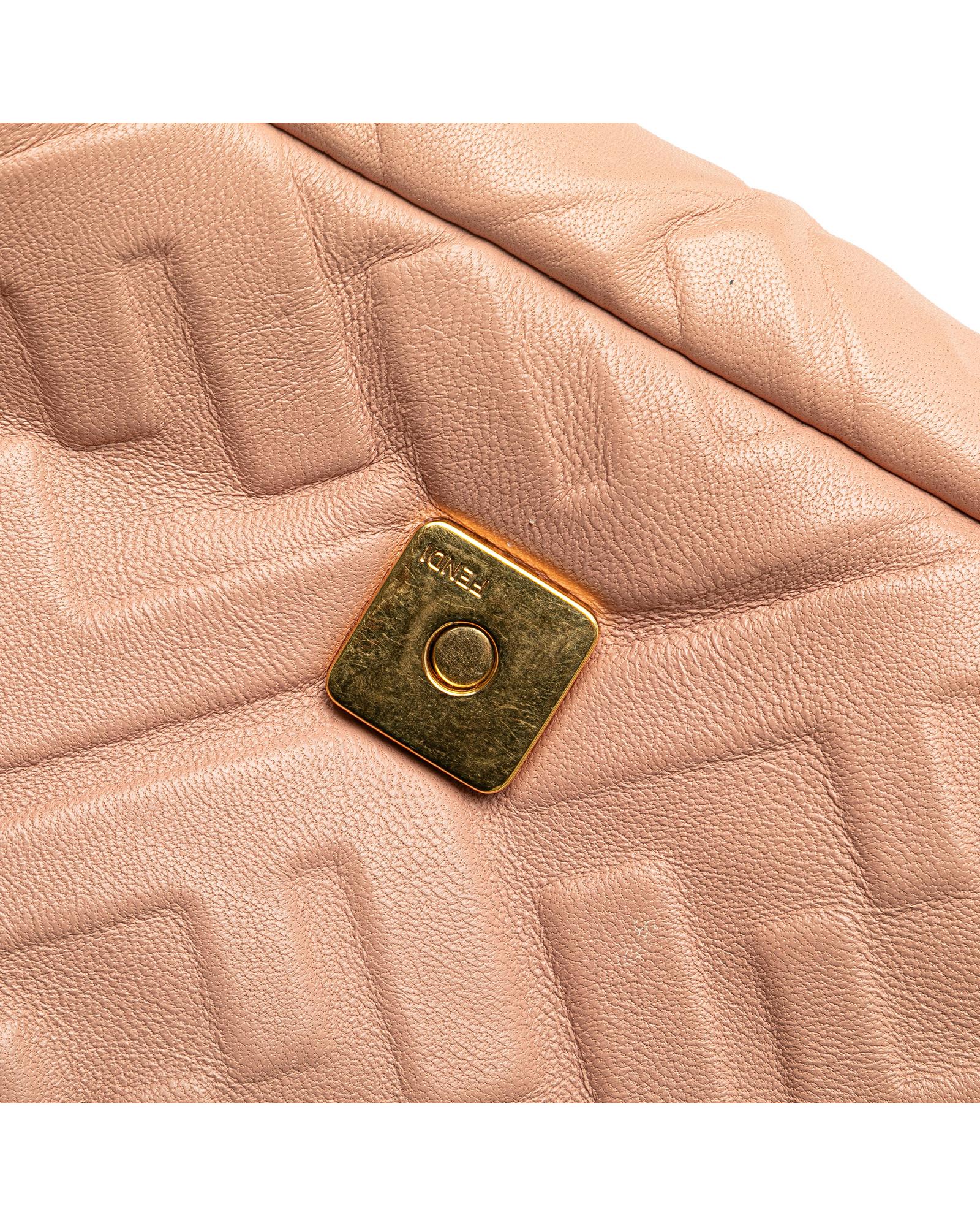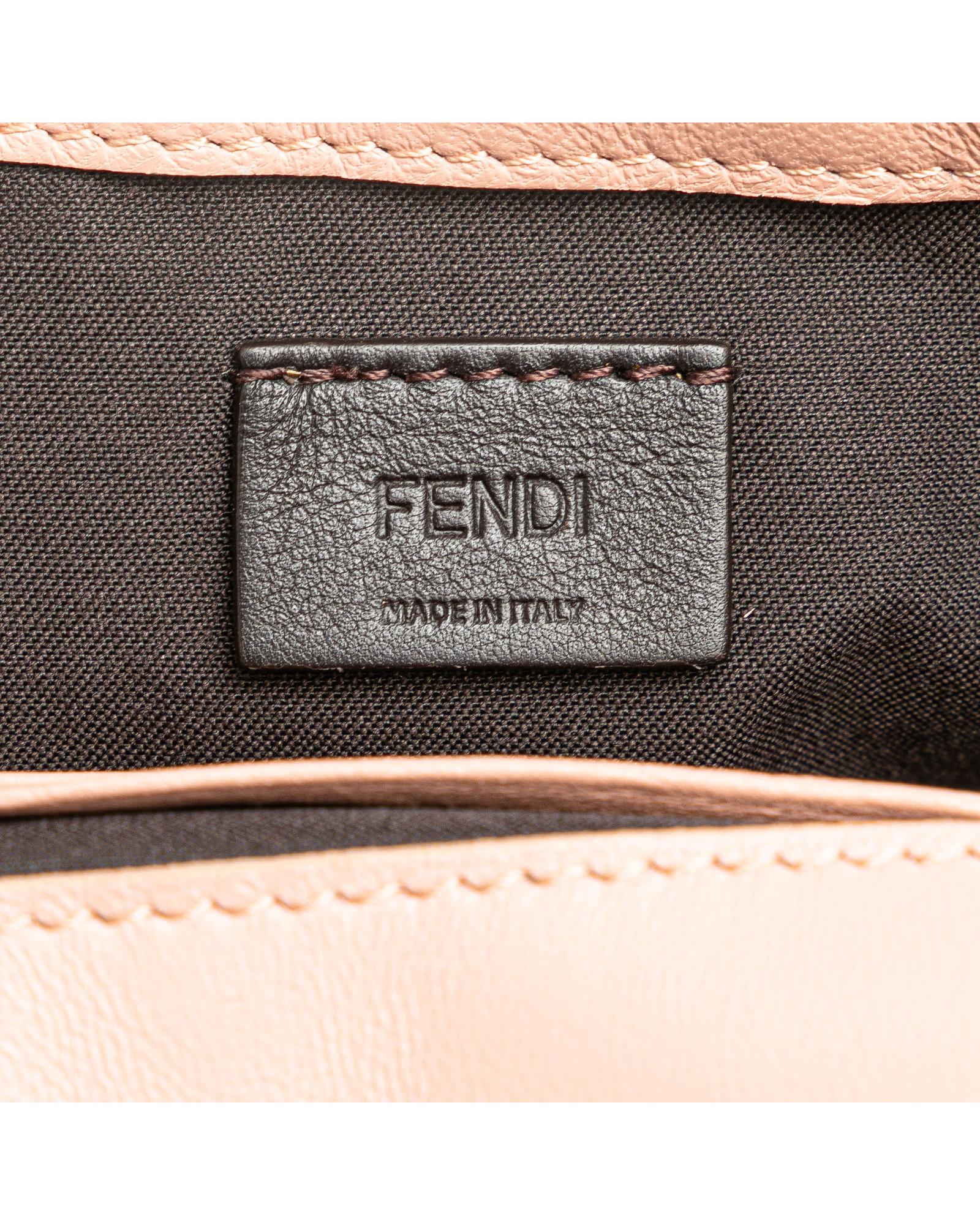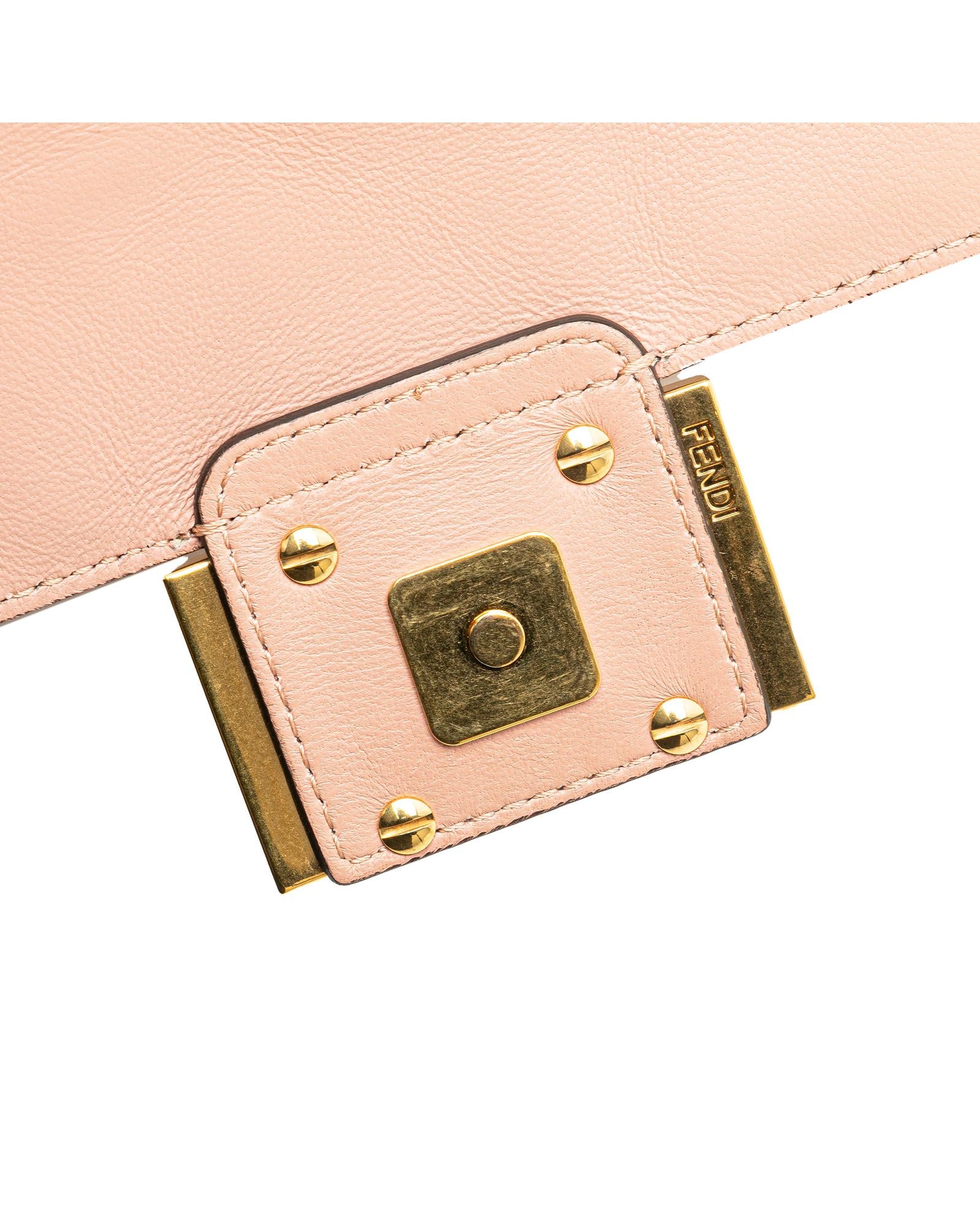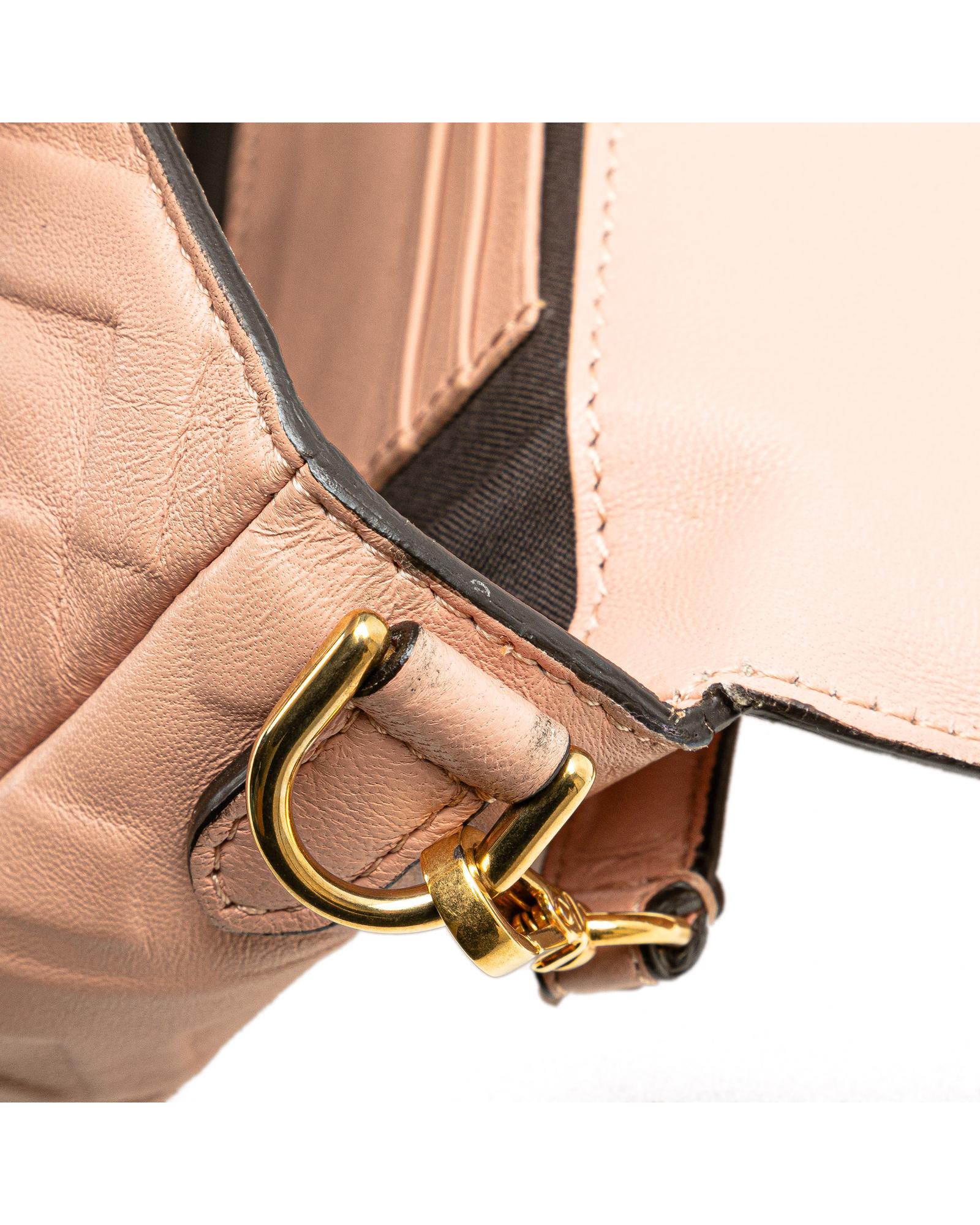 The Baguette features an embossed leather body a detachable flat leather handle a detachable chain link strap with leather guard a front flap with magnetic snap closure and interior slip pockets.