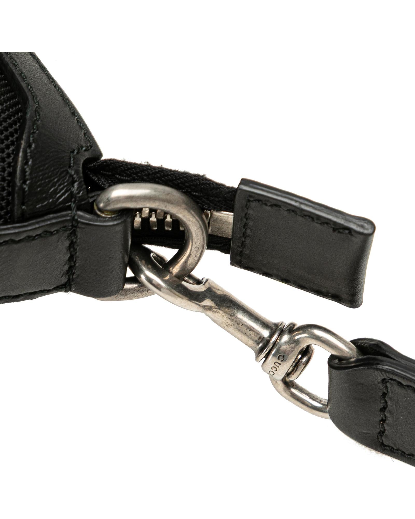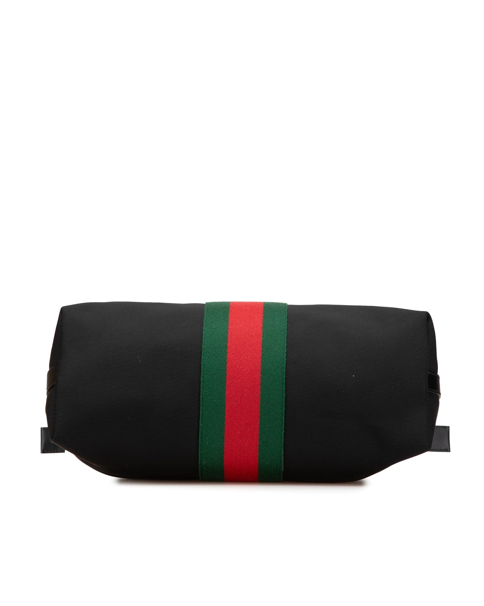 This satchel features a canvas body with web detail and leather trim flat leather handles an adjustable flat strap a top zip closure and interior zip and slip pockets.Brand: Gucci