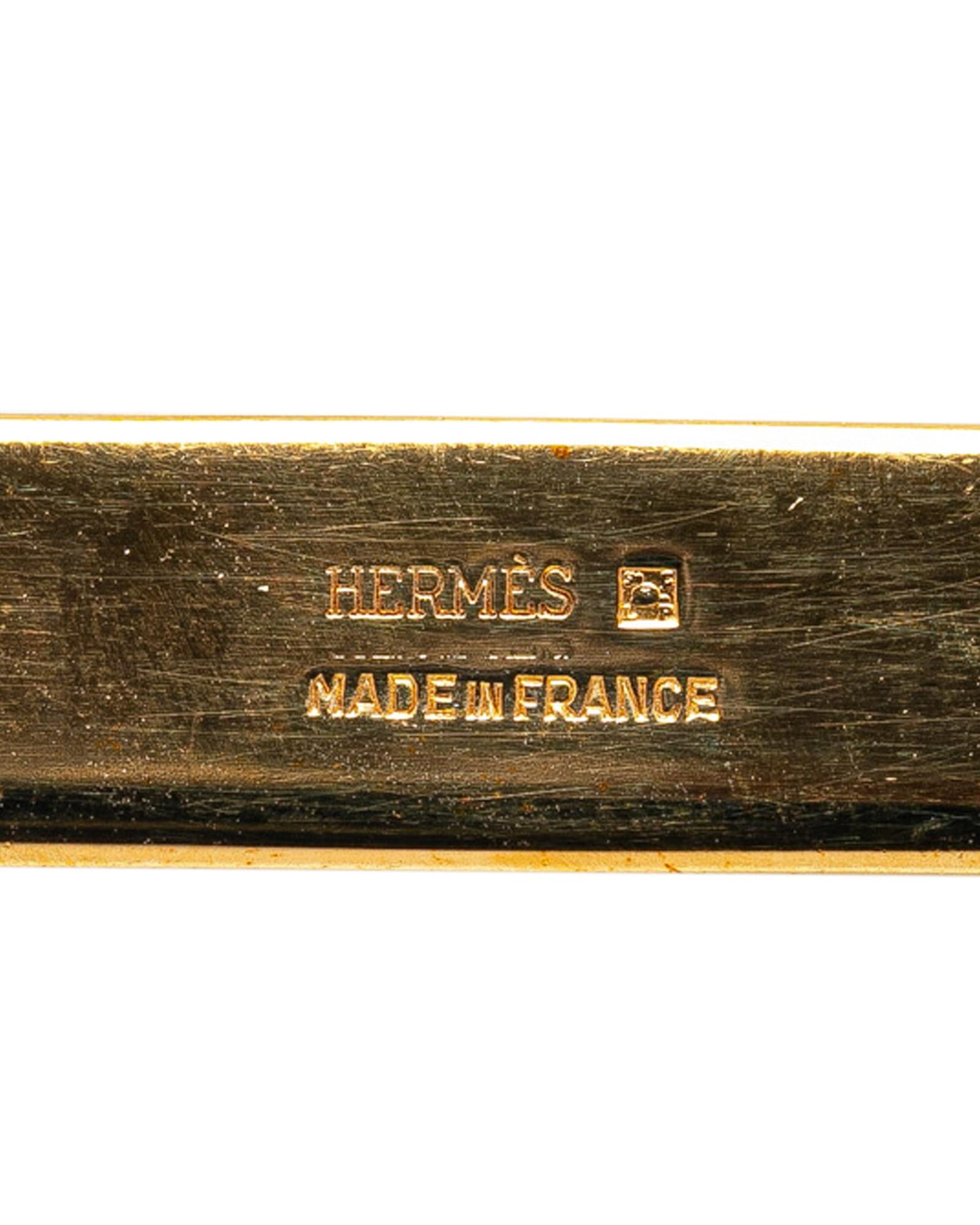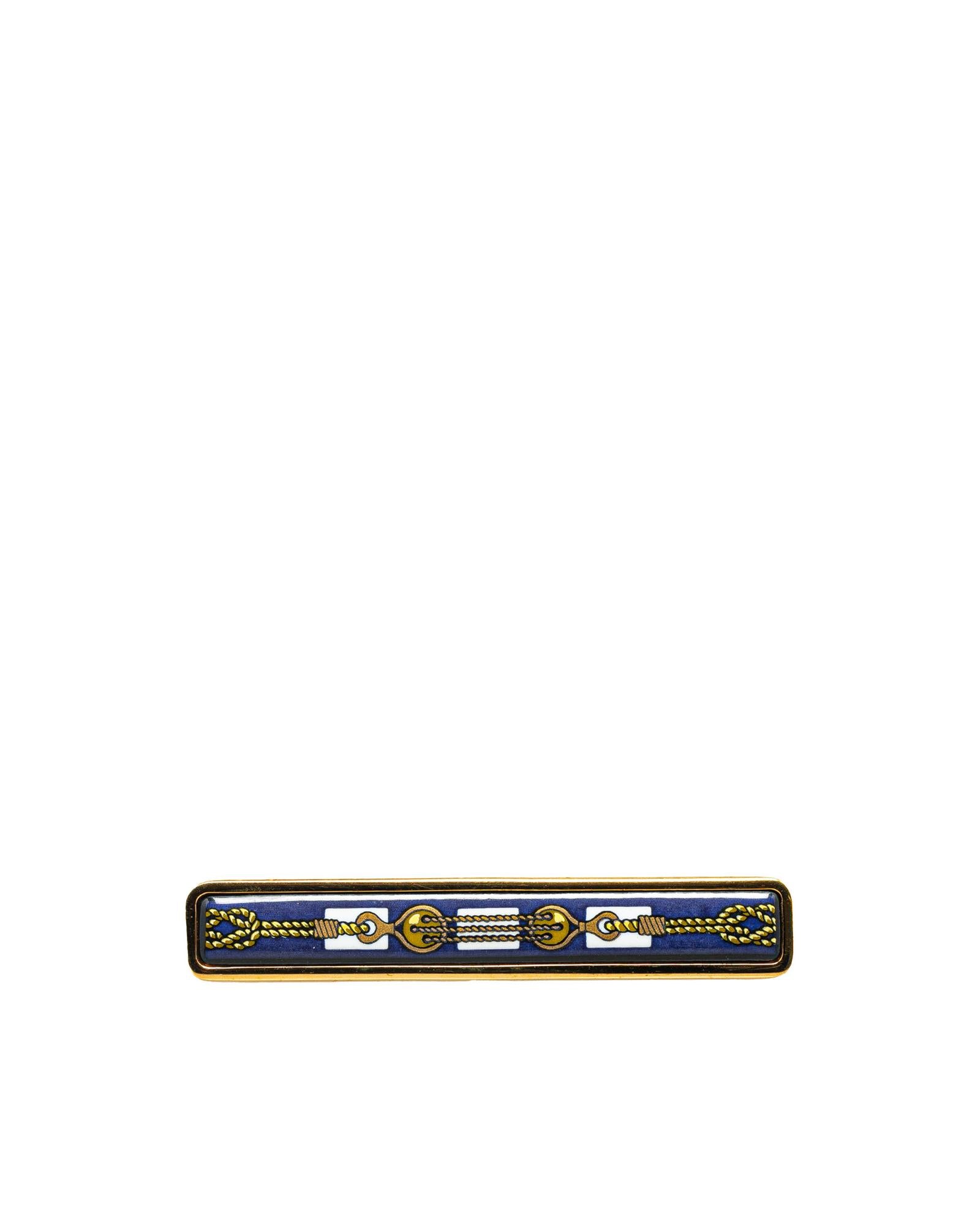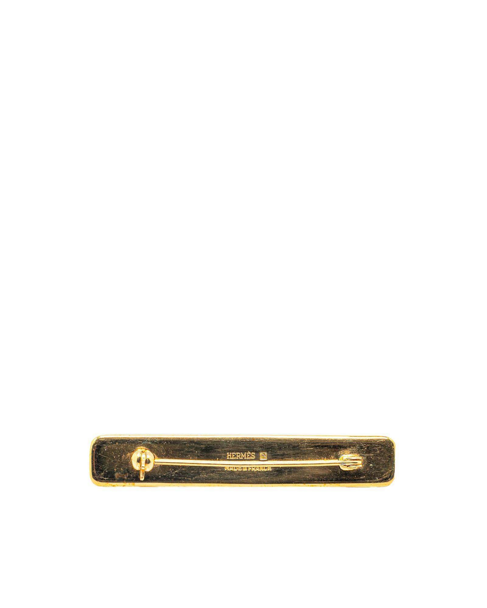 This brooch features an enamel and gold-plated metal body and a back pin closure.Brand: Hermes