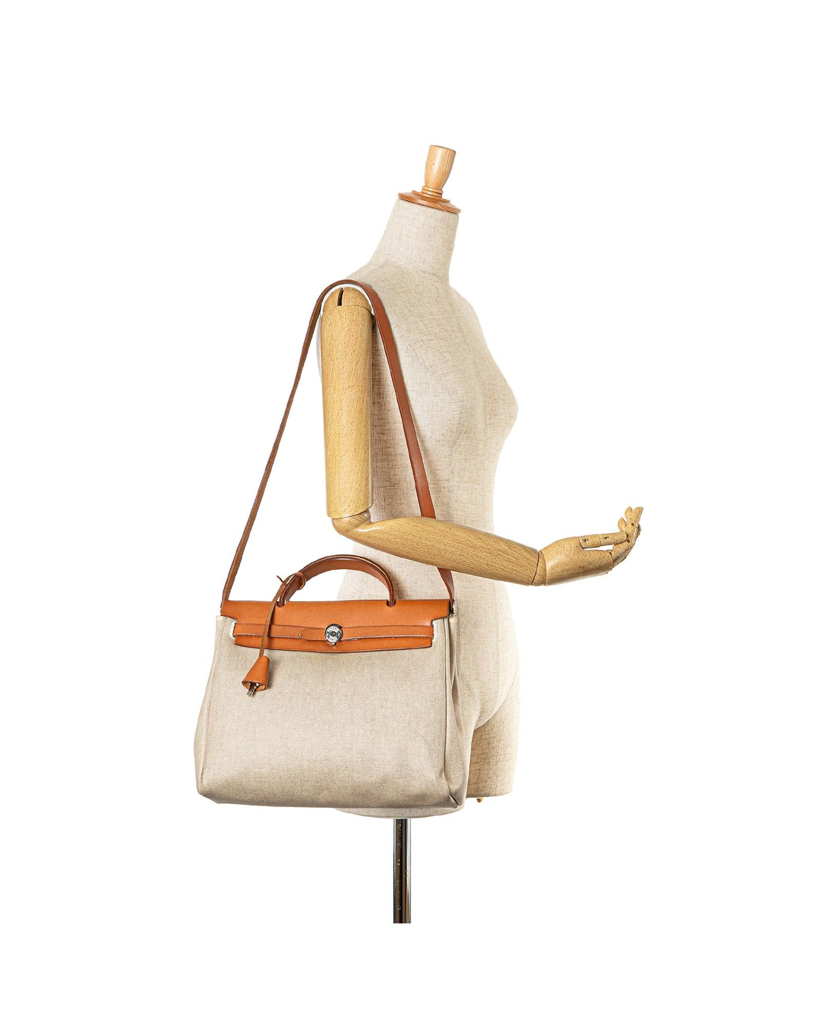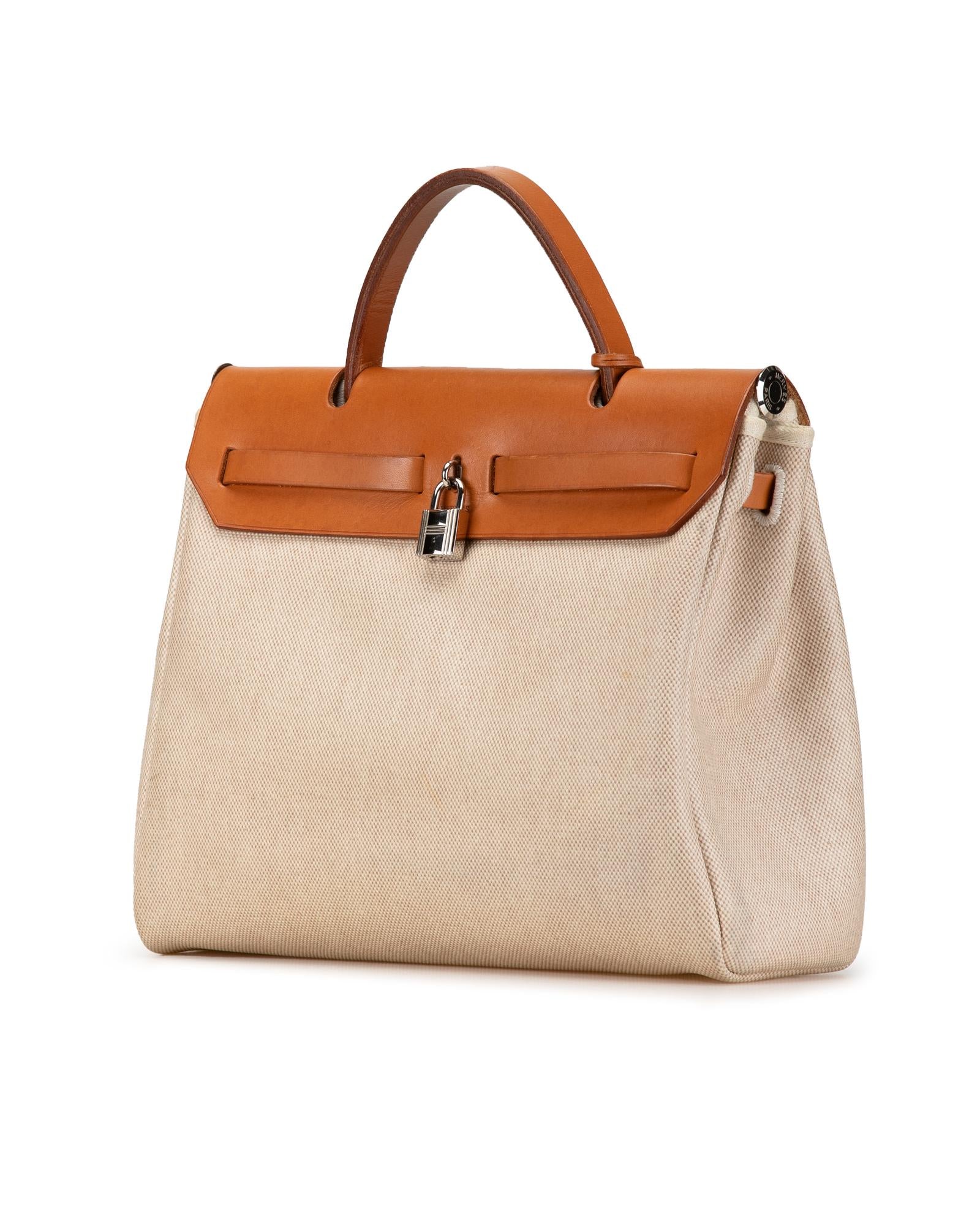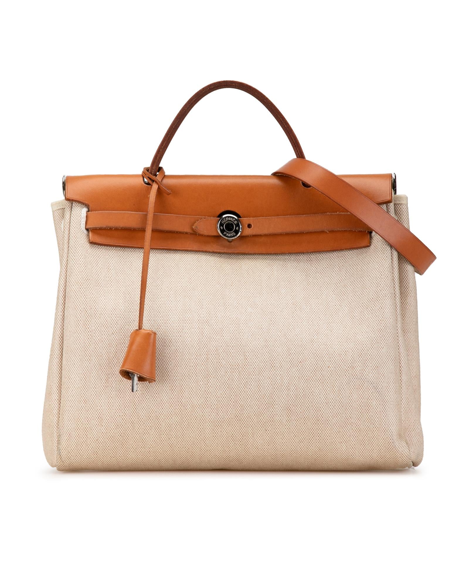 The Herbag features a canvas body with leather trim a top leather handle a flat leather shoulder strap a front flap with a pull through closure and an interior slip pocket.