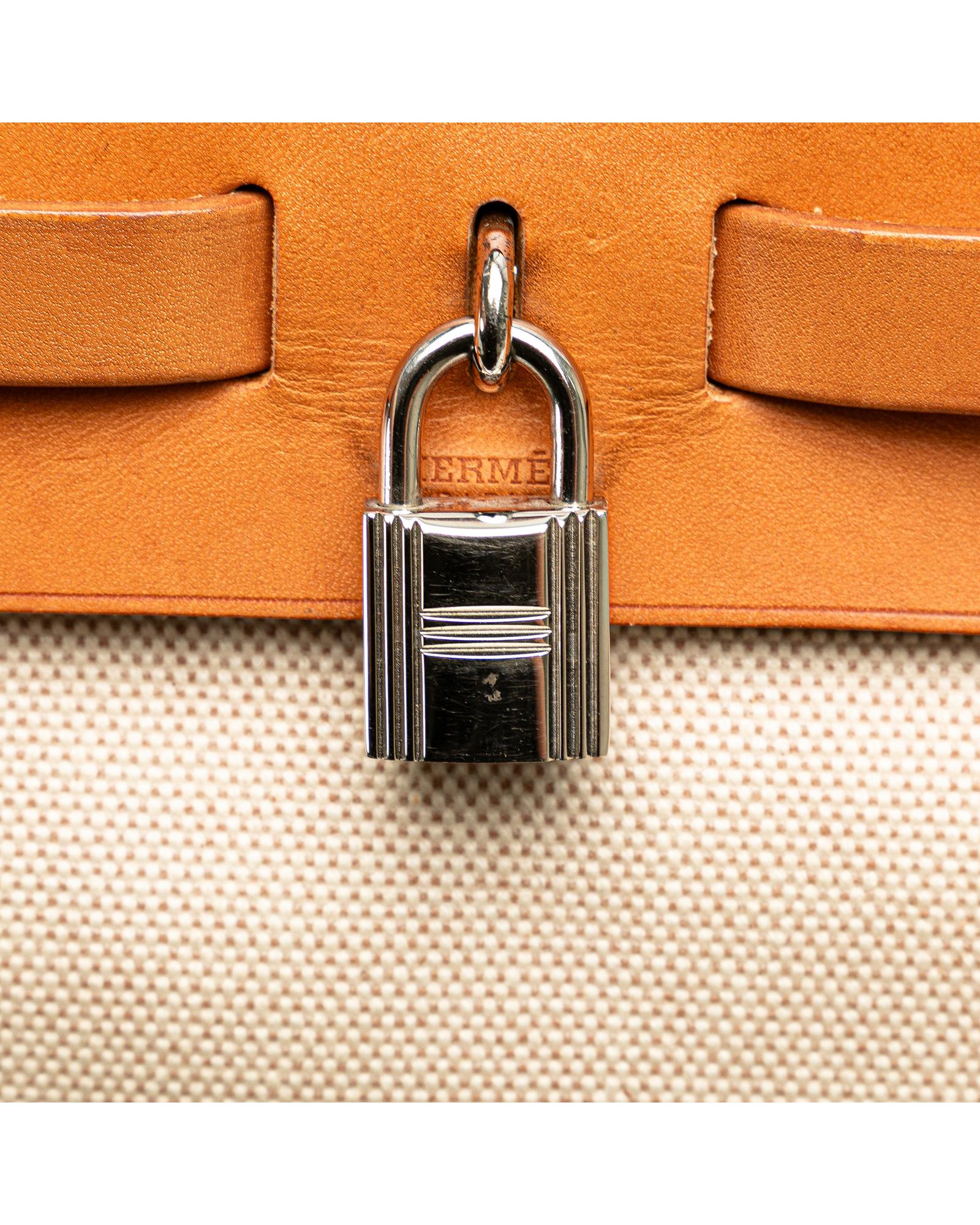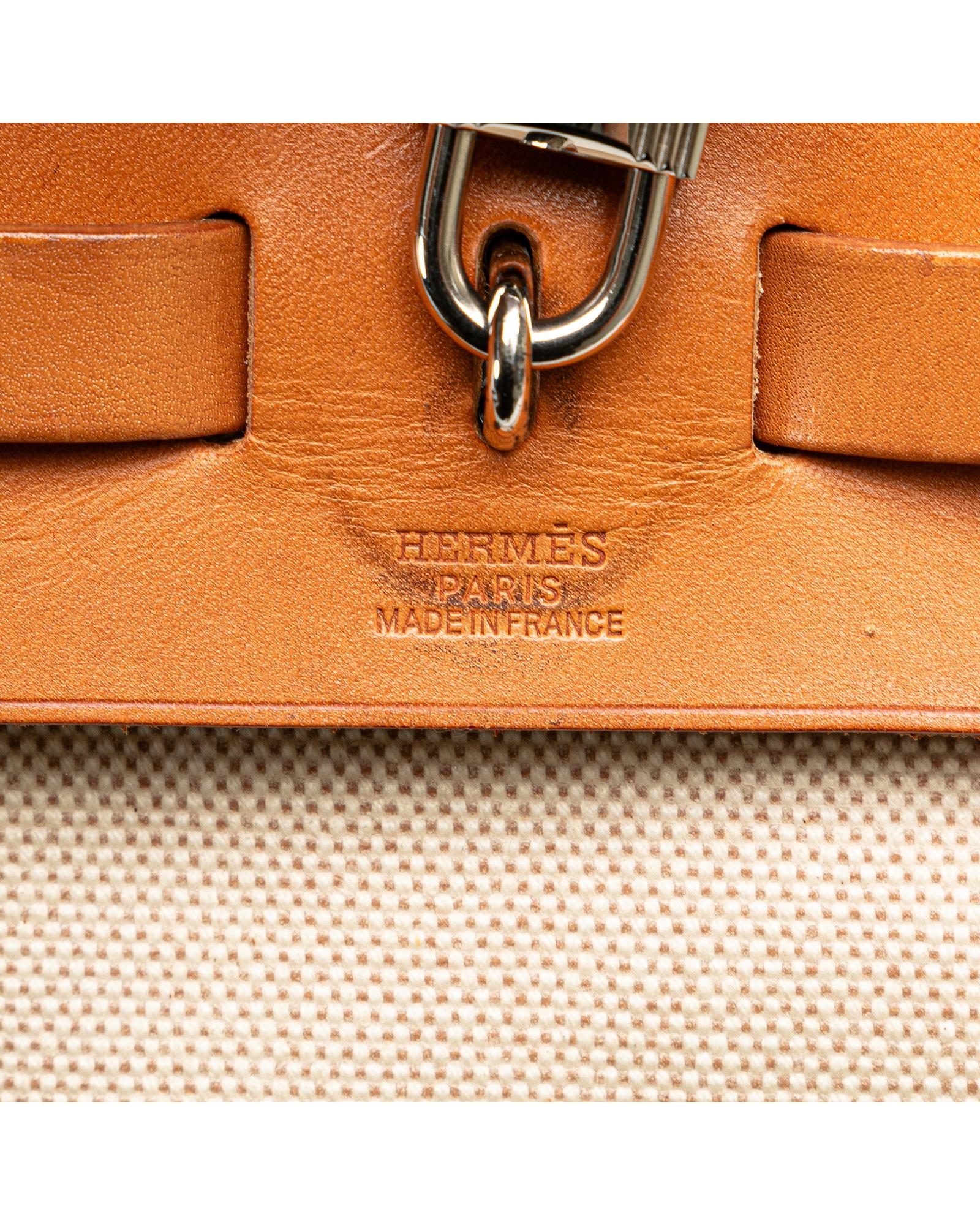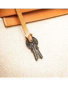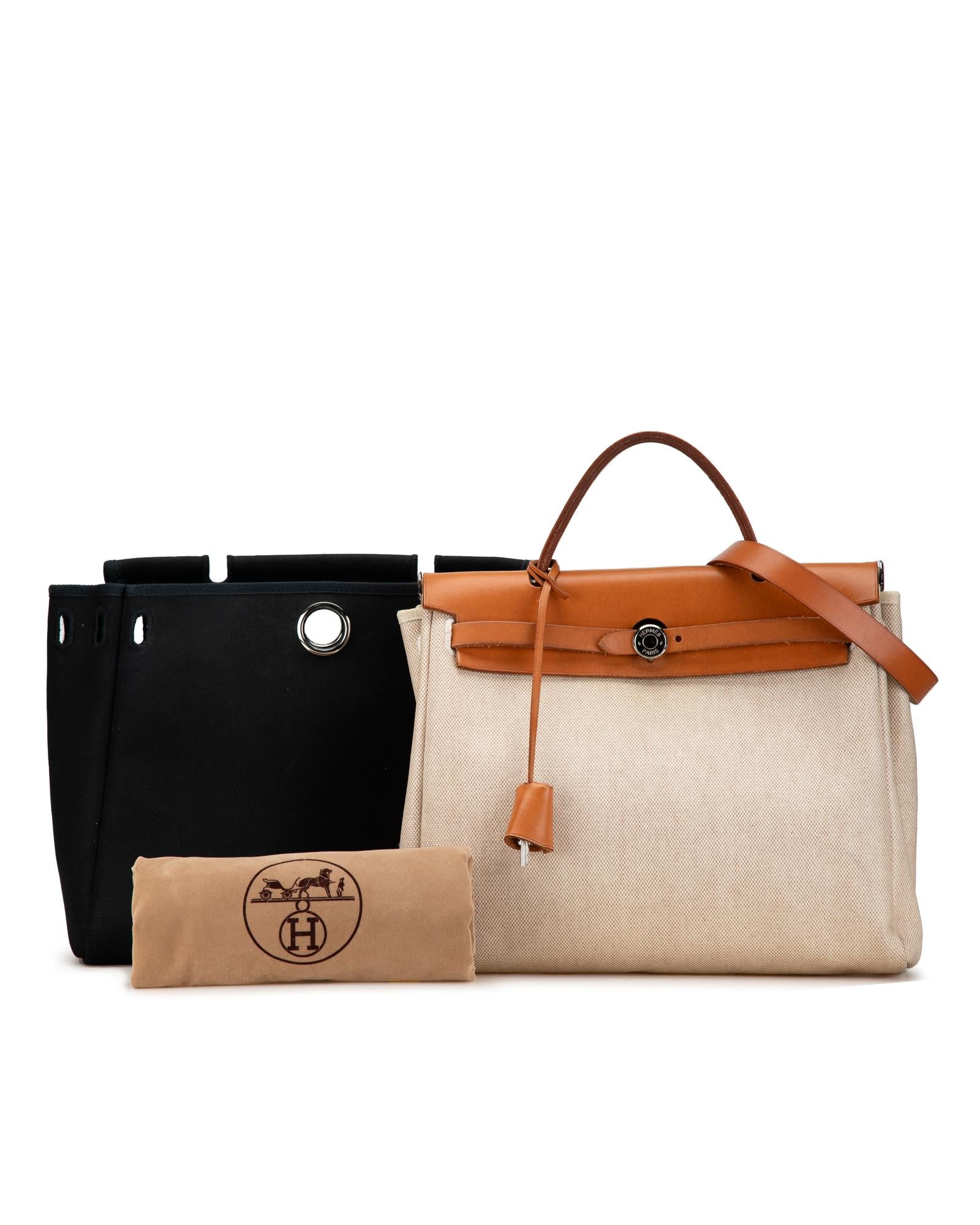 The Herbag features a canvas body with leather trim a top leather handle a flat leather shoulder strap a front flap with a pull through closure and an interior slip pocket.