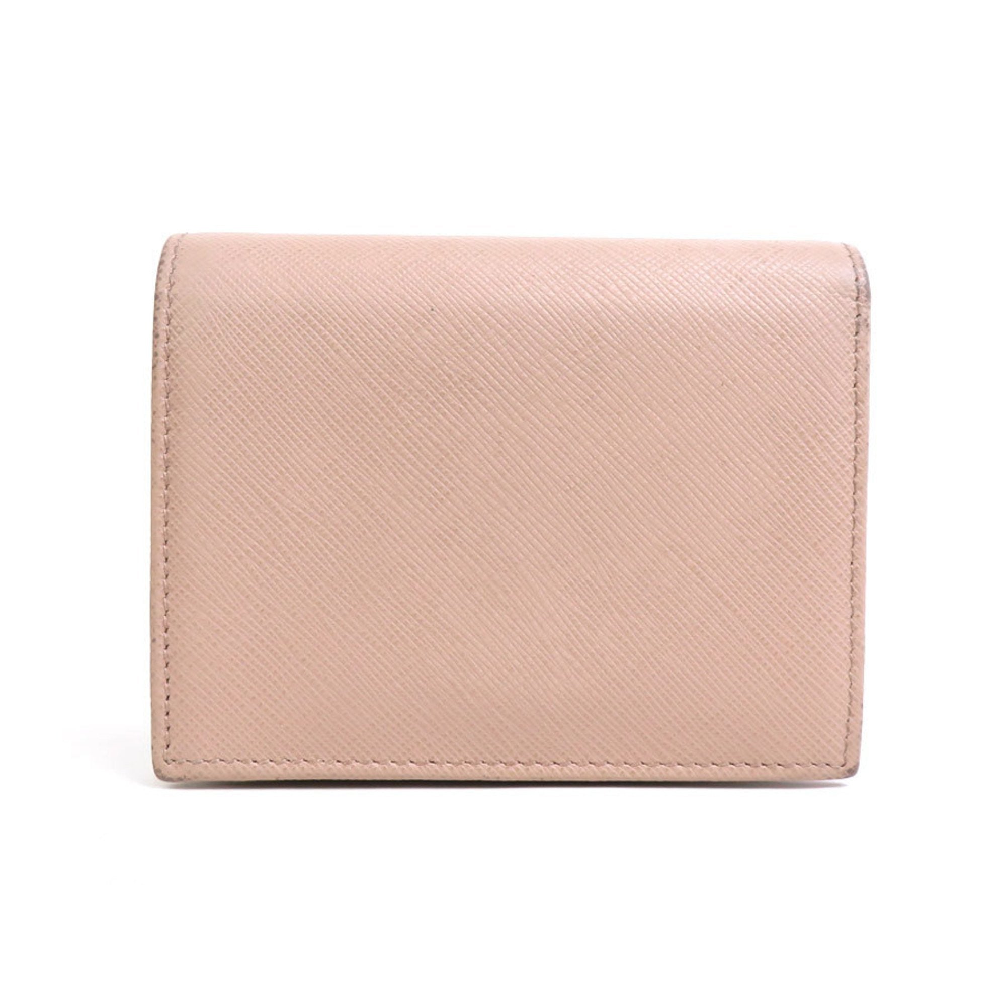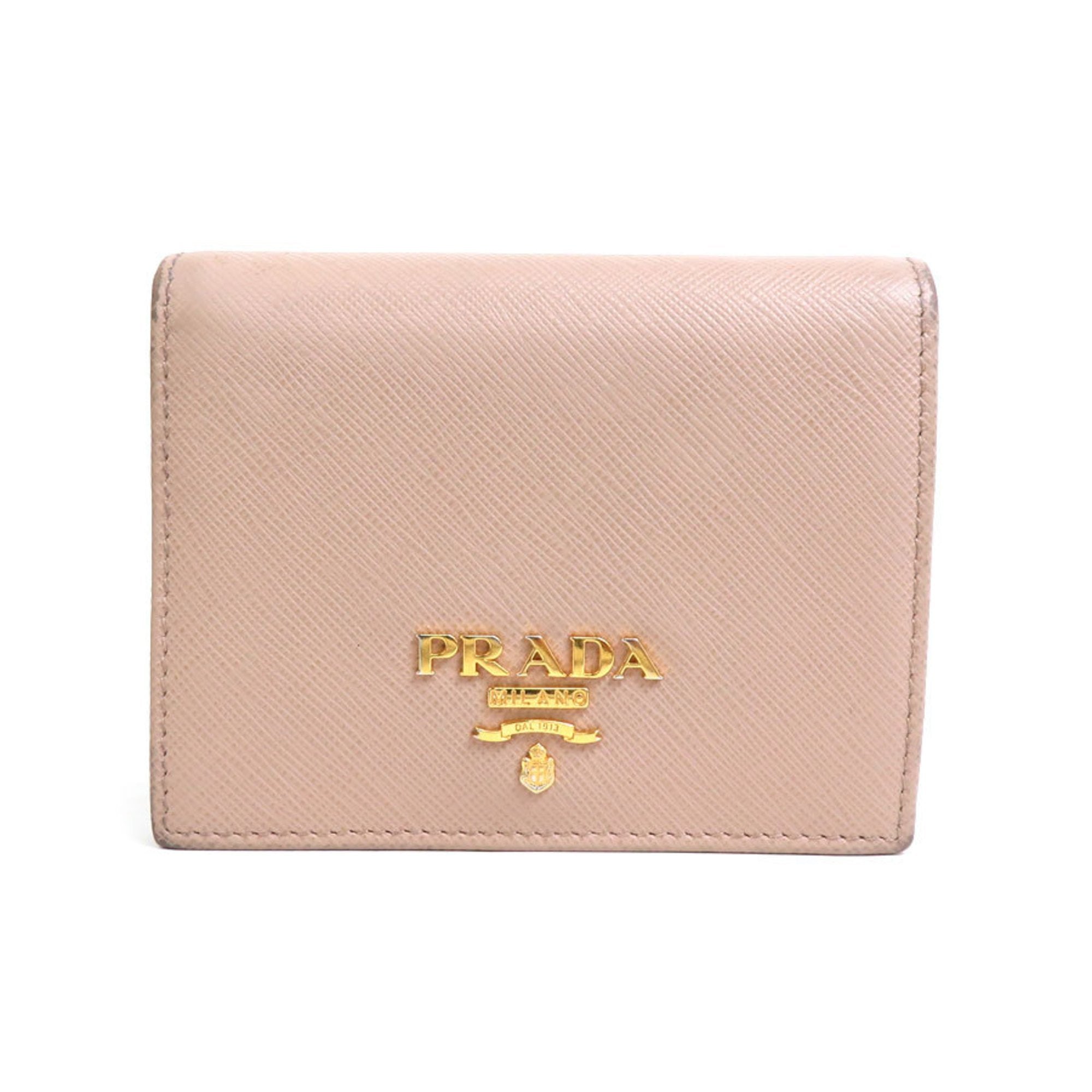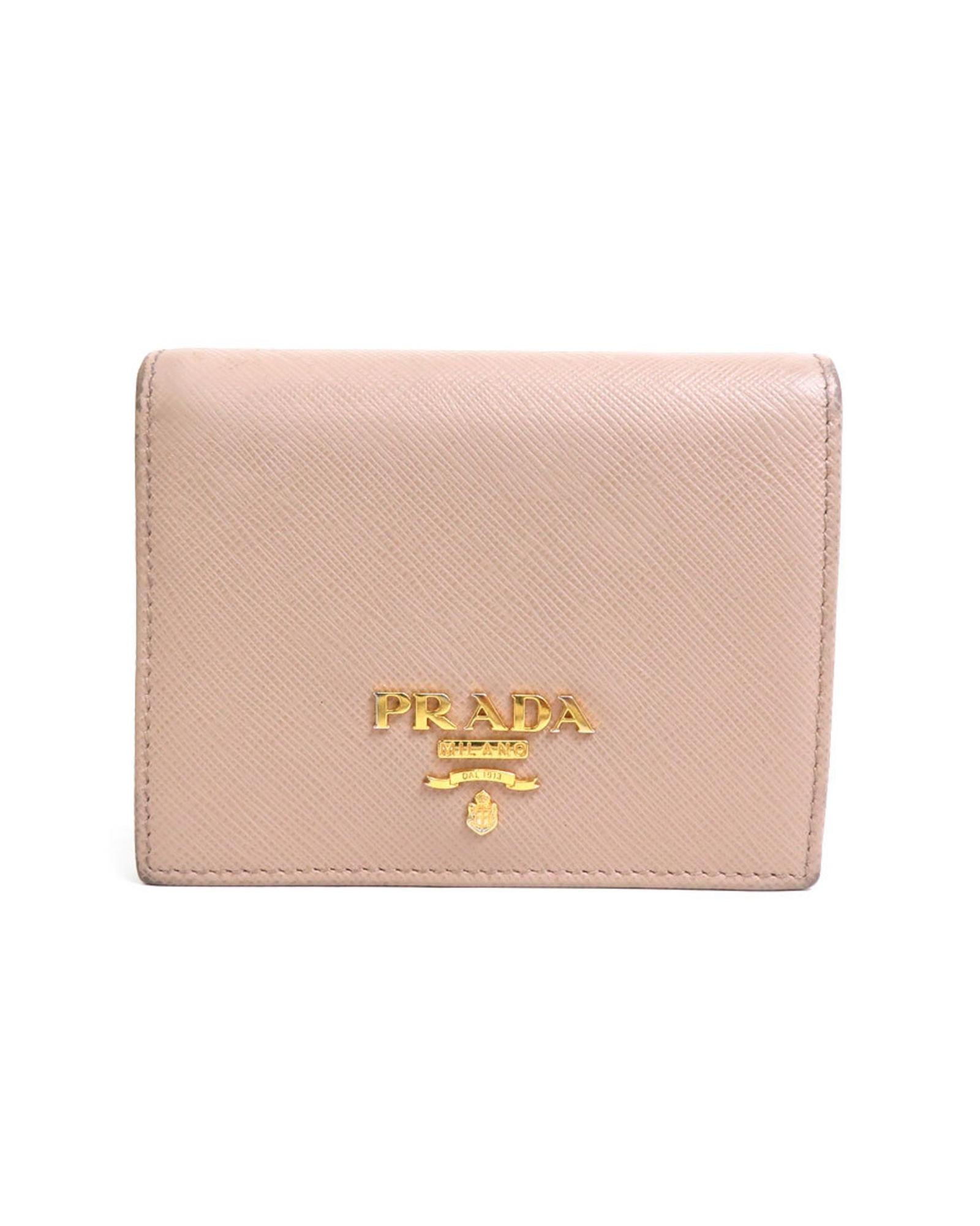 This Prada wallet is a bi-fold design crafted for women. Made from leather it features a stylish pink beige color showcasing Prada's commitment to quality materials and sophisticated design. The bi-fold style offers practicality and elegance making it a fashionable accessory for women who appreciate both functionality and luxury.