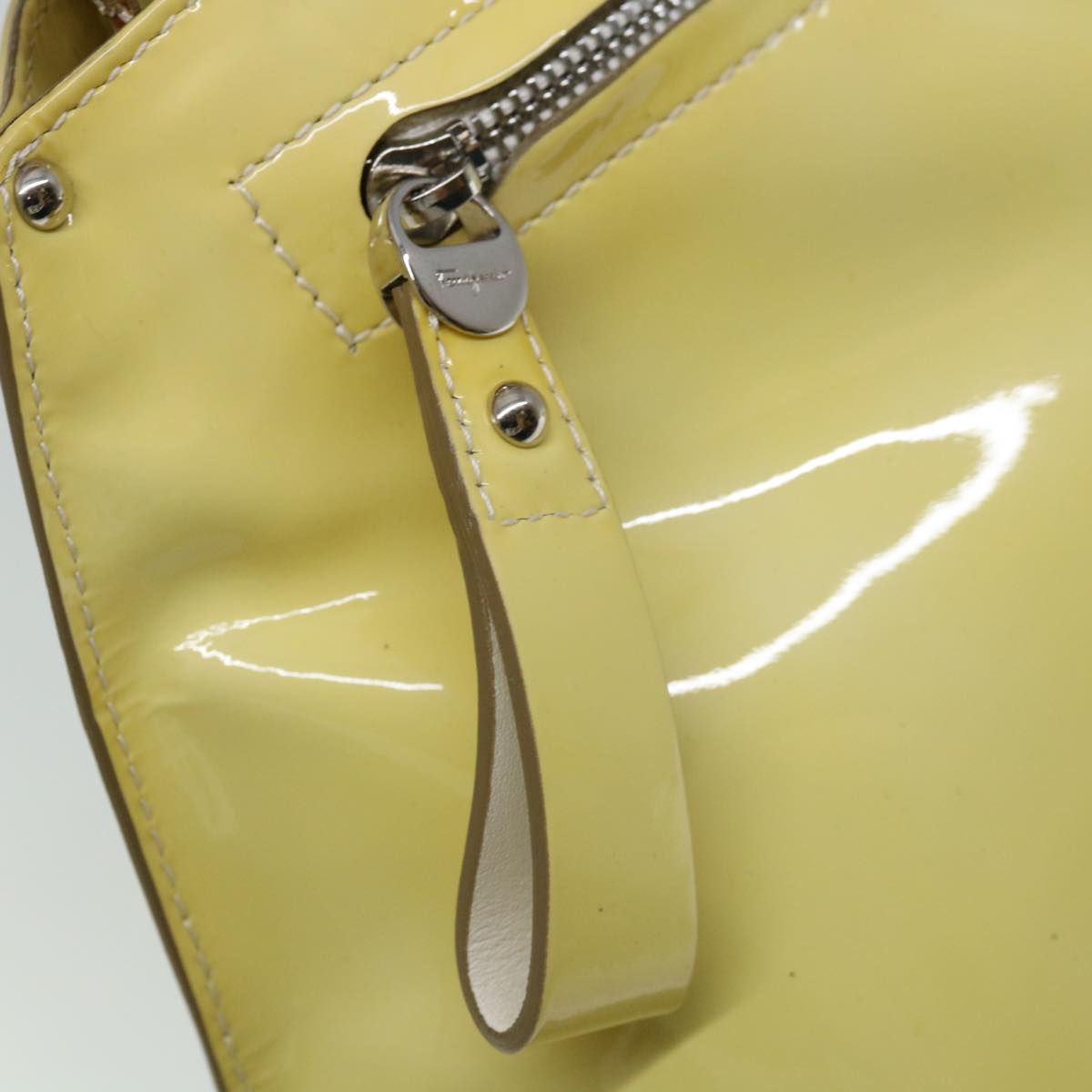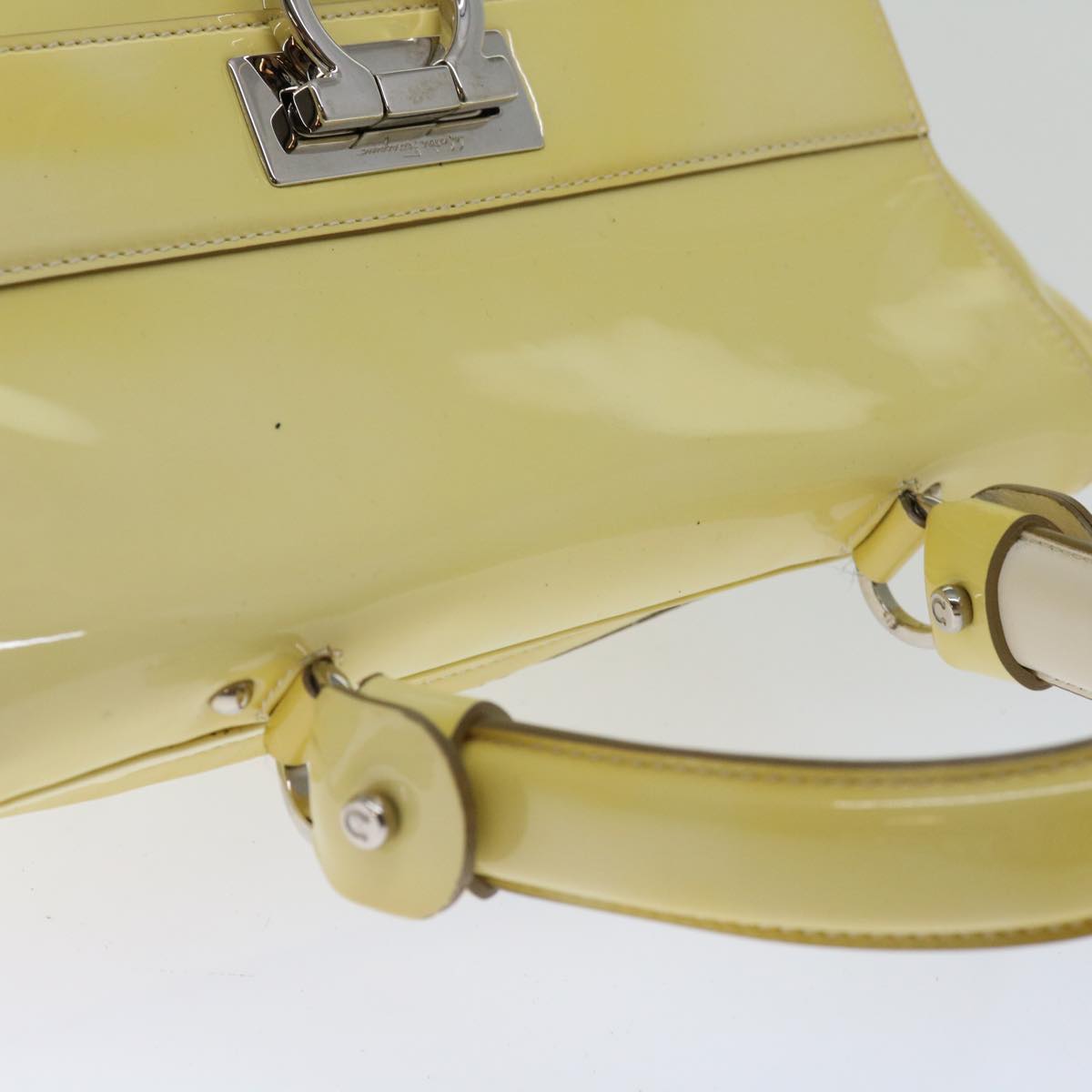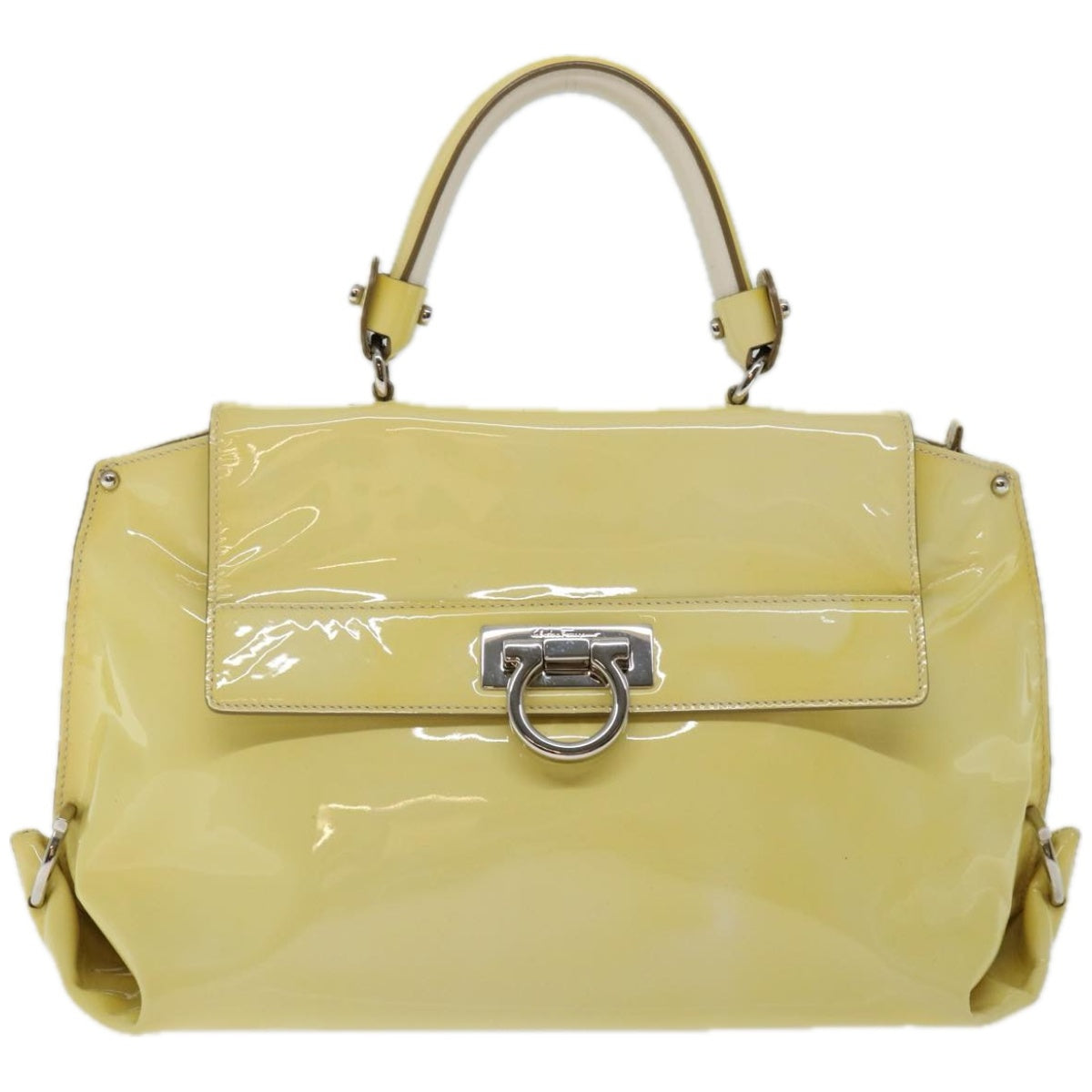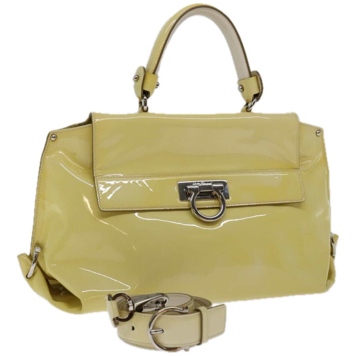 Brand: Salvatore Ferragamo Model: Color: Yellow Material: Patent Leather Inclusions: Shouder strap Dimensions: W38cm x H20cm x D15cm / Shoulder Drop:50 - 55cm Serial number: BW-21 A896 Country of origin: Italy Condition: AB - good condition. Salvatore Ferragamo the renowned luxury brand known for its exceptionally high-quality leather goods presents a bag that combines practicality and elegance. Its enchanting beauty is sure to captivate fashion enthusiasts in search of an accessory perfectly suited to their needs. The exterior surface exhibits signs of rubbing sunburn and slight loss of shape particularly noticeable on the shoulder strap which also shows slight sunburn and rubbing while the handle displays sunburn and rubbing. Additionally there are slight scratches on the metal fittings. Internally rubbing is evident and the pocket shows signs of slight rubbing. Minor rubbing is also observed on the corners. We recommend that you look at all the photos before making your purchase to ensure that you are satisfied with the condition of the item.