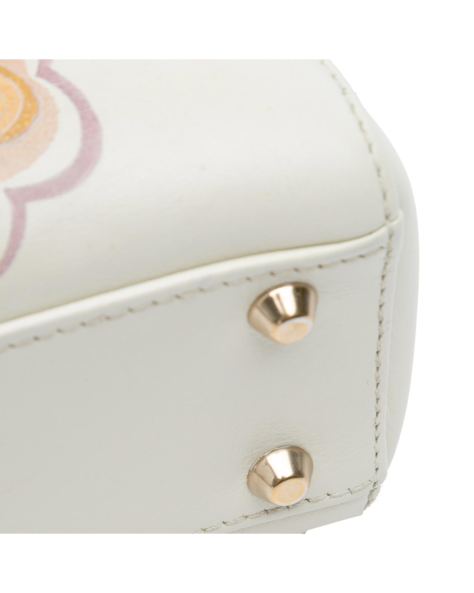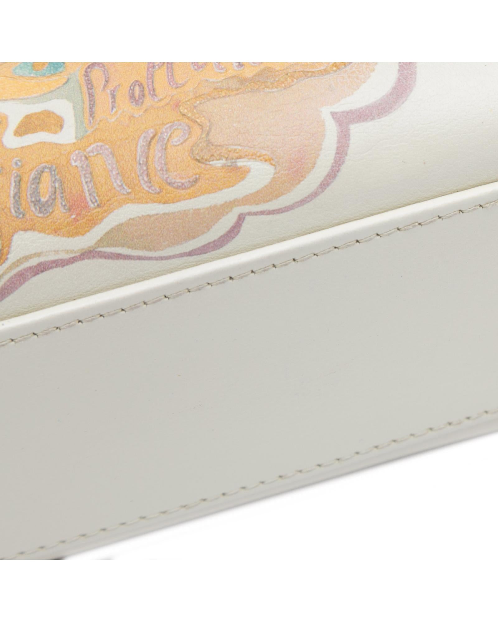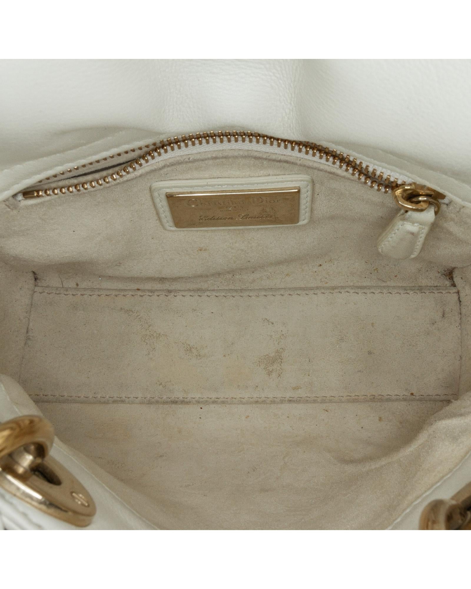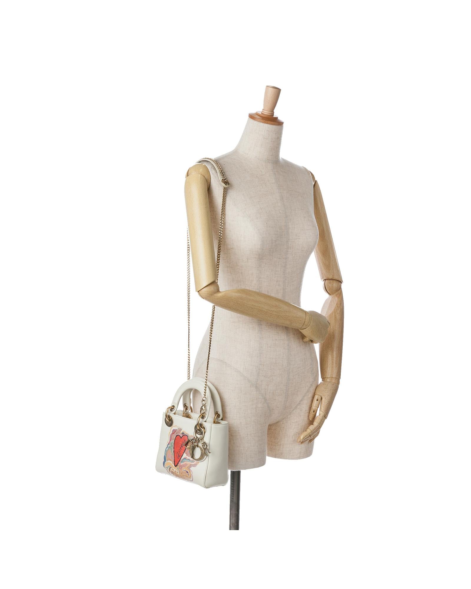 This satchel features a leather body with painted details flat leather handles a detachable flat chain strap a top flap closure and an interior zip pocket.Brand: Dior Vintage