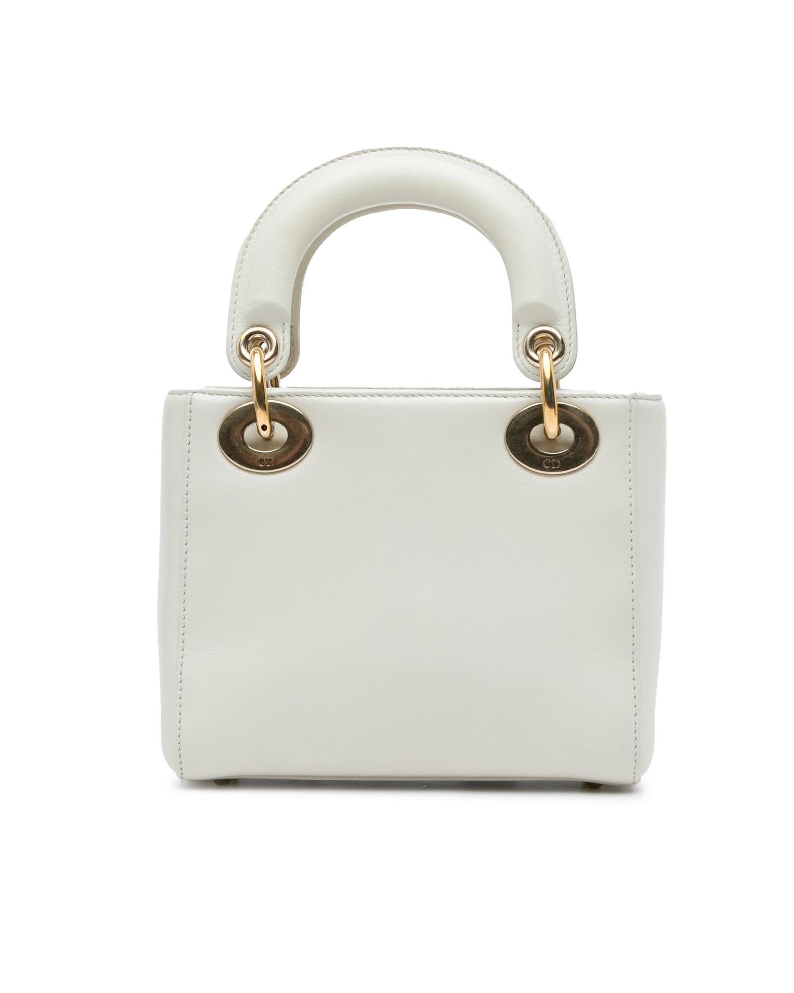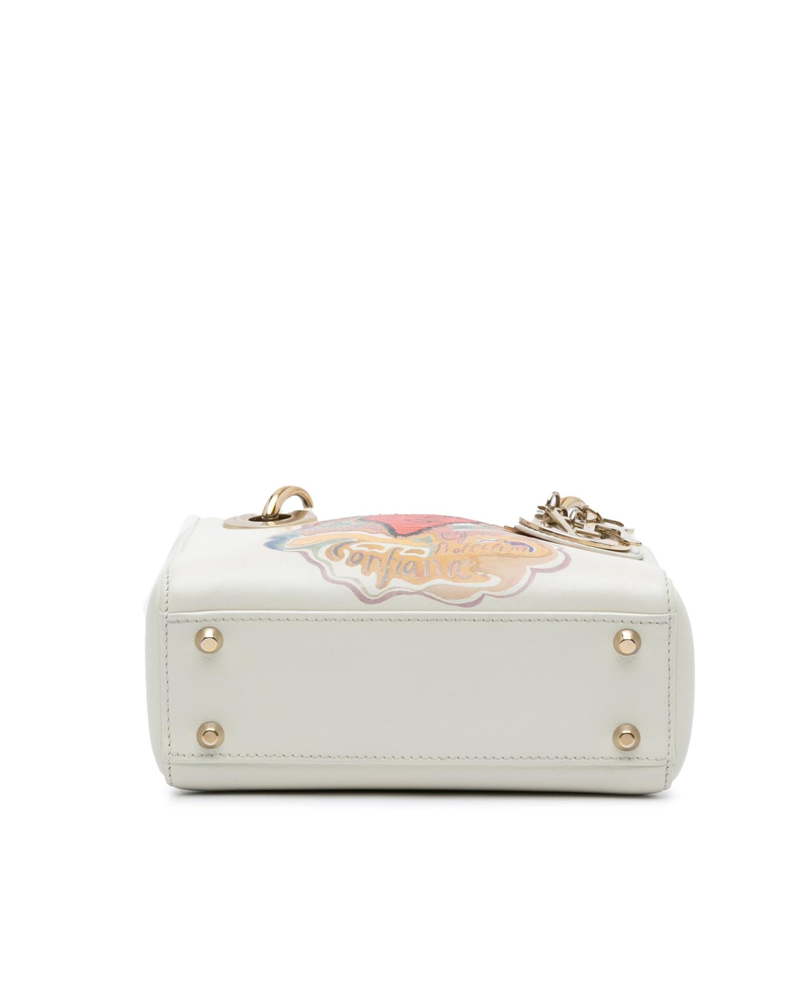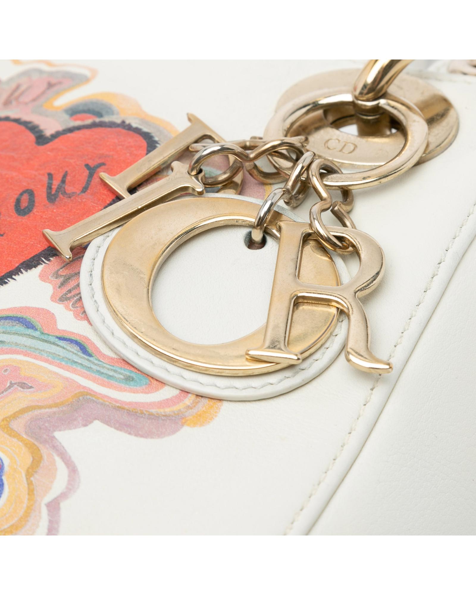 This satchel features a leather body with painted details flat leather handles a detachable flat chain strap a top flap closure and an interior zip pocket.Brand: Dior Vintage
