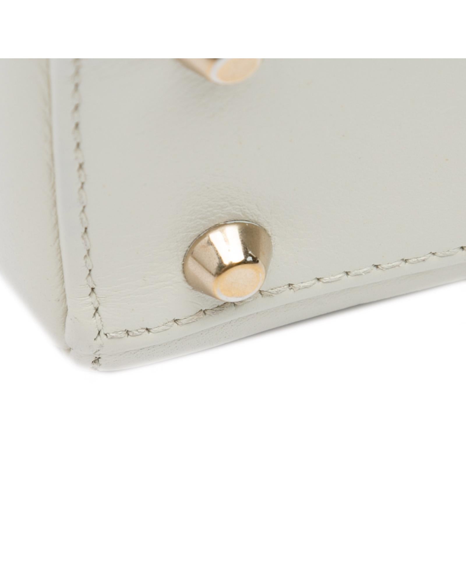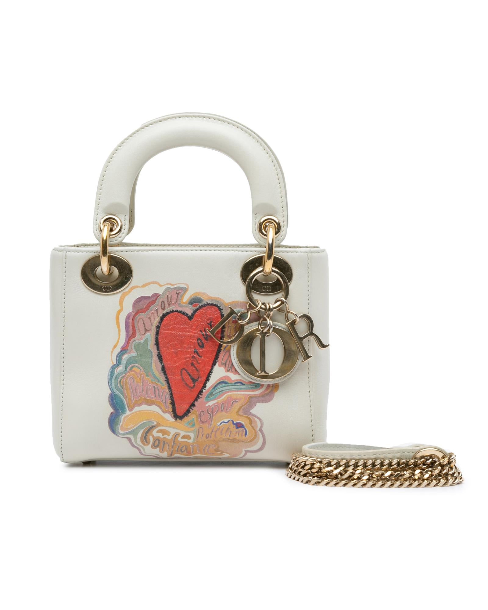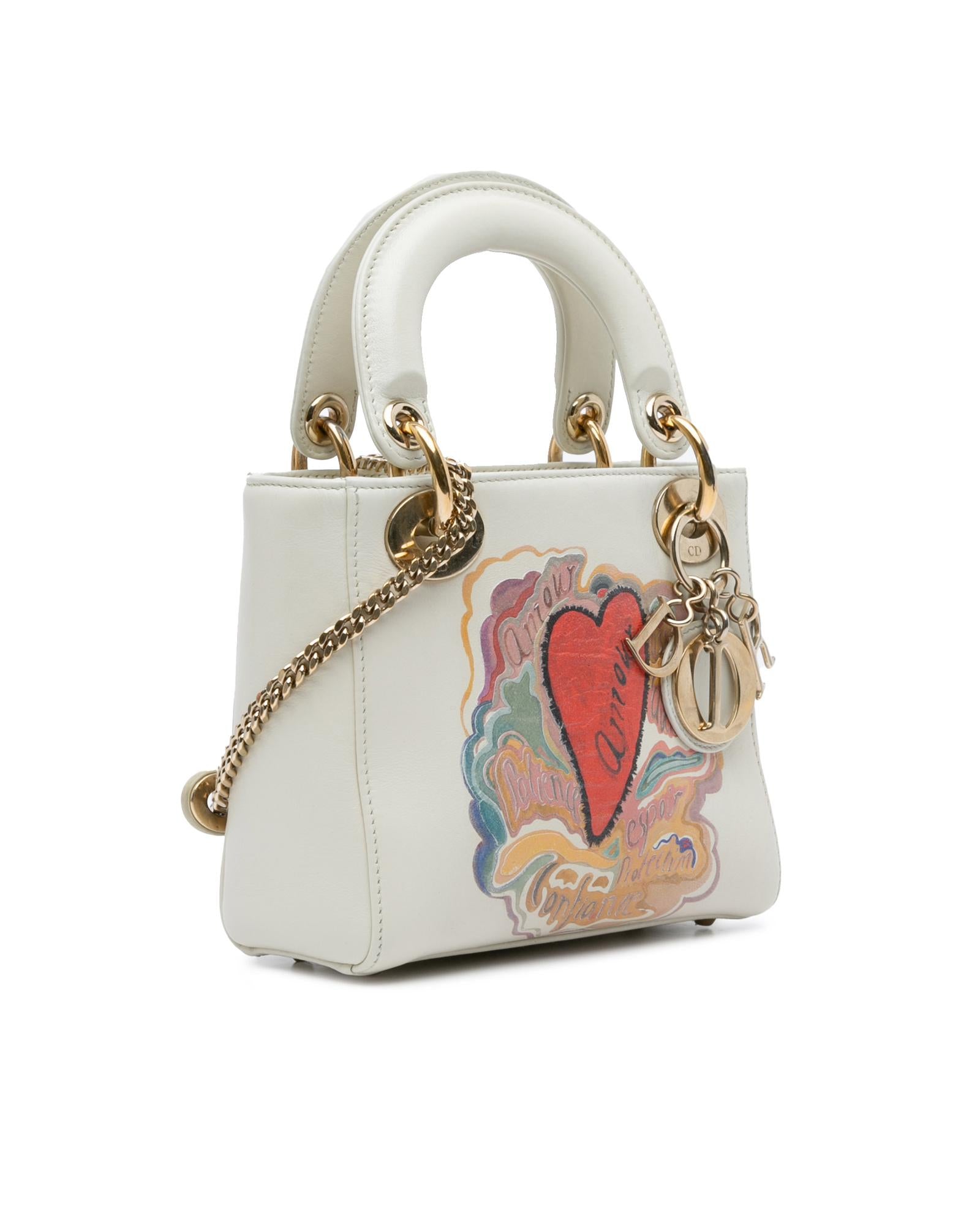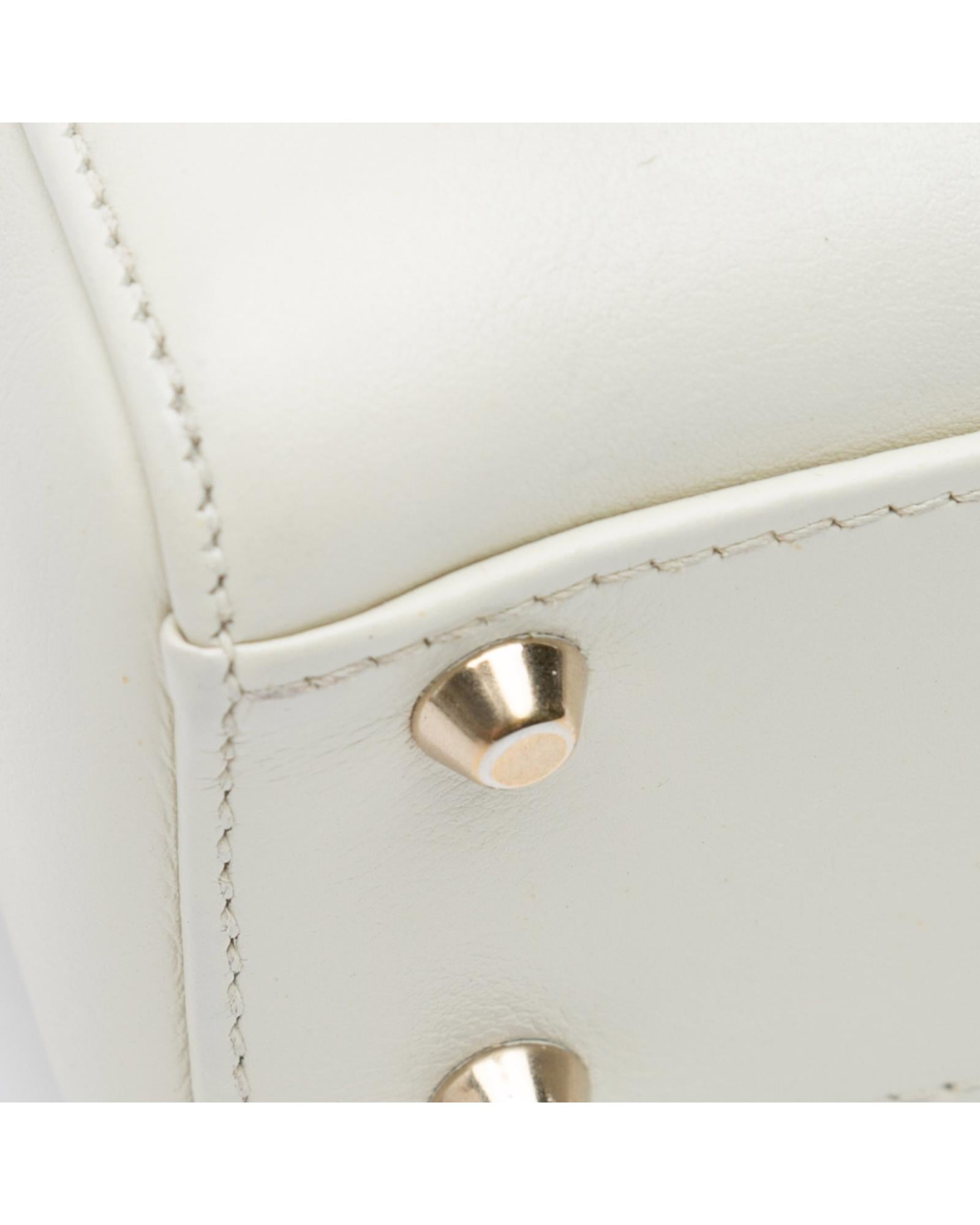 This satchel features a leather body with painted details flat leather handles a detachable flat chain strap a top flap closure and an interior zip pocket.Brand: Dior Vintage