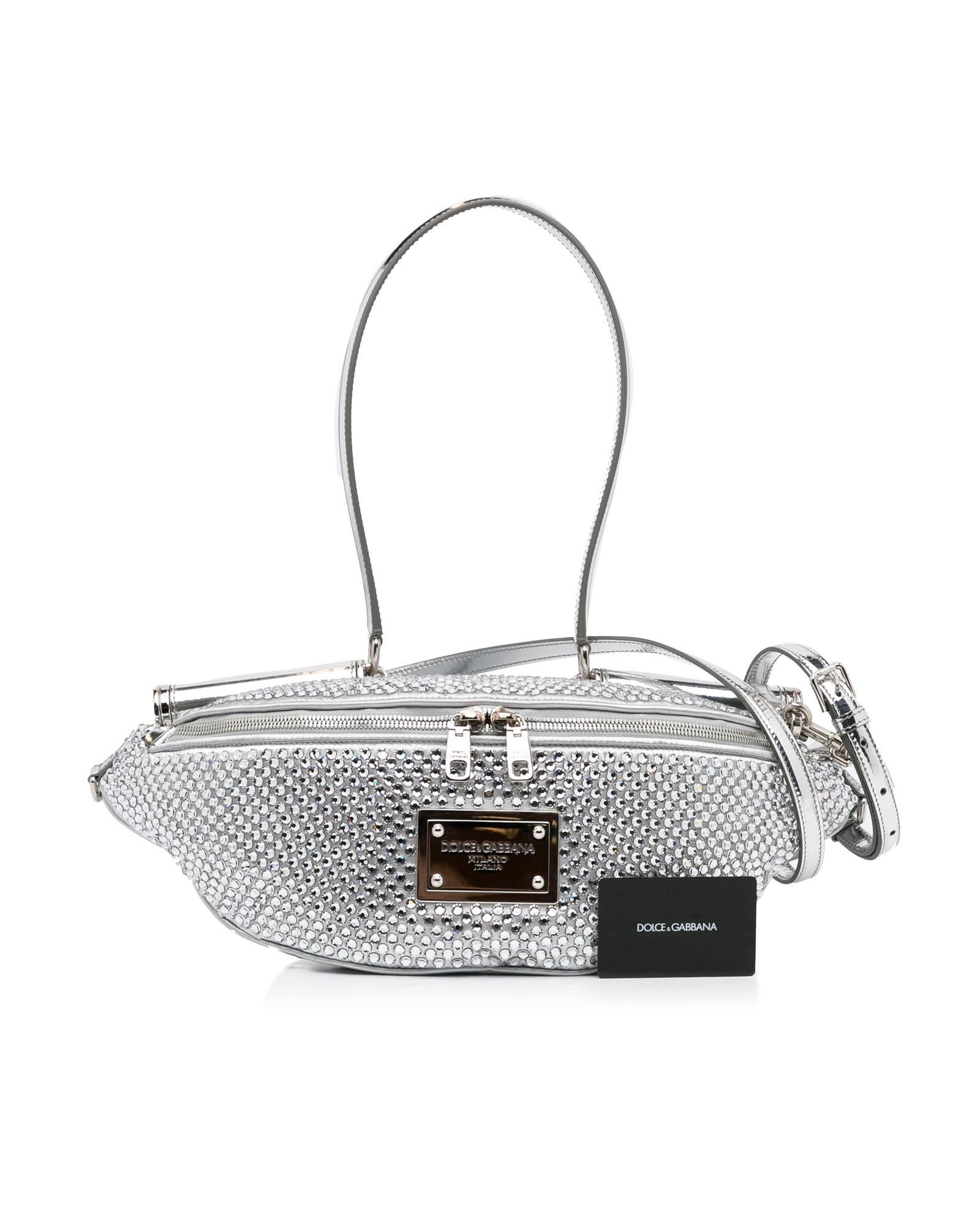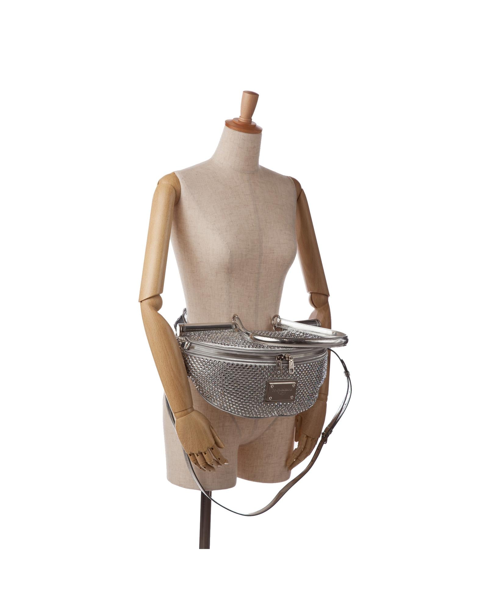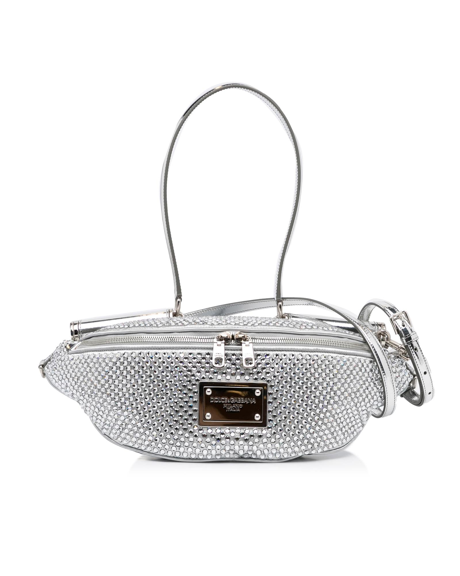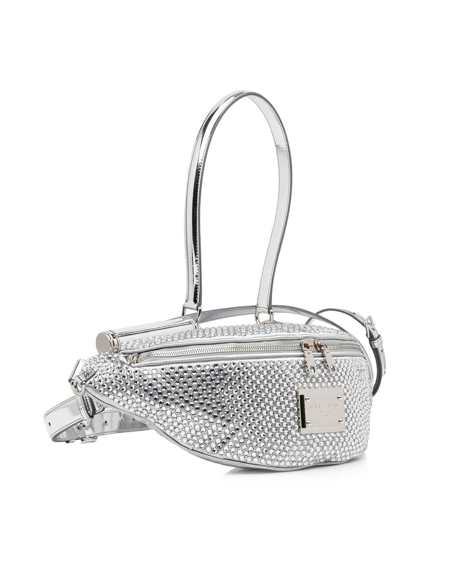 The Sicily belt bag features a crystal-embellished leather body silver-tone hardware logo plaque a single flat top handle an adjustable waist strap an adjustable detachable shoulder strap a front zip closure and interior zip and slip pockets.