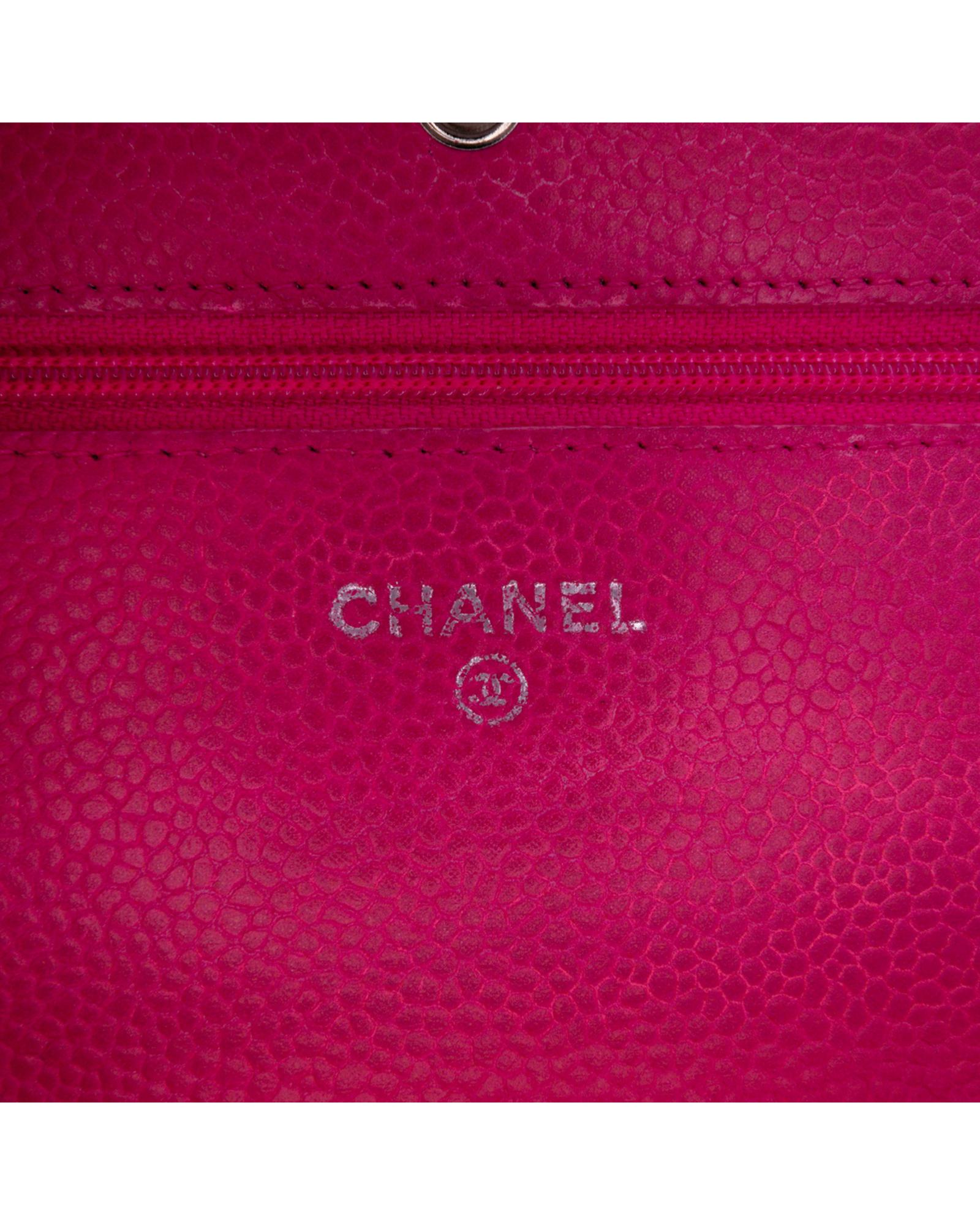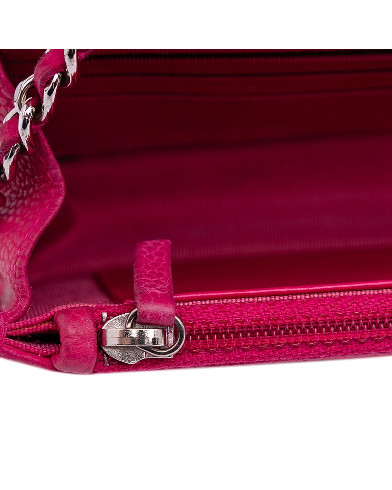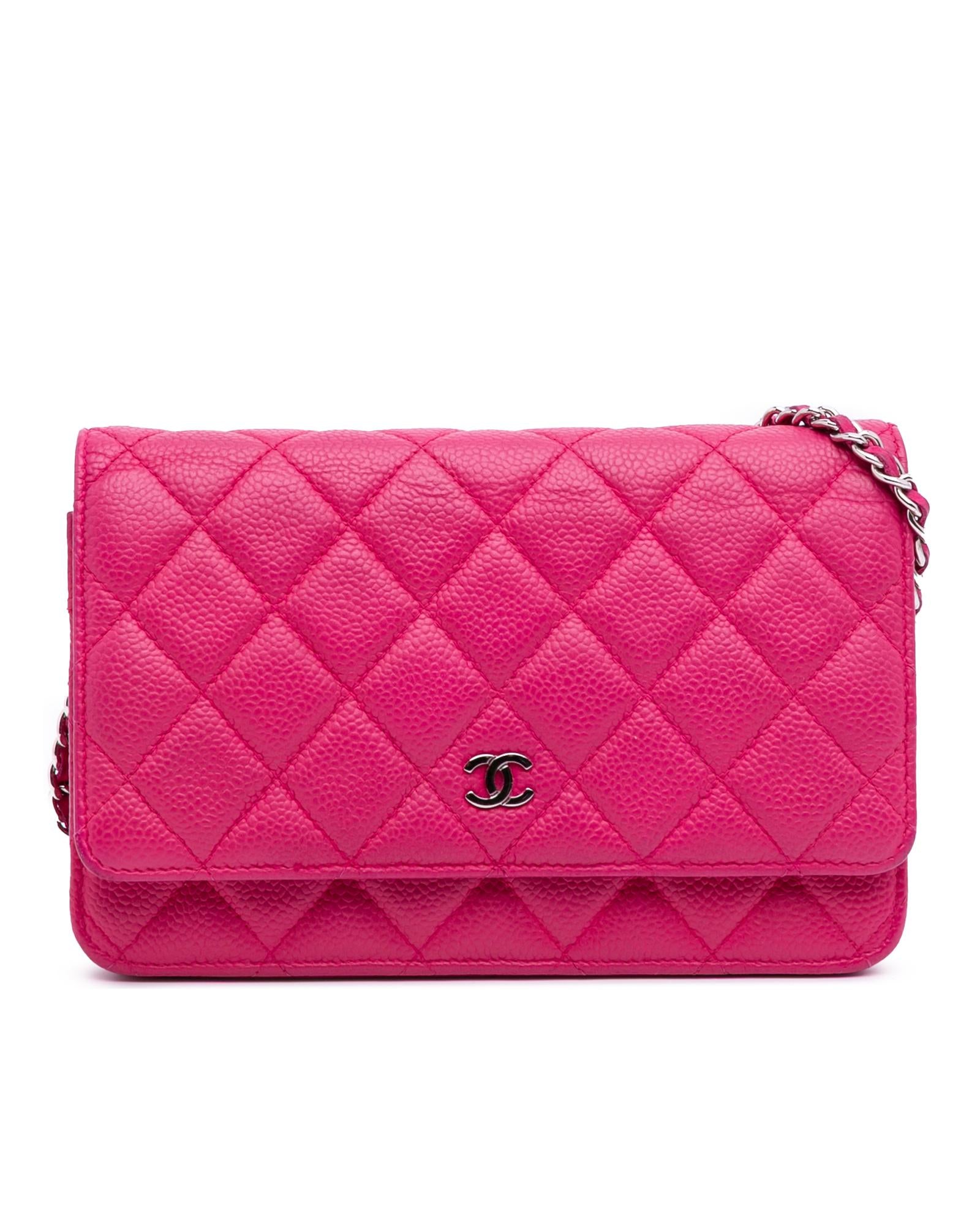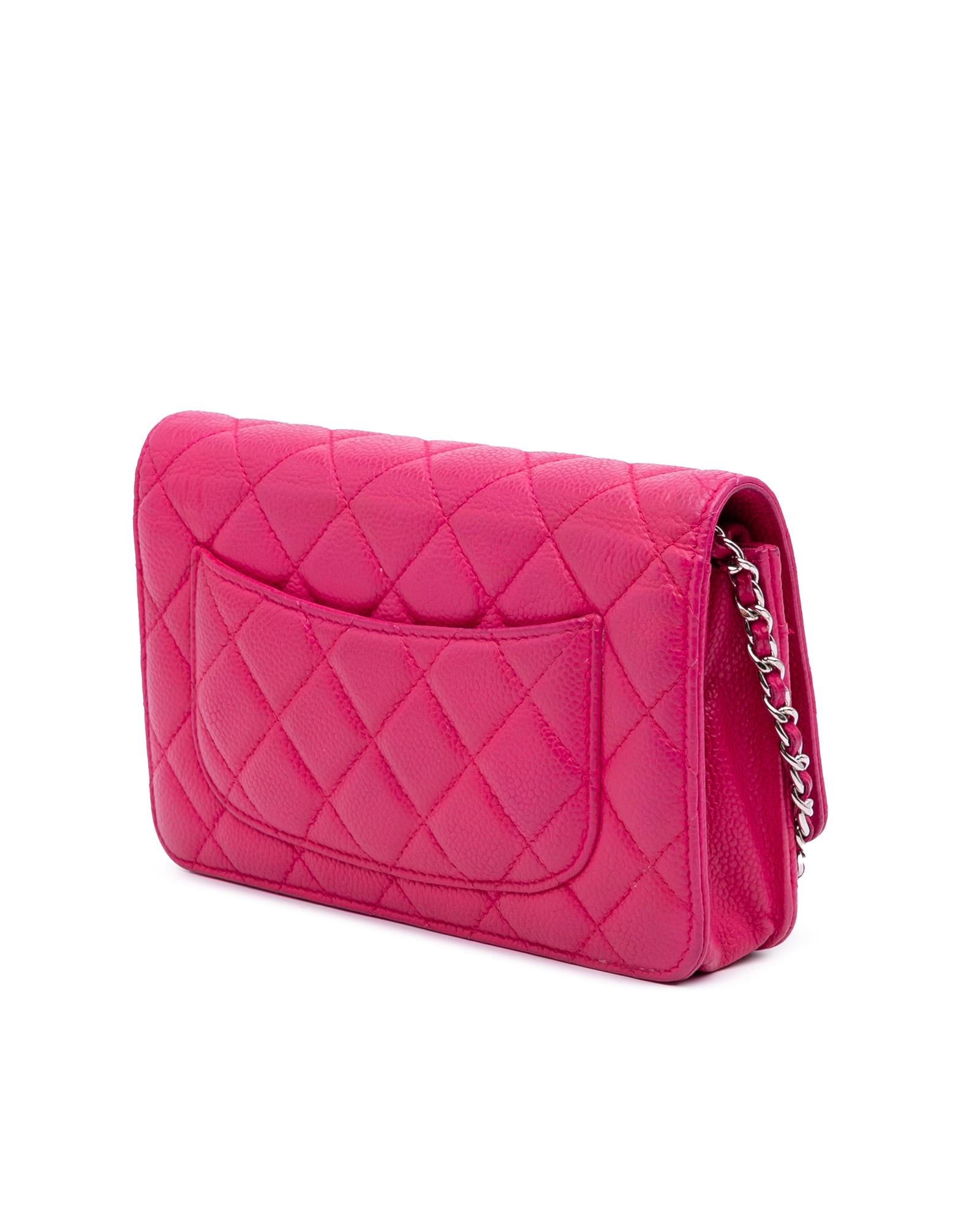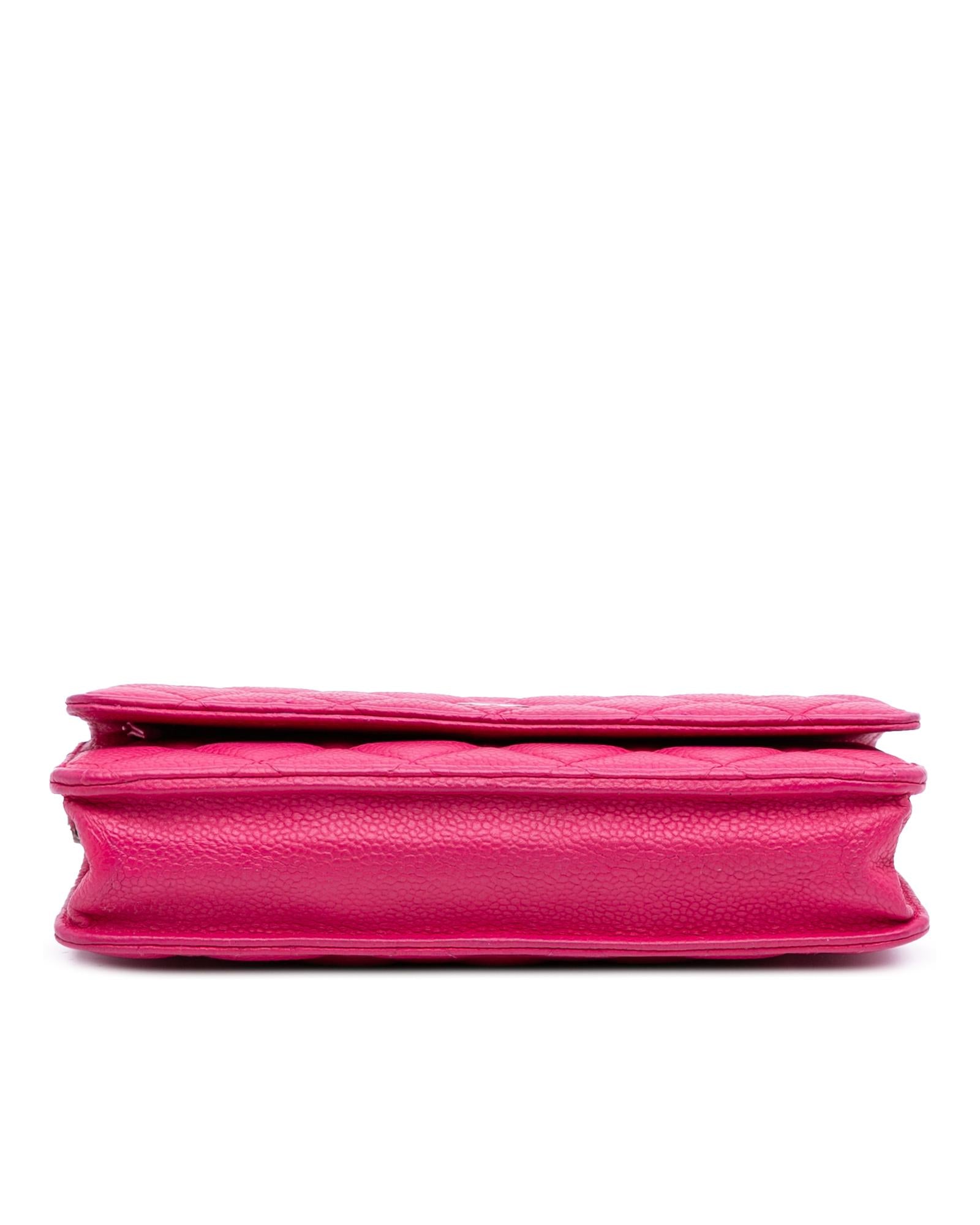 This wallet on chain features a quilted caviar leather body a silver-tone woven chain strap a front flap with magnetic snap closure and interior zip and slip pockets.