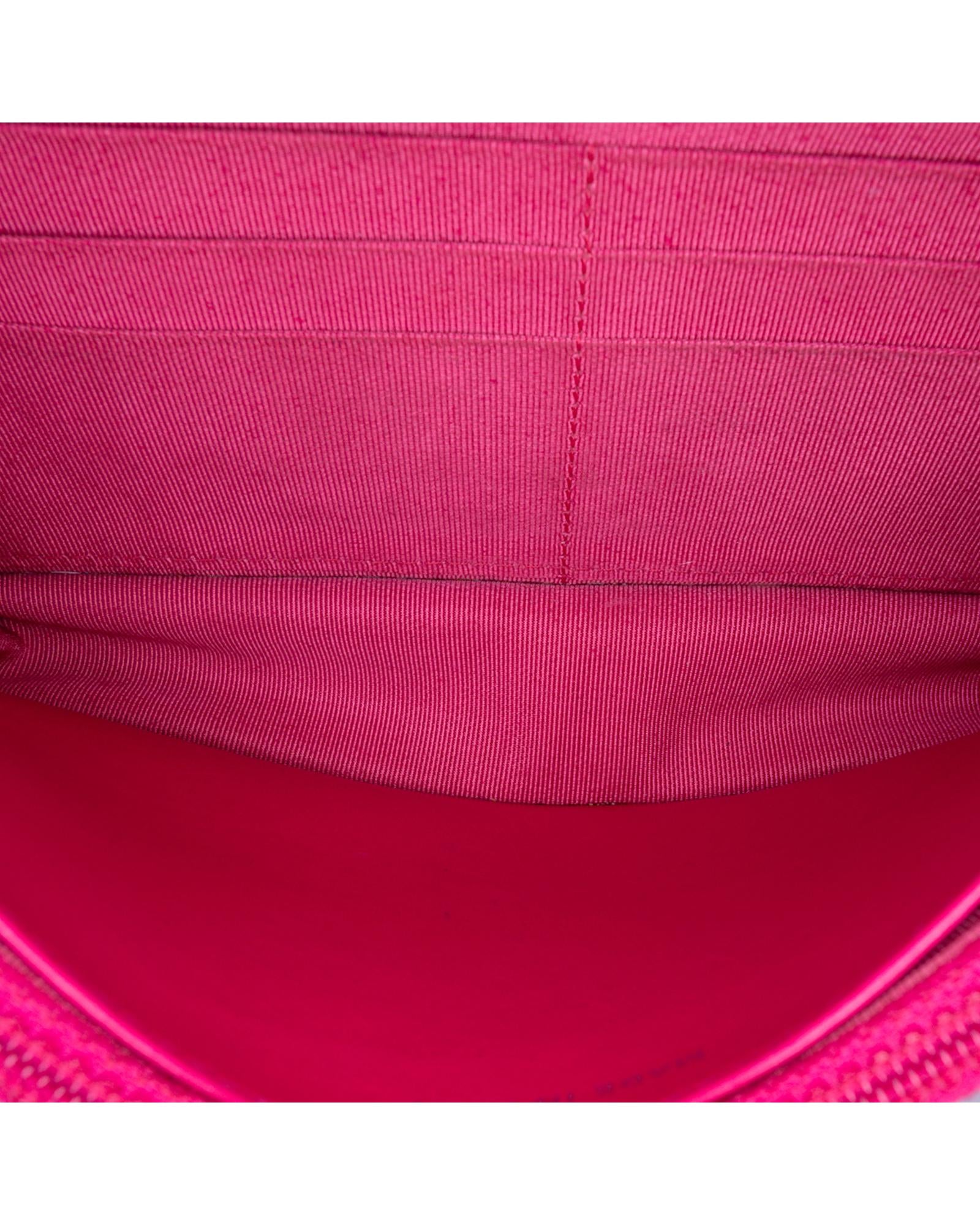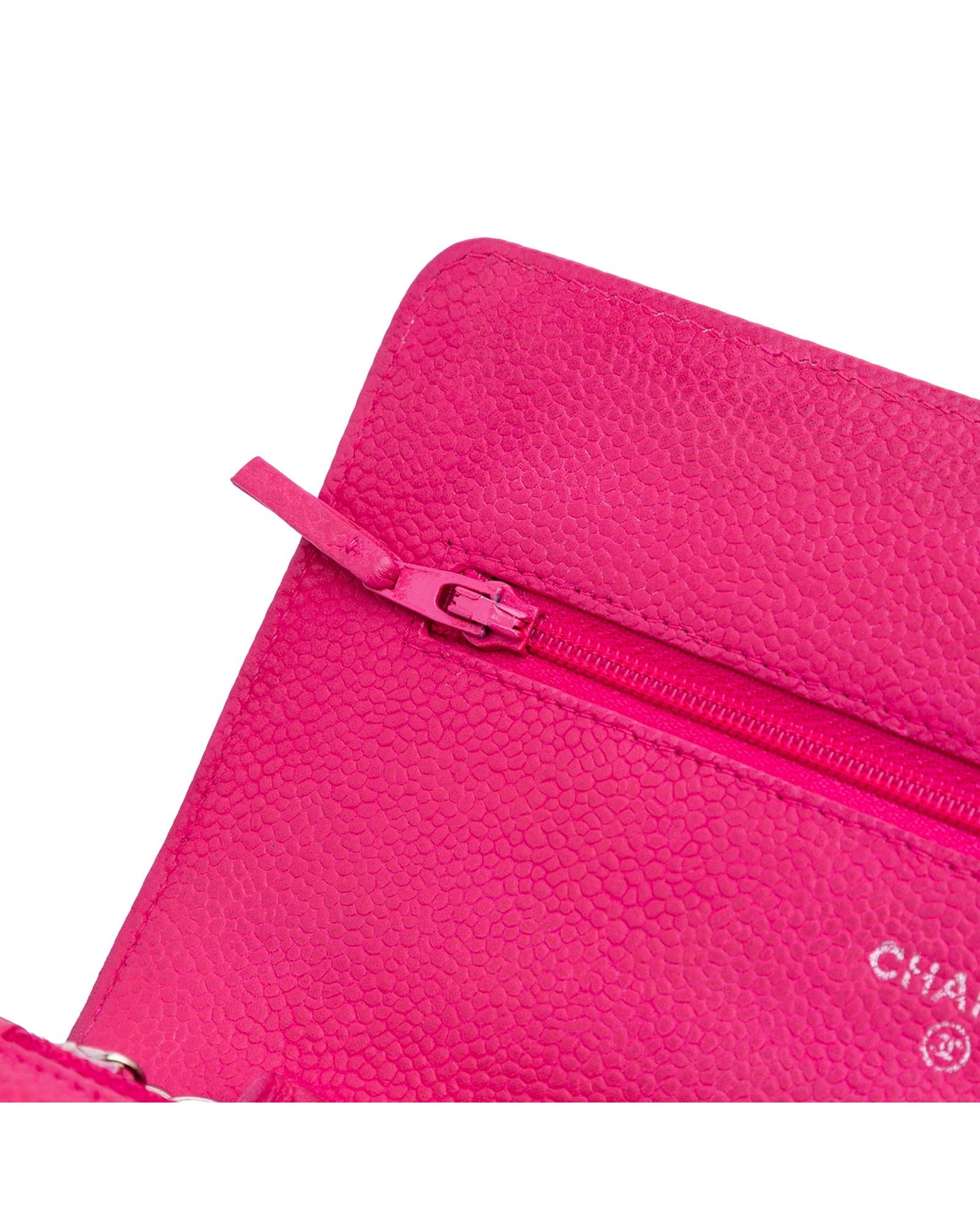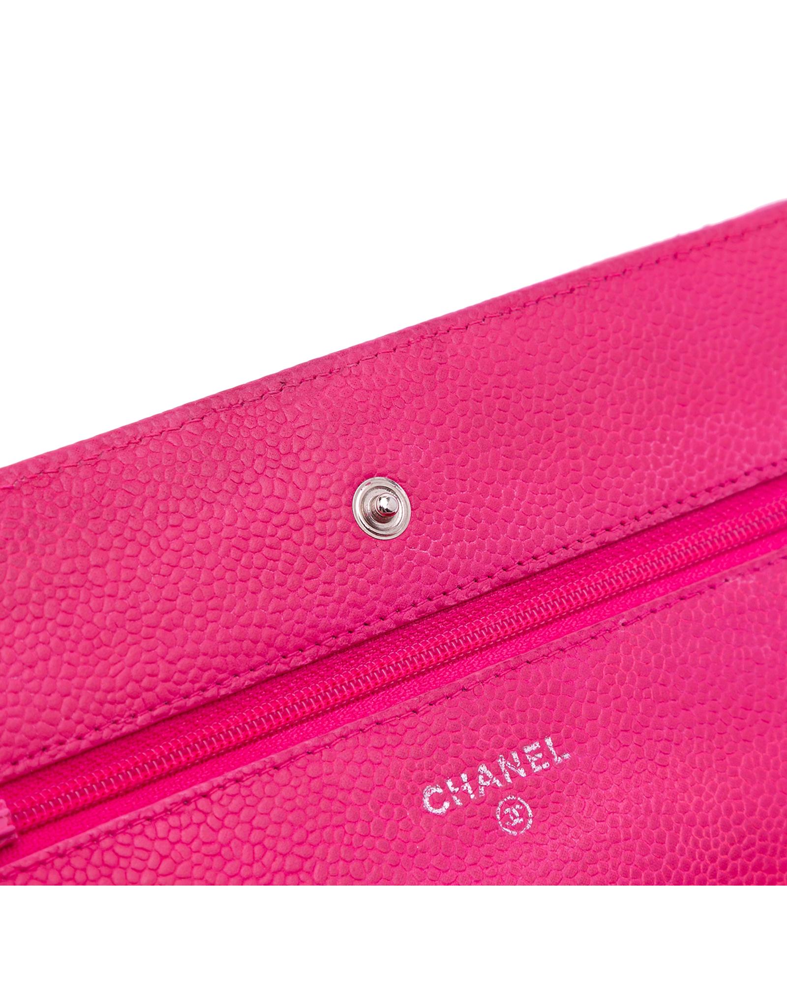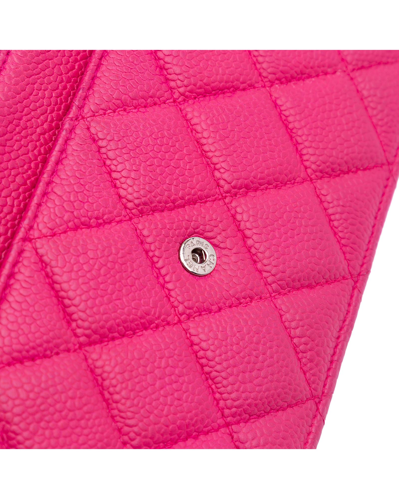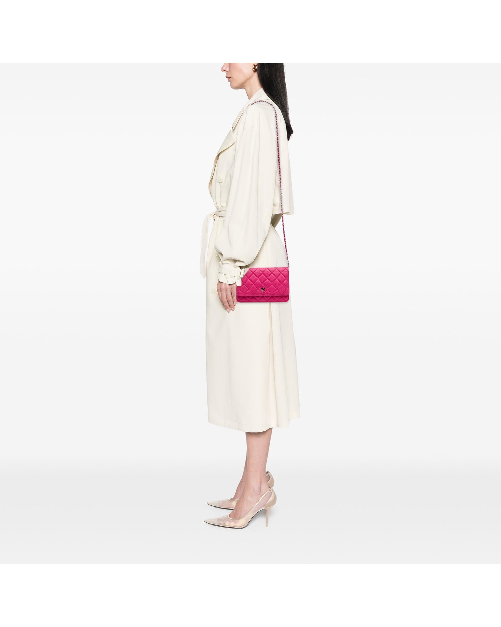 This wallet on chain features a quilted caviar leather body a silver-tone woven chain strap a front flap with magnetic snap closure and interior zip and slip pockets.