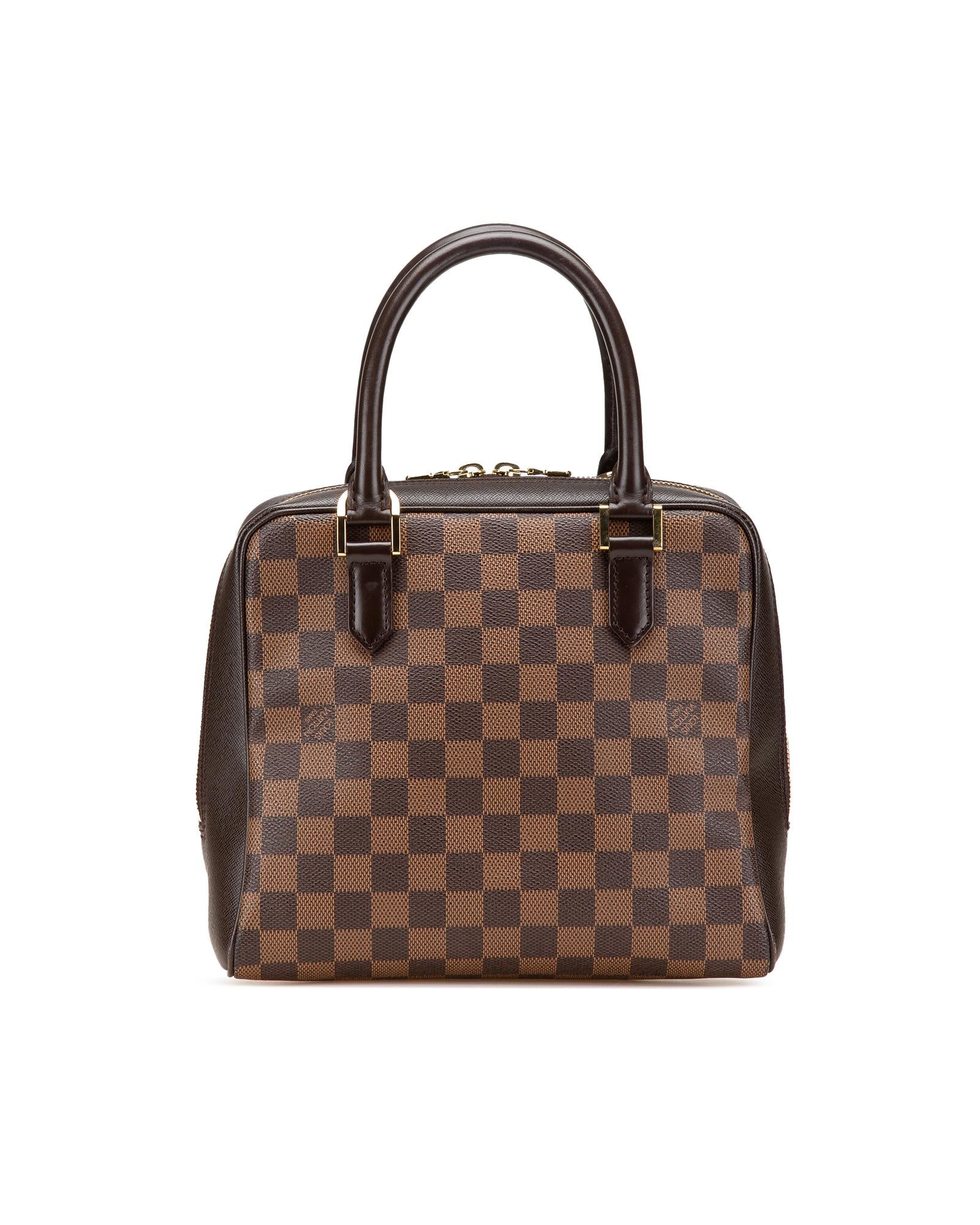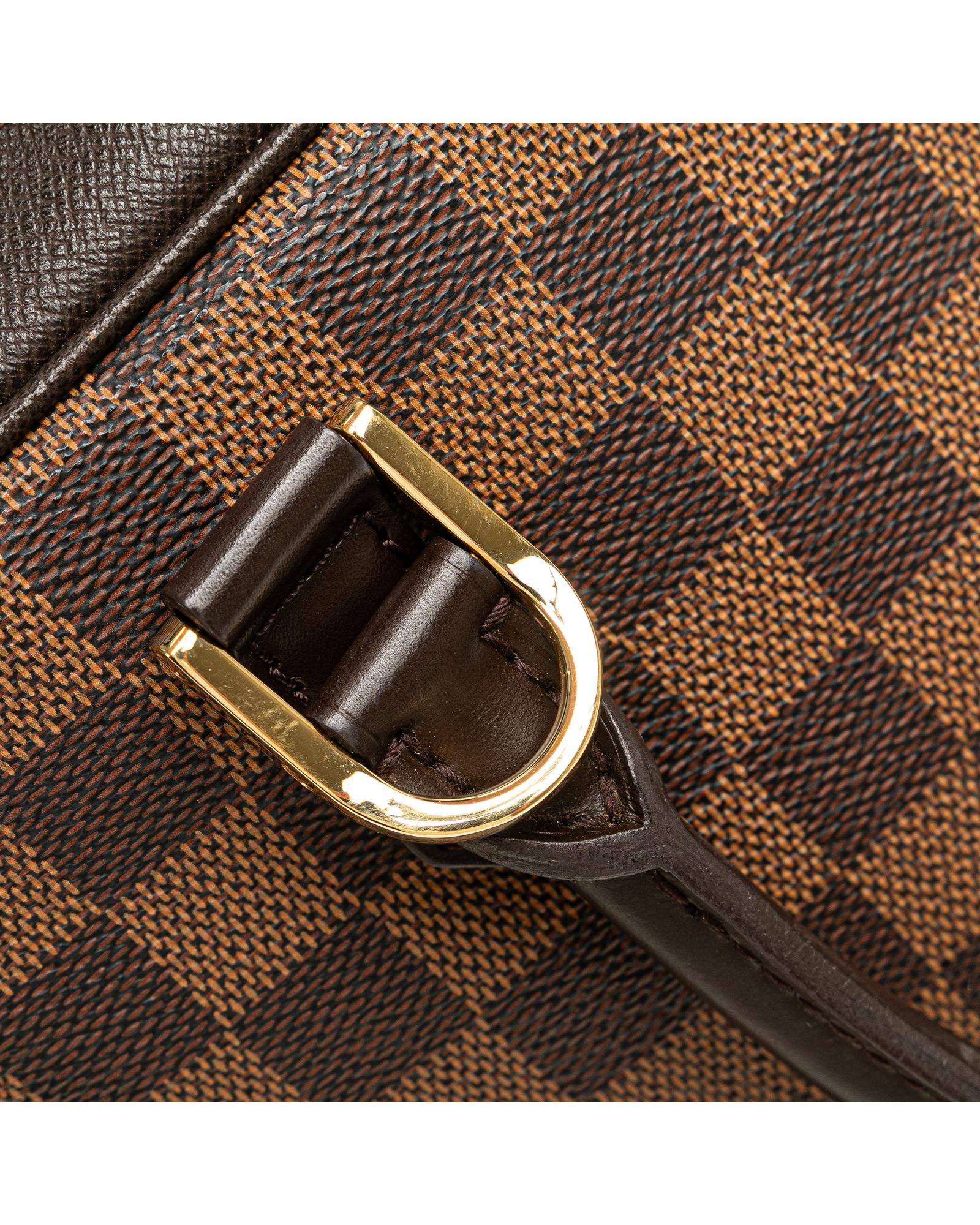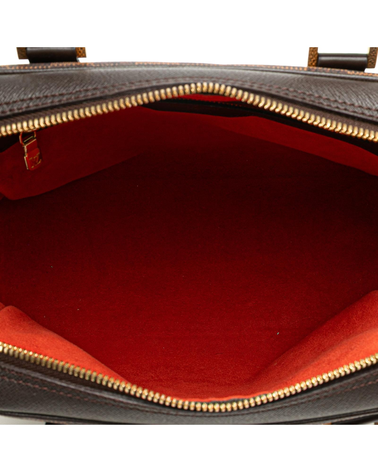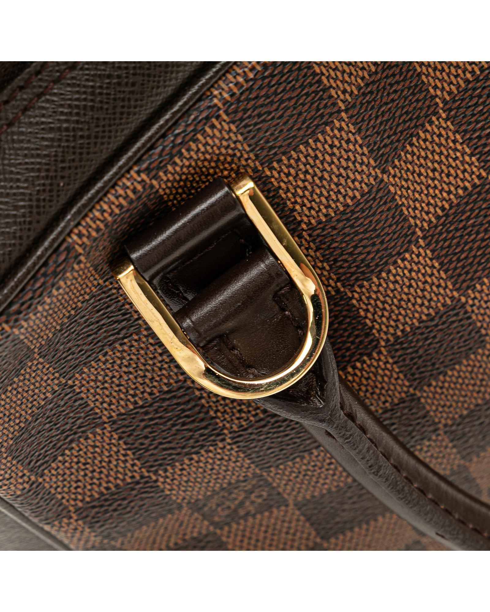 The Brera features a damier ebene canvas body with leather trim rolled leather handles a top zip closure and an interior zip pocket.