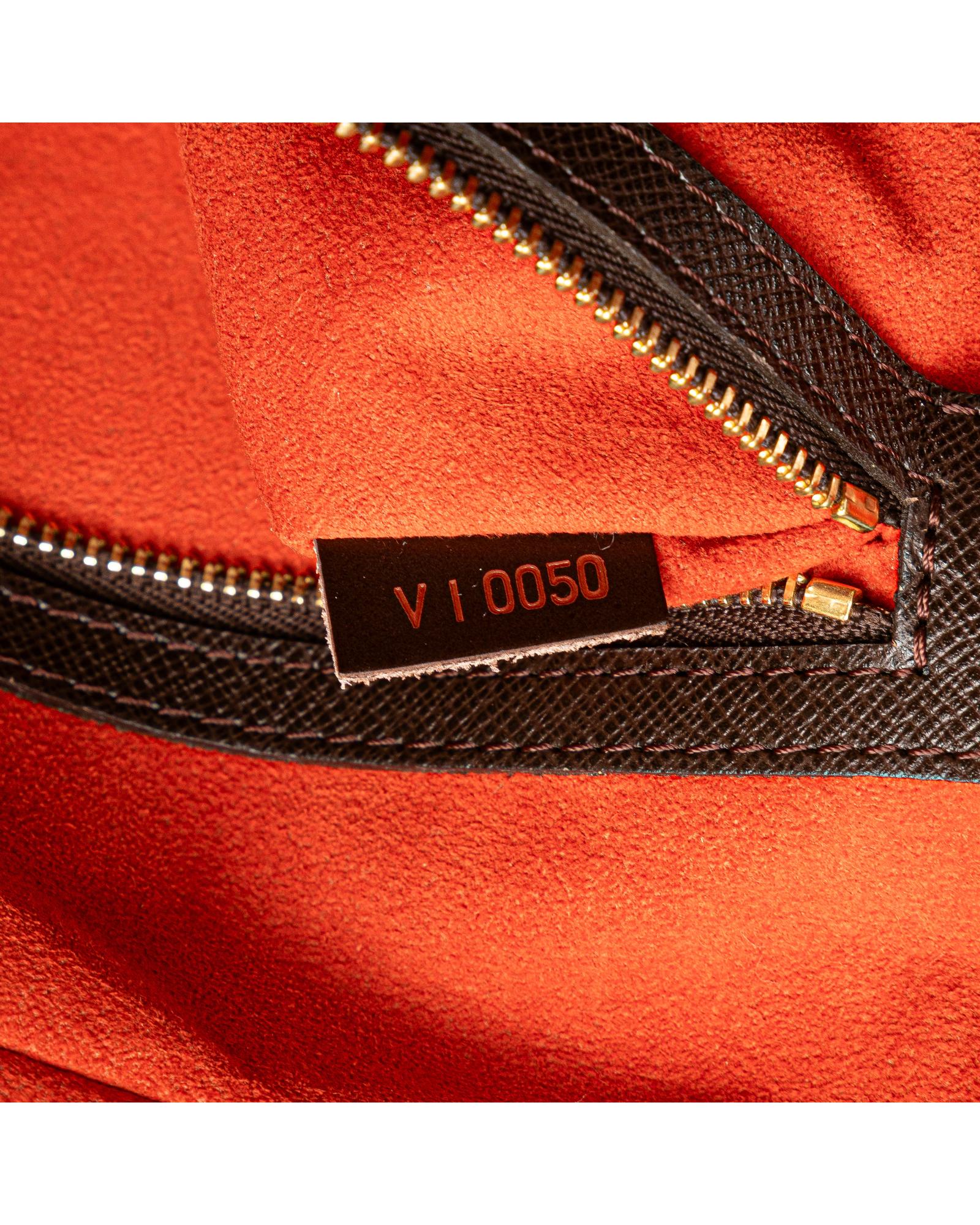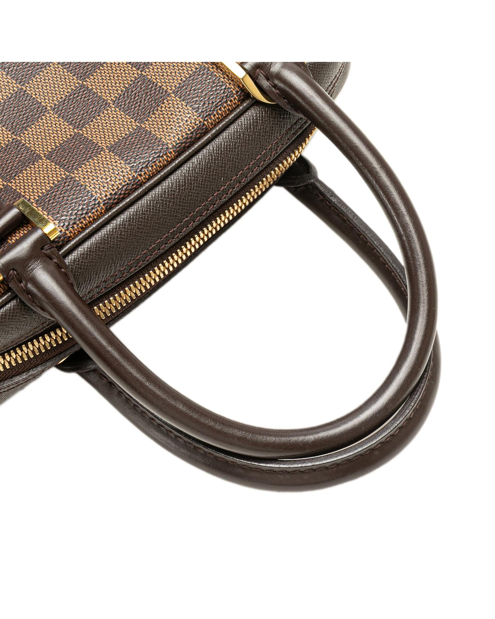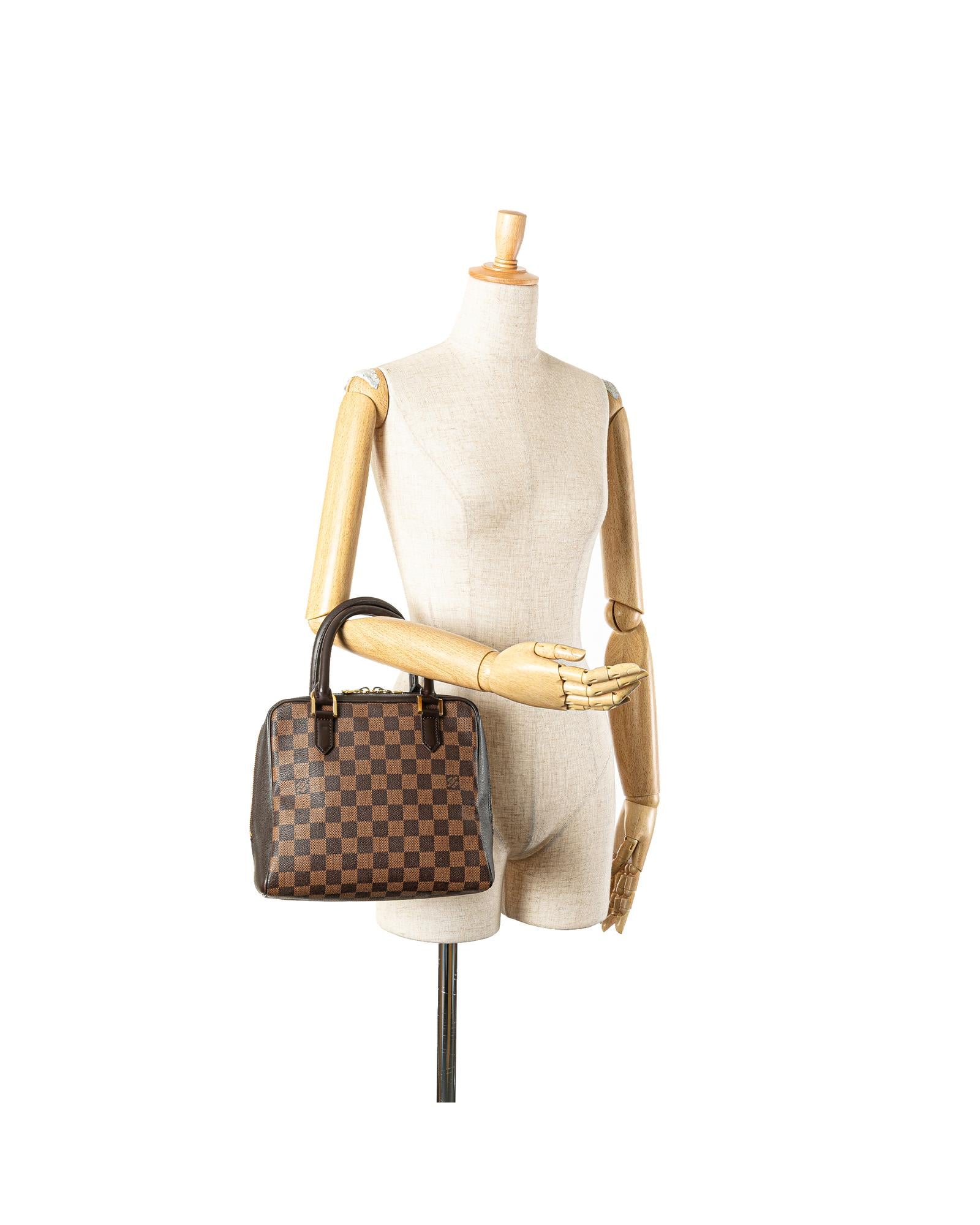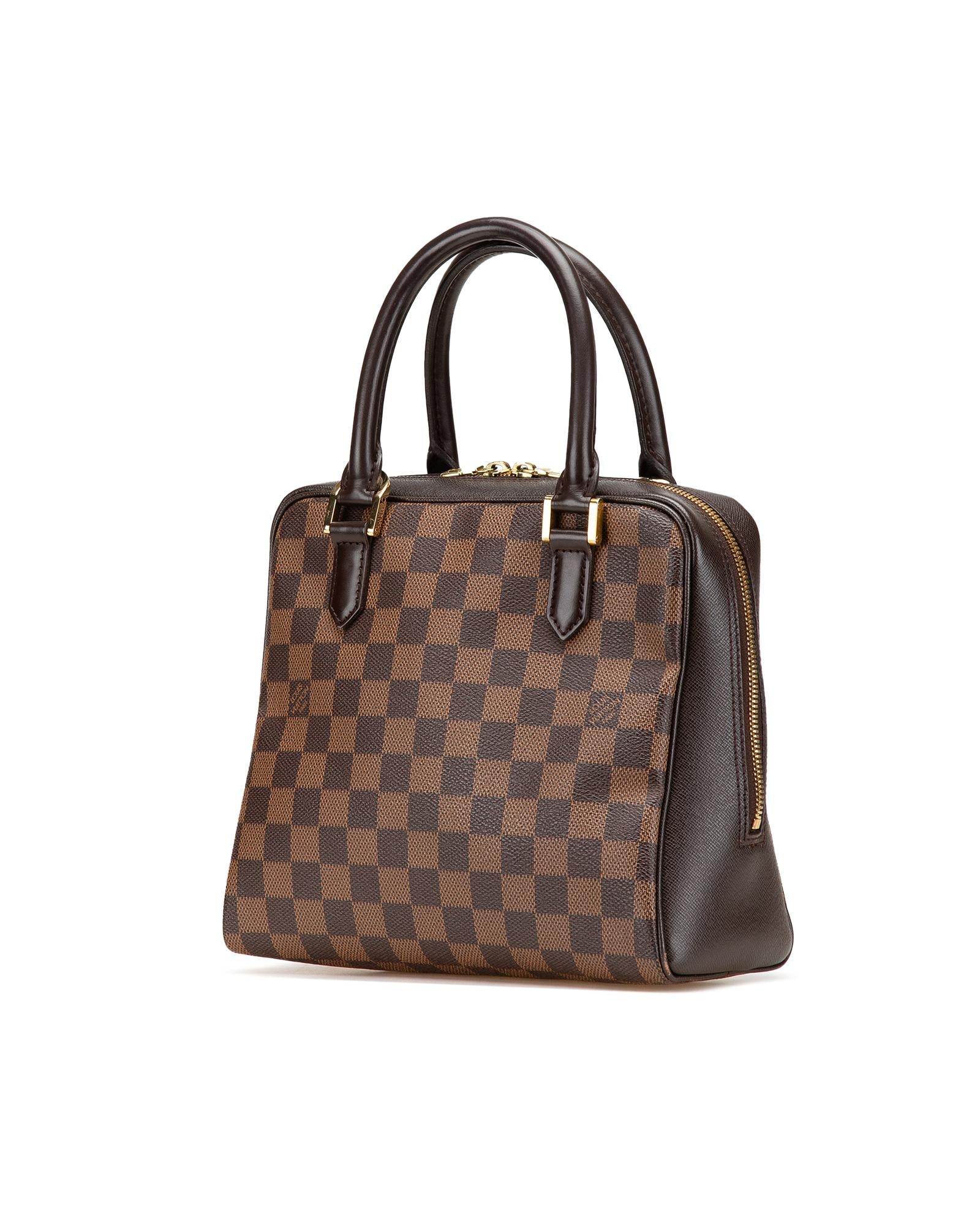 The Brera features a damier ebene canvas body with leather trim rolled leather handles a top zip closure and an interior zip pocket.