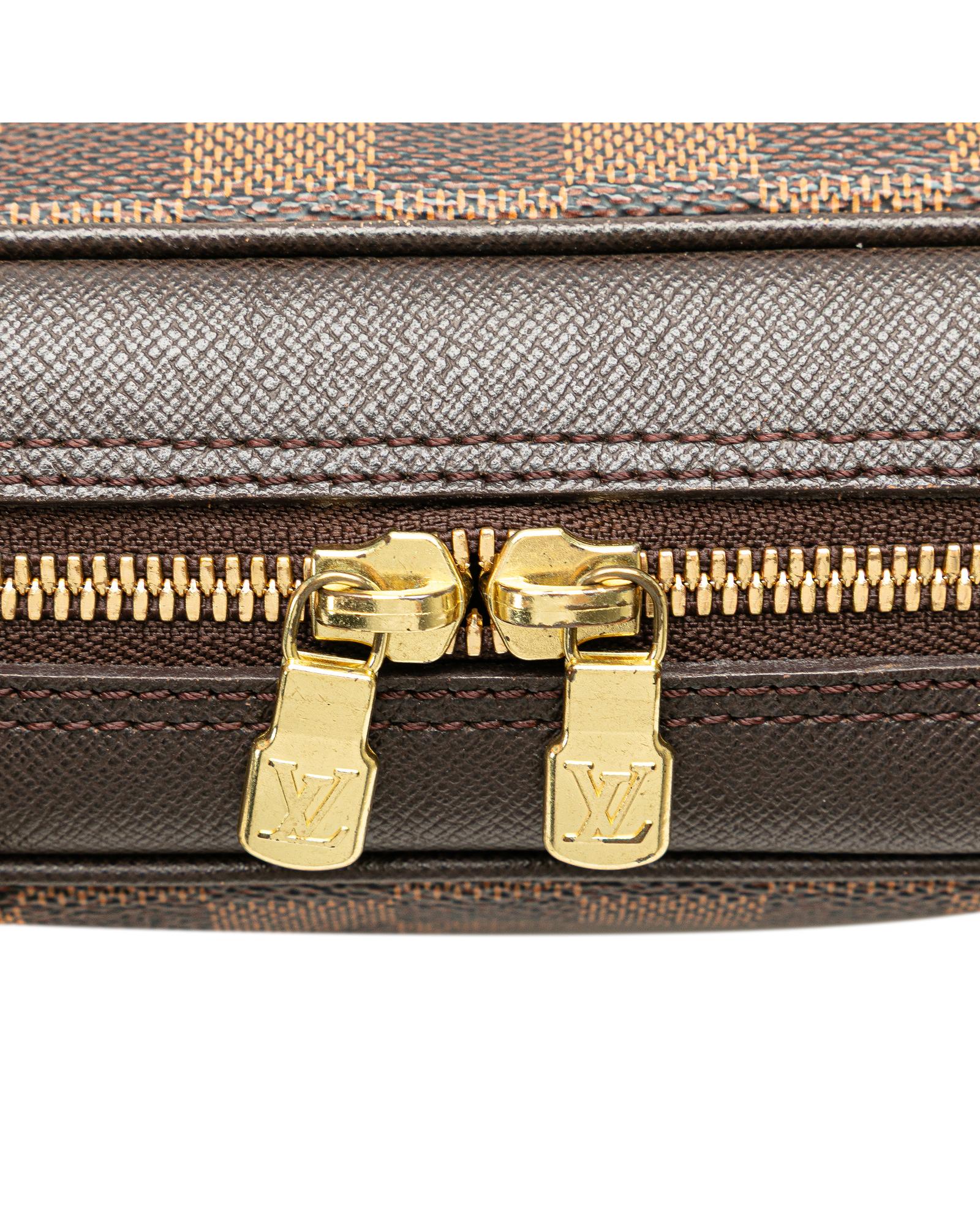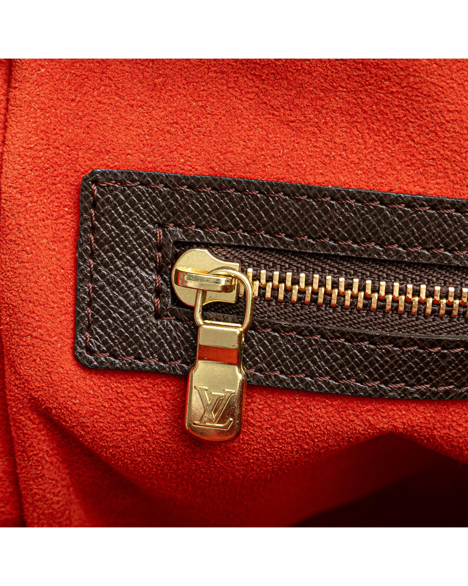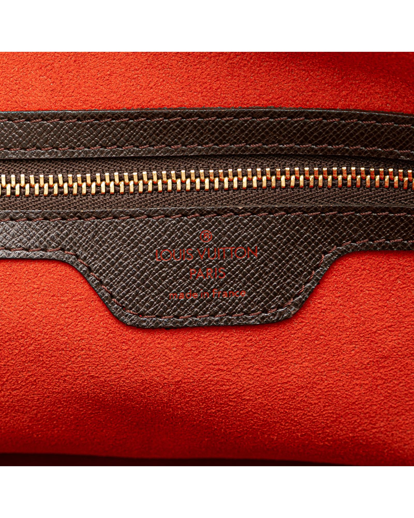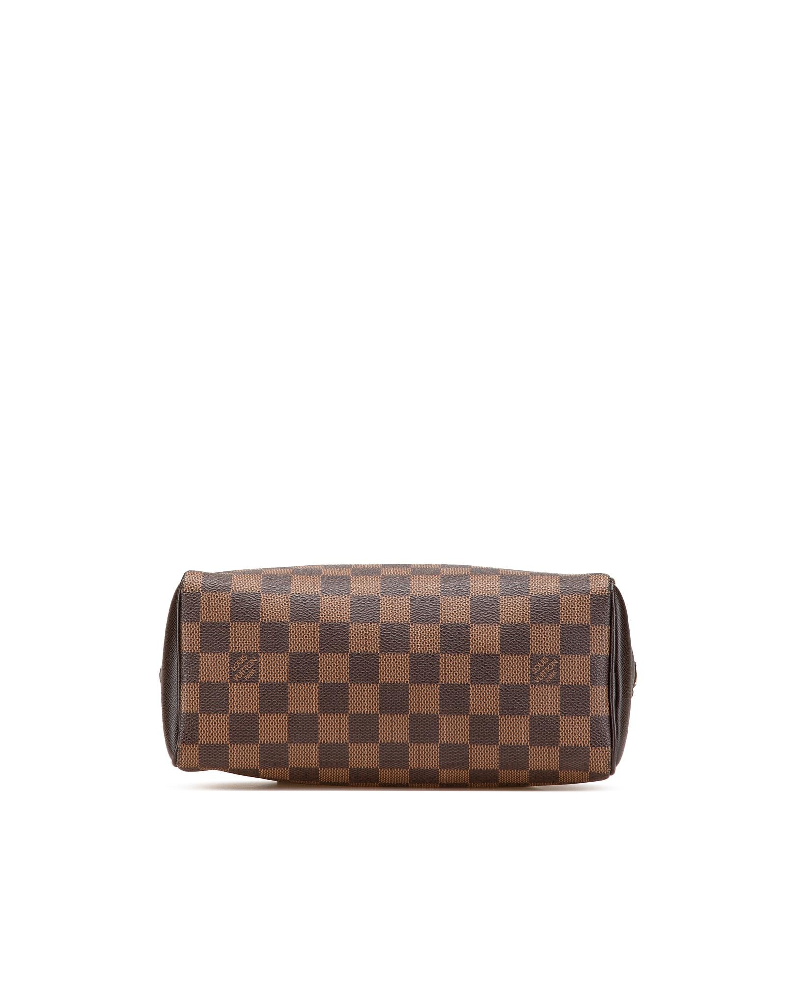 The Brera features a damier ebene canvas body with leather trim rolled leather handles a top zip closure and an interior zip pocket.