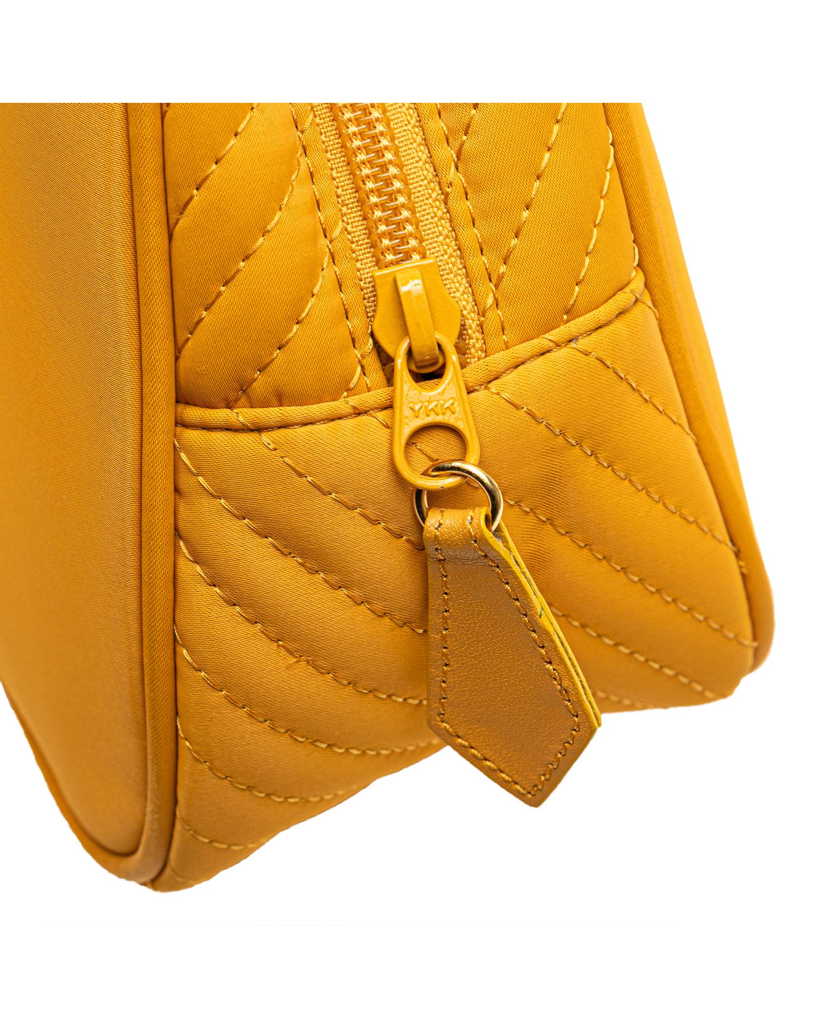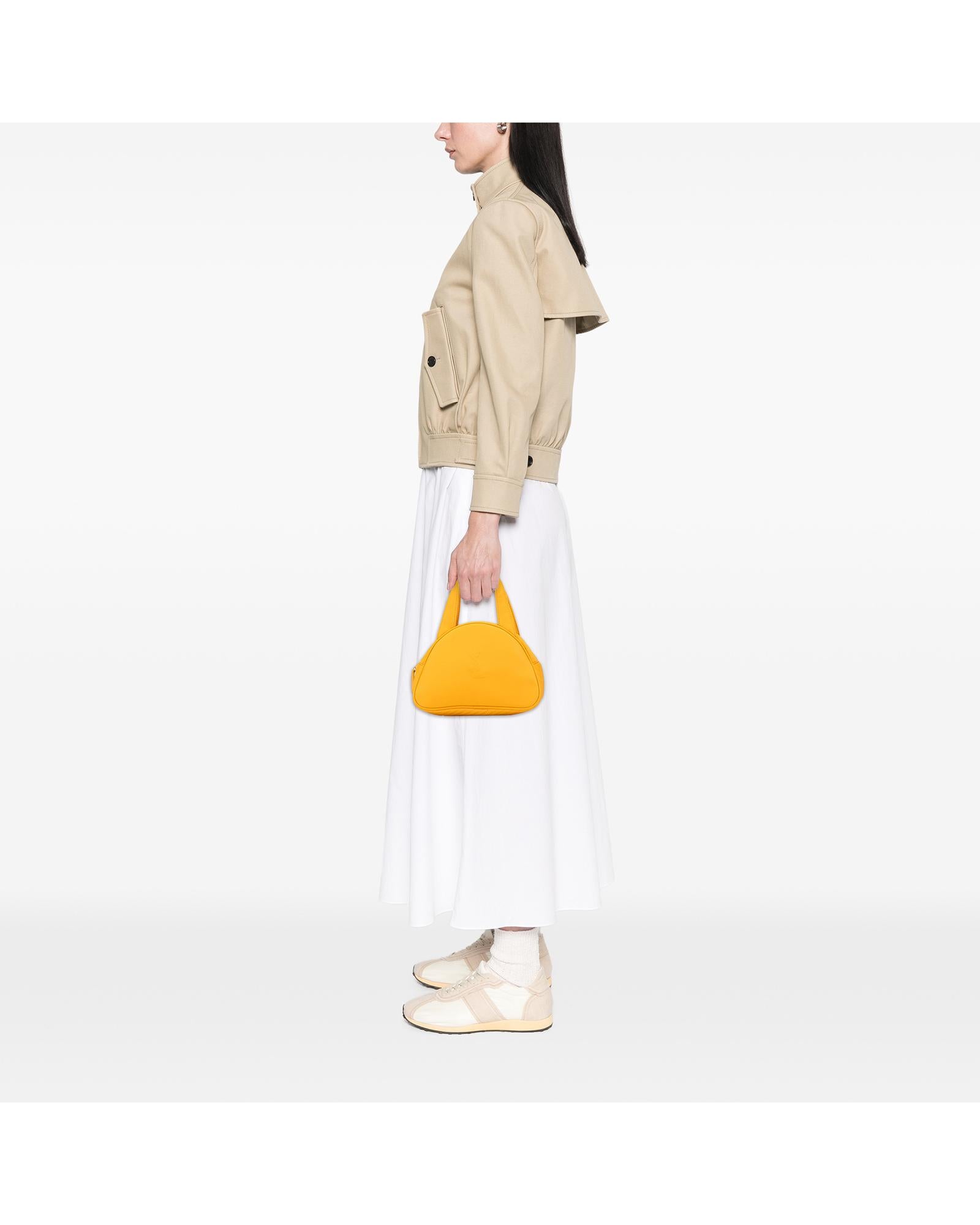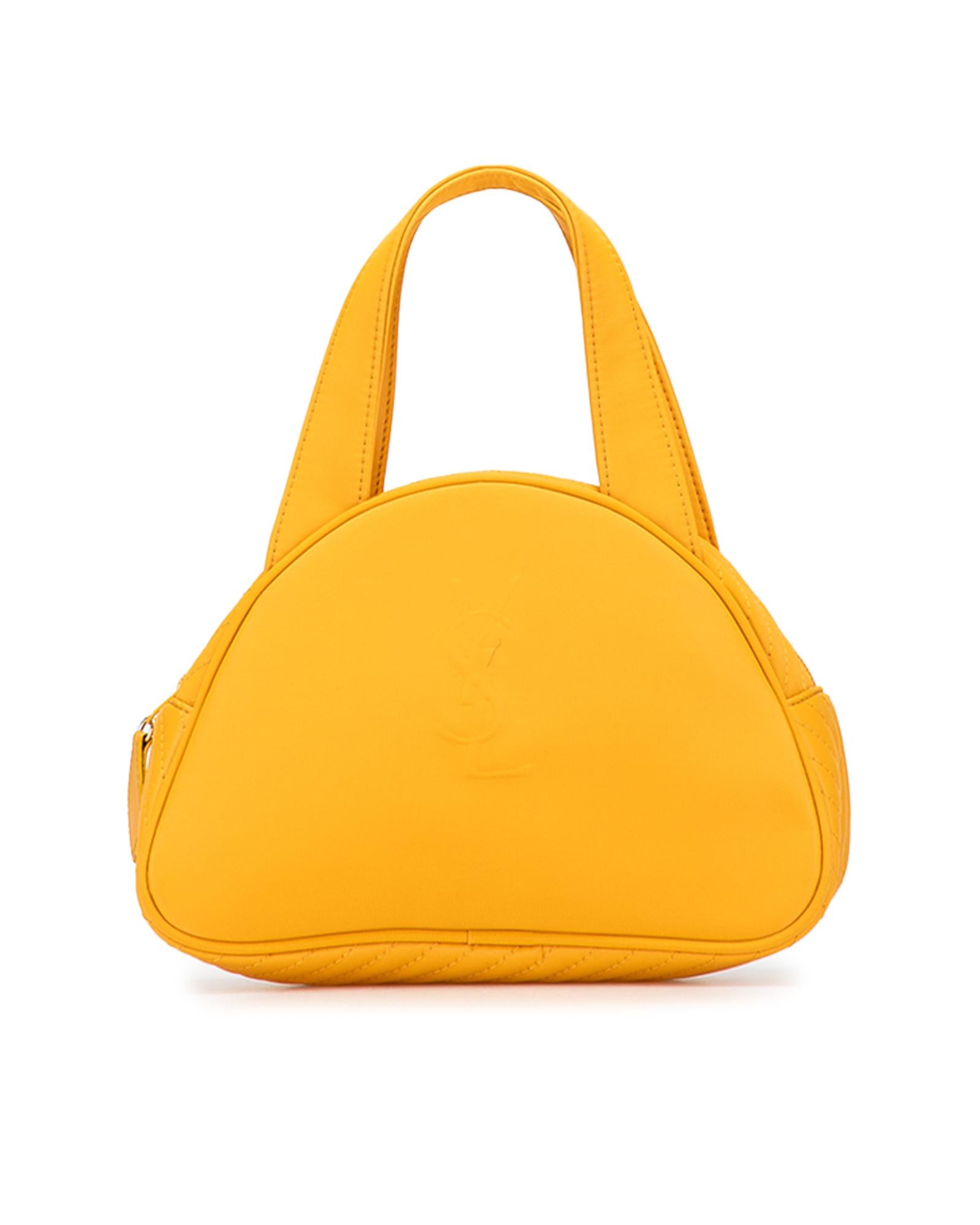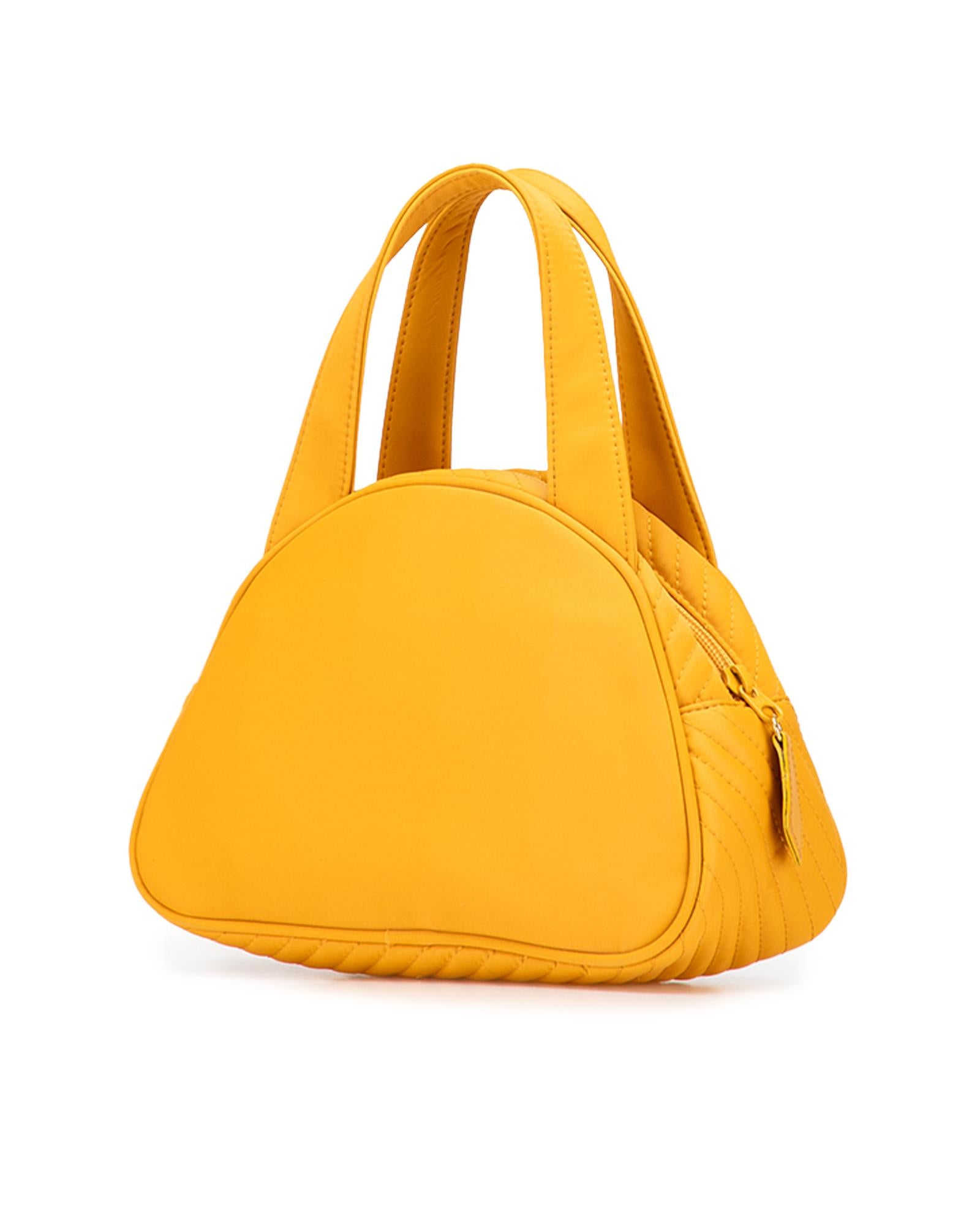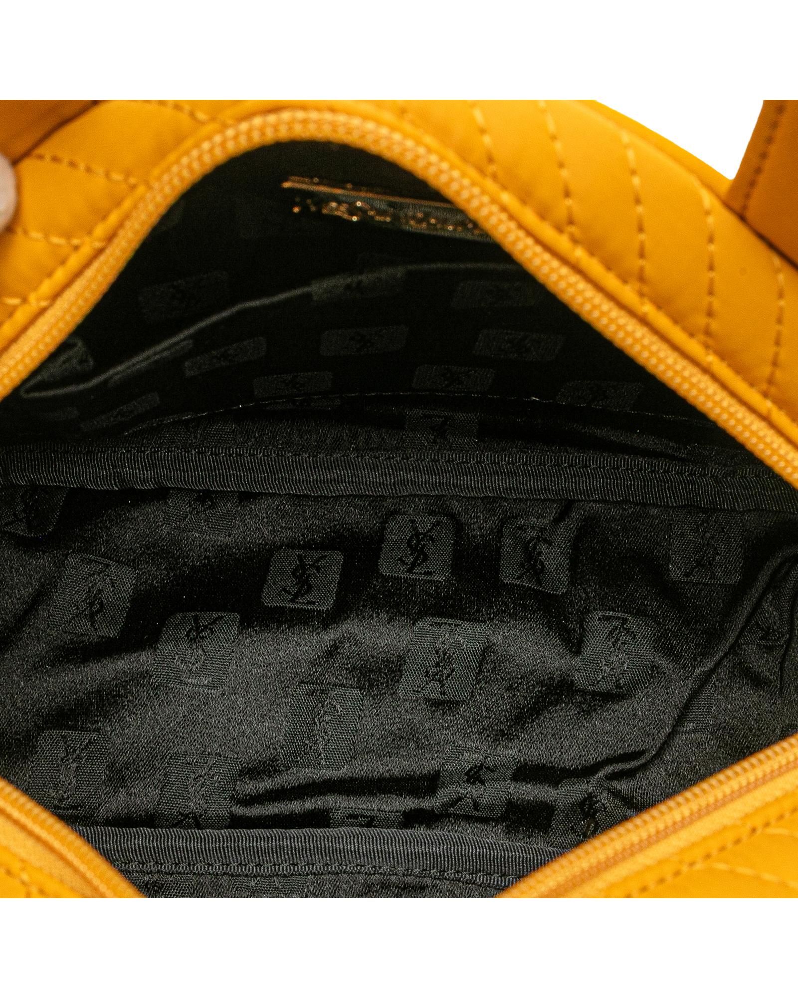 This handbag features a nylon body flat handles a top zip closure and an interior slip pocket.