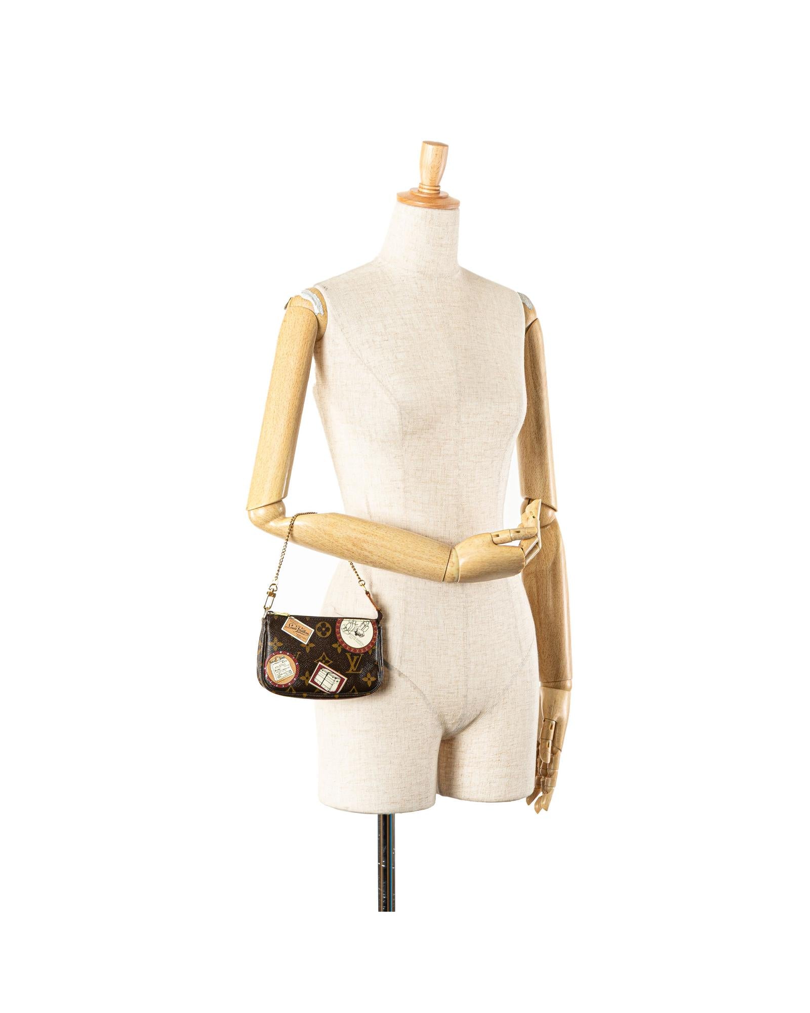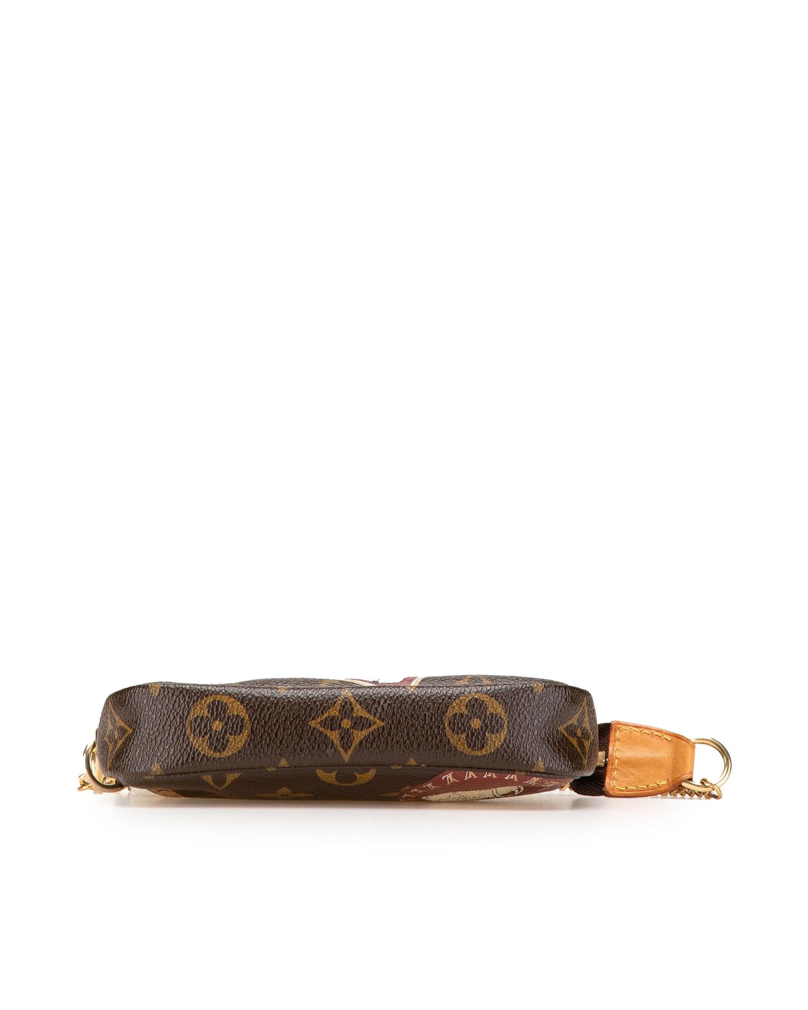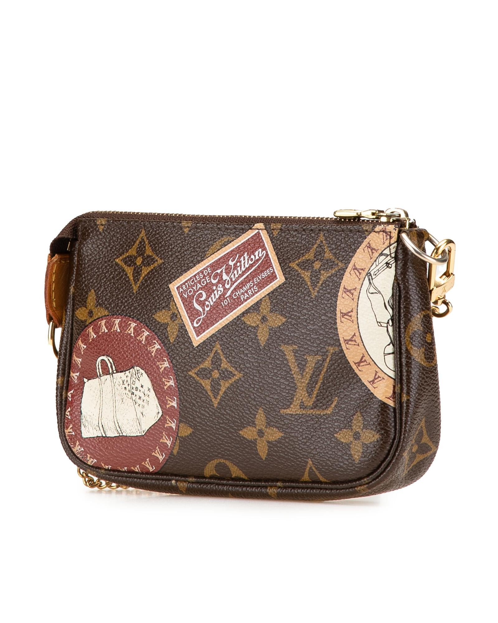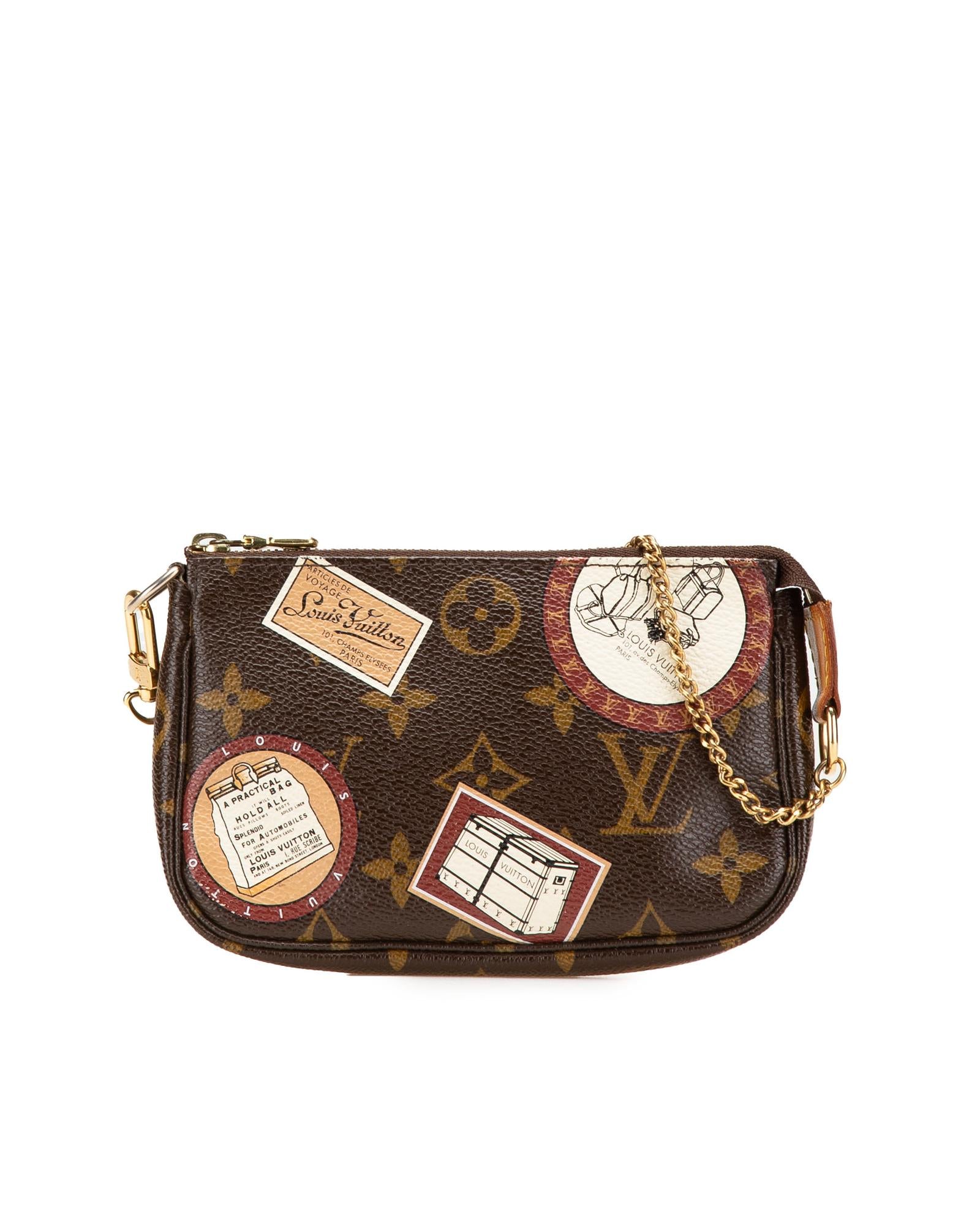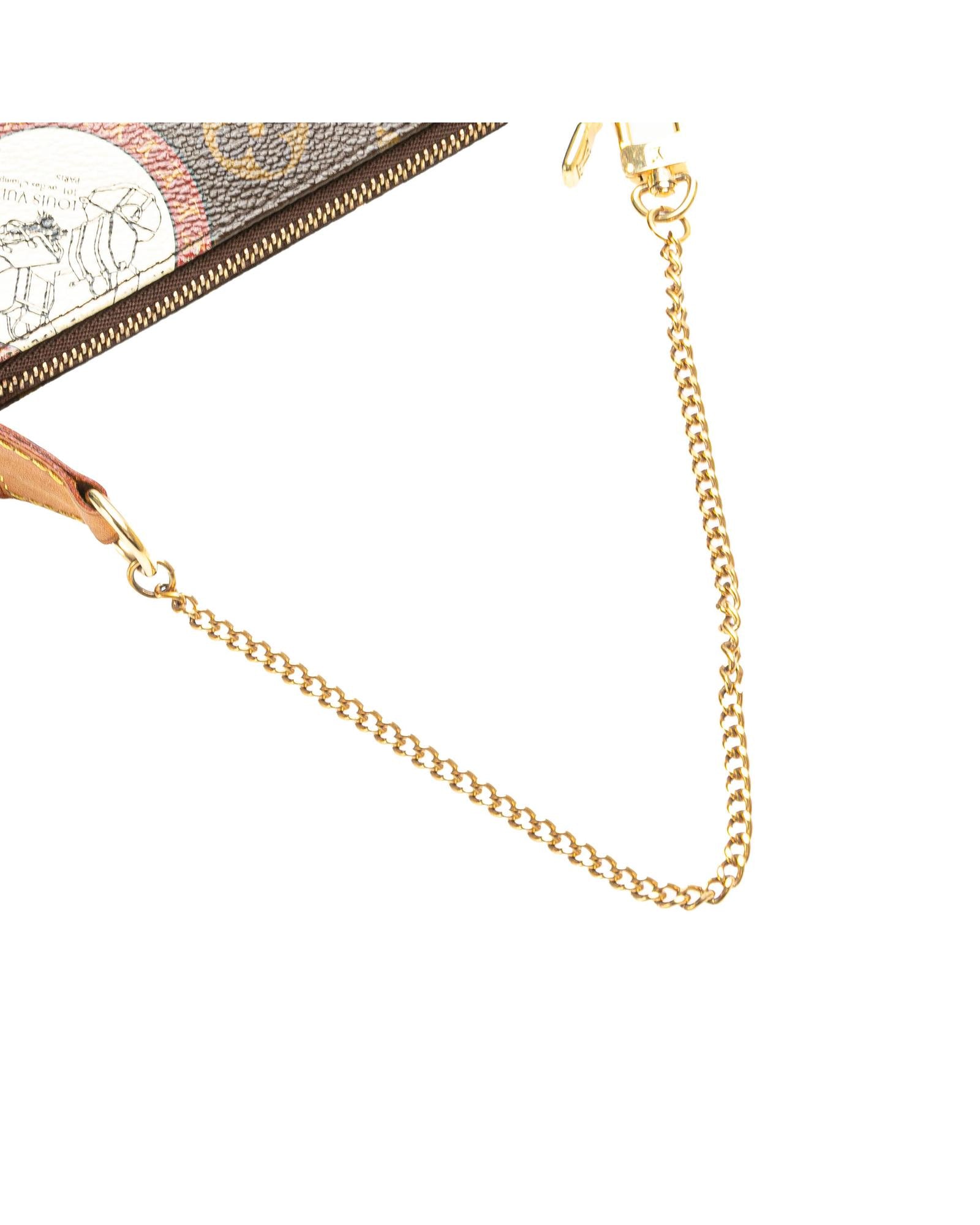 The Mini Pochette Accessoires features a monogram canvas body with printed patch details a gold-tone chain link strap and a top zip closure.