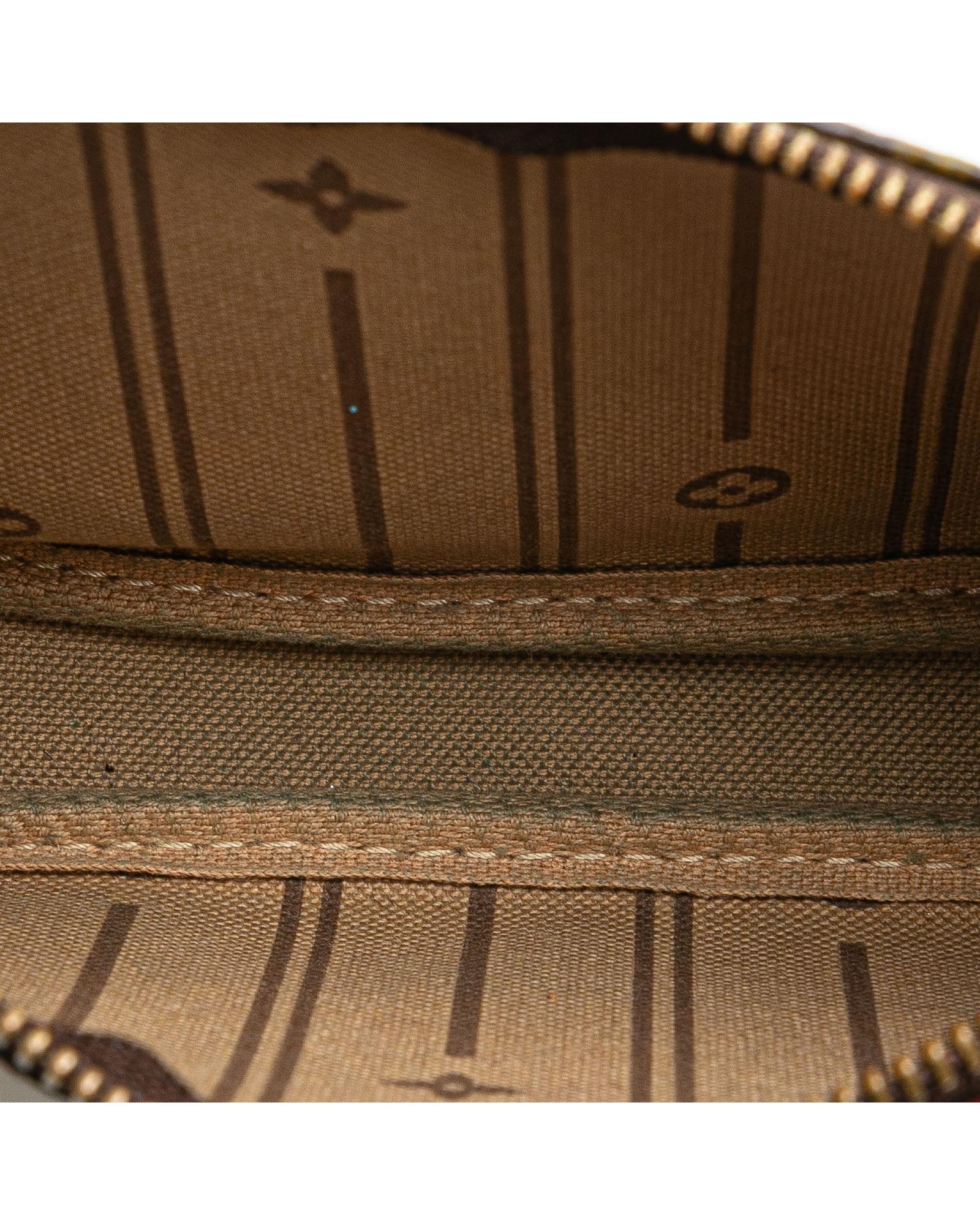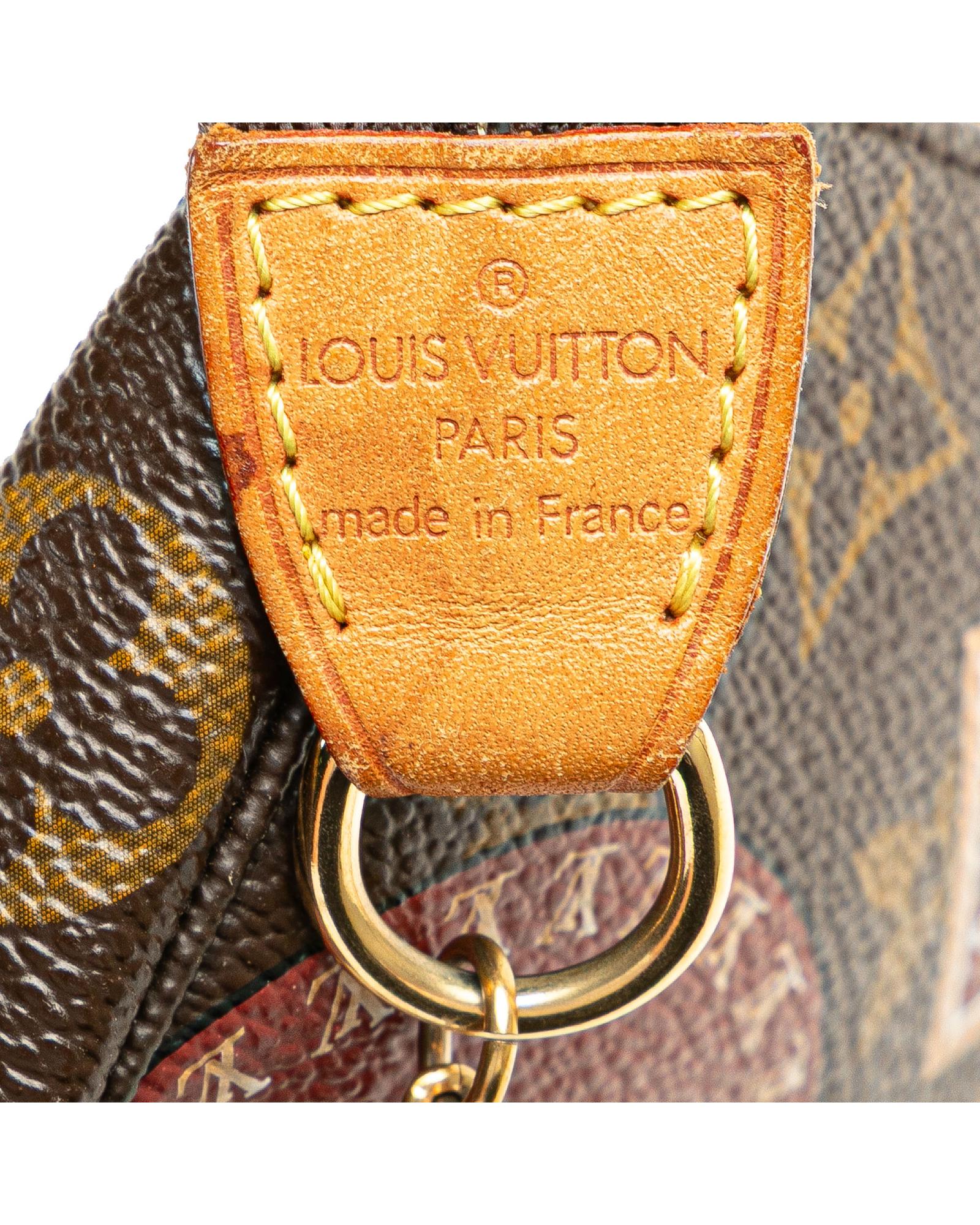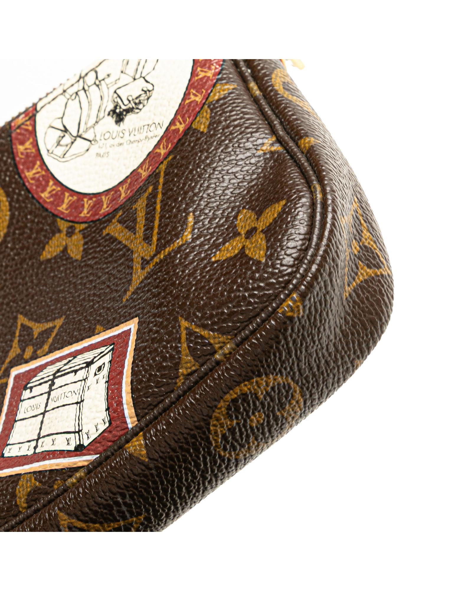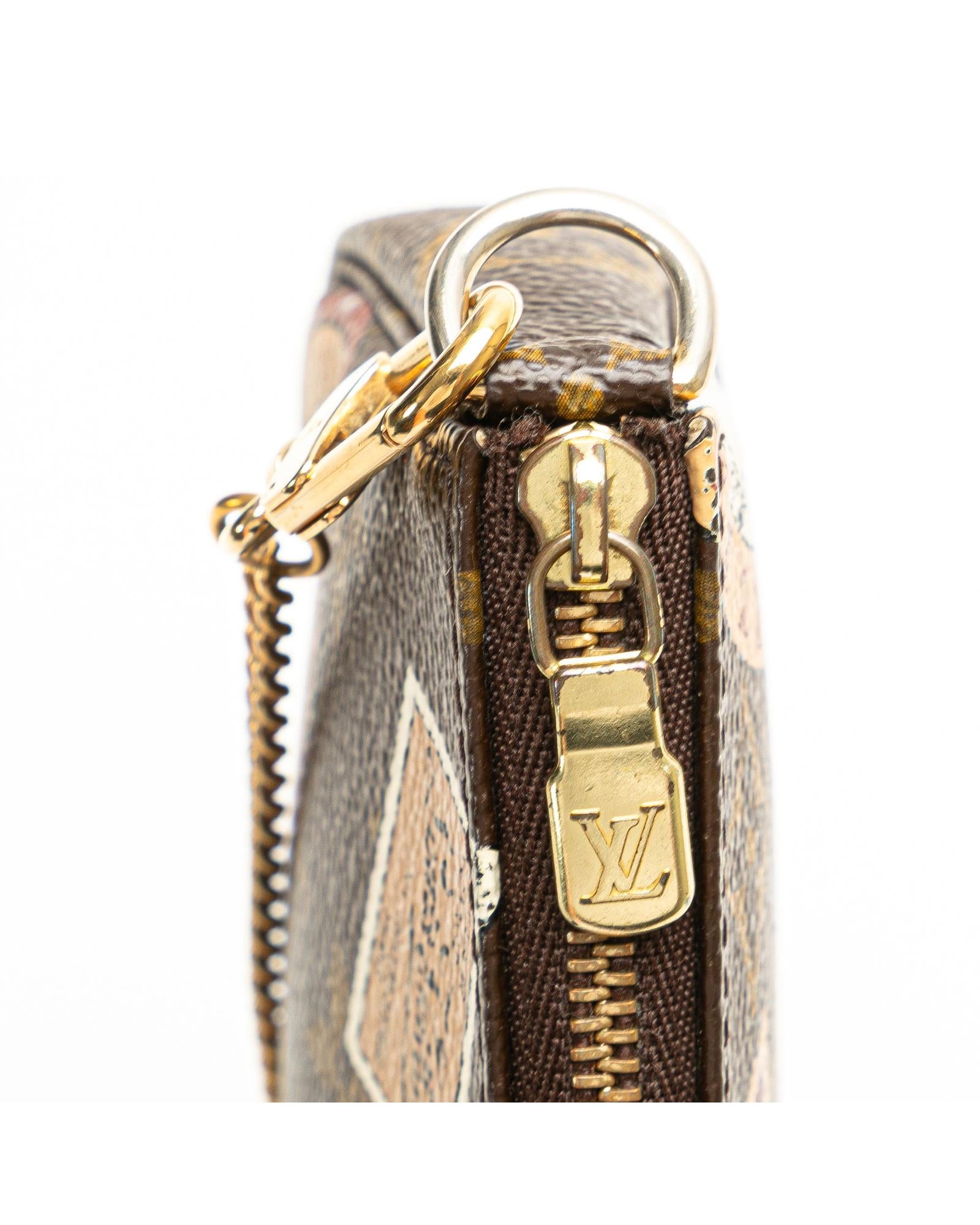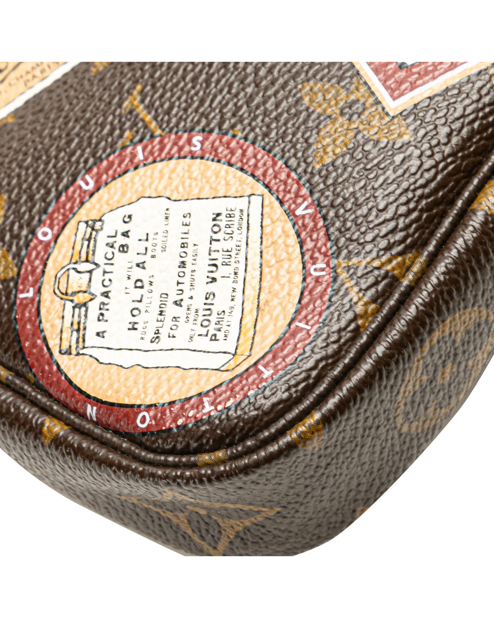 The Mini Pochette Accessoires features a monogram canvas body with printed patch details a gold-tone chain link strap and a top zip closure.