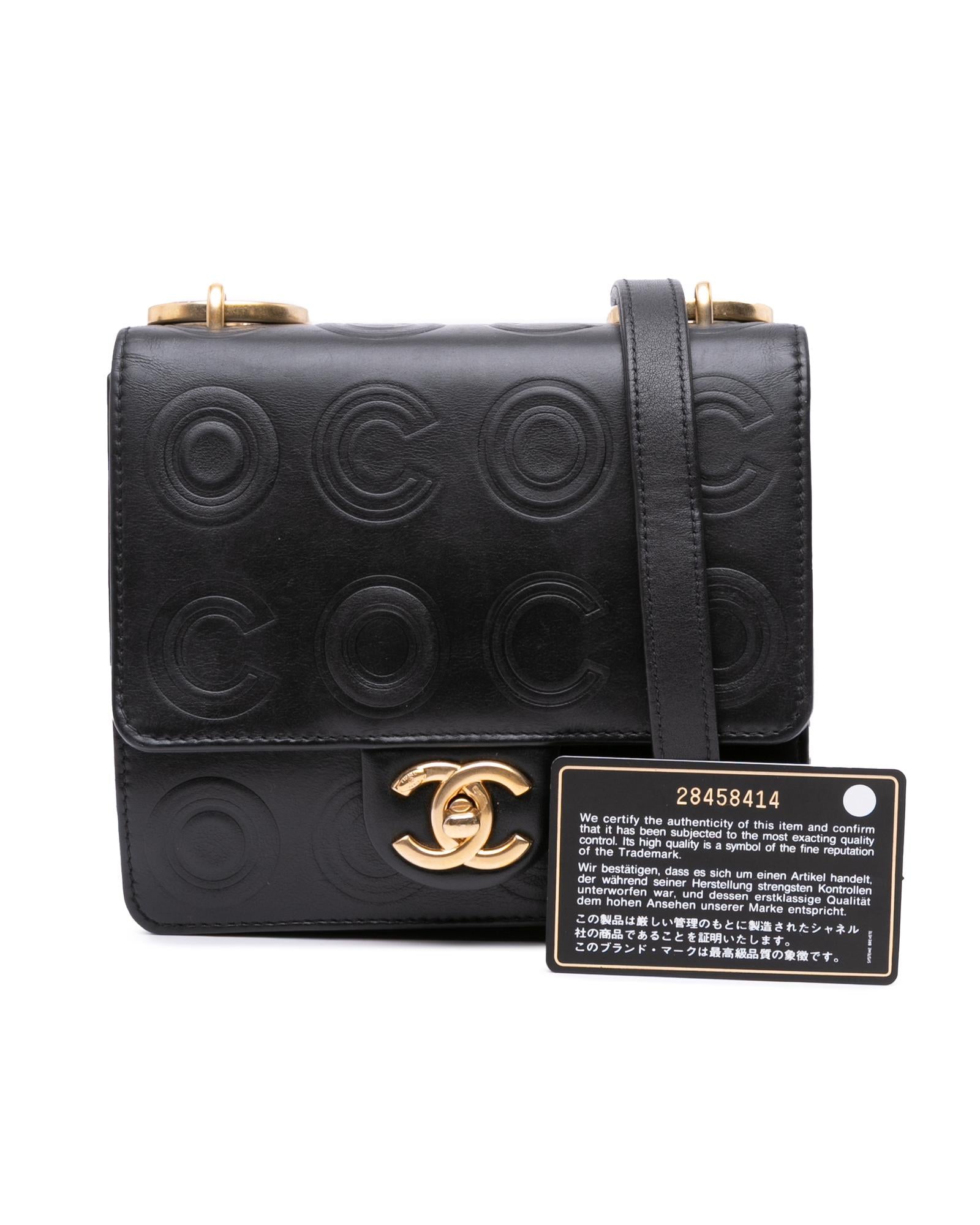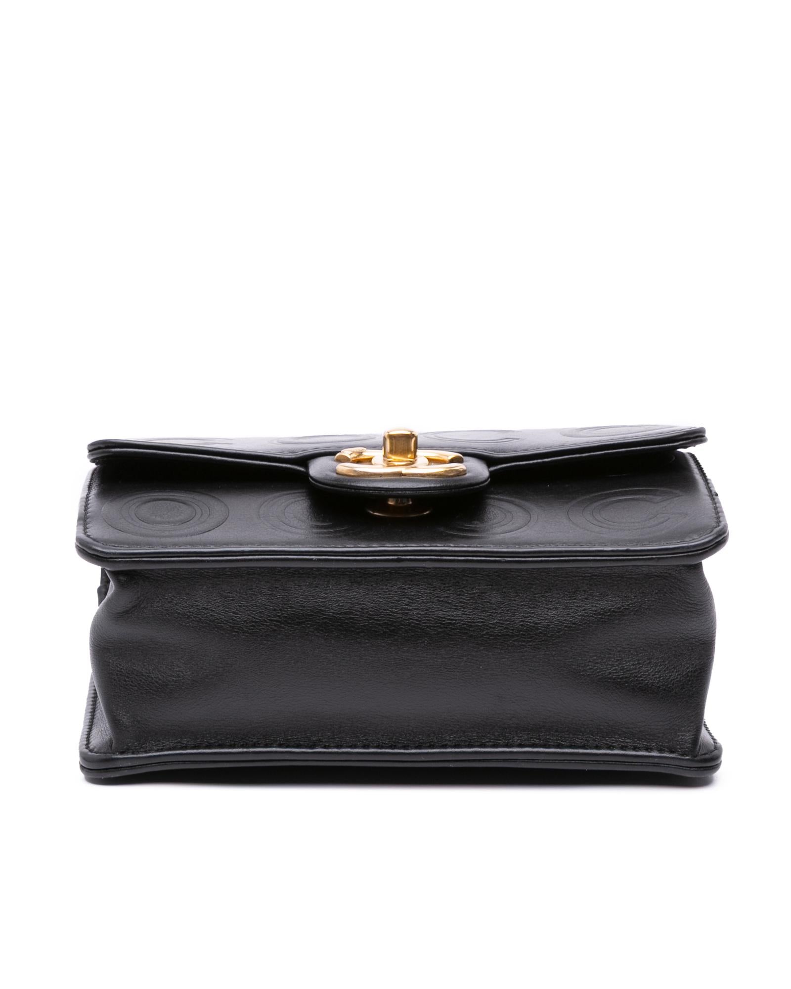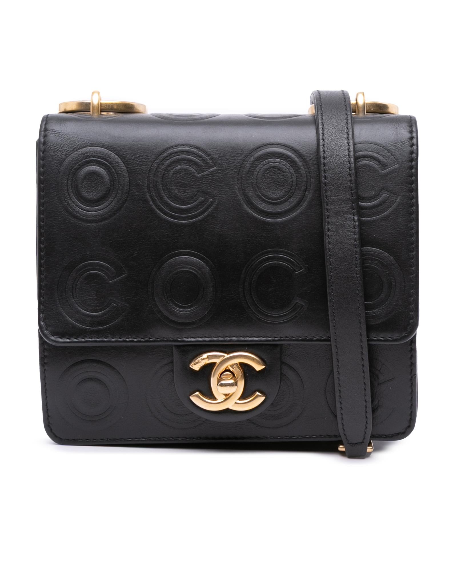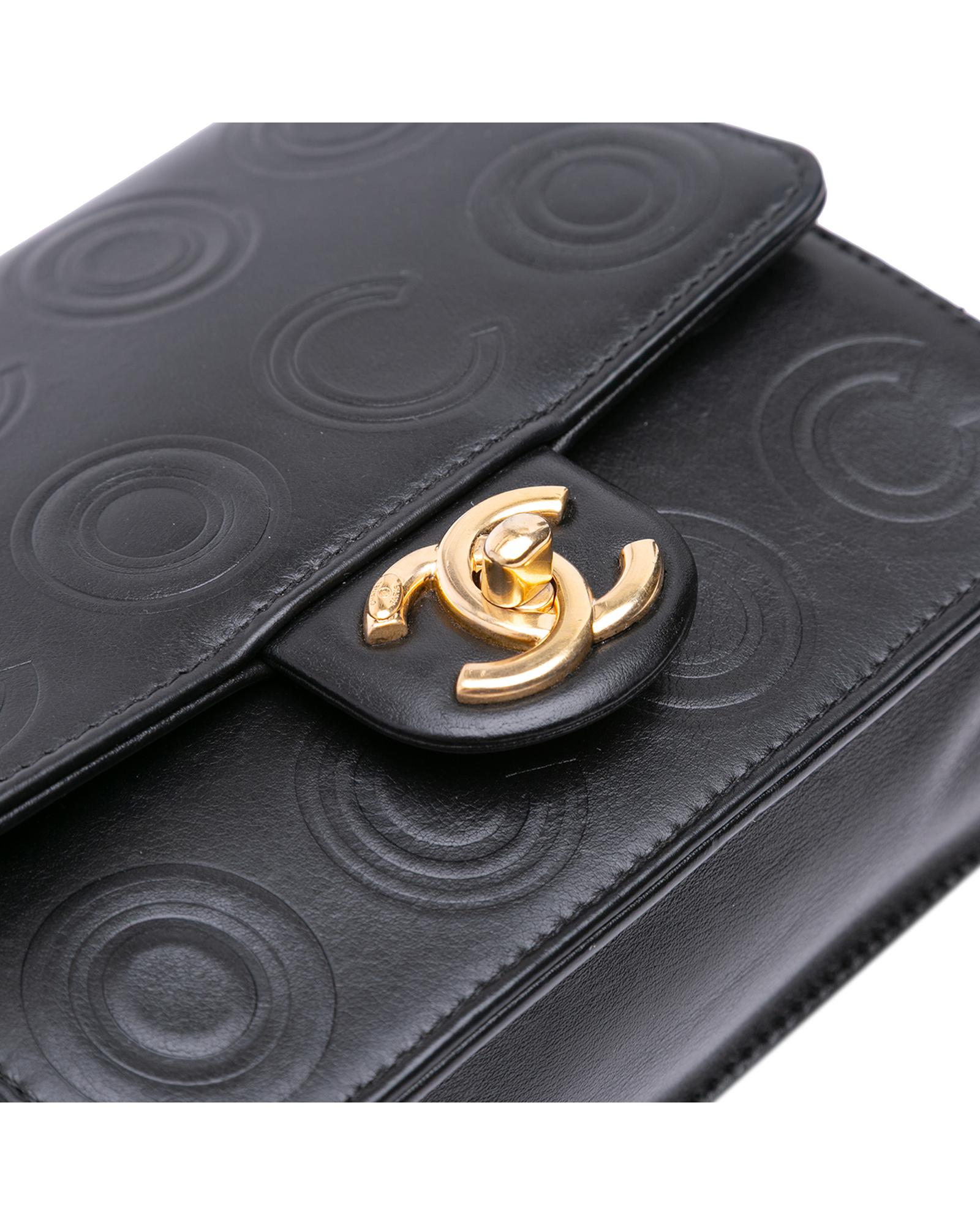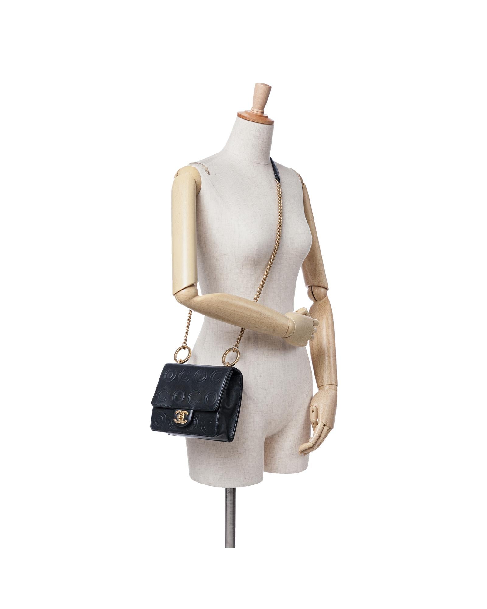 This crossbody bag features an embossed leather body a chain link shoulder strap with leather guard a front flap with interlocking Cs and a twist lock closure an exterior back slip pocket and an interior slip pocket.