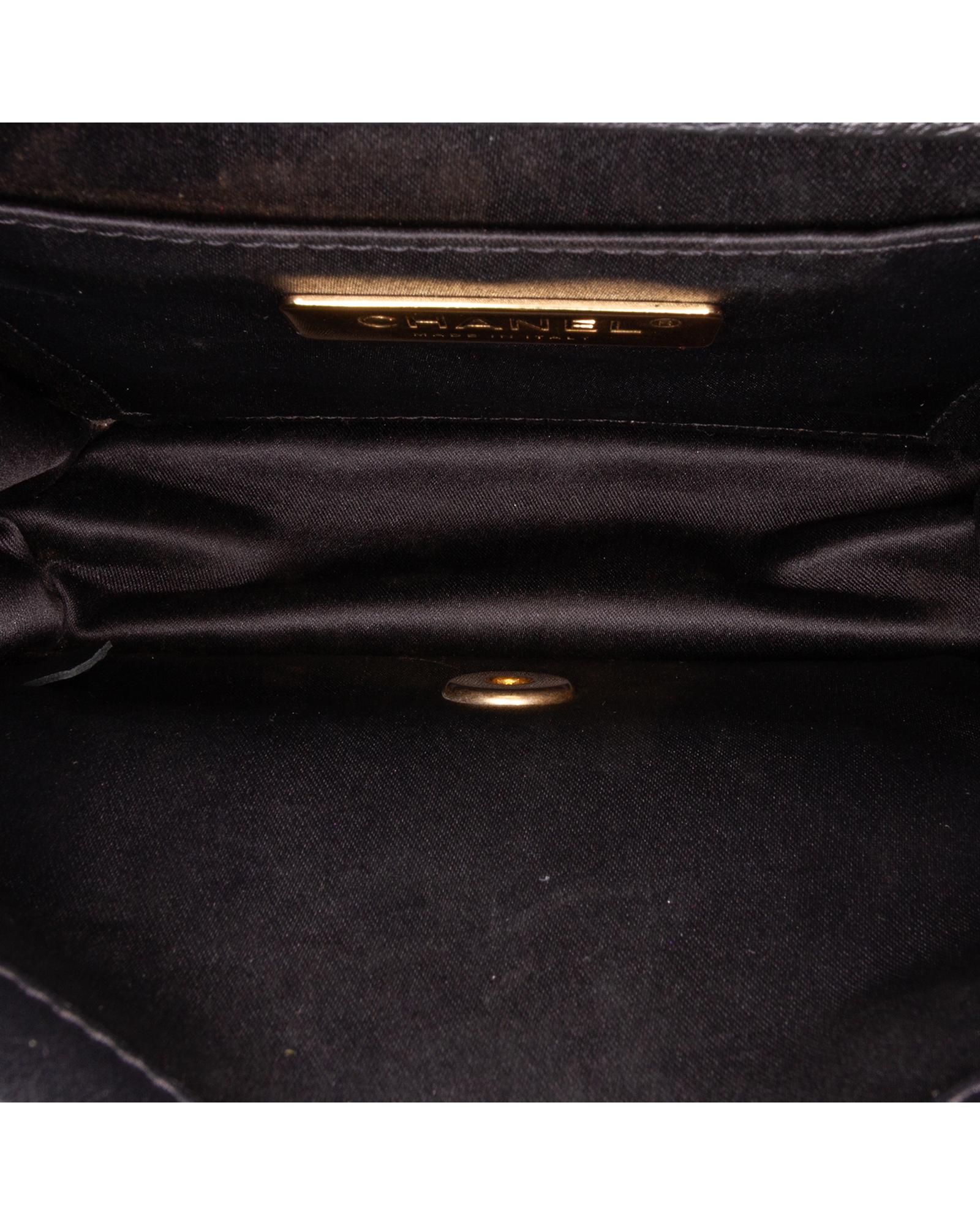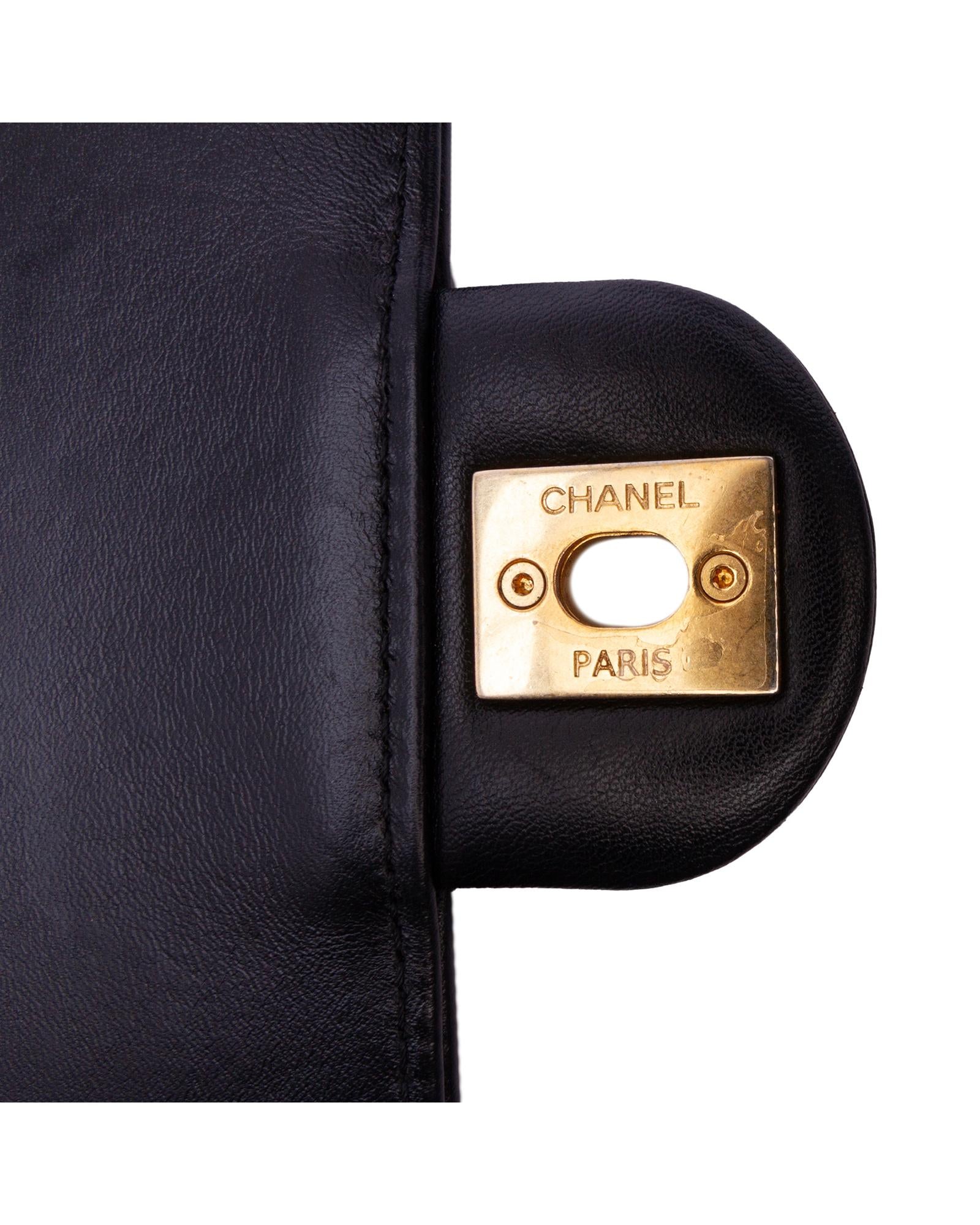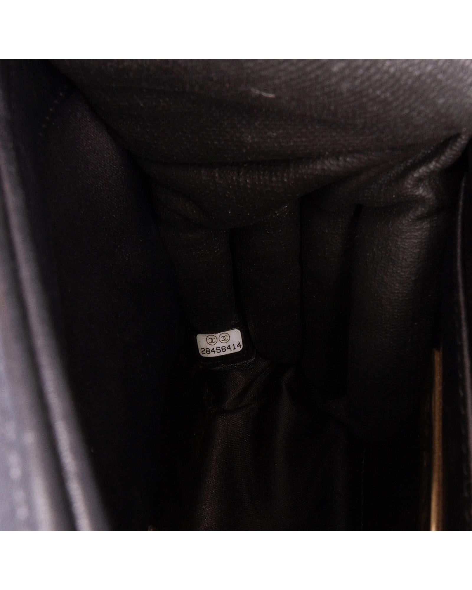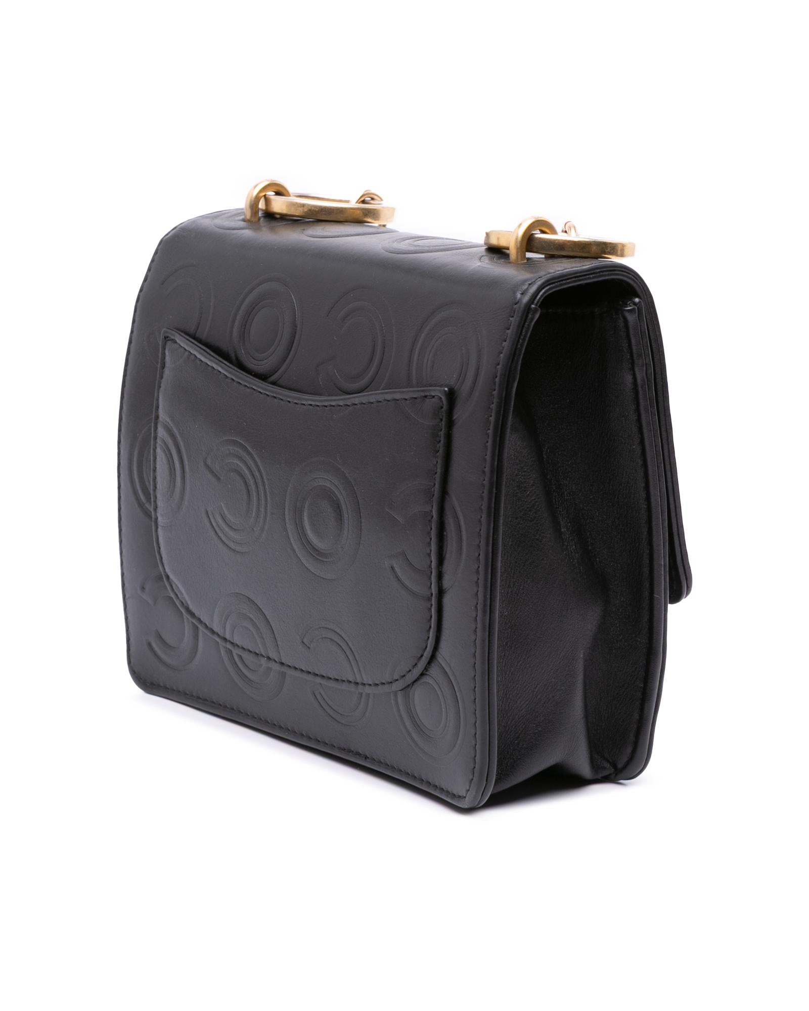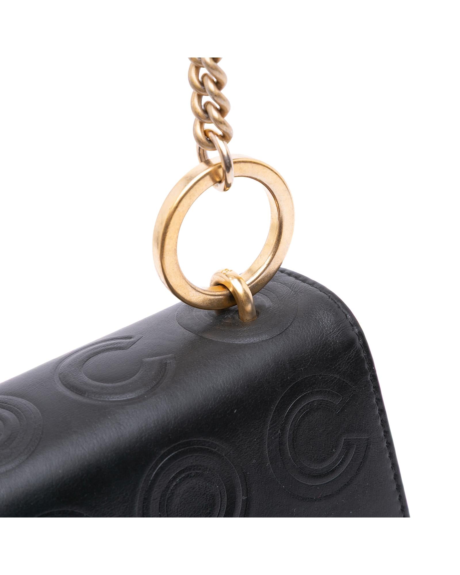 This crossbody bag features an embossed leather body a chain link shoulder strap with leather guard a front flap with interlocking Cs and a twist lock closure an exterior back slip pocket and an interior slip pocket.