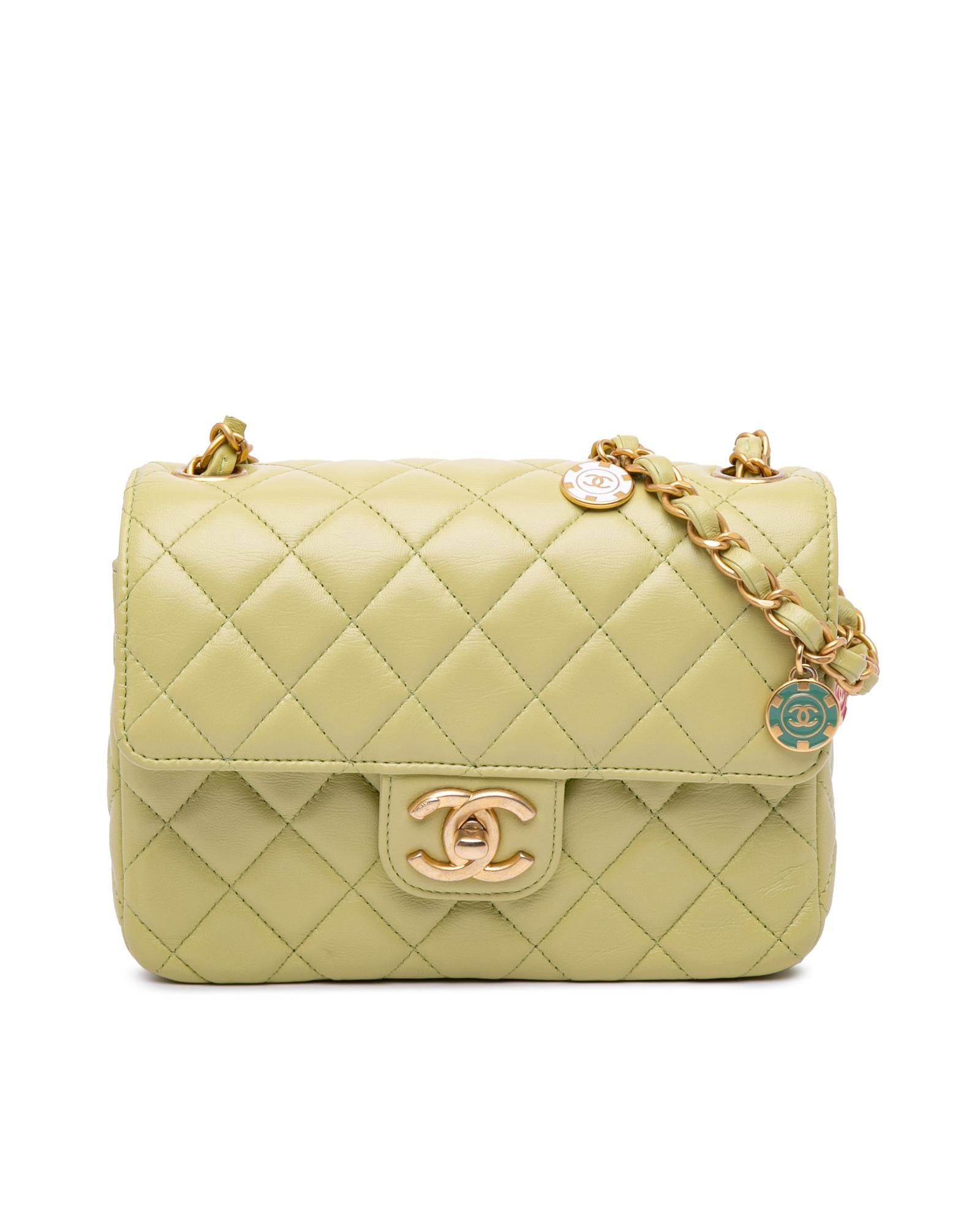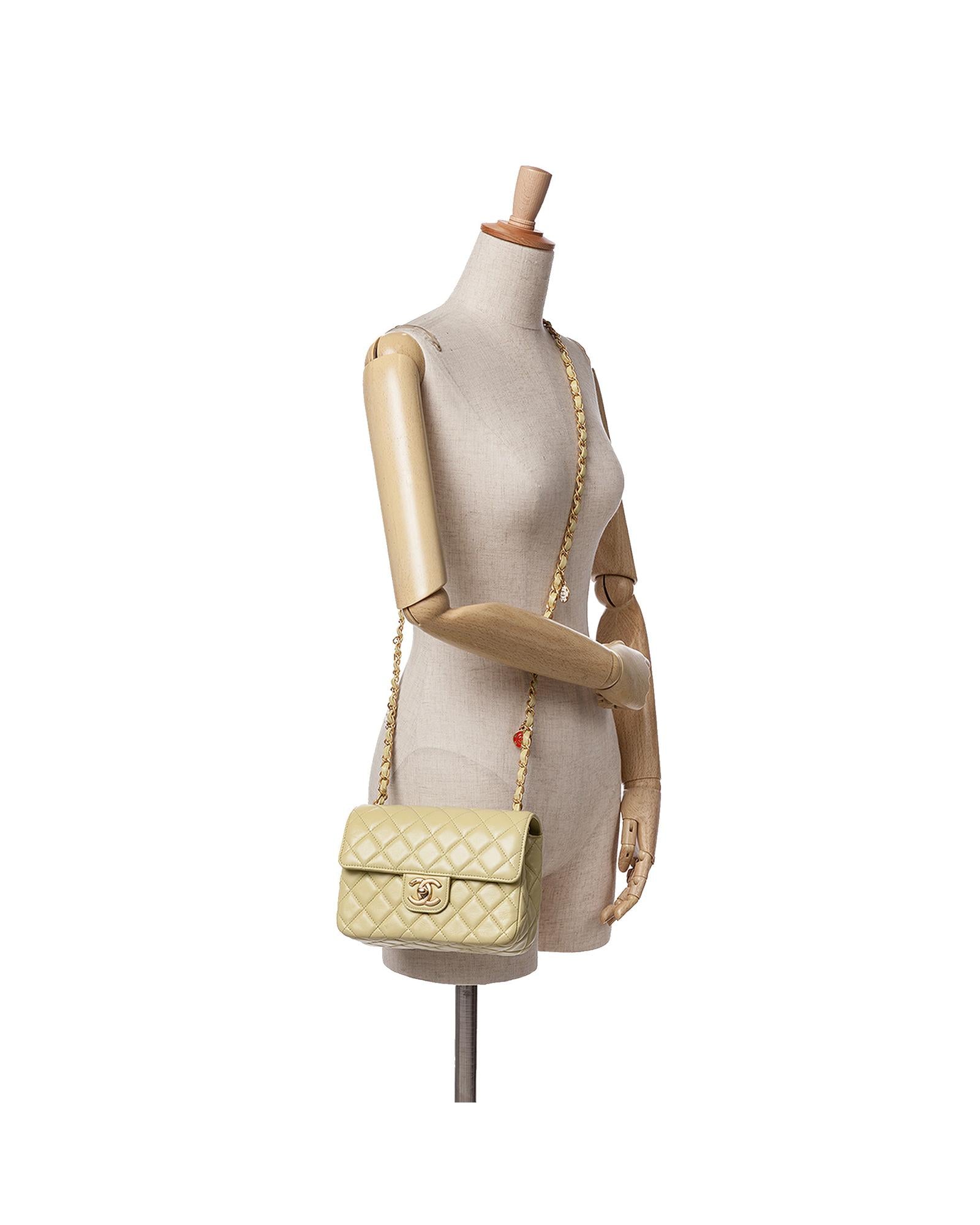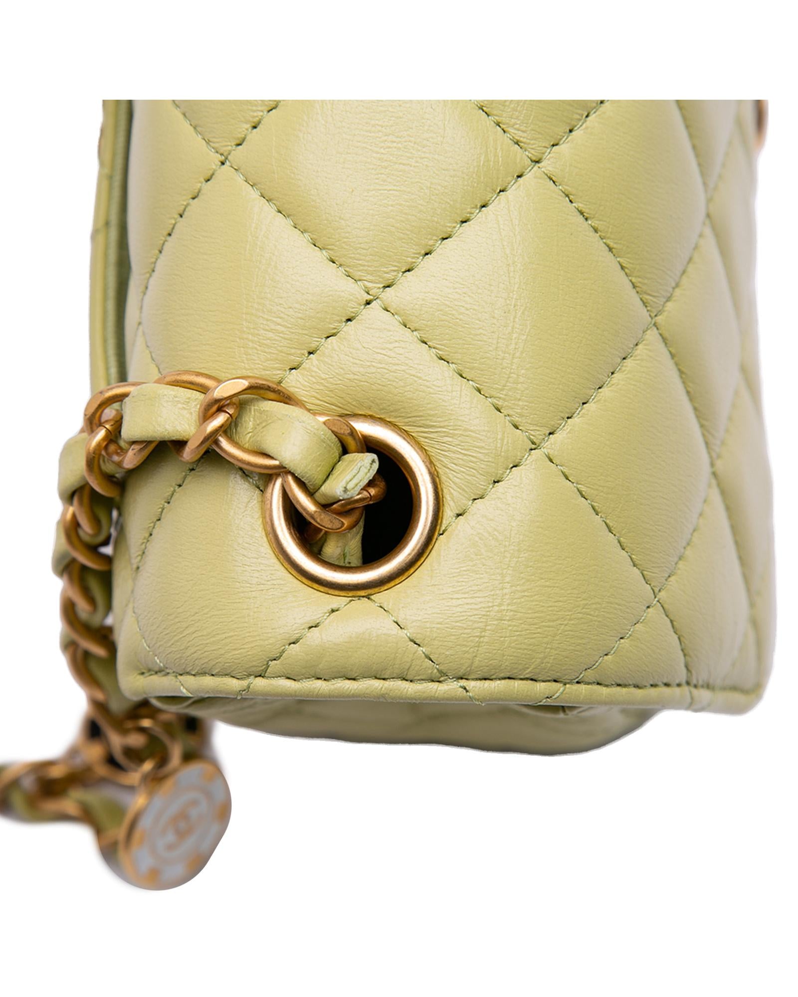 This crossbody bag features a quilted lambskin leather body a leather woven chain shoulder strap with charms a front flap with turn lock closure an exterior back slip pocket and interior zip and slip pockets.