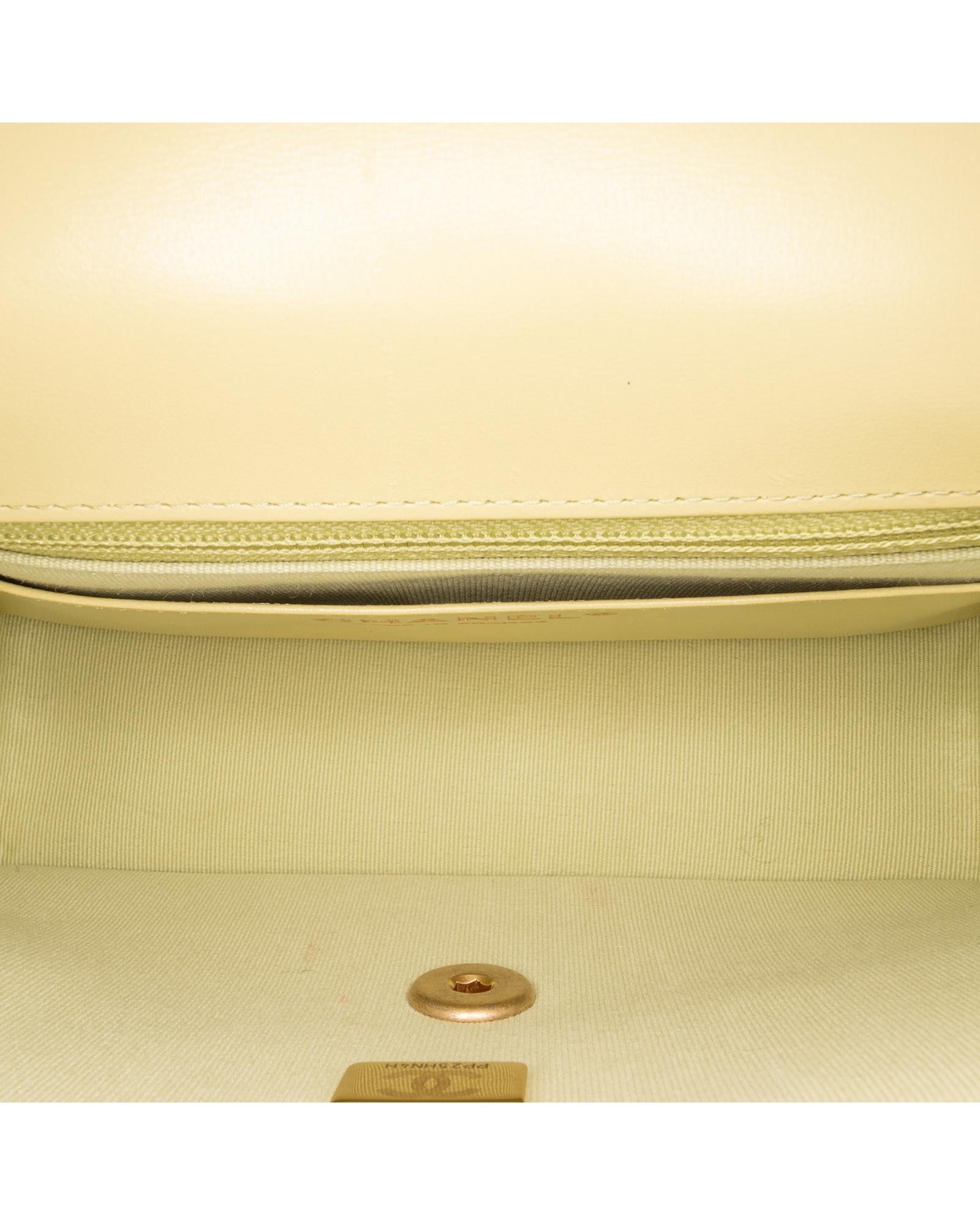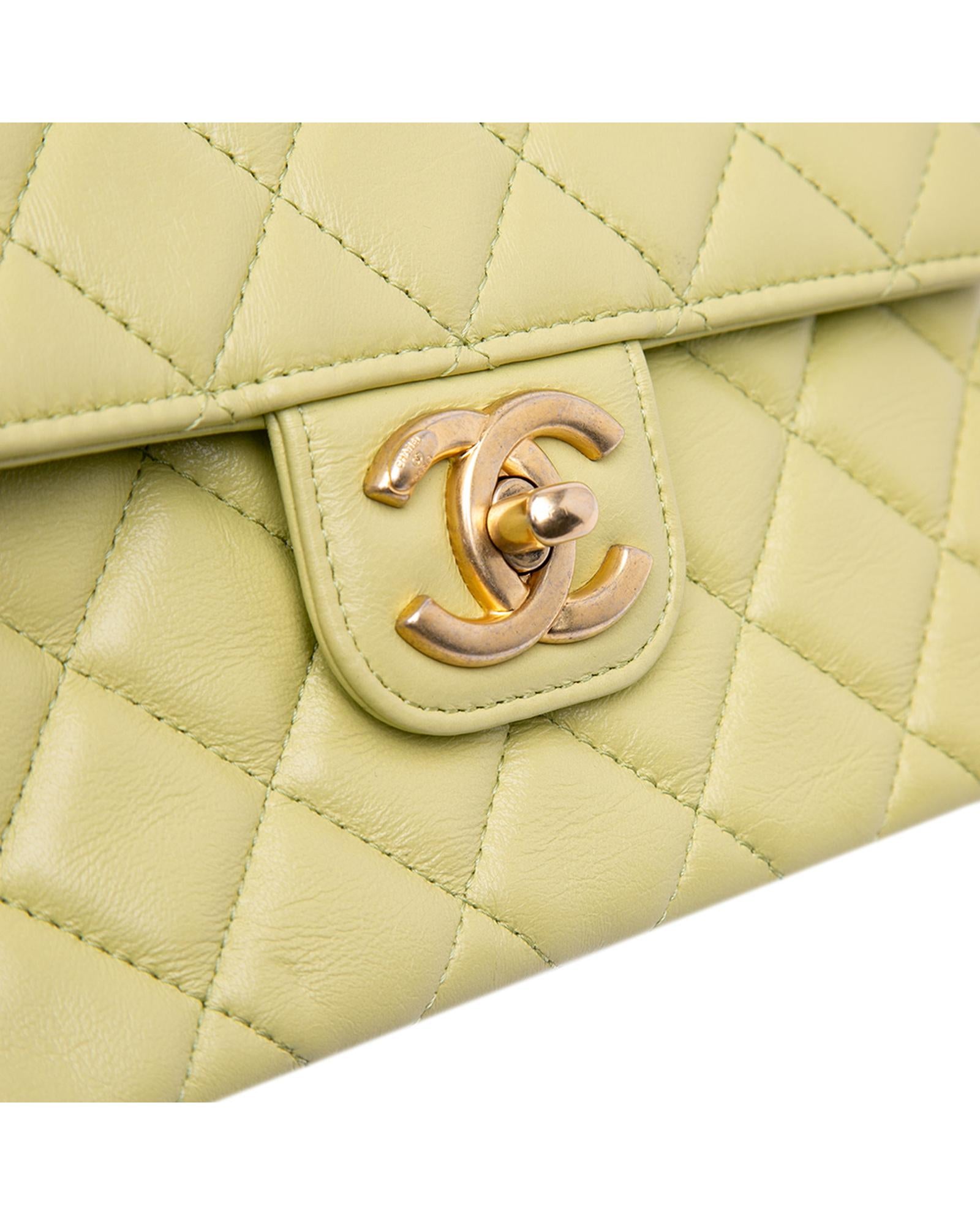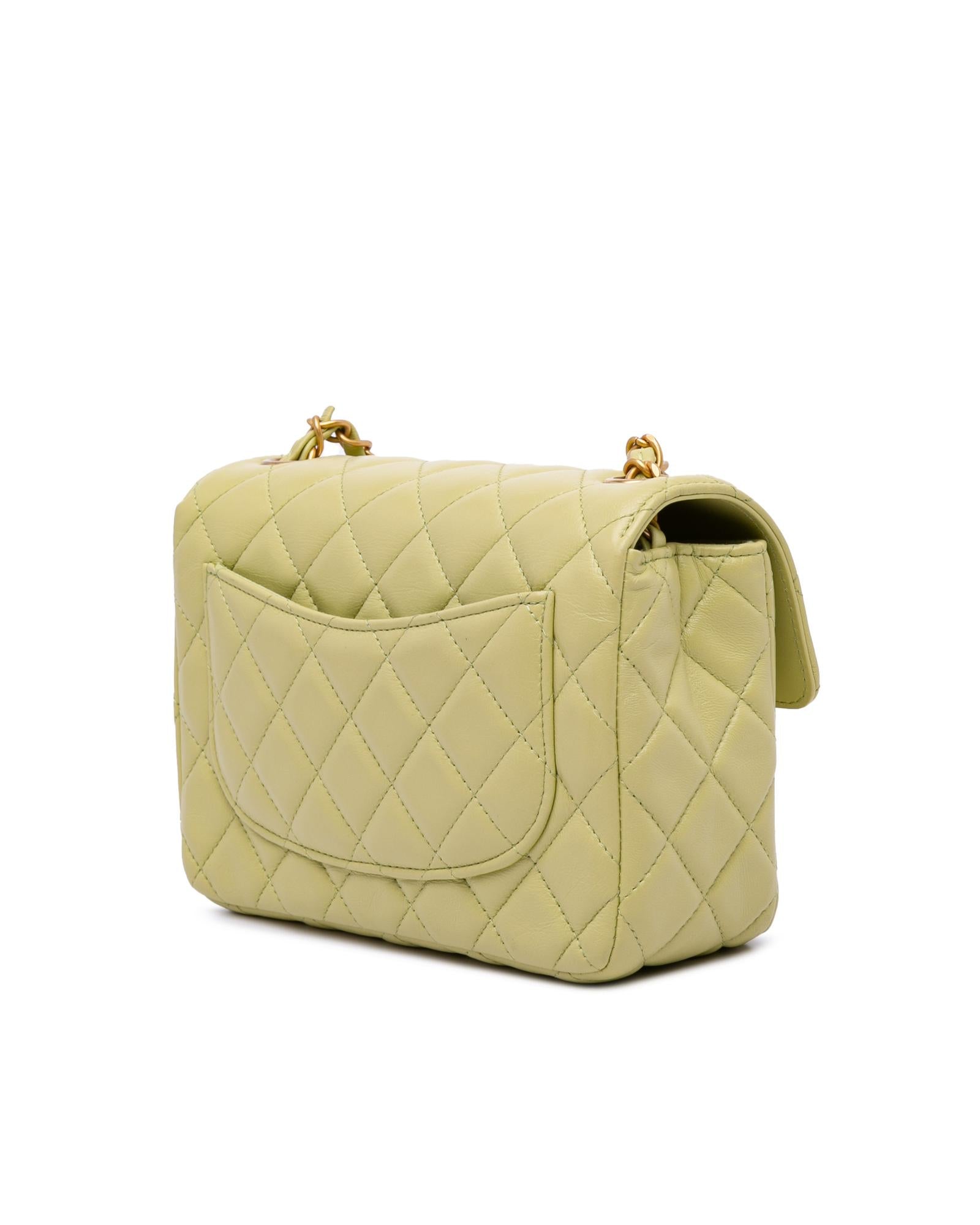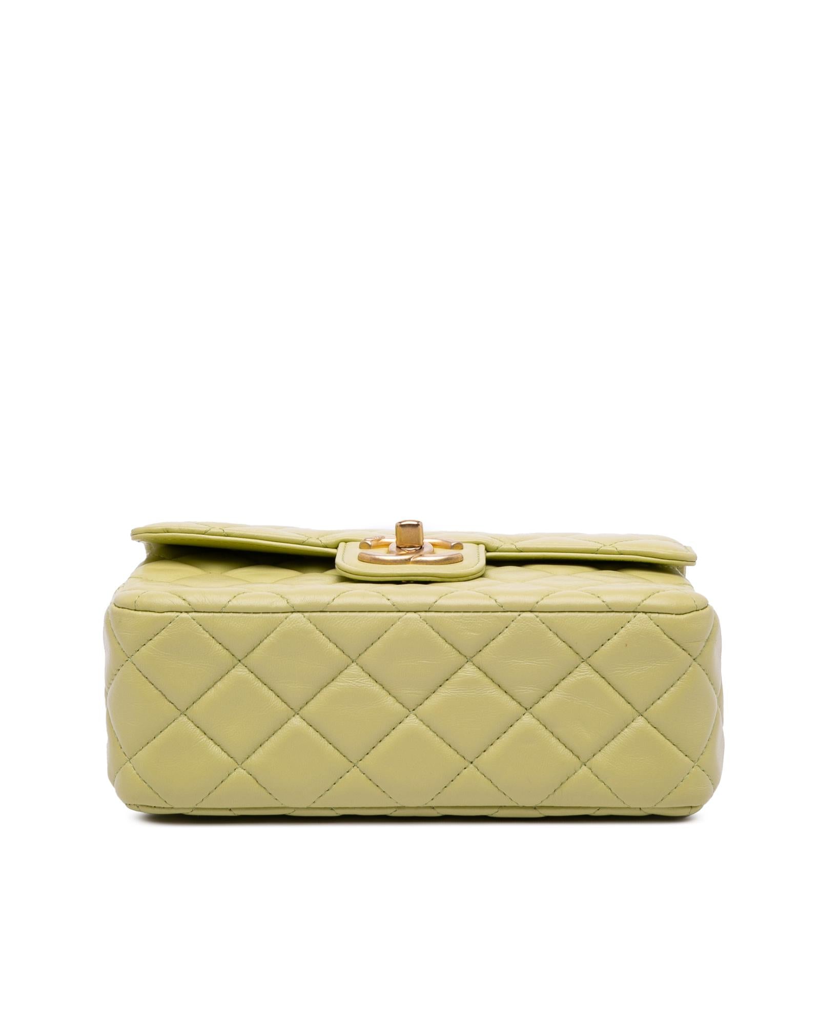 This crossbody bag features a quilted lambskin leather body a leather woven chain shoulder strap with charms a front flap with turn lock closure an exterior back slip pocket and interior zip and slip pockets.