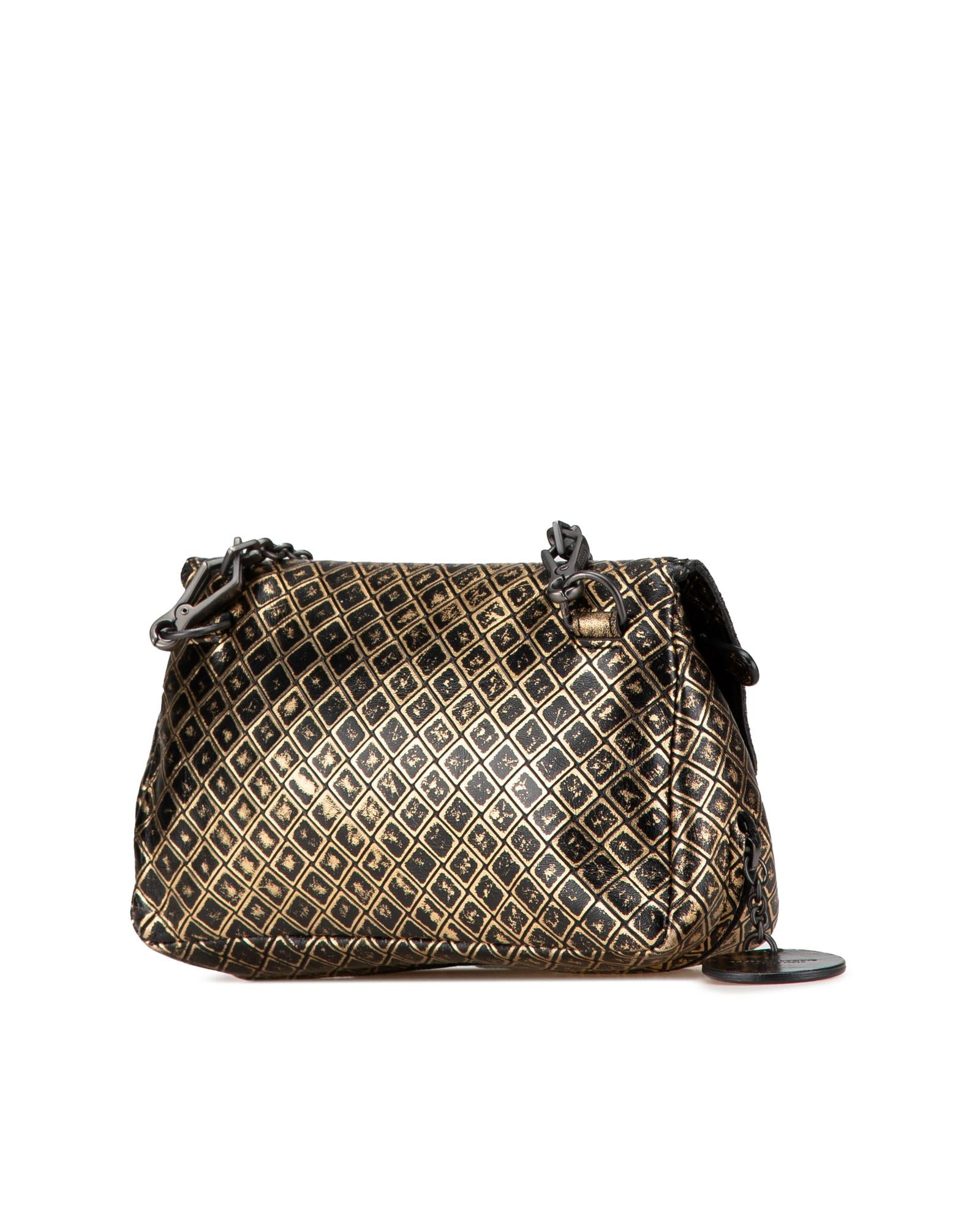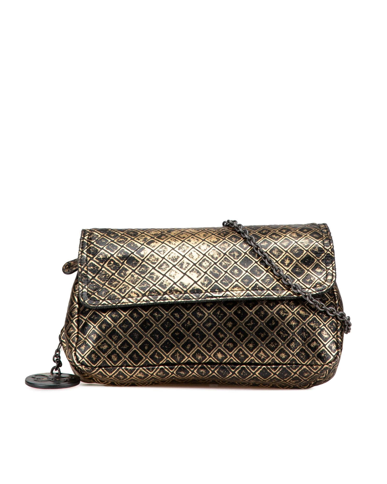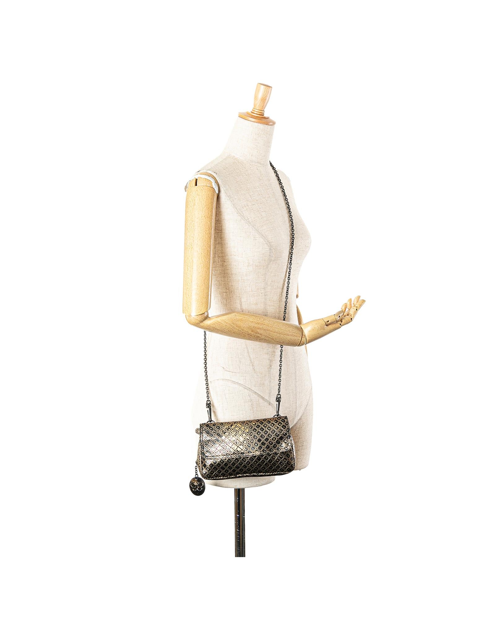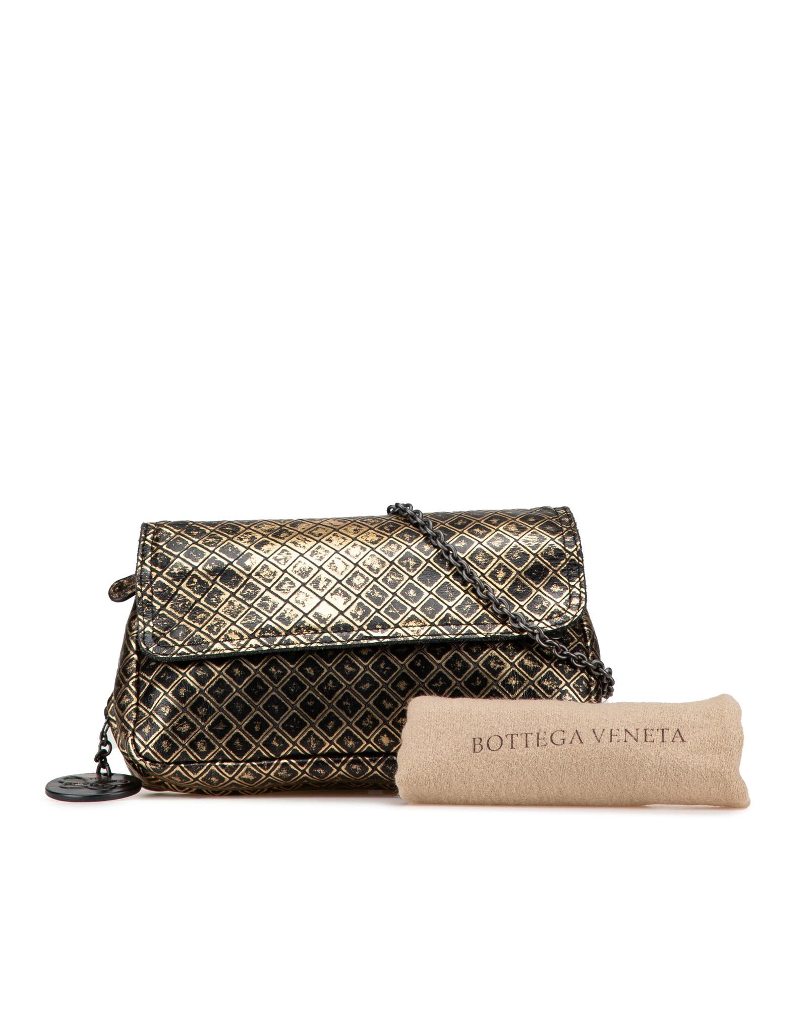 This crossbody bag features an intrecciomirage leather body a detachable metal chain strap a top flap with magnetic snap closure and an interior zip compartment.Brand: Bottega Veneta