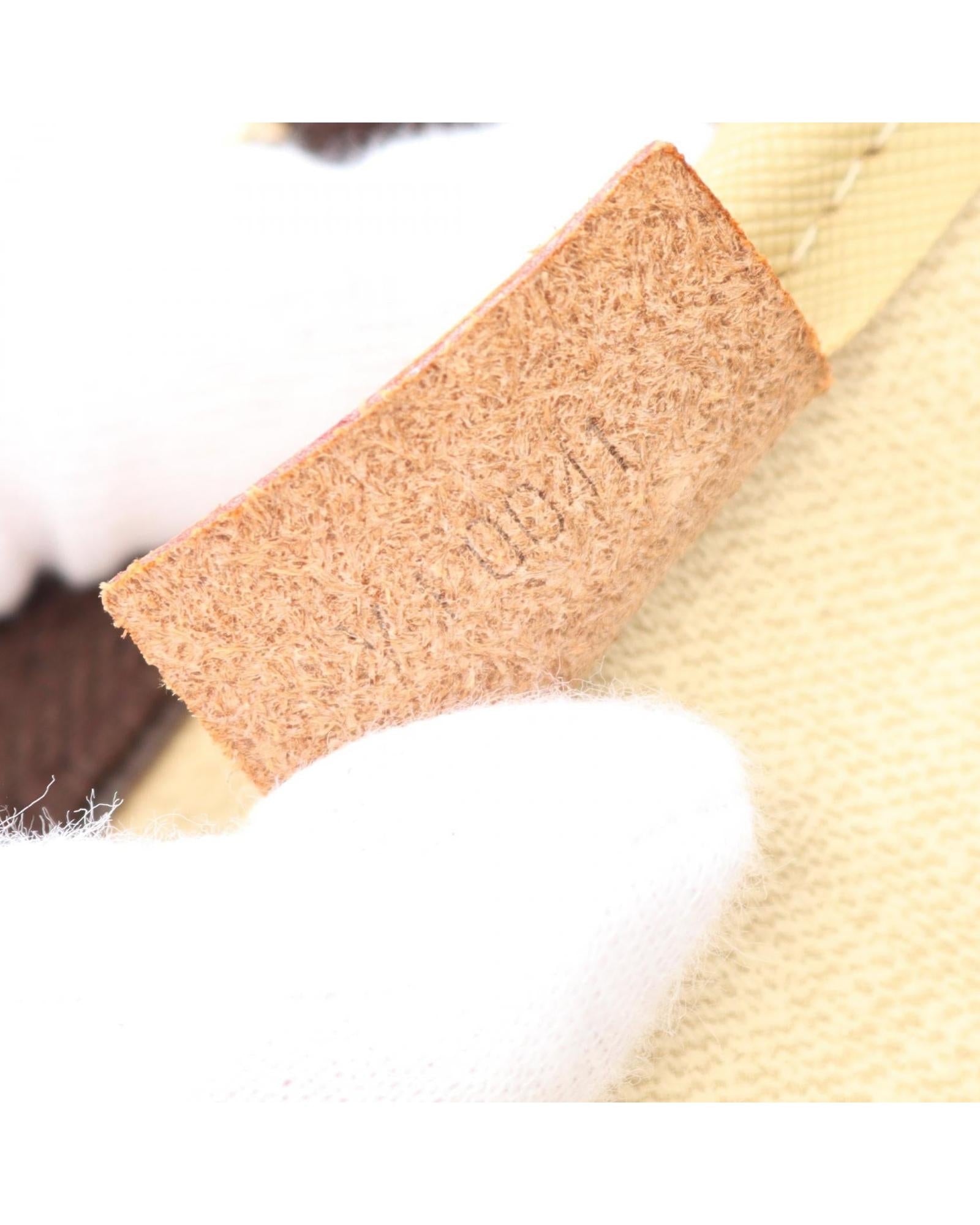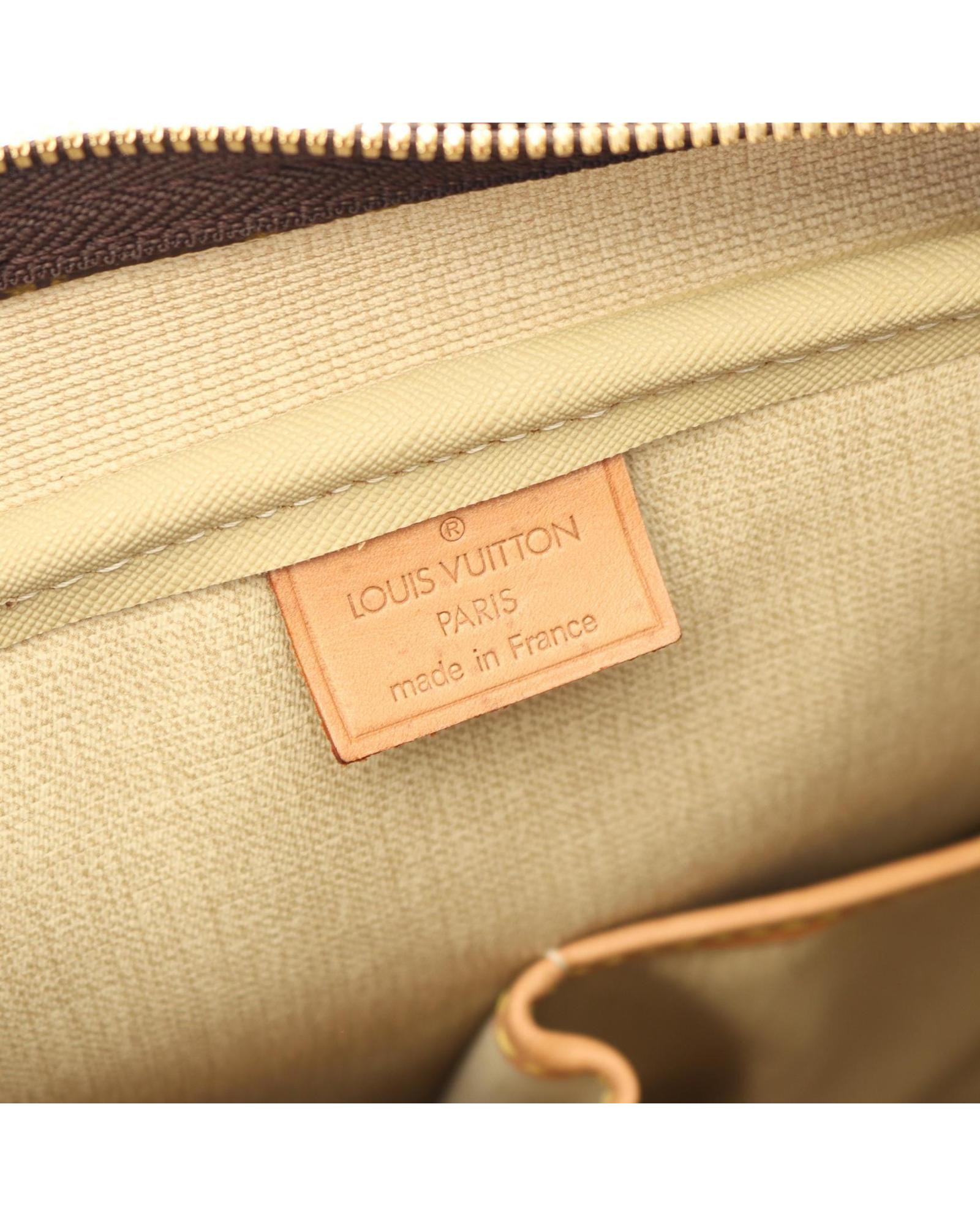 • Exterior: Monogram canvas leather trim double handles luggage tag