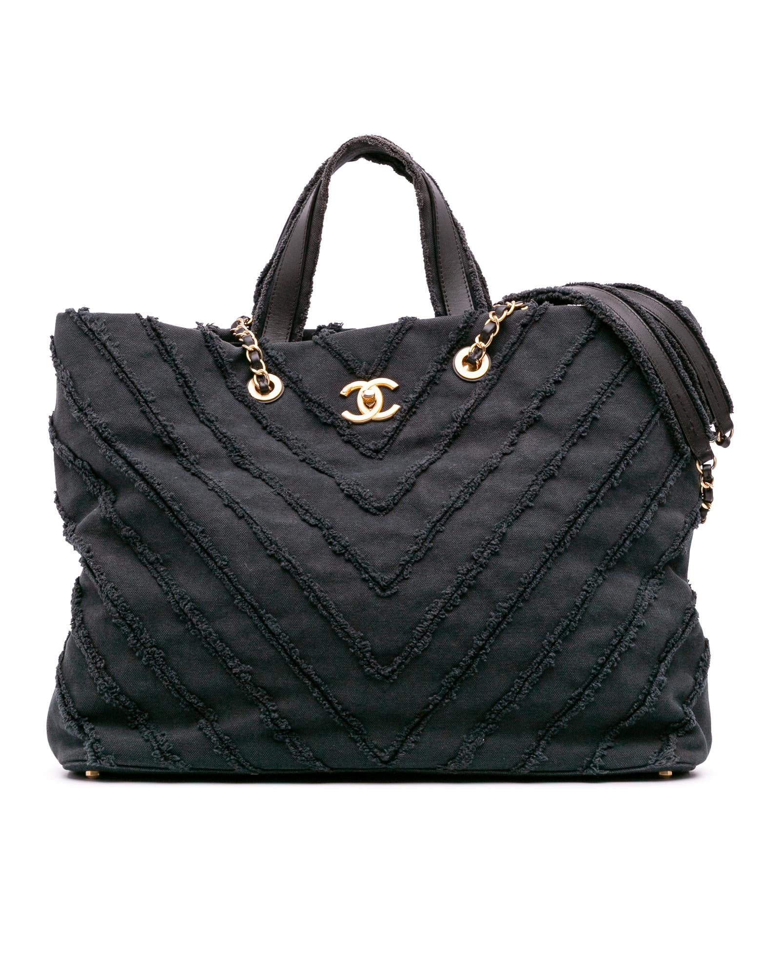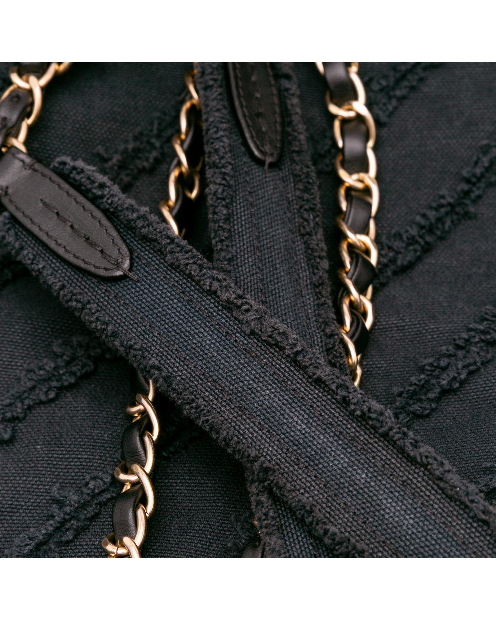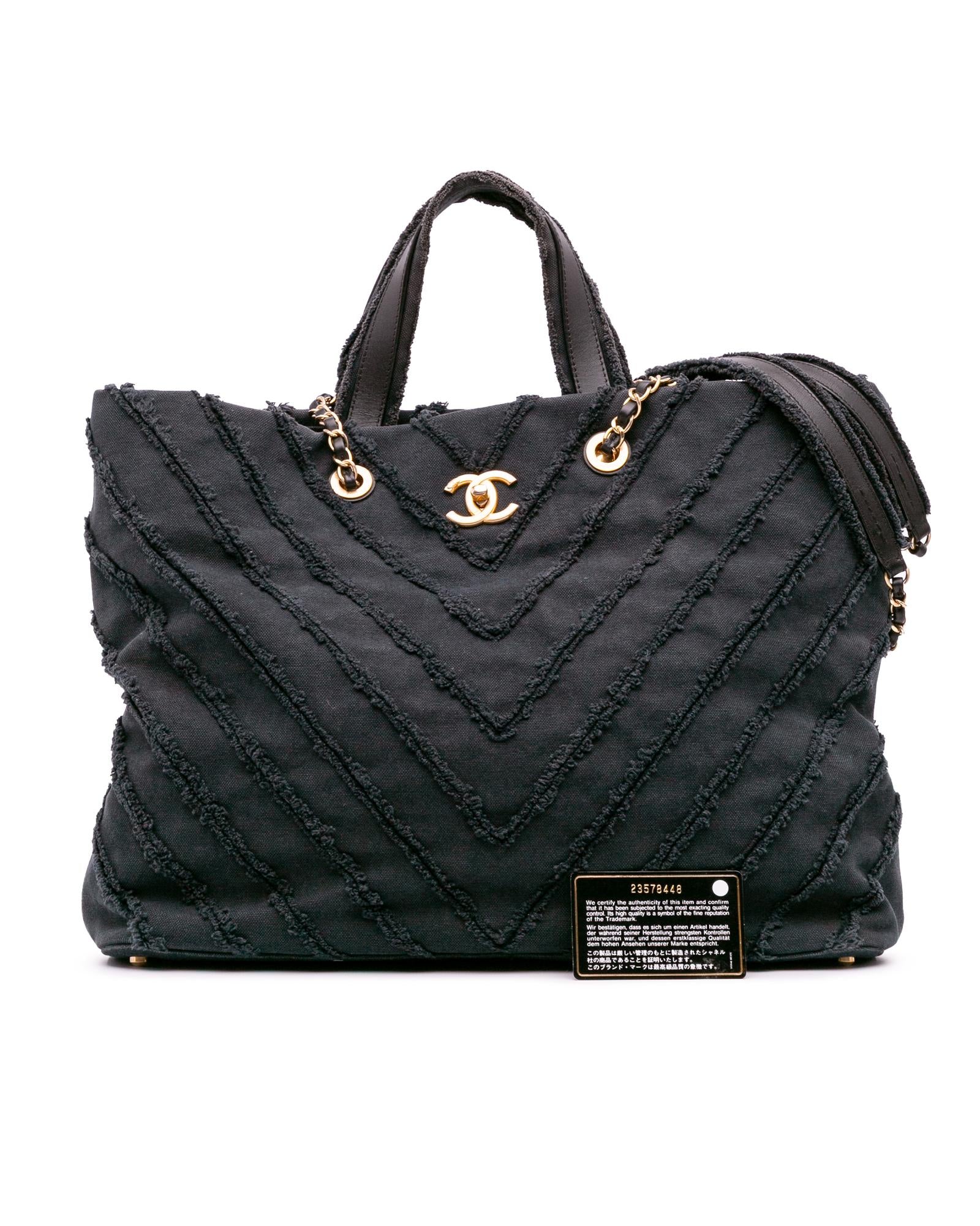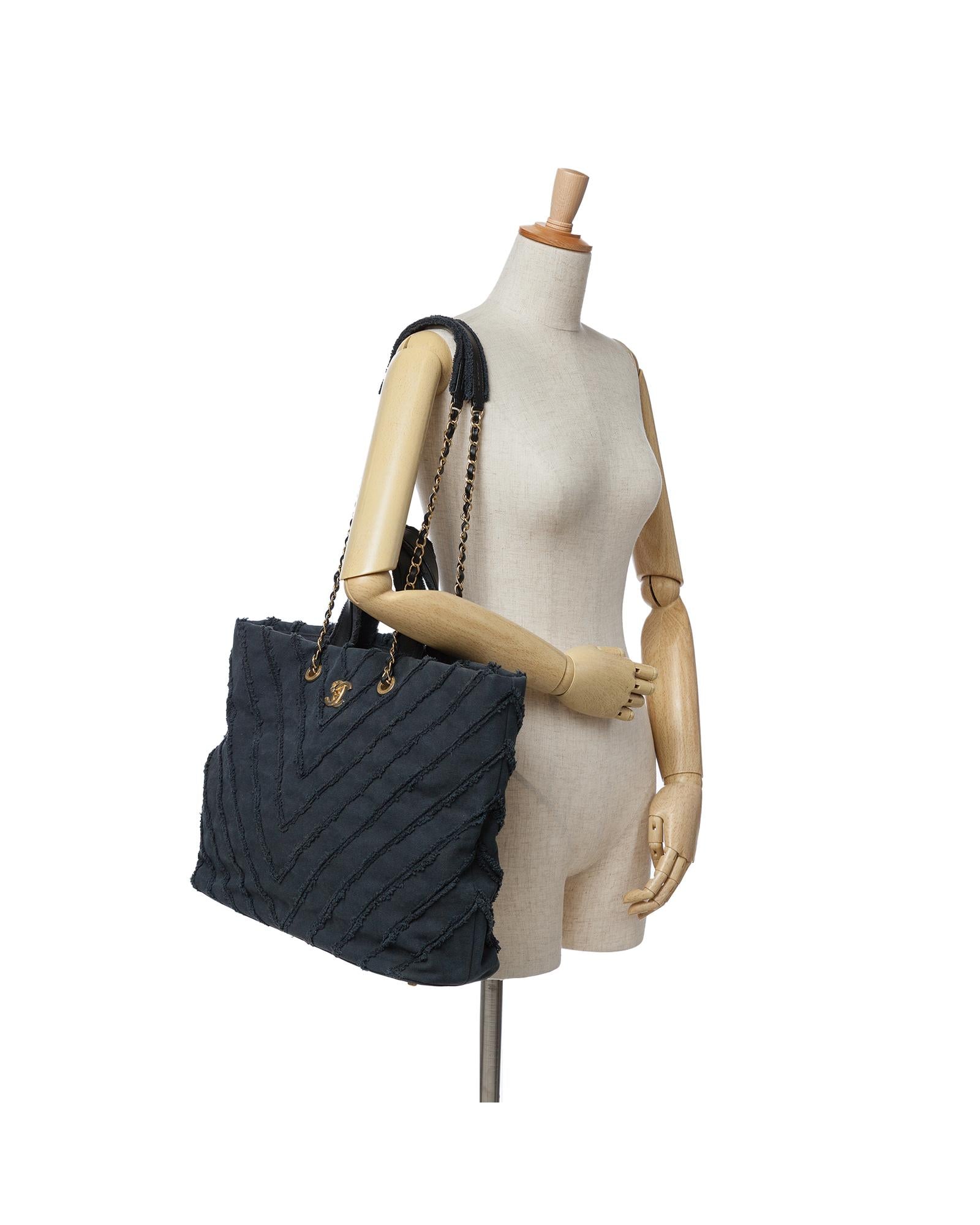 This satchel features a canvas body flat handles leather woven chain straps with leather guard an open top with twist lock closure and interior zip and slip pockets.Brand: Chanel