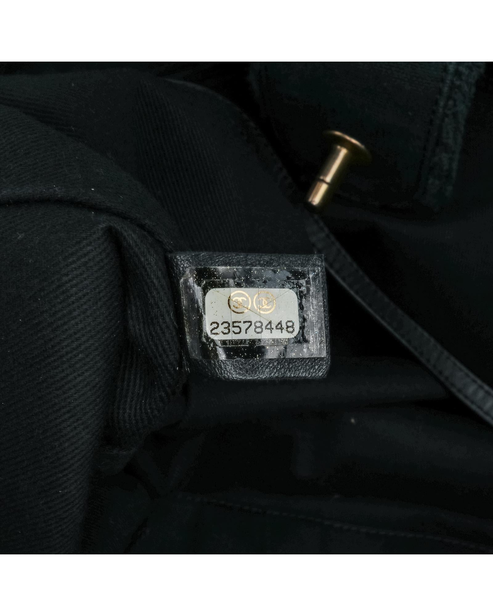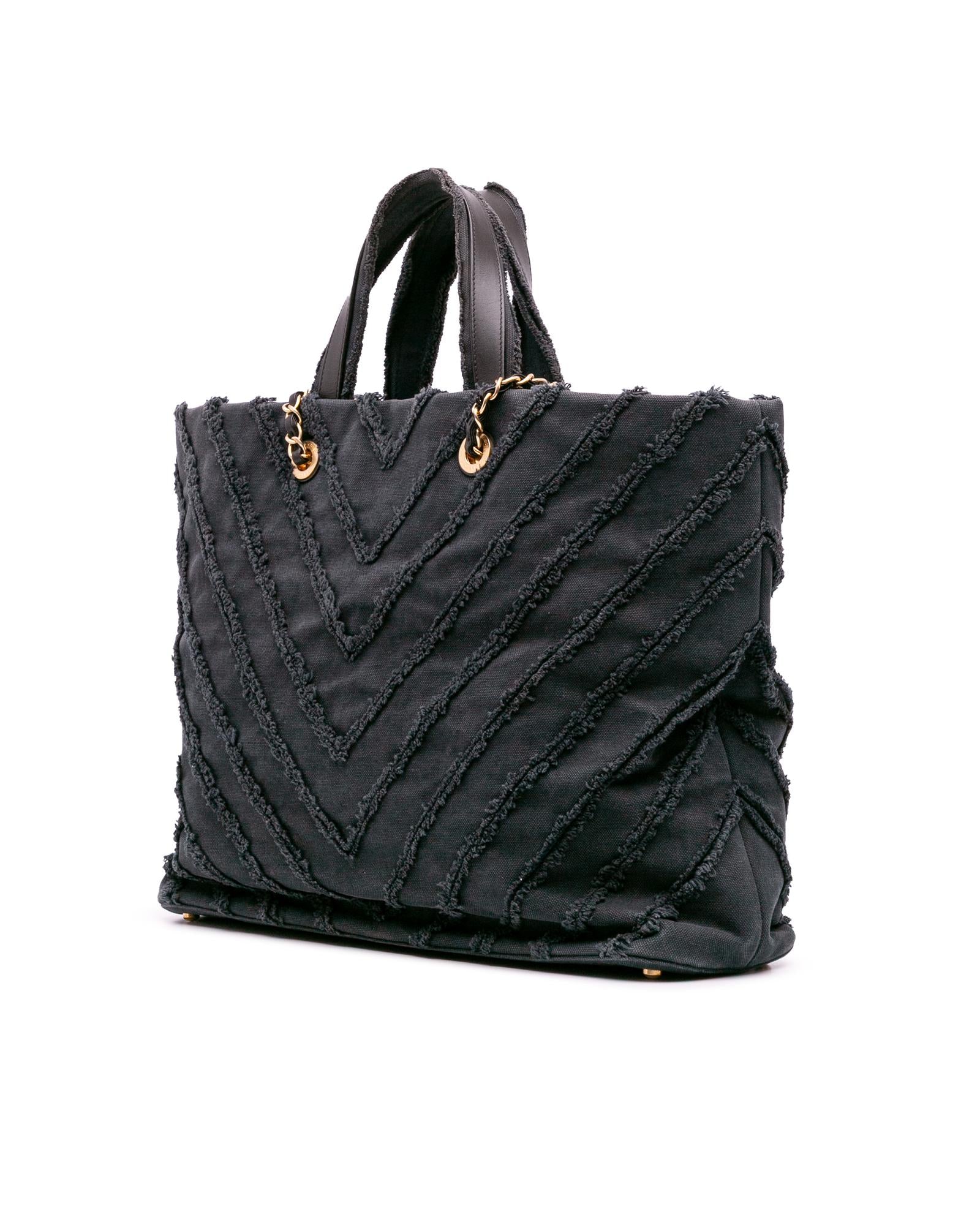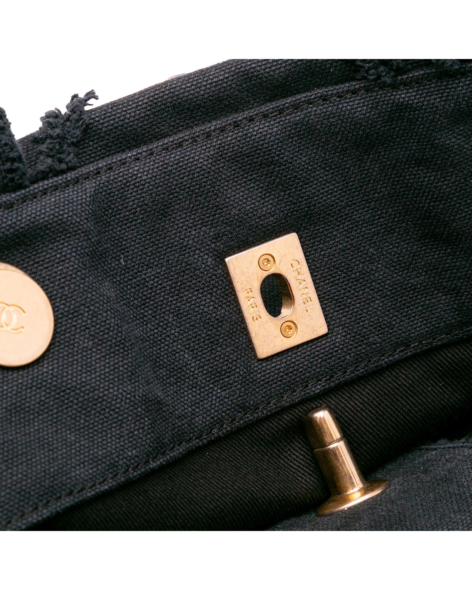 This satchel features a canvas body flat handles leather woven chain straps with leather guard an open top with twist lock closure and interior zip and slip pockets.Brand: Chanel