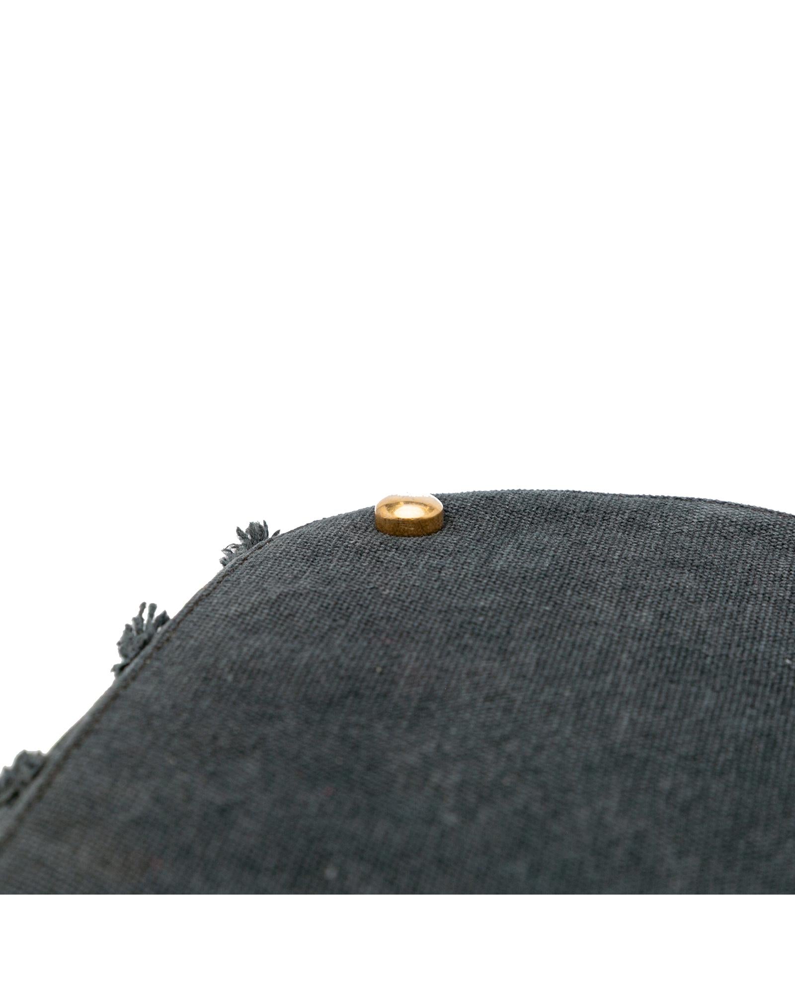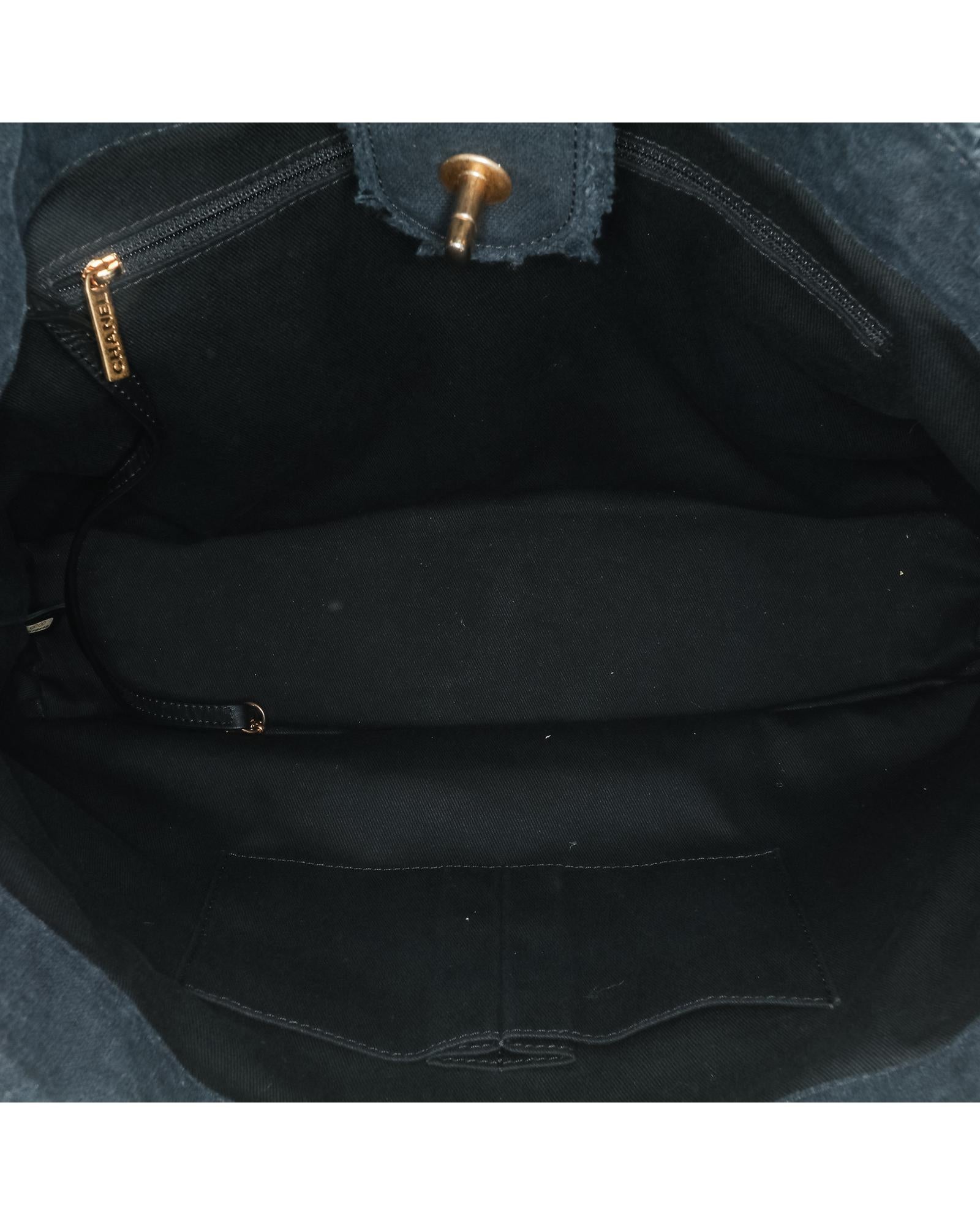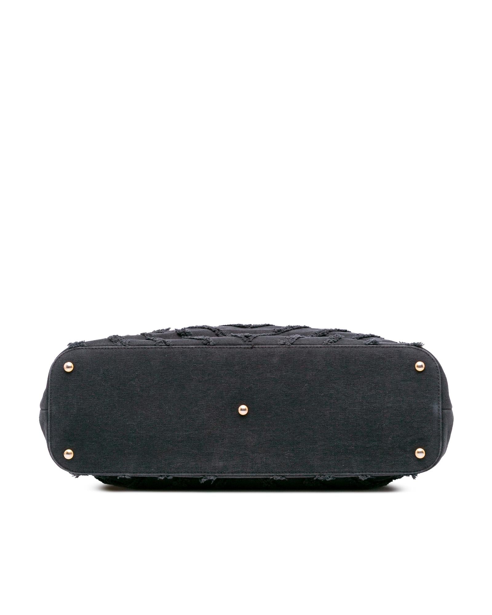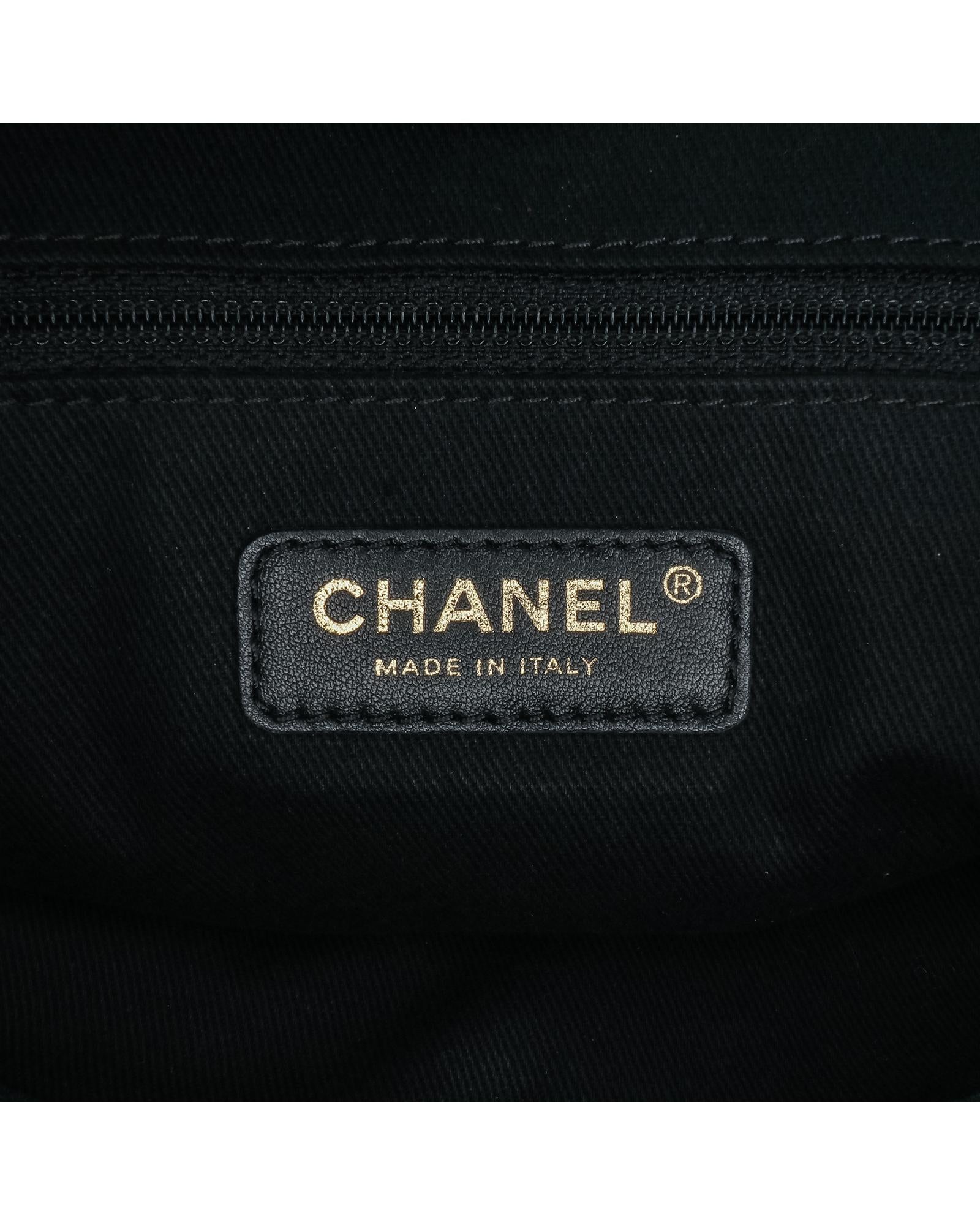 This satchel features a canvas body flat handles leather woven chain straps with leather guard an open top with twist lock closure and interior zip and slip pockets.Brand: Chanel