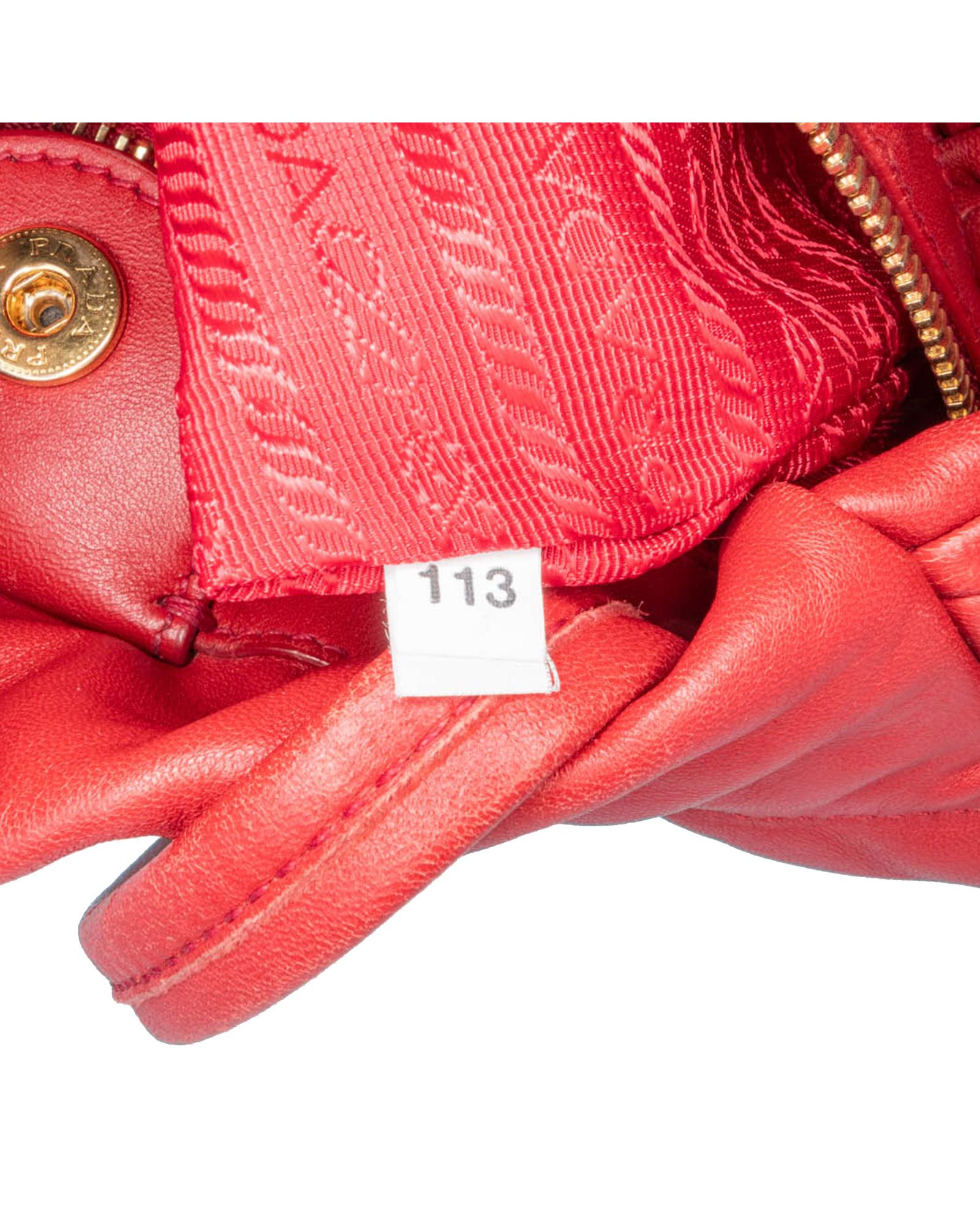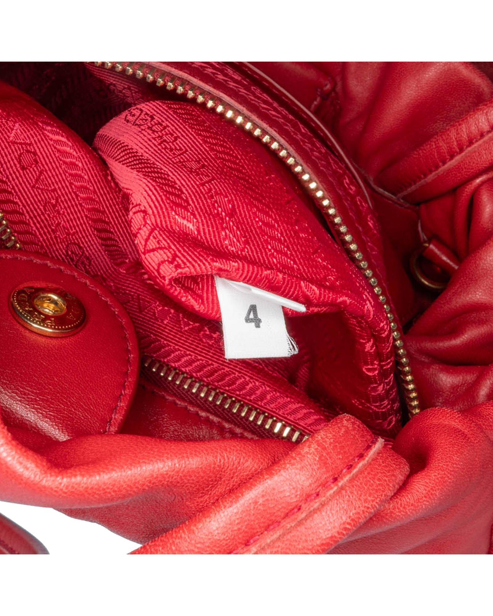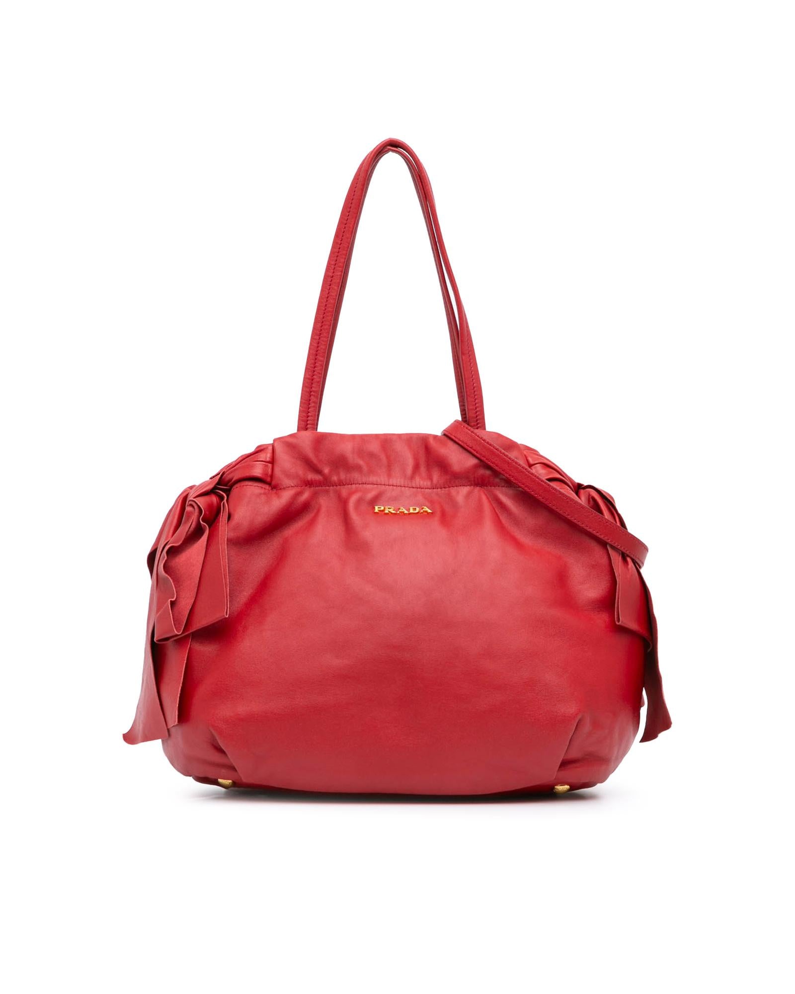 This satchel features a leather body with side ribbon details flat leather handles a detachable flat strap an open top with a snap button closure and interior zip and slip pockets.Brand: Prada