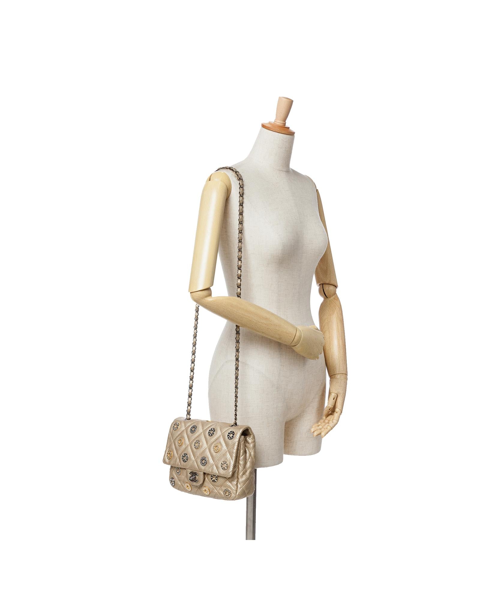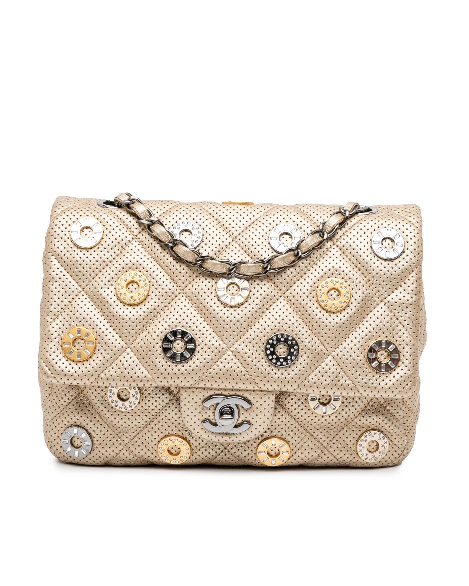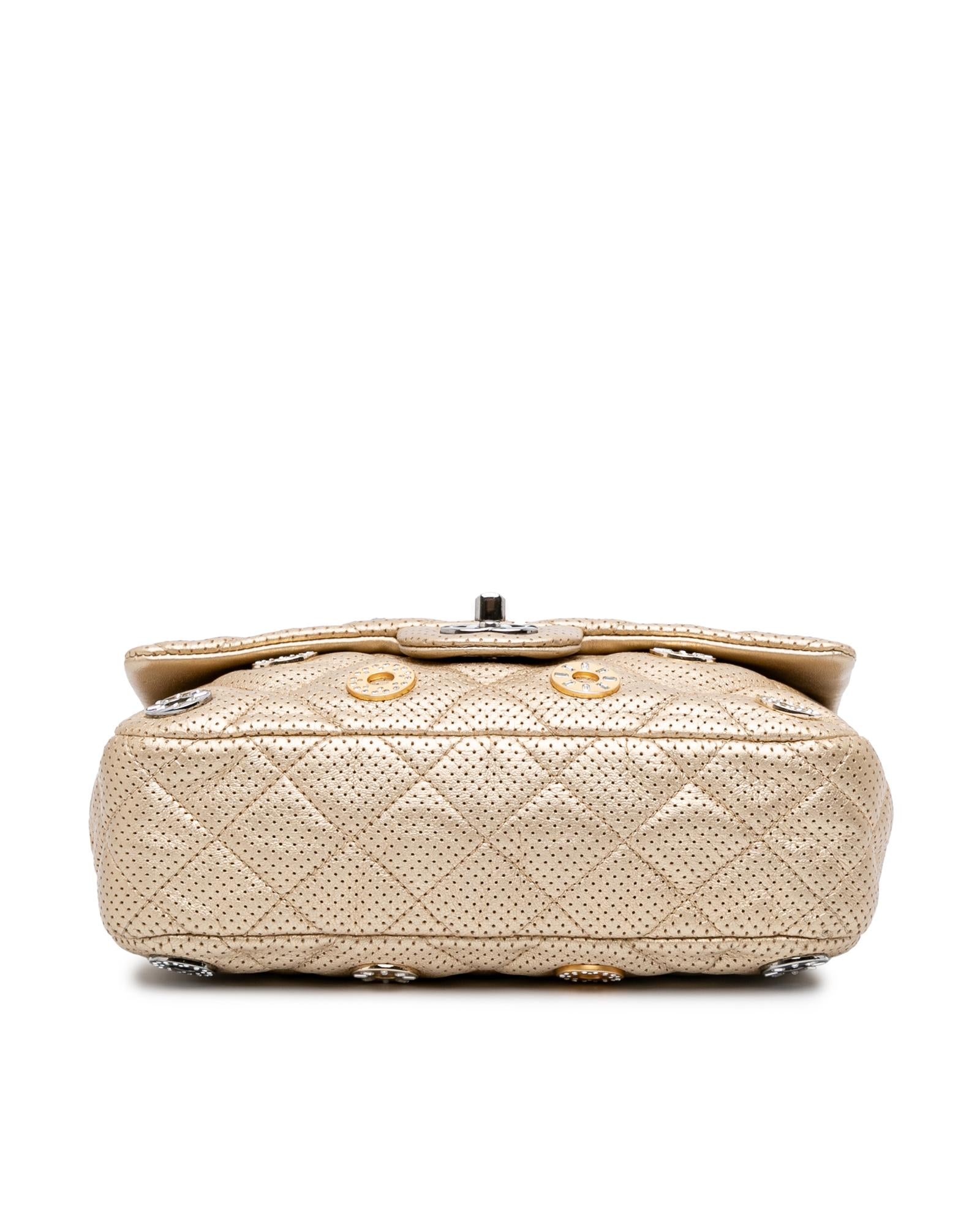 This shoulder bag features a perforated metallic lambskin leather body with eyelet embellishments leather woven chain link straps a front flap with CC turn lock closure and interior zip and slip pockets.Brand: Chanel