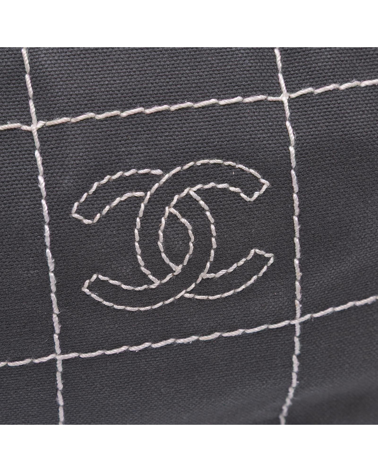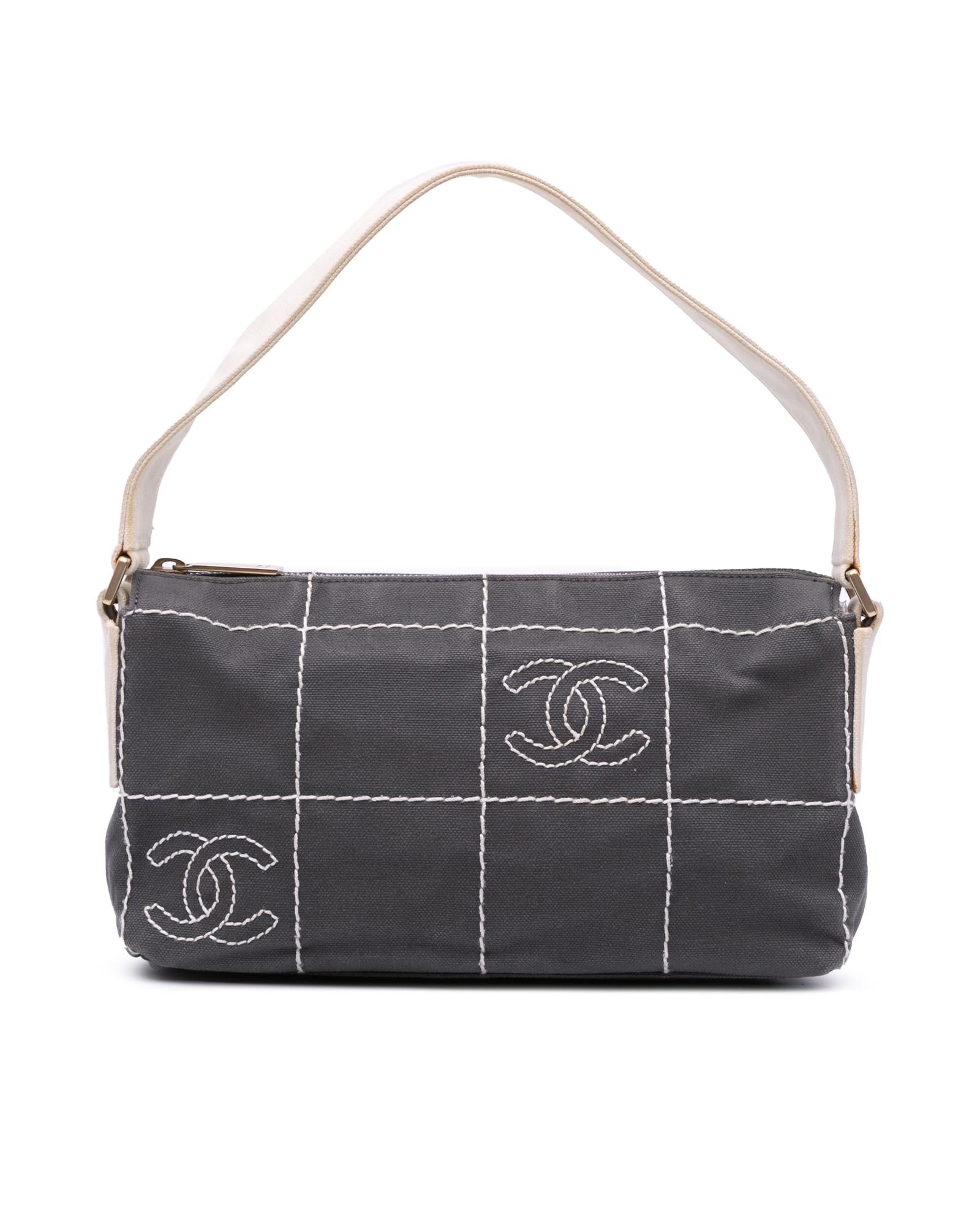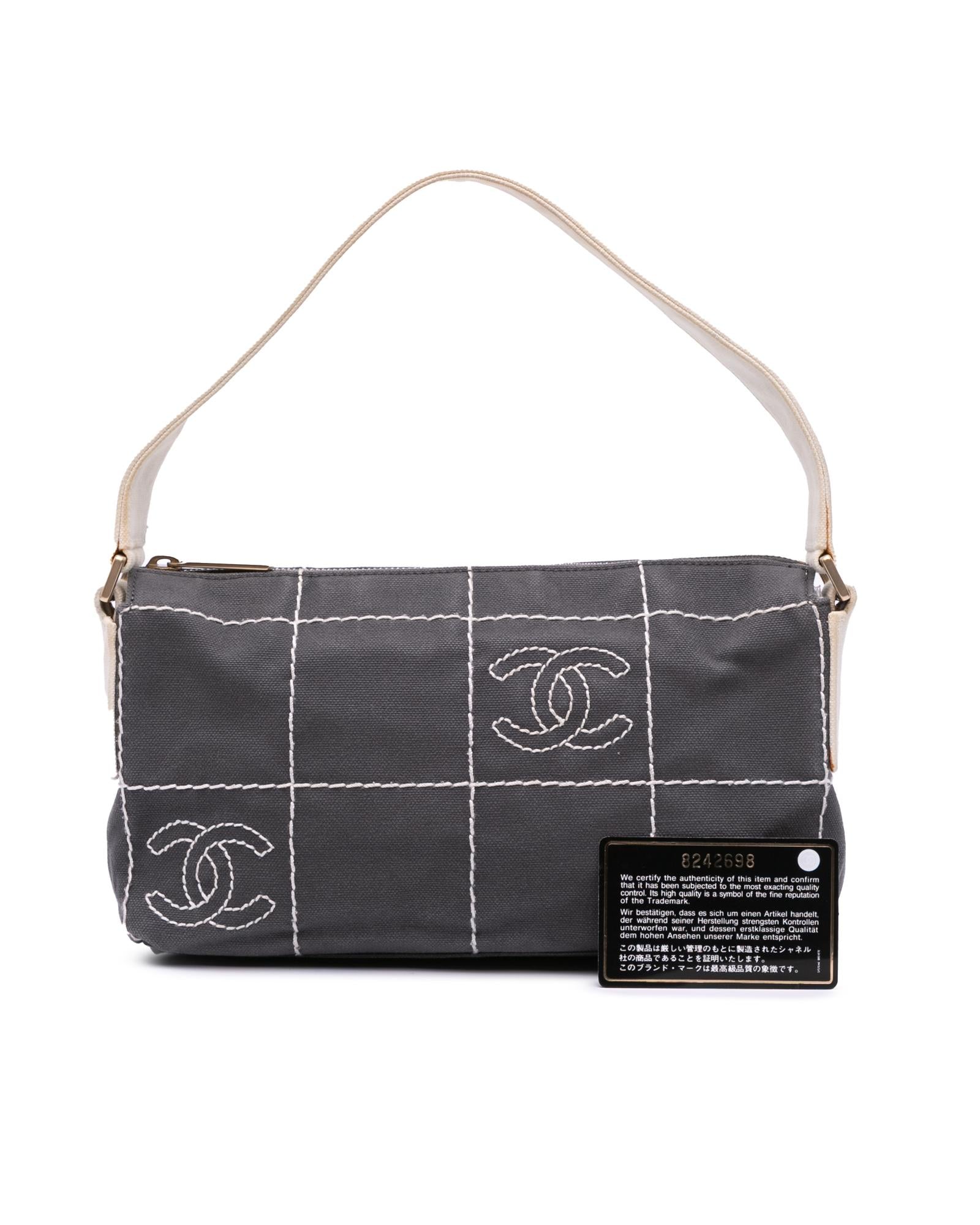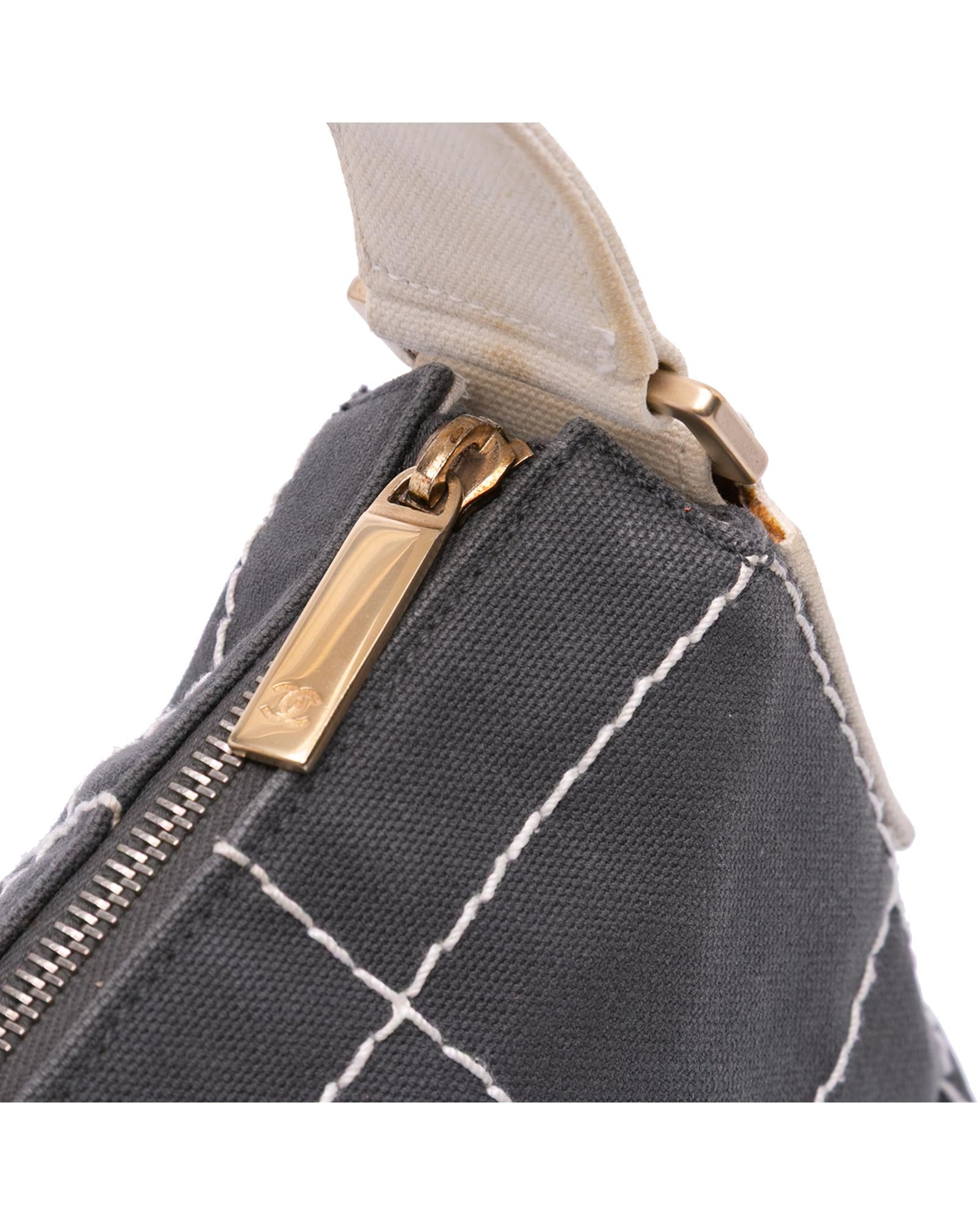 This shouder bag features a canvas body flat shoulder strap a top zip closure and an interior slip pocekt.Brand: Chanel