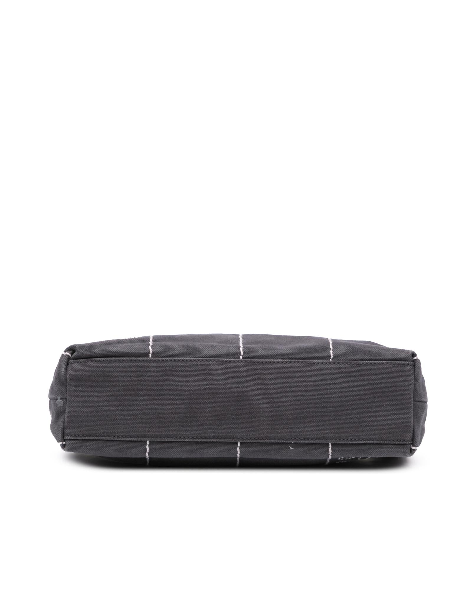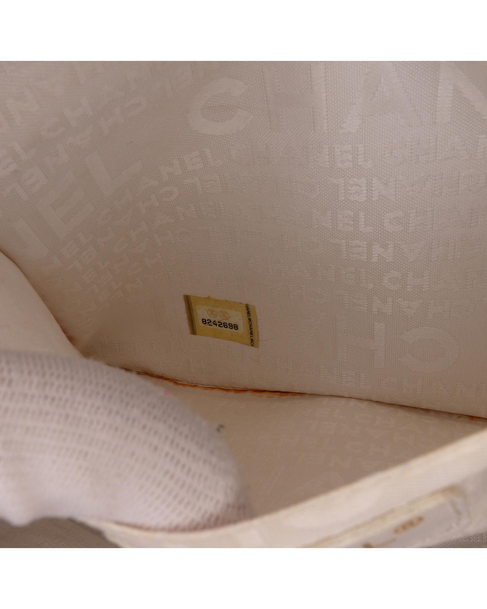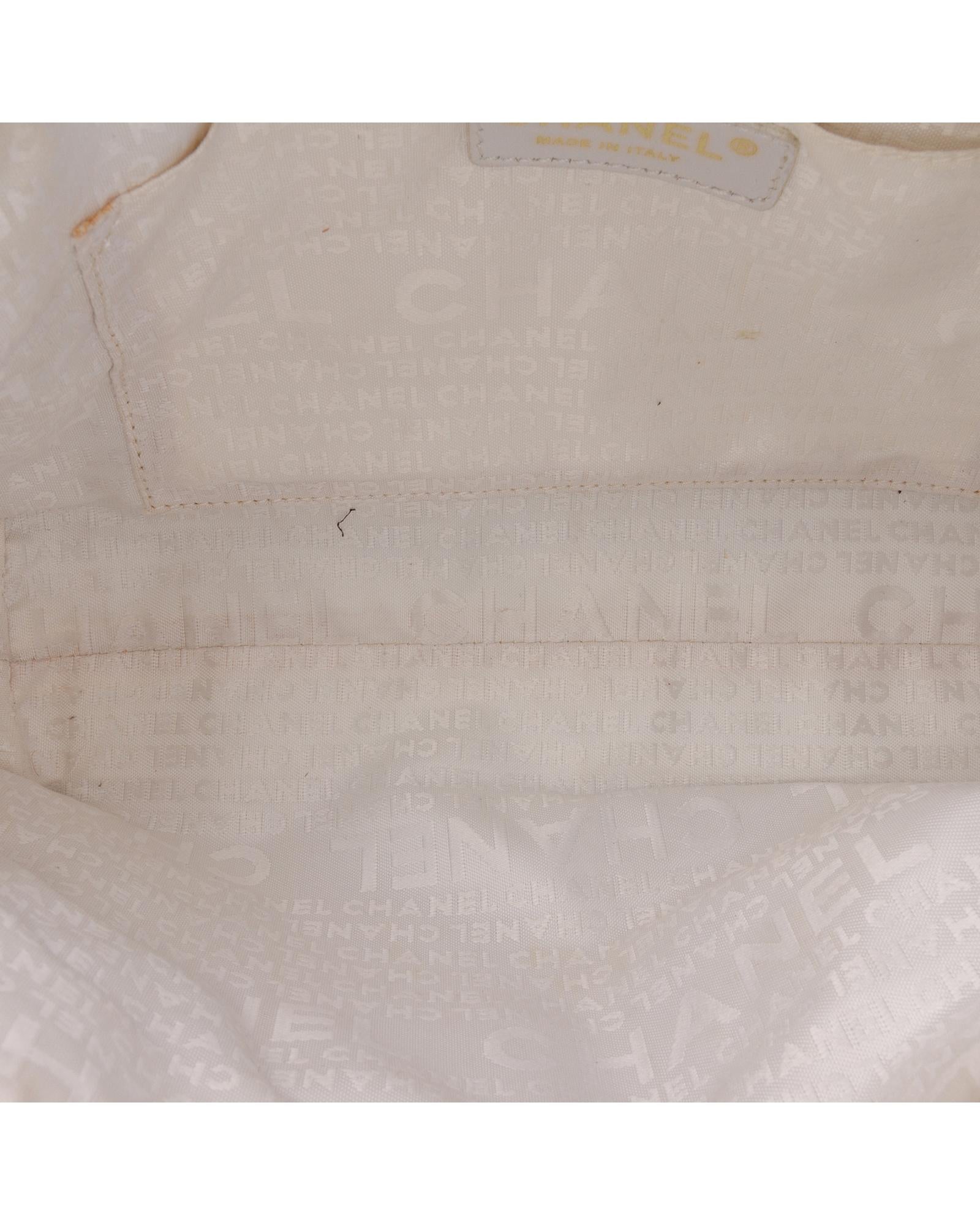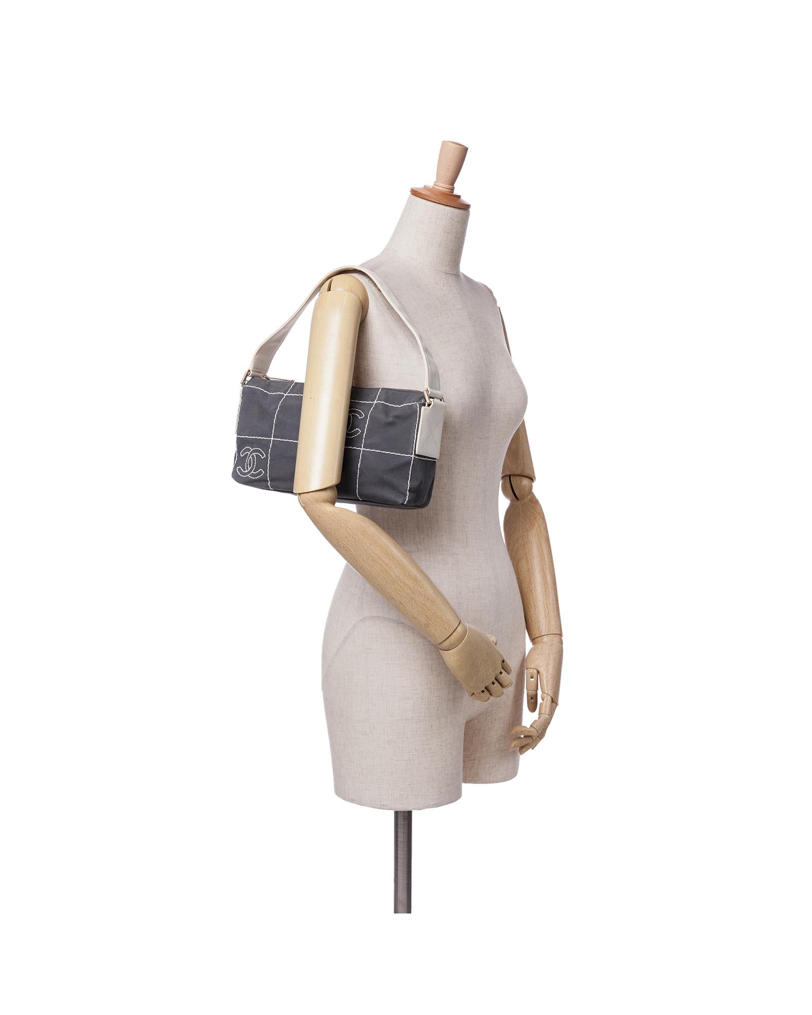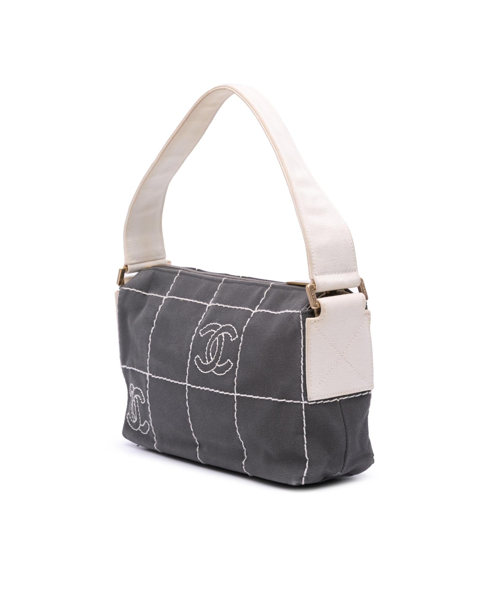 This shouder bag features a canvas body flat shoulder strap a top zip closure and an interior slip pocekt.Brand: Chanel