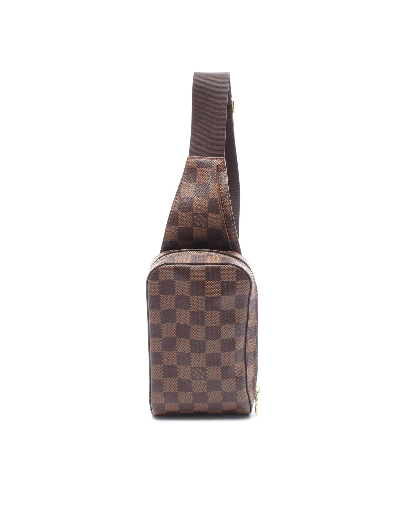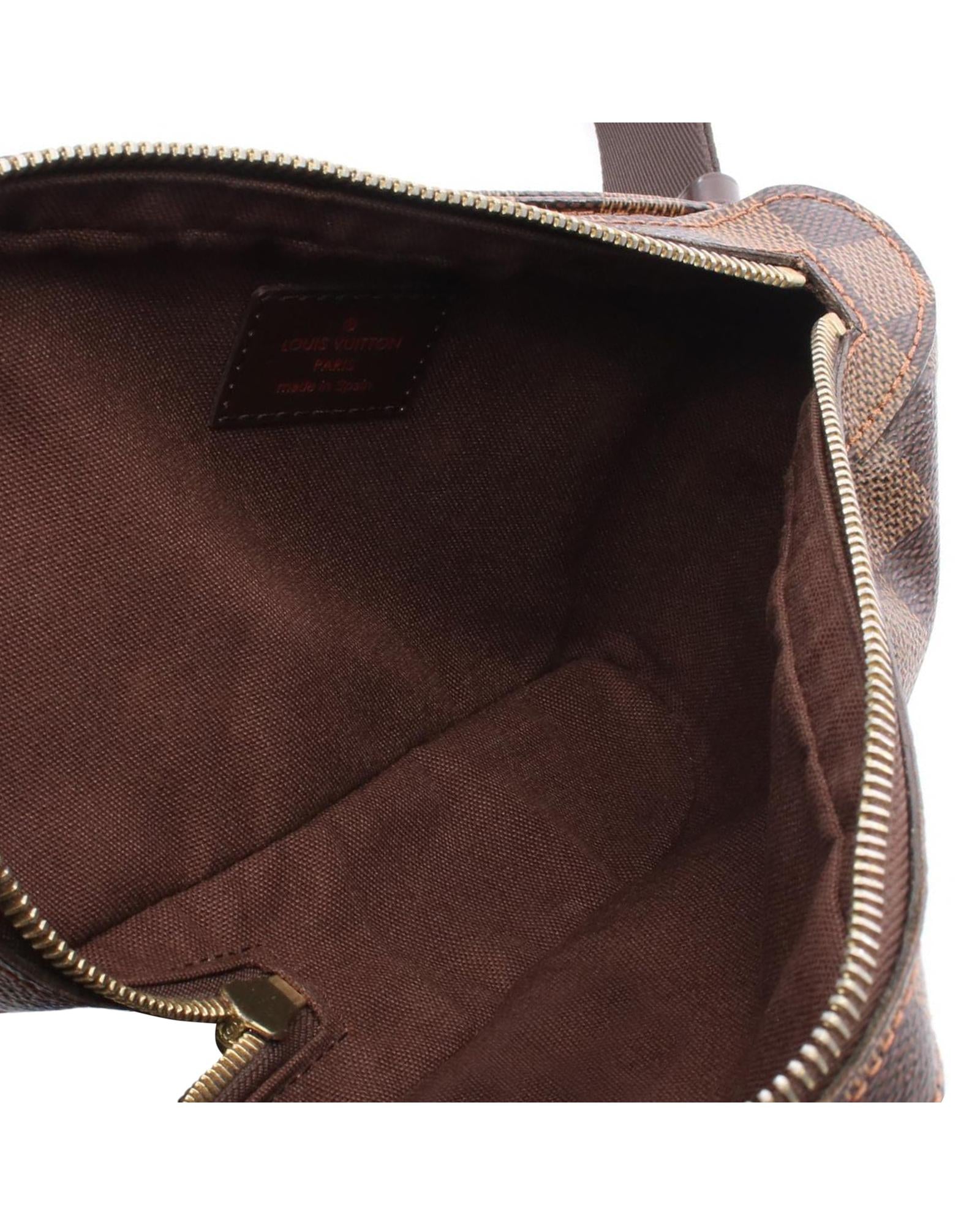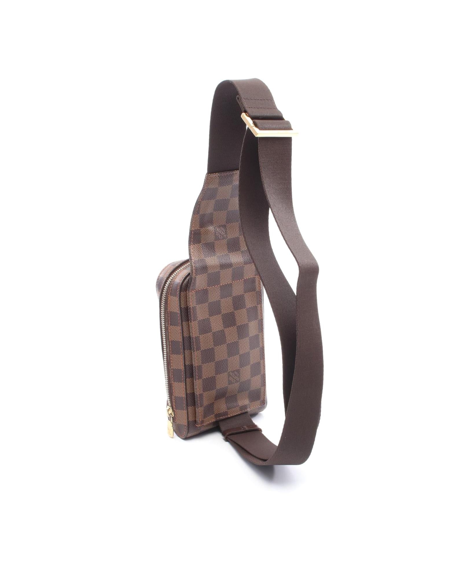 The Geronimos features a damier ebene canvas body an adjustable flat canvas strap a top zip closure and an exterior front slip pocket.Brand: Louis Vuitton Vintage