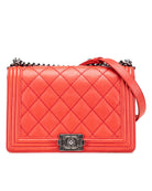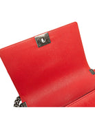 This Boy Flap crossbody features calfskin leather body a curb chain link strap with leather guard a front flap with a push lock CC's closure and an interior slip pocket.