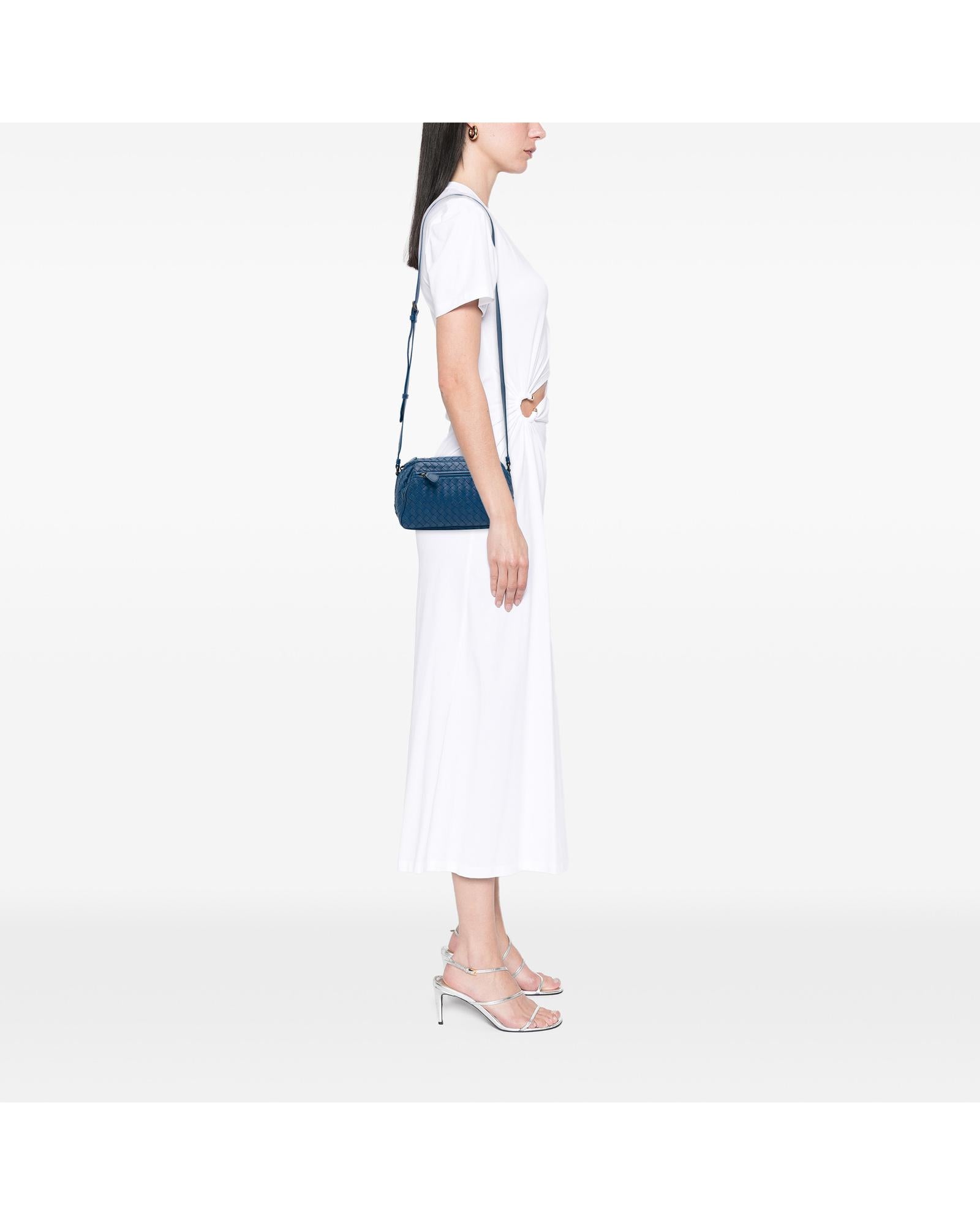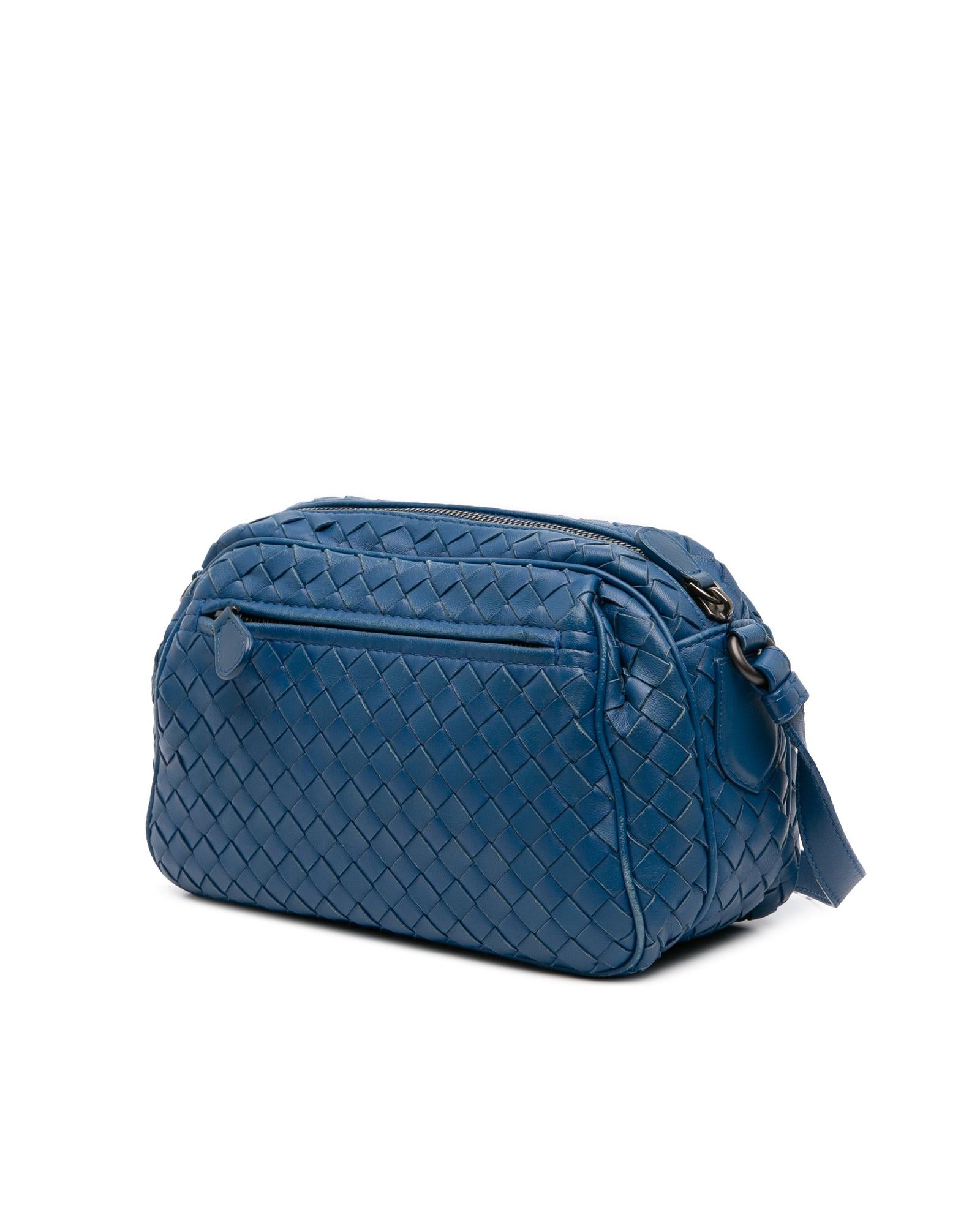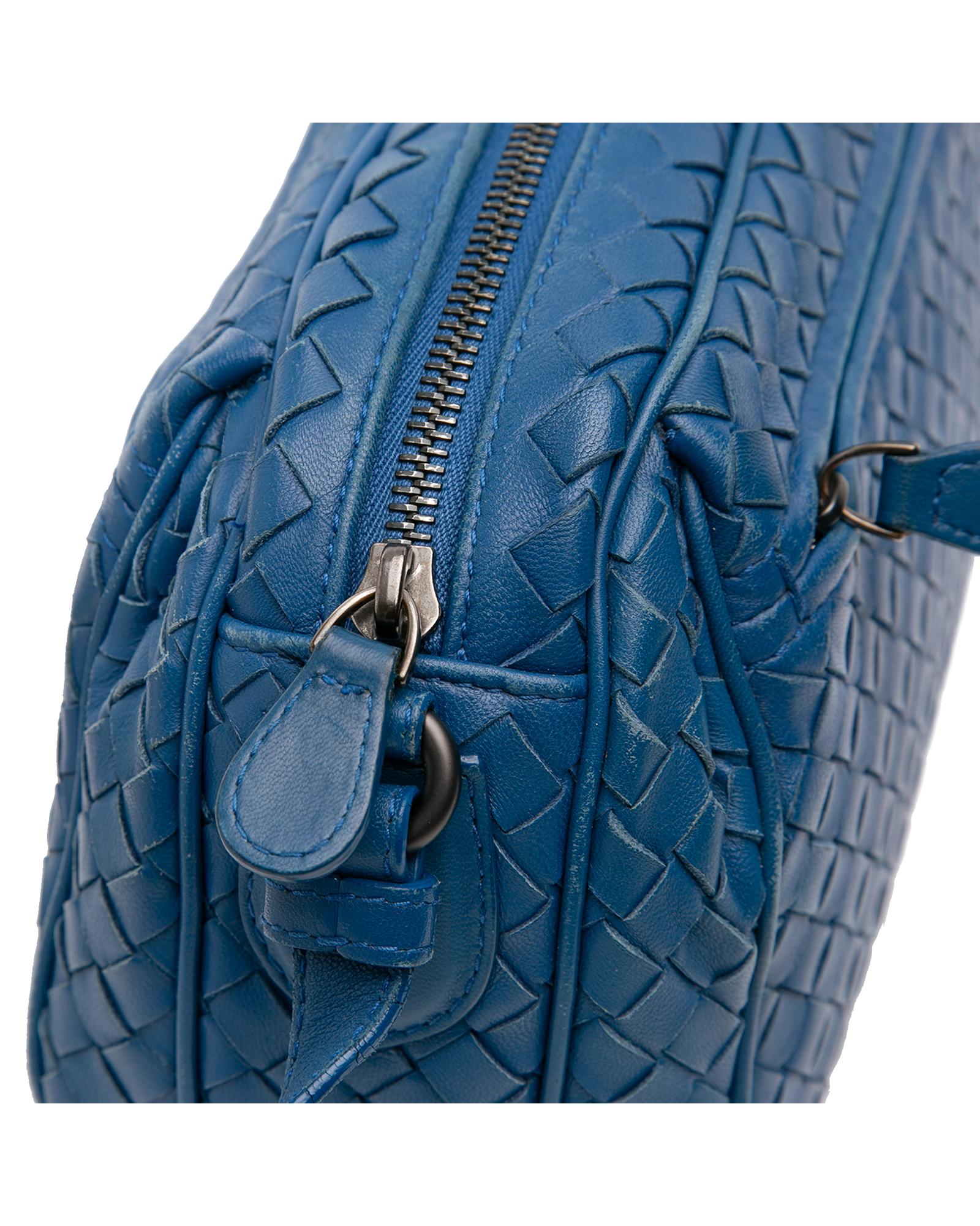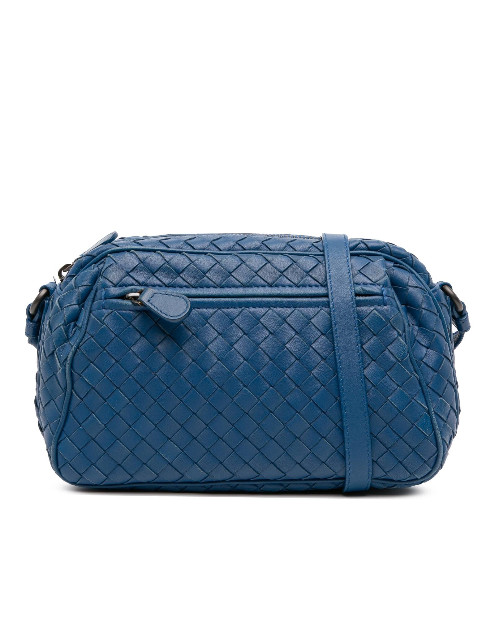 This crossbody bag features a woven leather body an adjustable flat leather shoulder strap a top zip closure and exterior zip pockets.