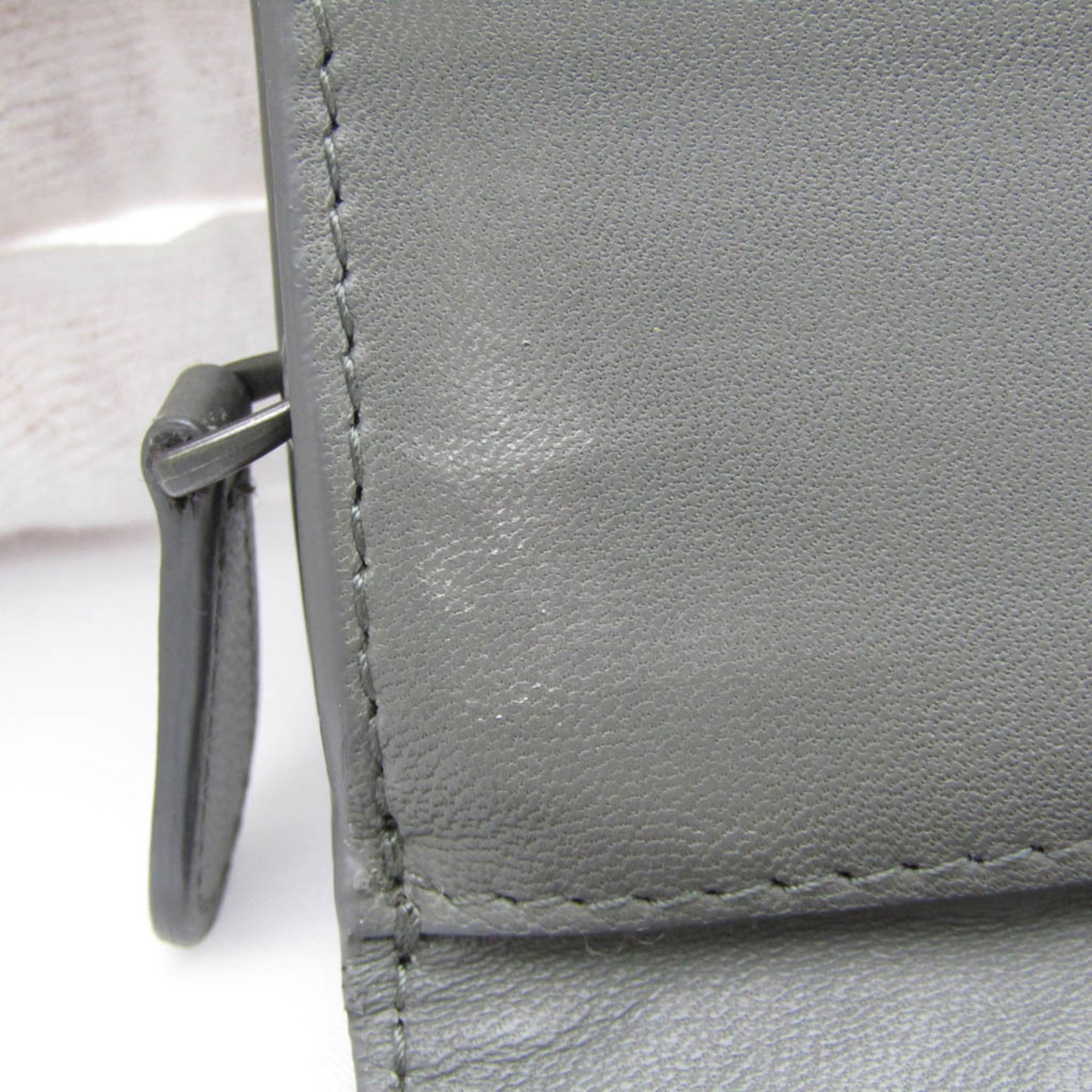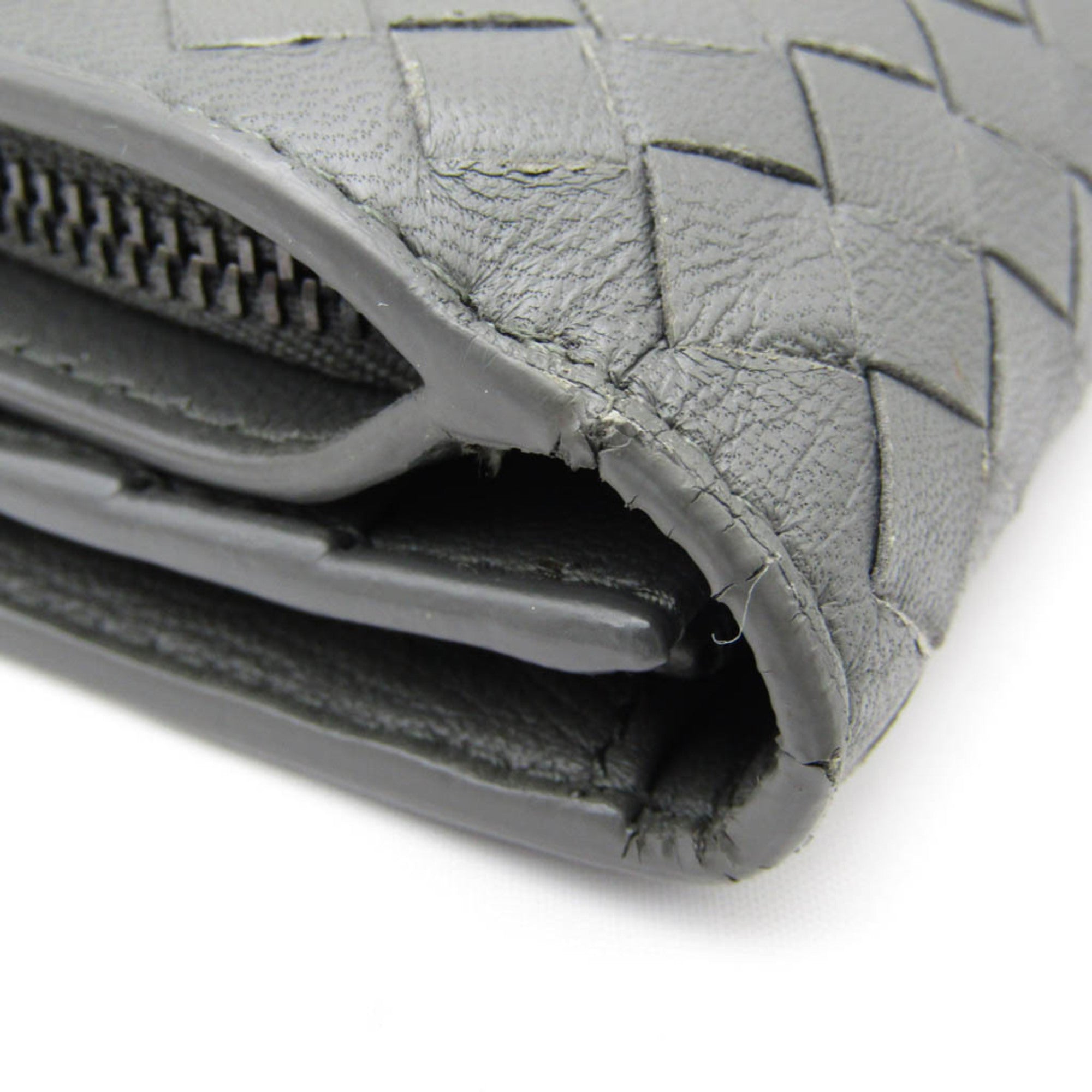 Elevate your everyday essentials with the Bottega Veneta Intrecciato Long Wallet. This bi-fold wallet suitable for both men and women boasts a sleek gray leather design with the brs iconic Intrecciato weaving. While there are slight overall scratches dirt and traces of use it remains in excellent condition. The only notable issue is some slight cracking on the edges which doesnt detract from its overall appeal.