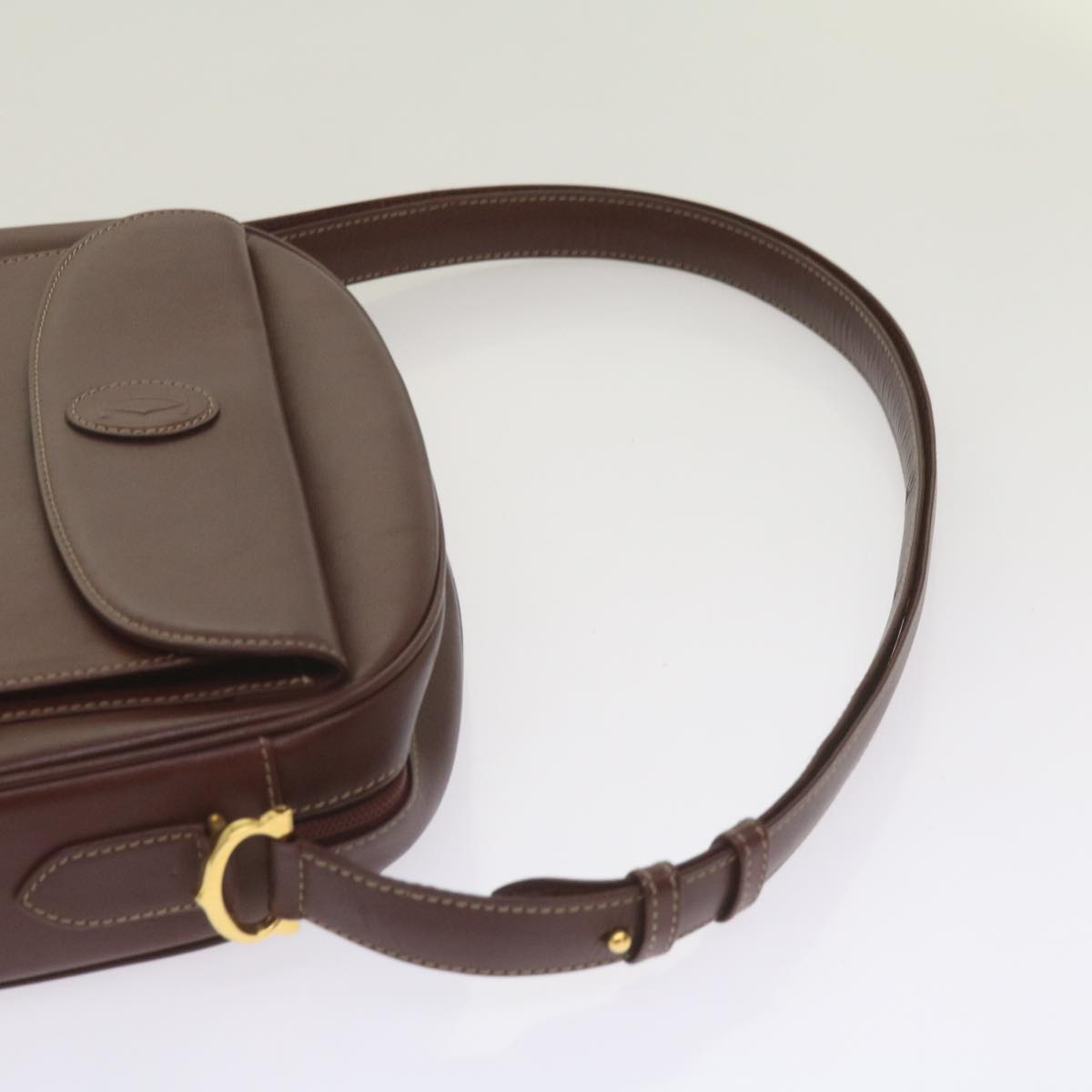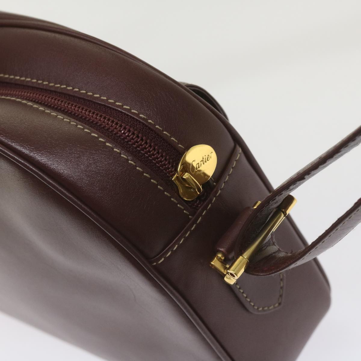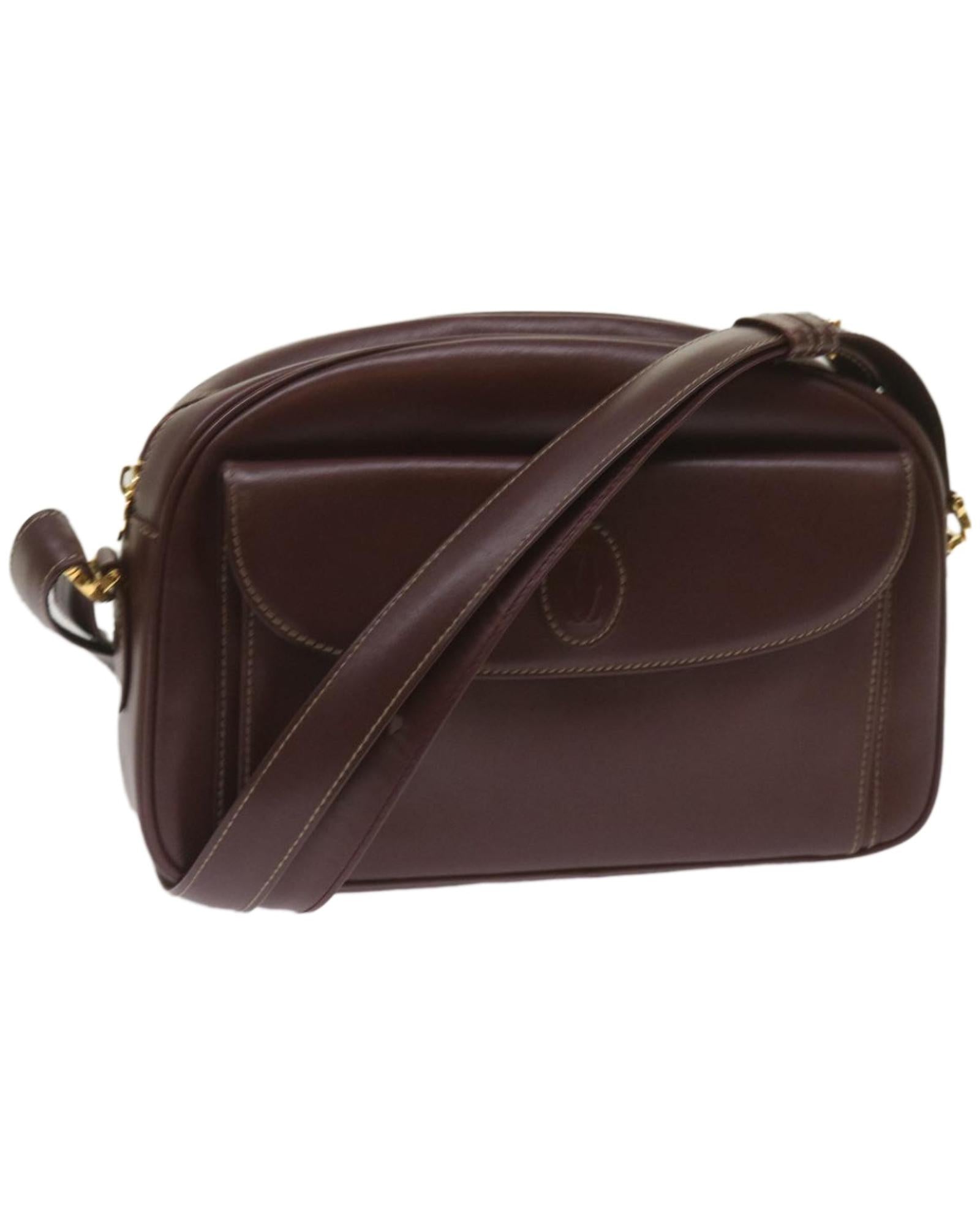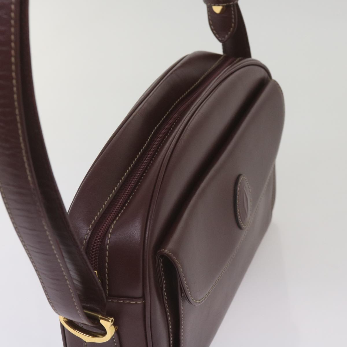 This CARTIER shoulder bag from the Must de Cartier line features a rich wine red color and is crafted from luxurious leather material. The bag exudes elegance and sophistication with its classic design and attention to detail.