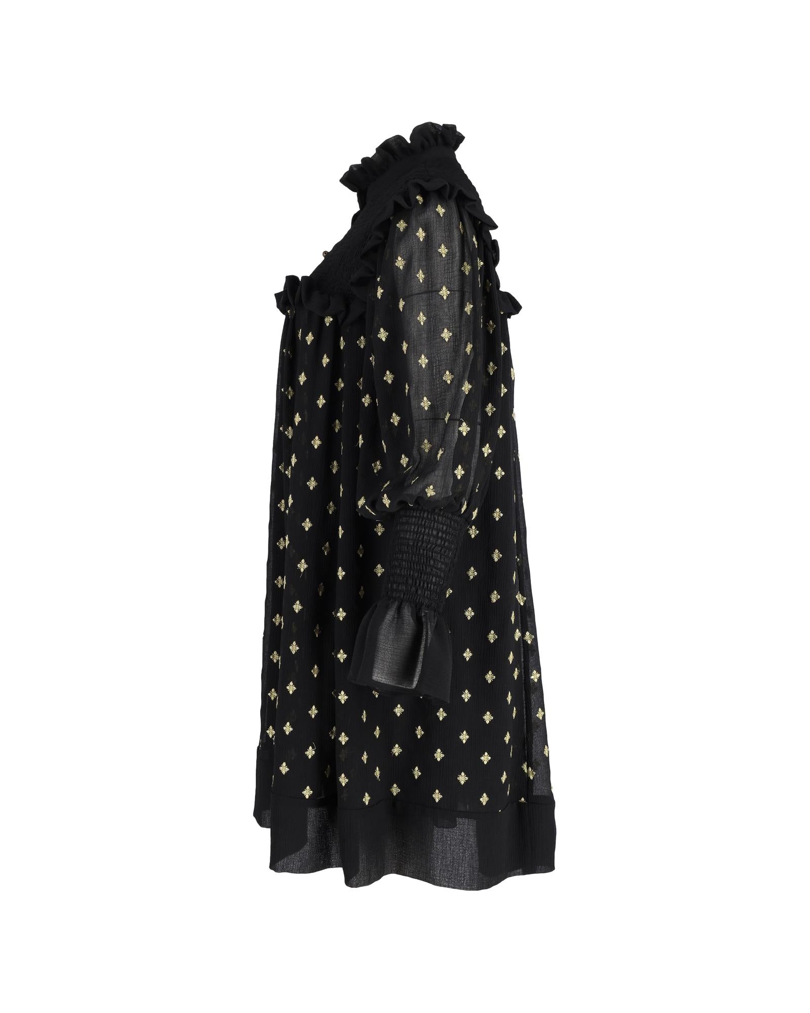 - Delicate ruffled neckline adds a touch of whimsy