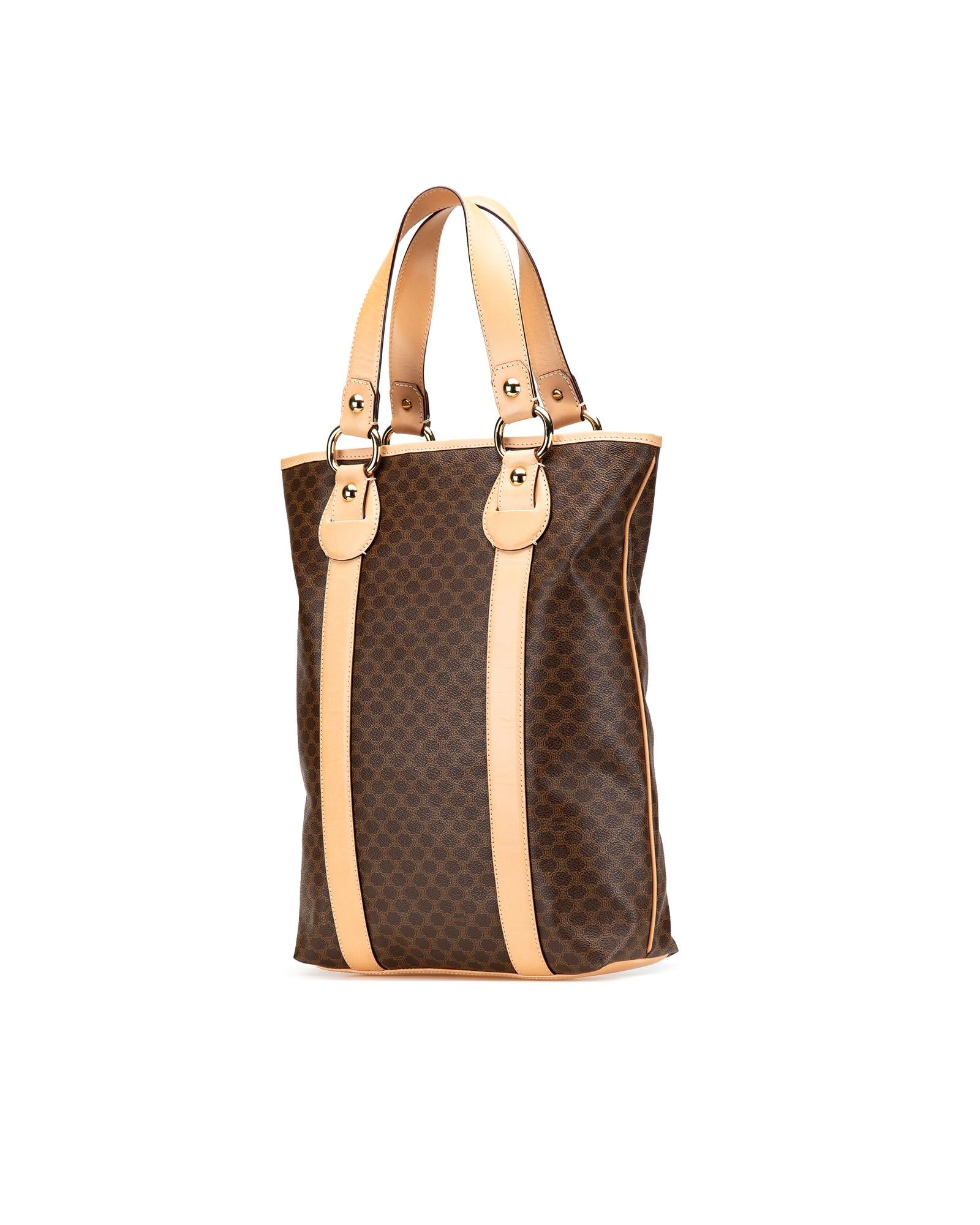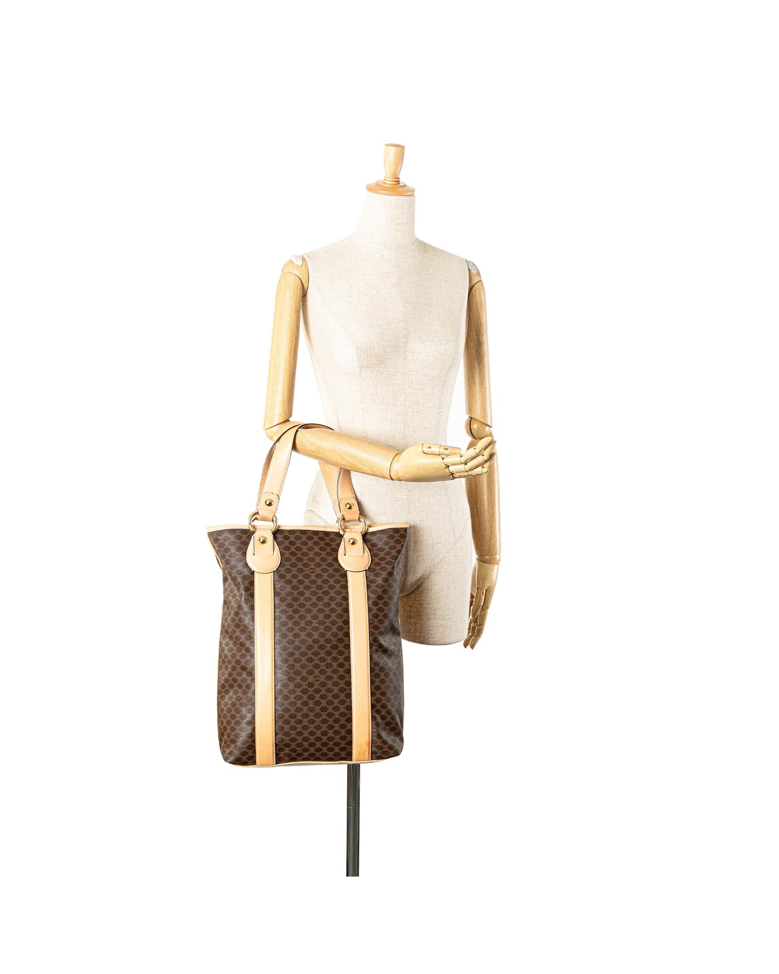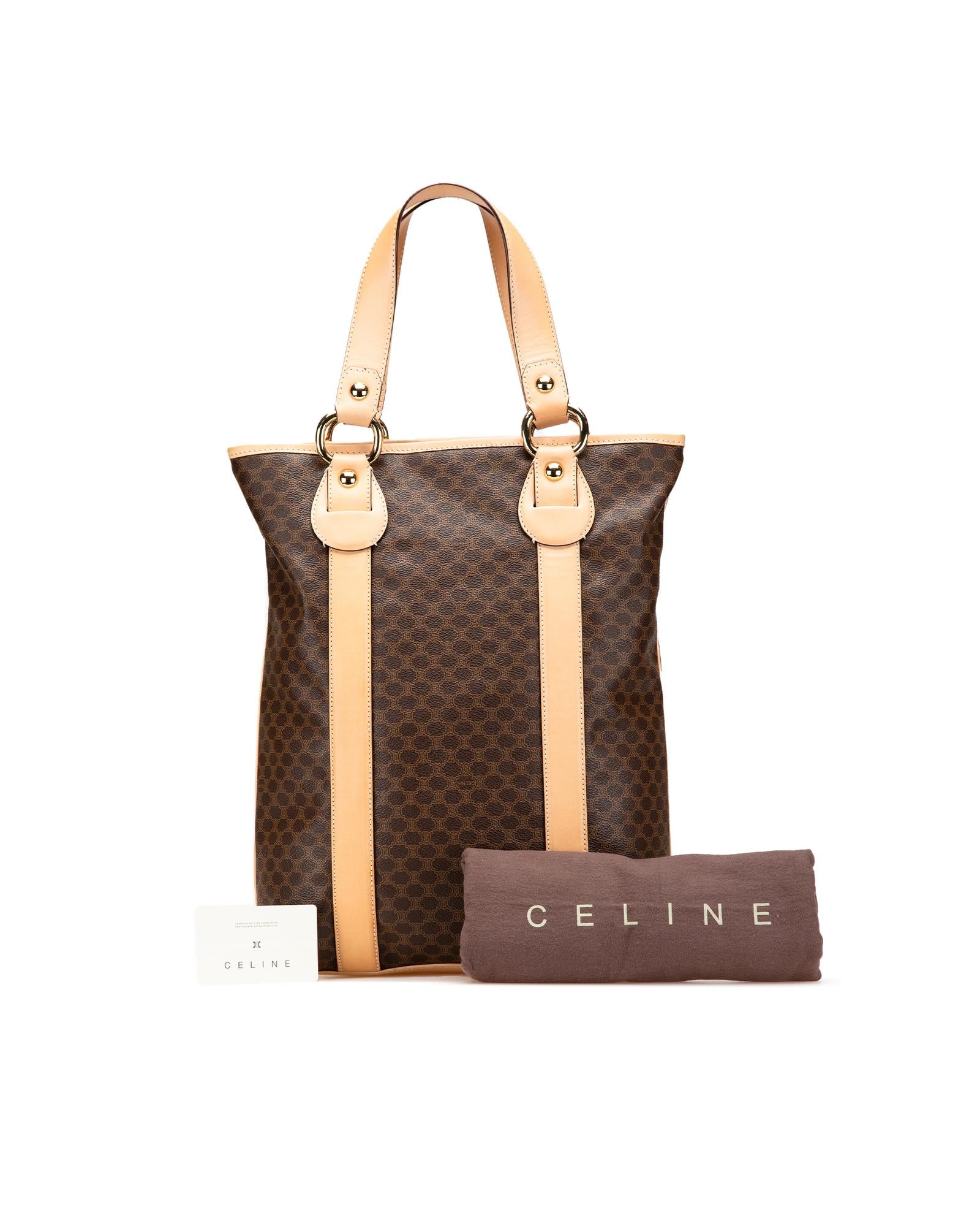 This tote bag features a coated canvas body with leather trim flat leather straps an open top with magnetic snap closure and interior zip and slip pockets.Brand: Celine