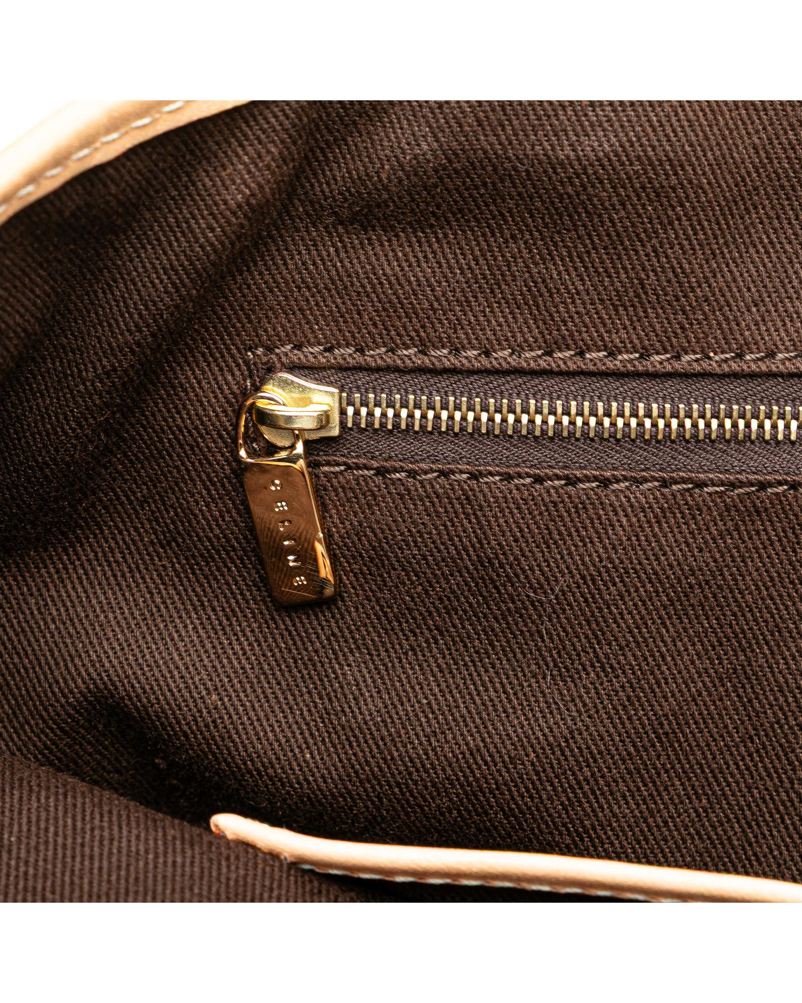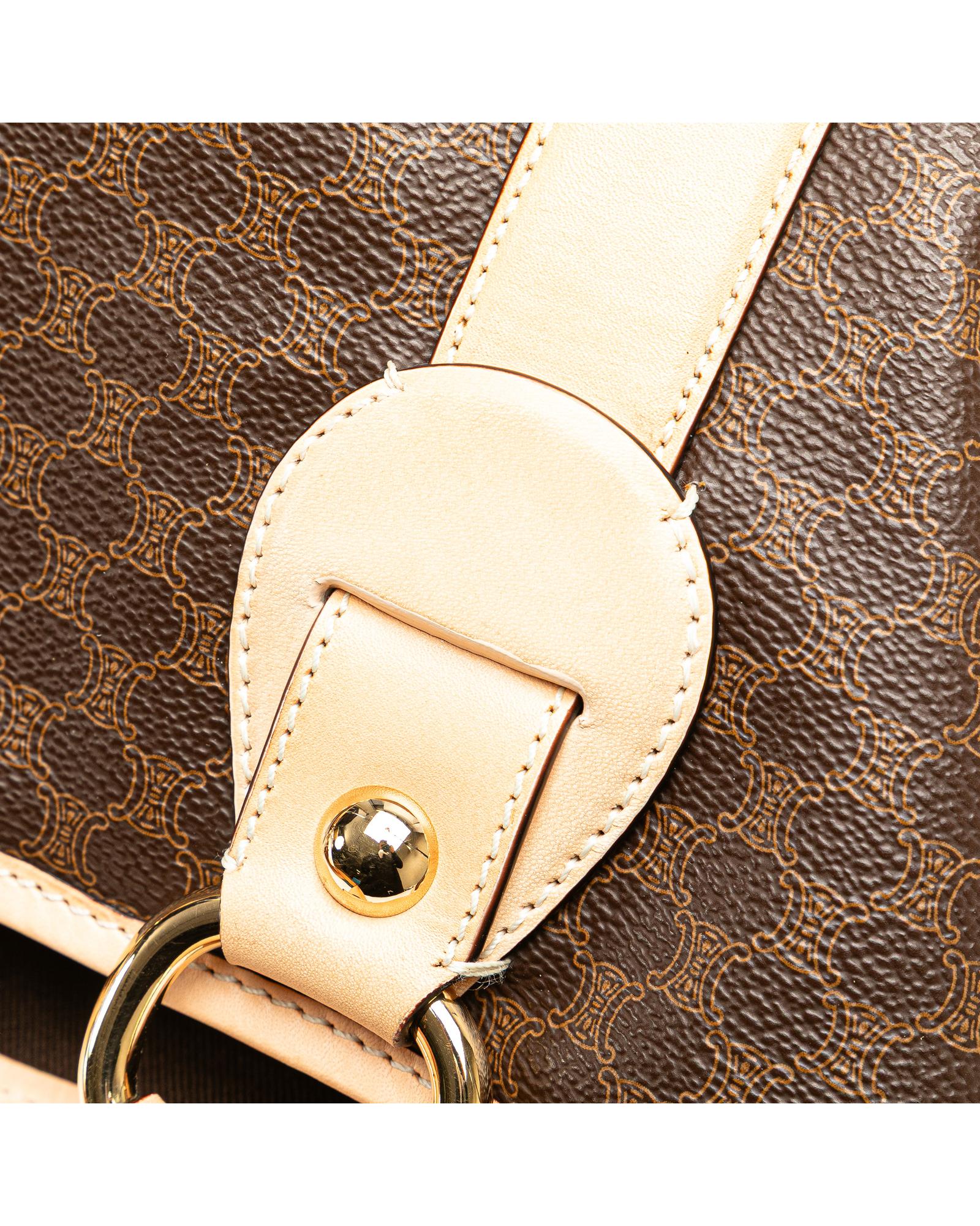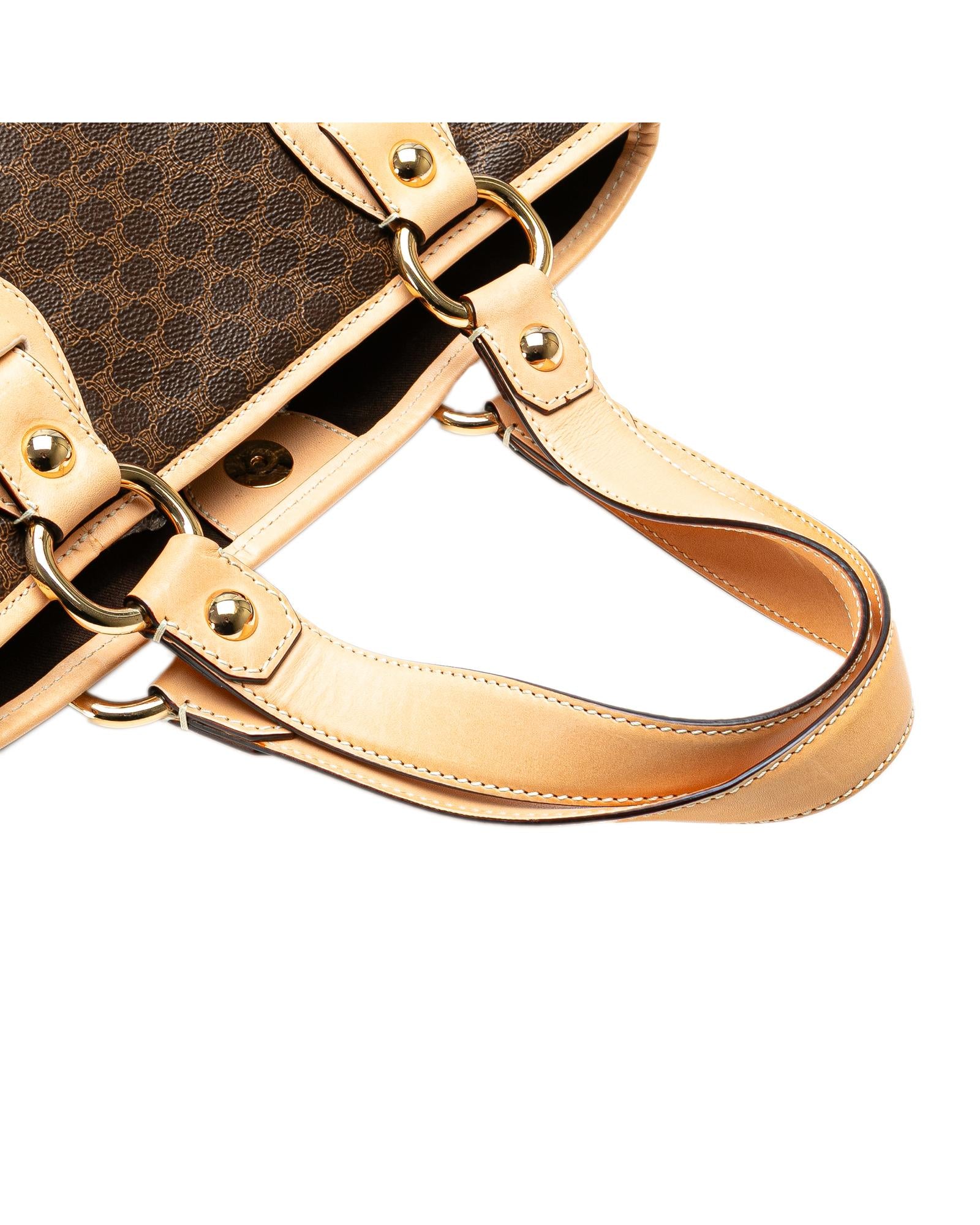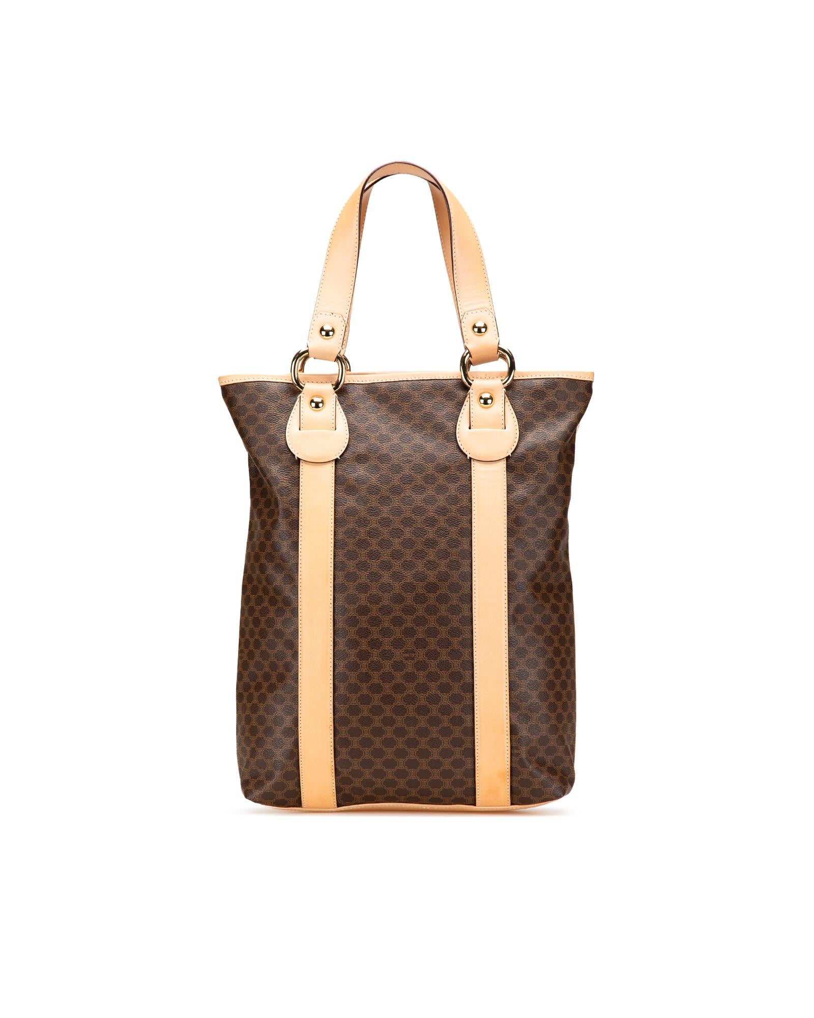 This tote bag features a coated canvas body with leather trim flat leather straps an open top with magnetic snap closure and interior zip and slip pockets.Brand: Celine