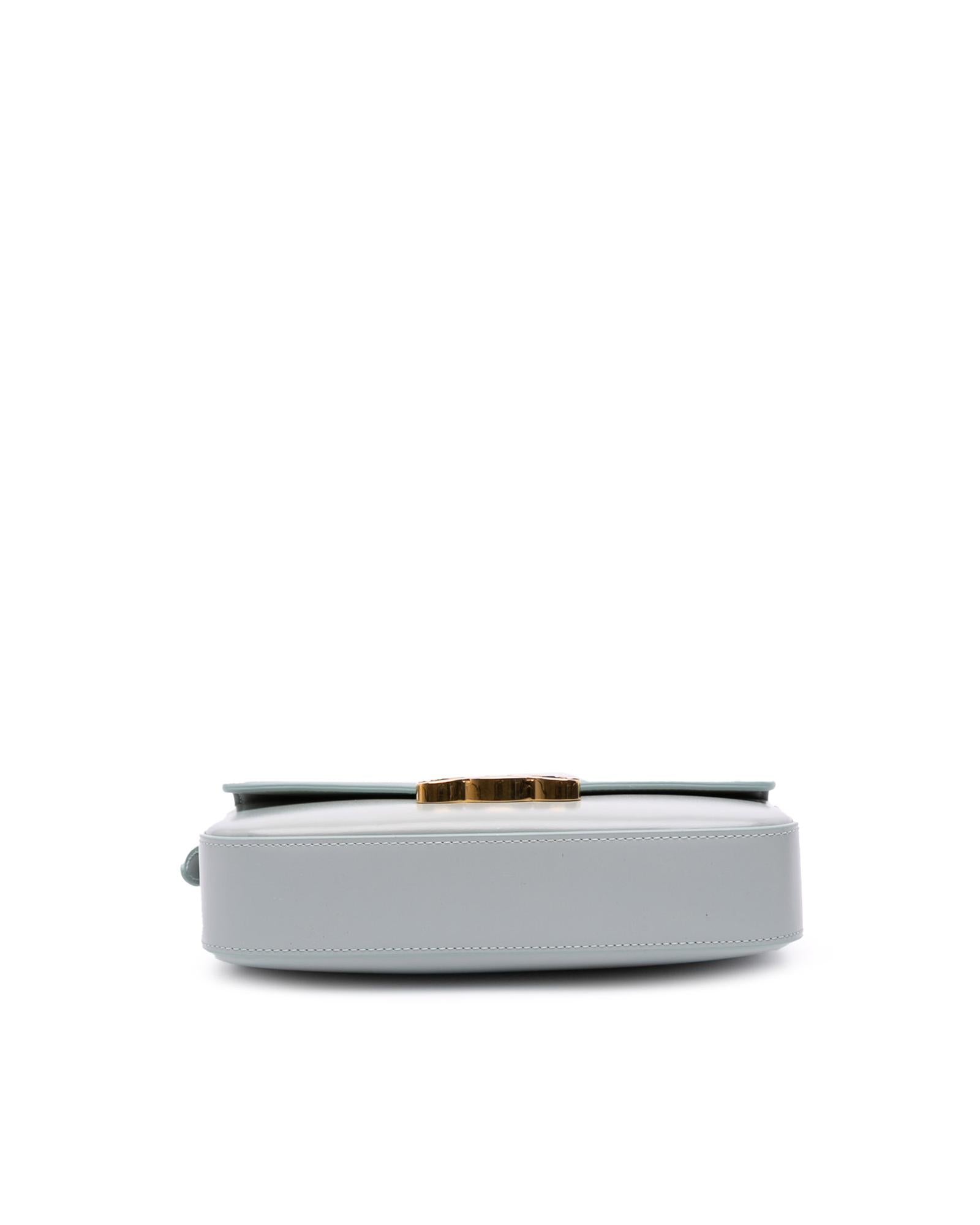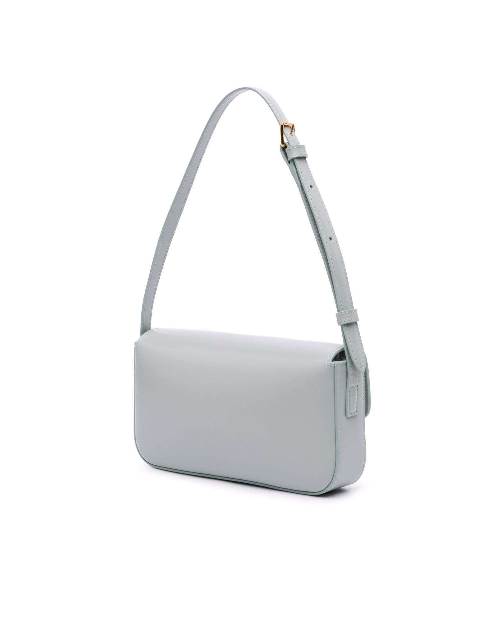 This shoulder bag features a leather body an adjustable flat shoulder strap a front flap with push-lock closure and an interior slip pocket.