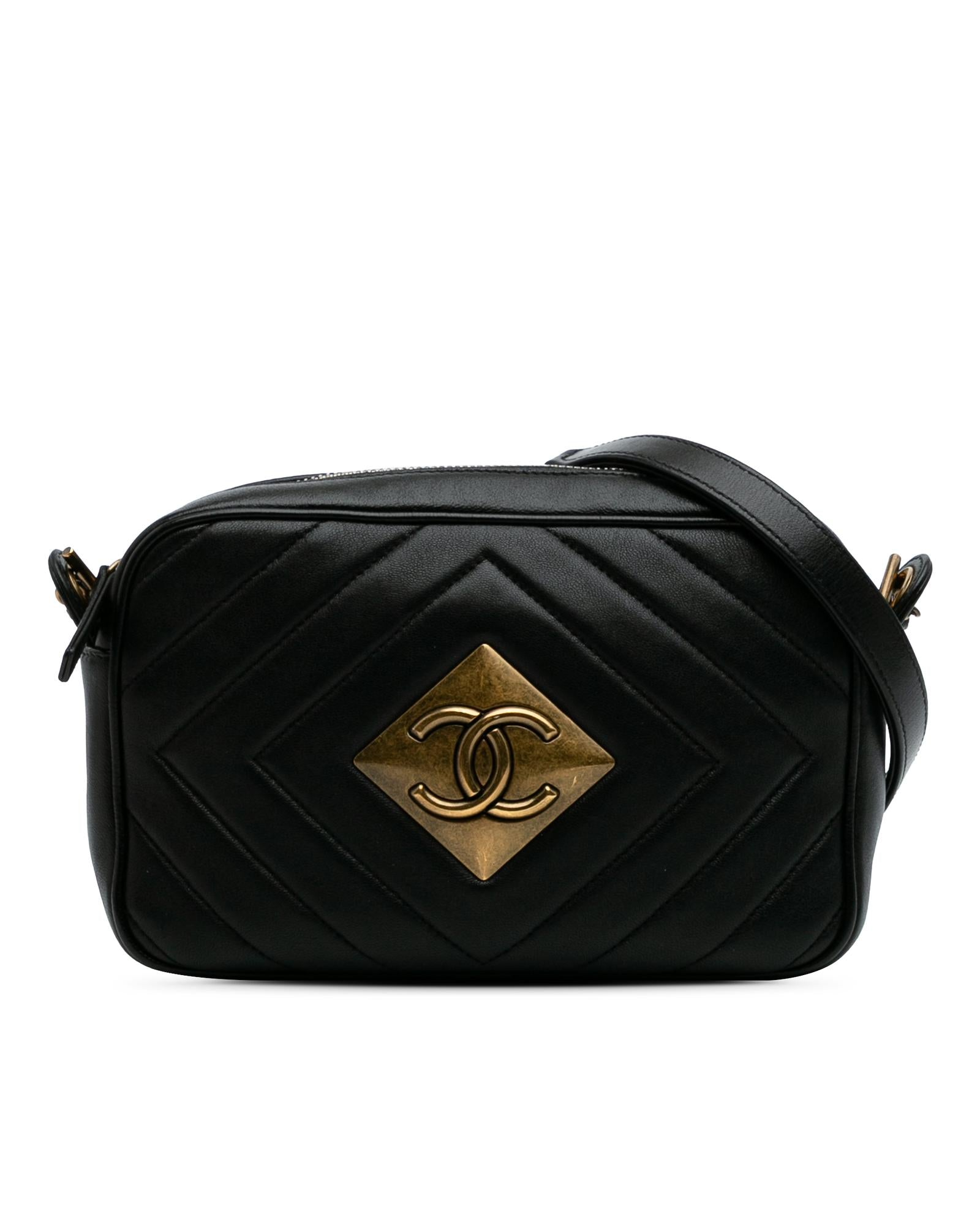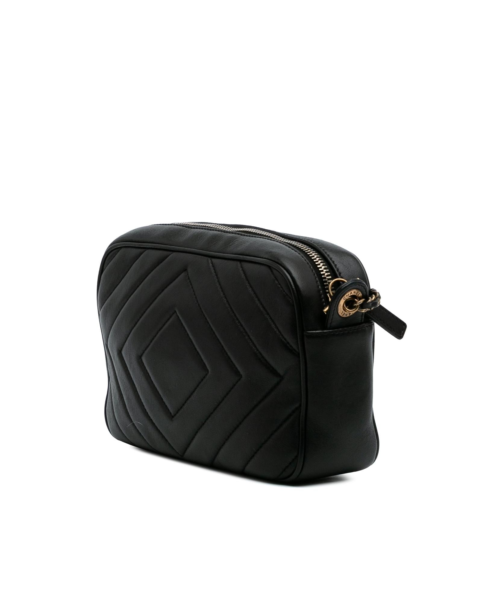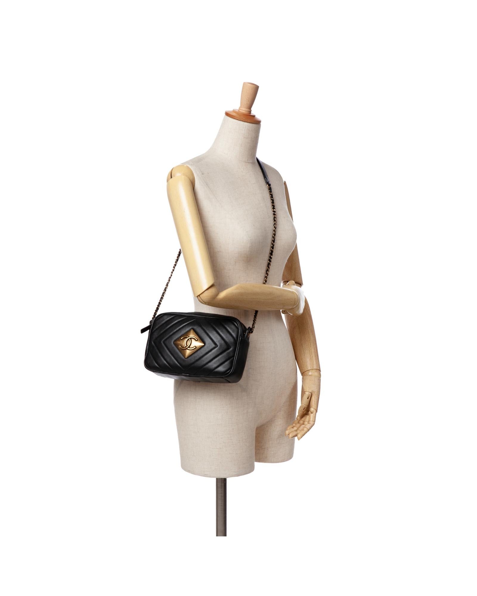 This crossbody bag features a quilted lambskin body leather woven chain strap with leather shoulder guard a top zip closure and an interior zip pocket.Brand: Chanel