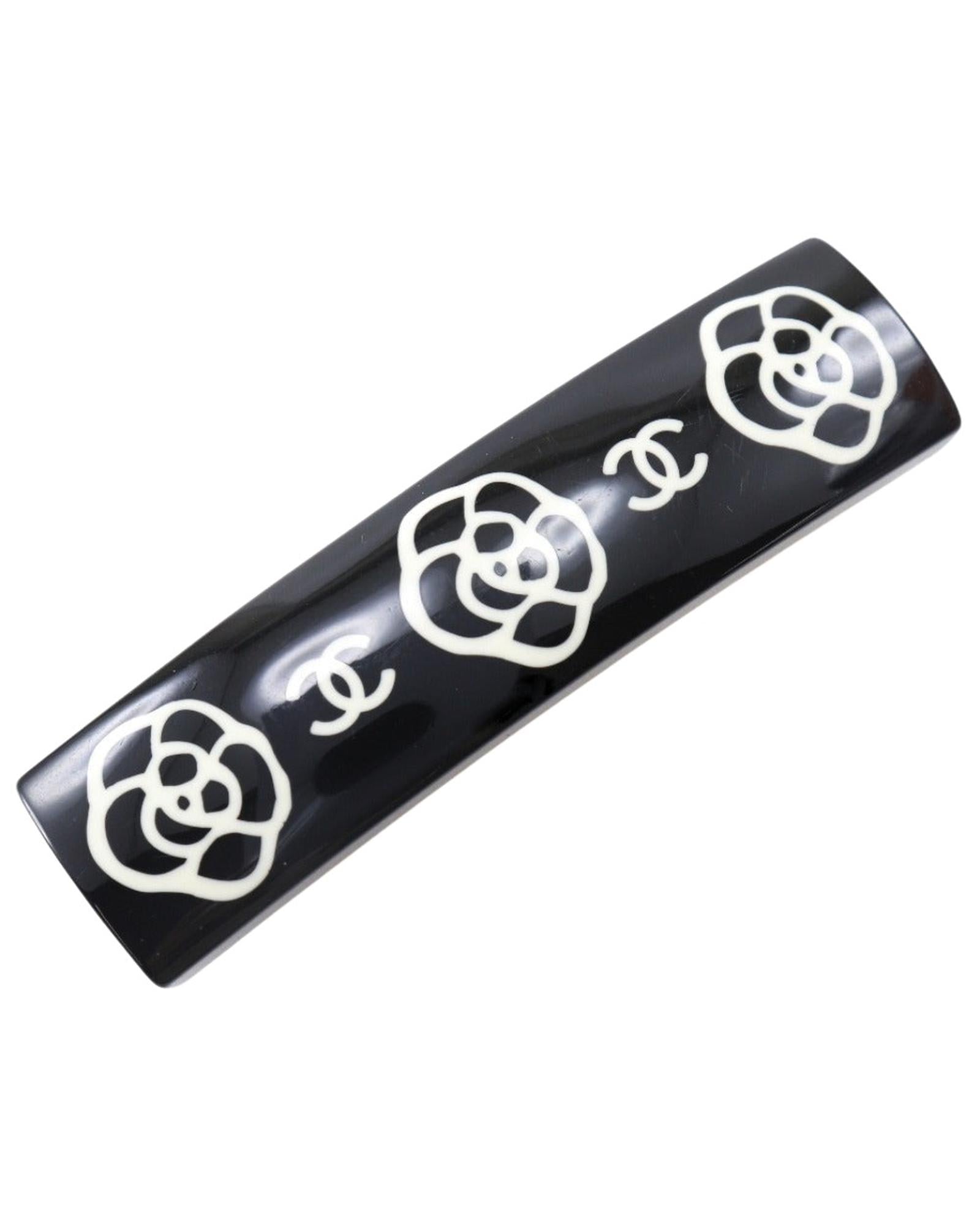The CHANEL Coco Mark Camelia barrette is a chic accessory designed for ladies who appreciate elegant and versatile styling. Made from high-quality plastic in a classic black and white color combination this barrette features the iconic Coco Mark design adorned with a delicate Camelia motif exuding sophistication and charm.