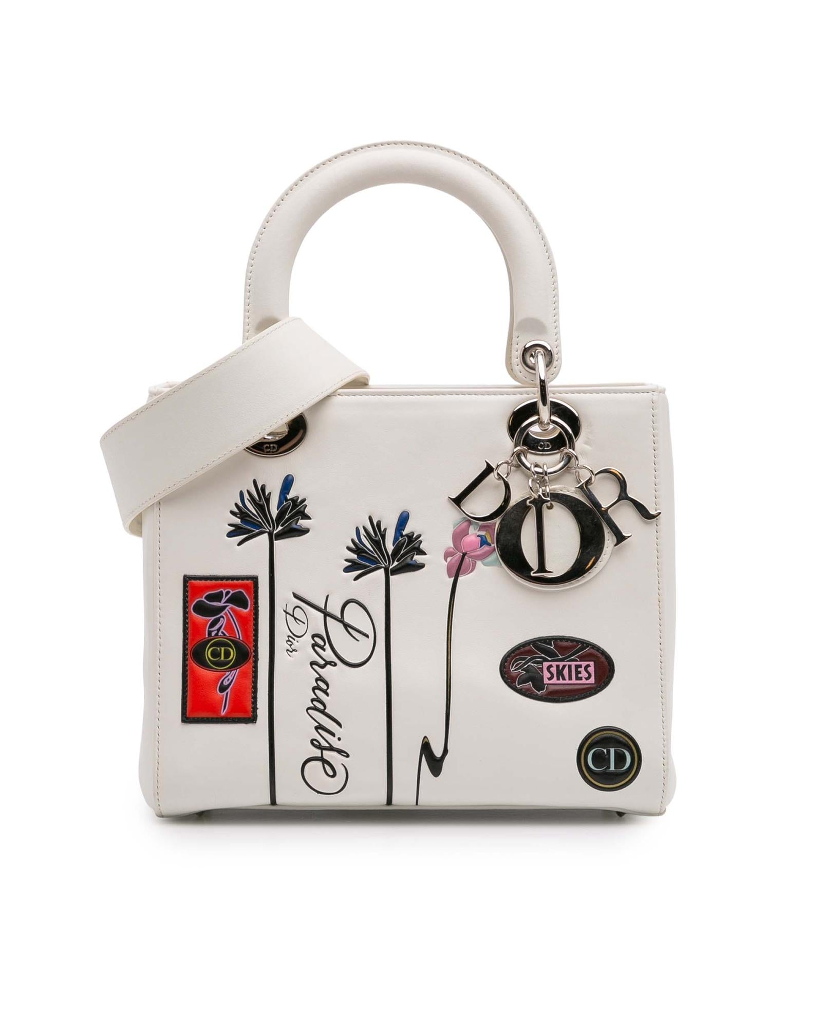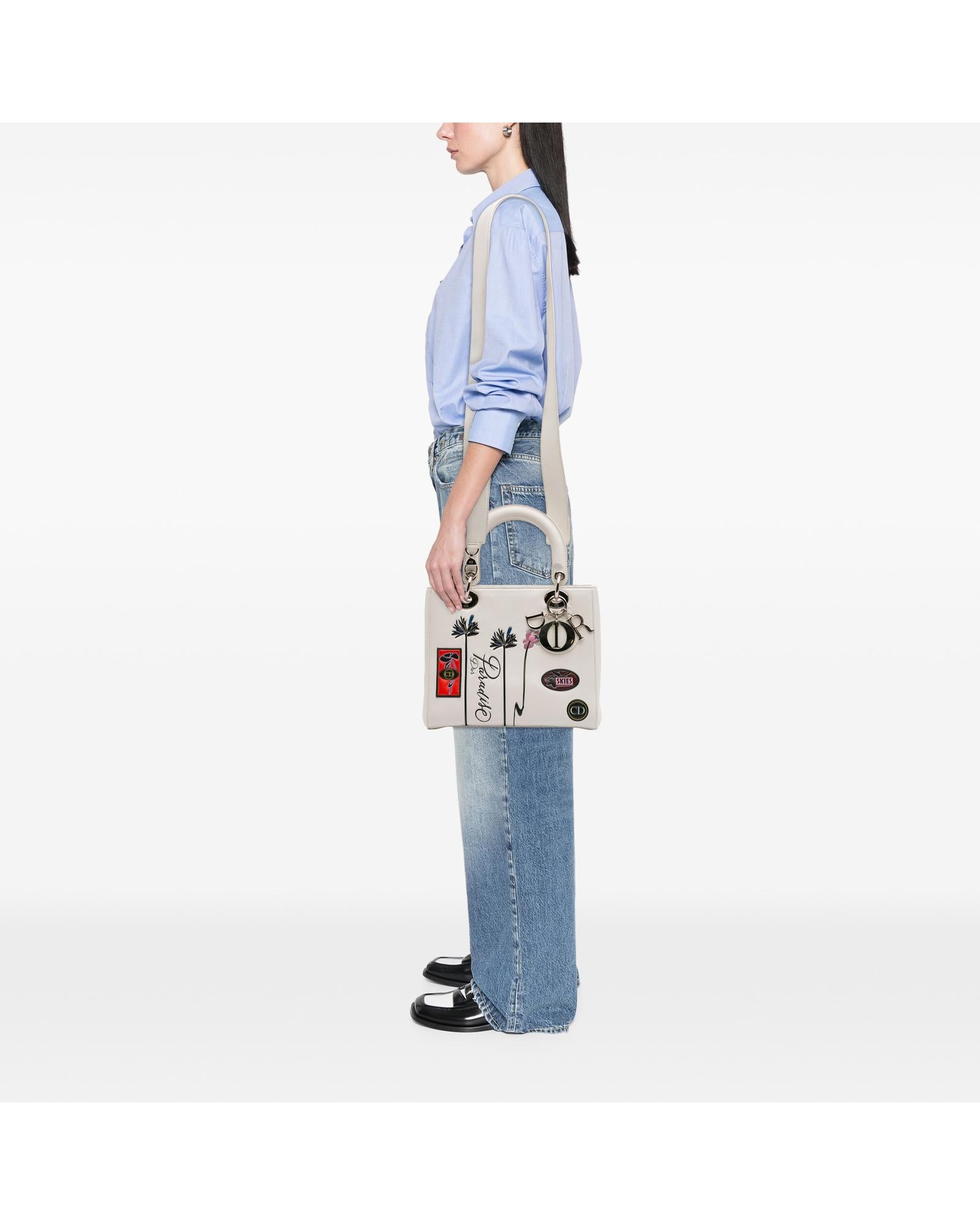 Elegant Top Handle Bag with Decorative Charms and Graphic Appliques