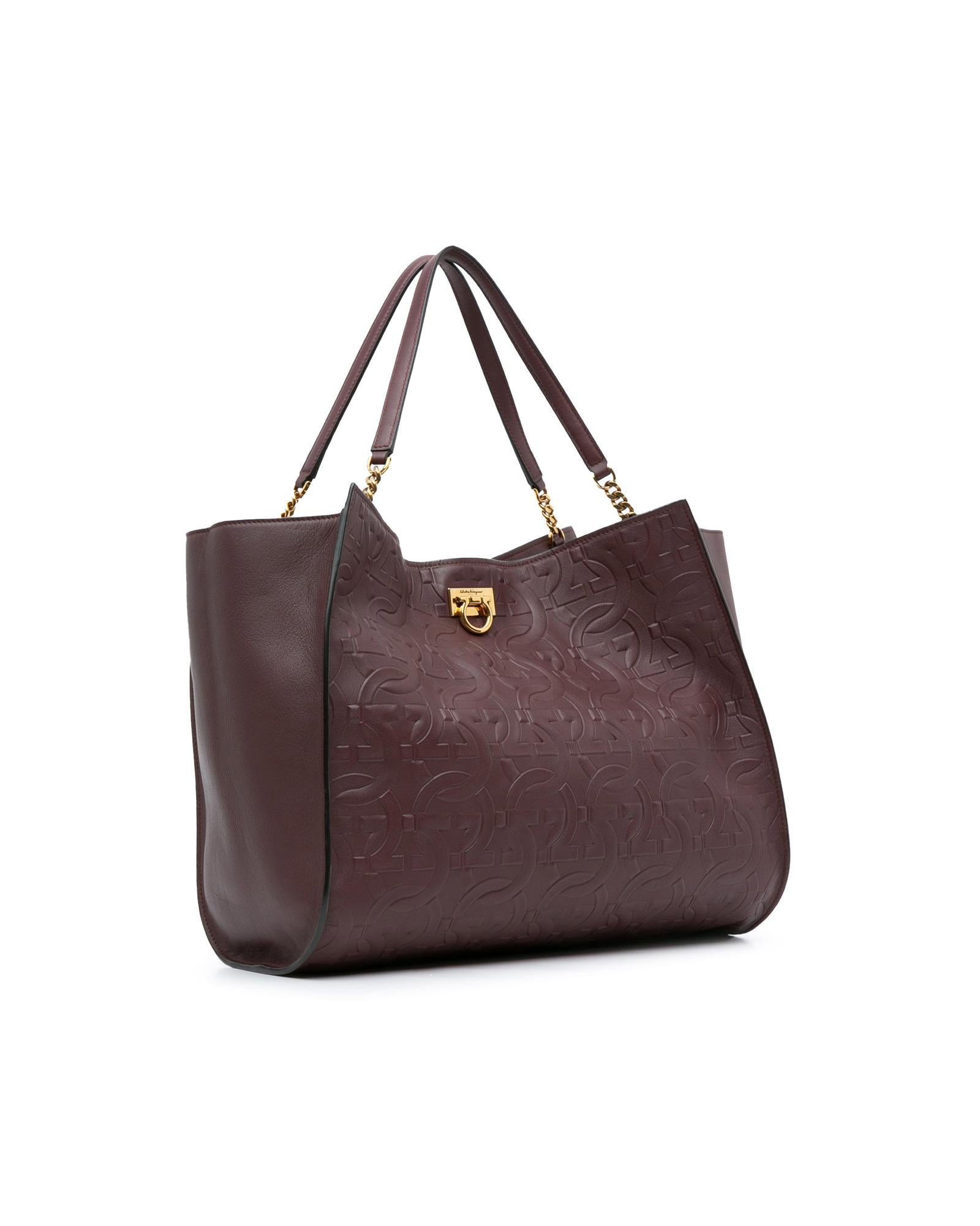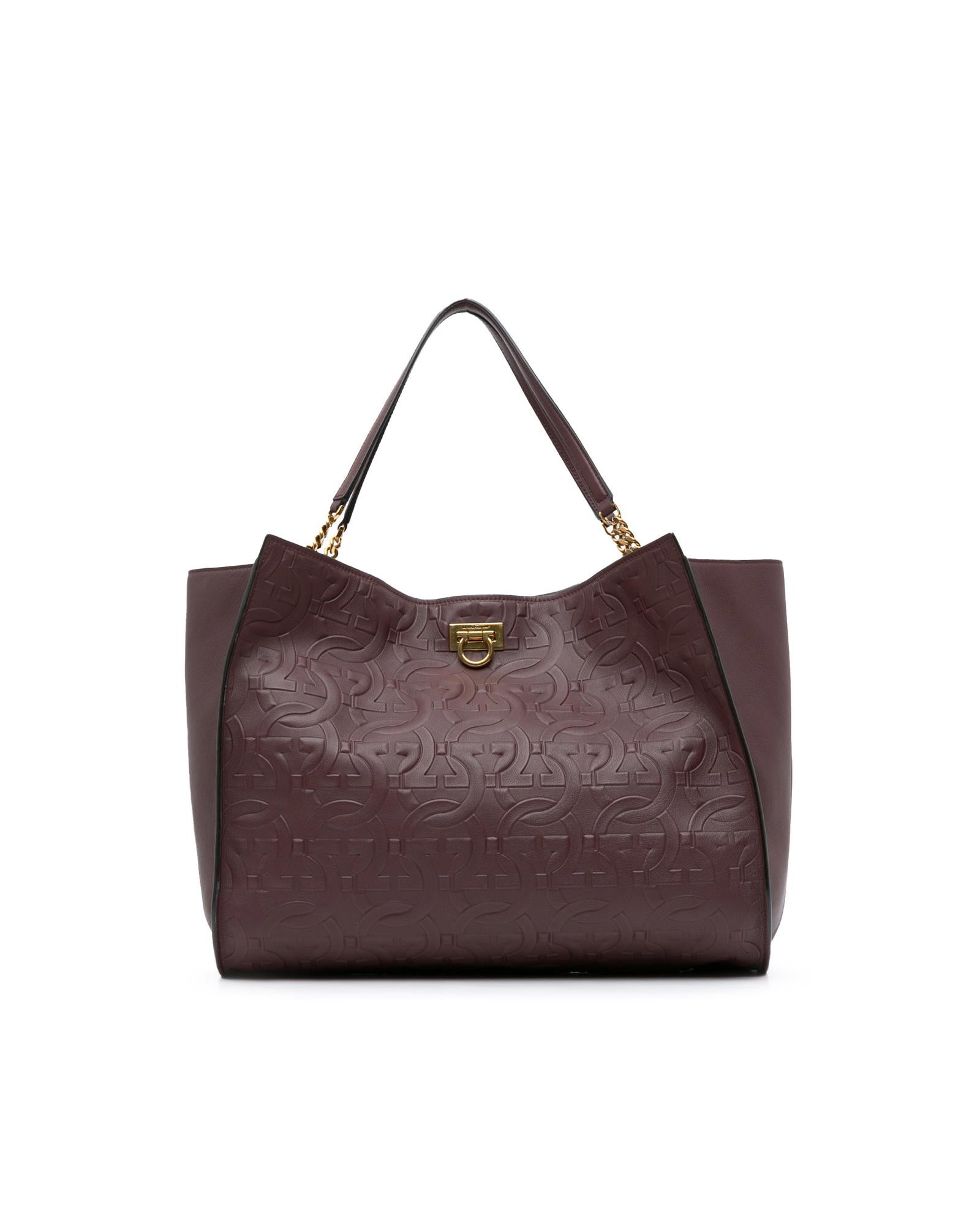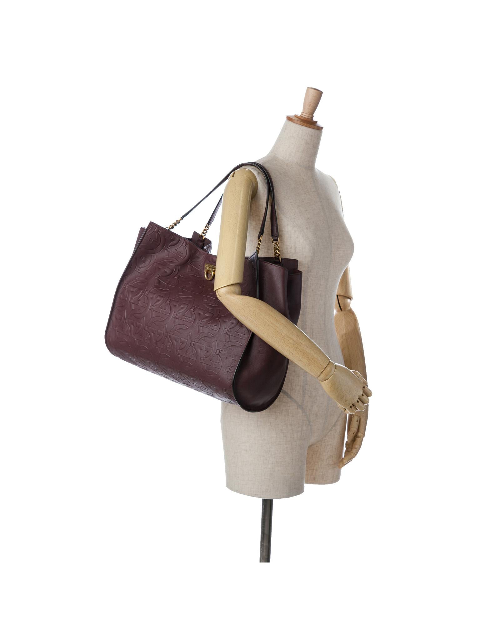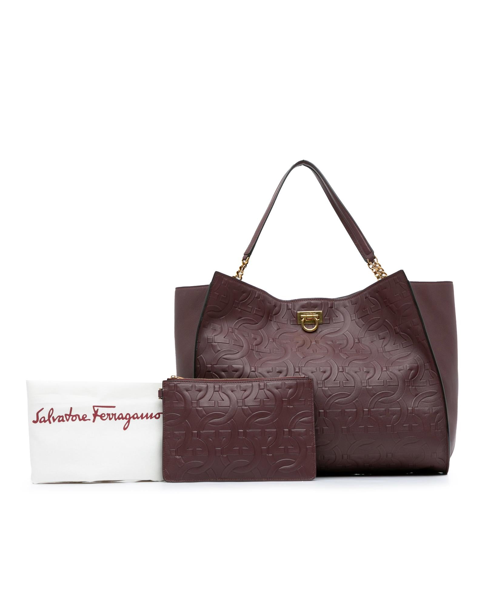 This tote features an embossed leather body flat leather handles with metal chain a removable pouch an open top and interior slip pockets.Brand: Ferragamo