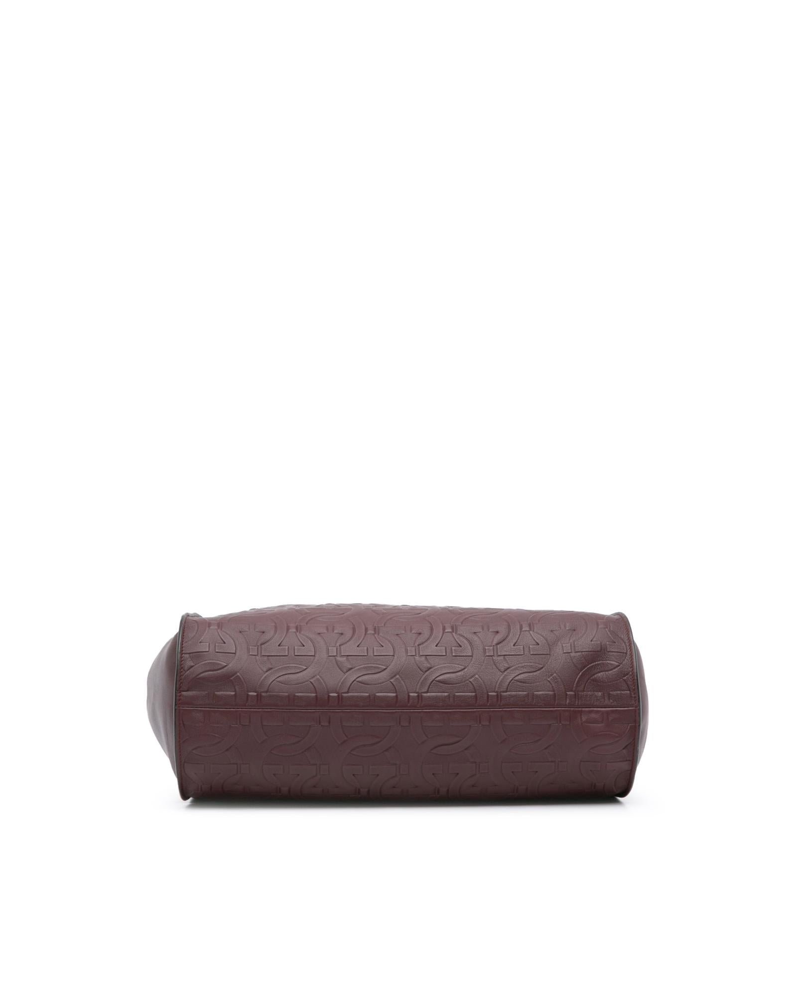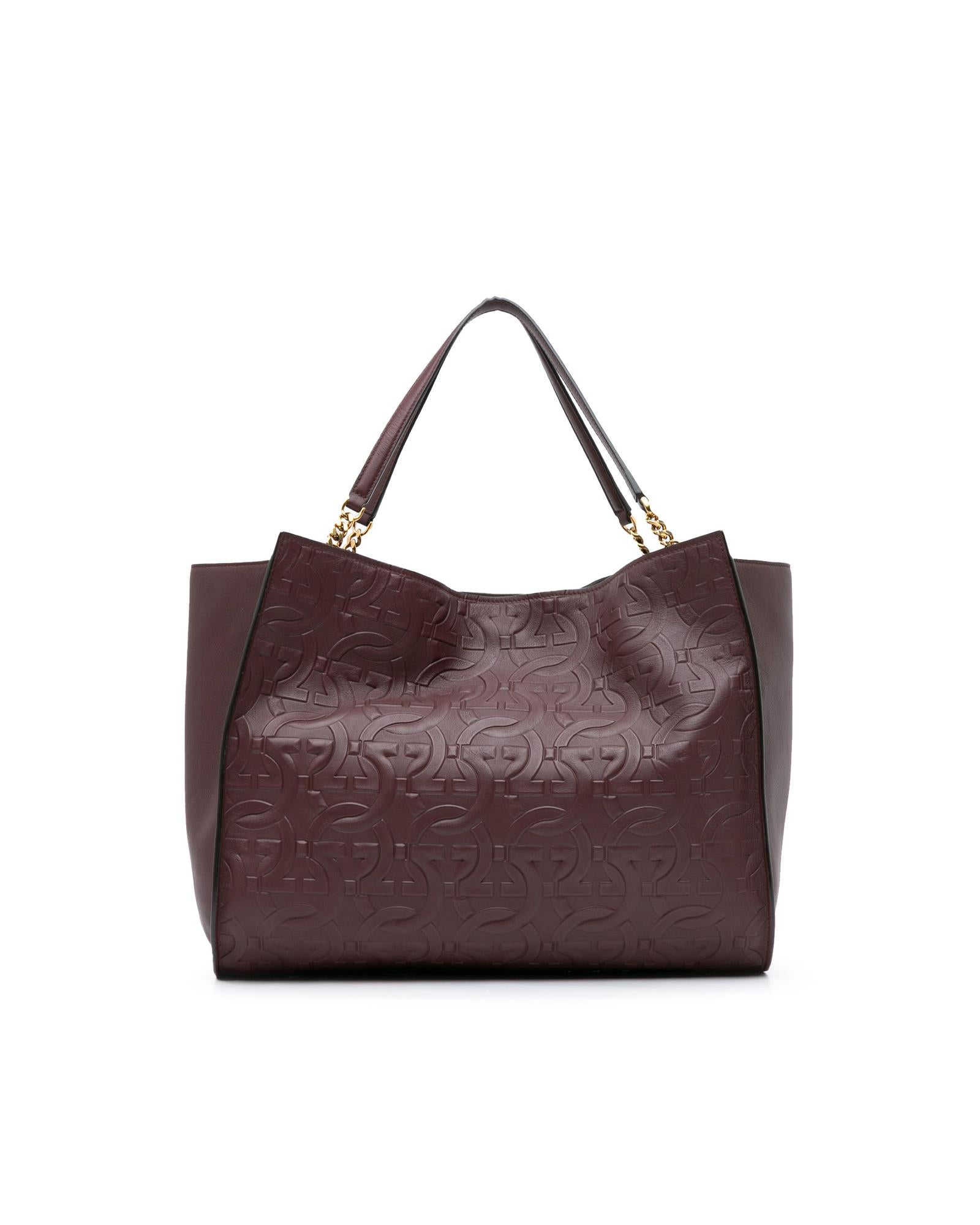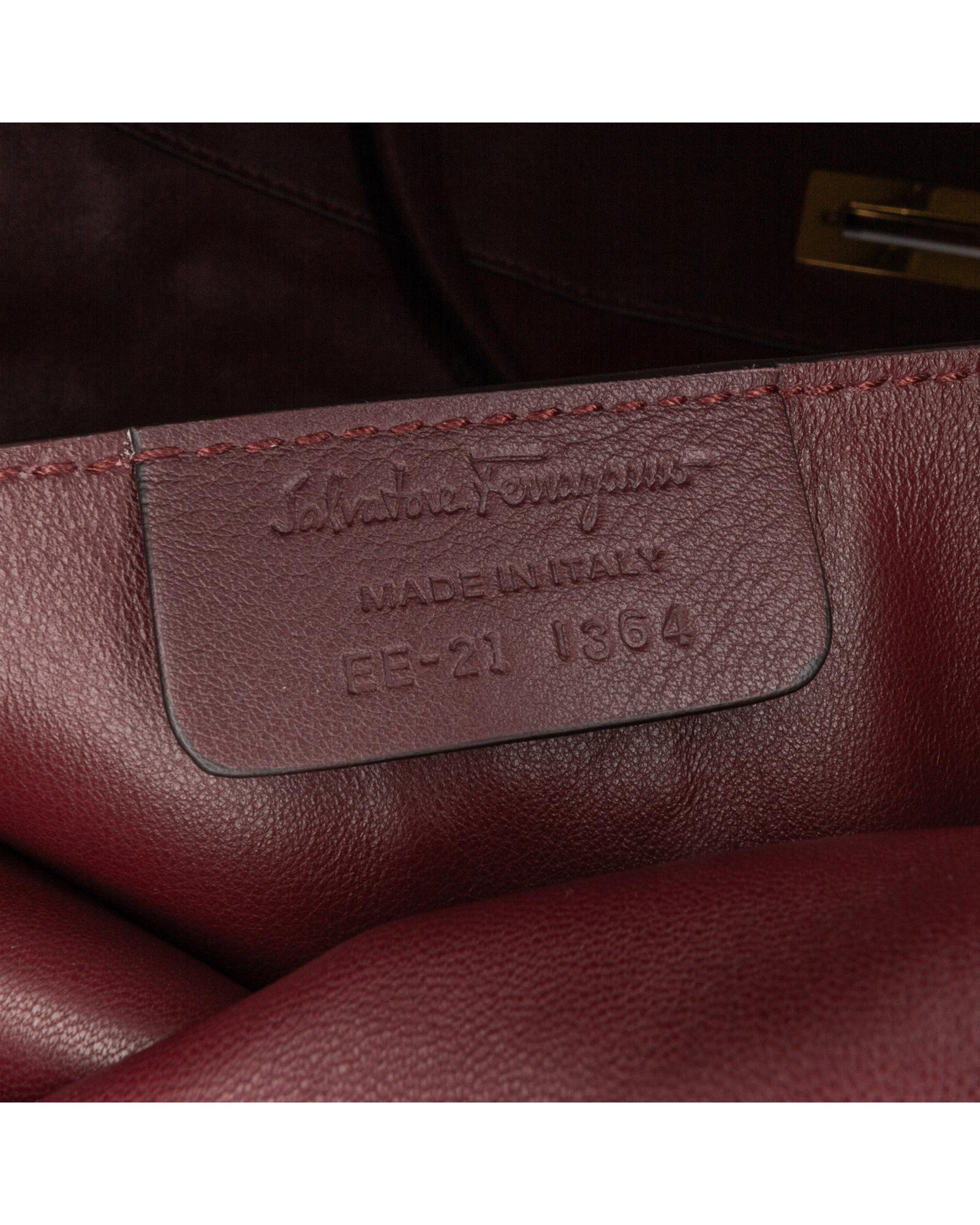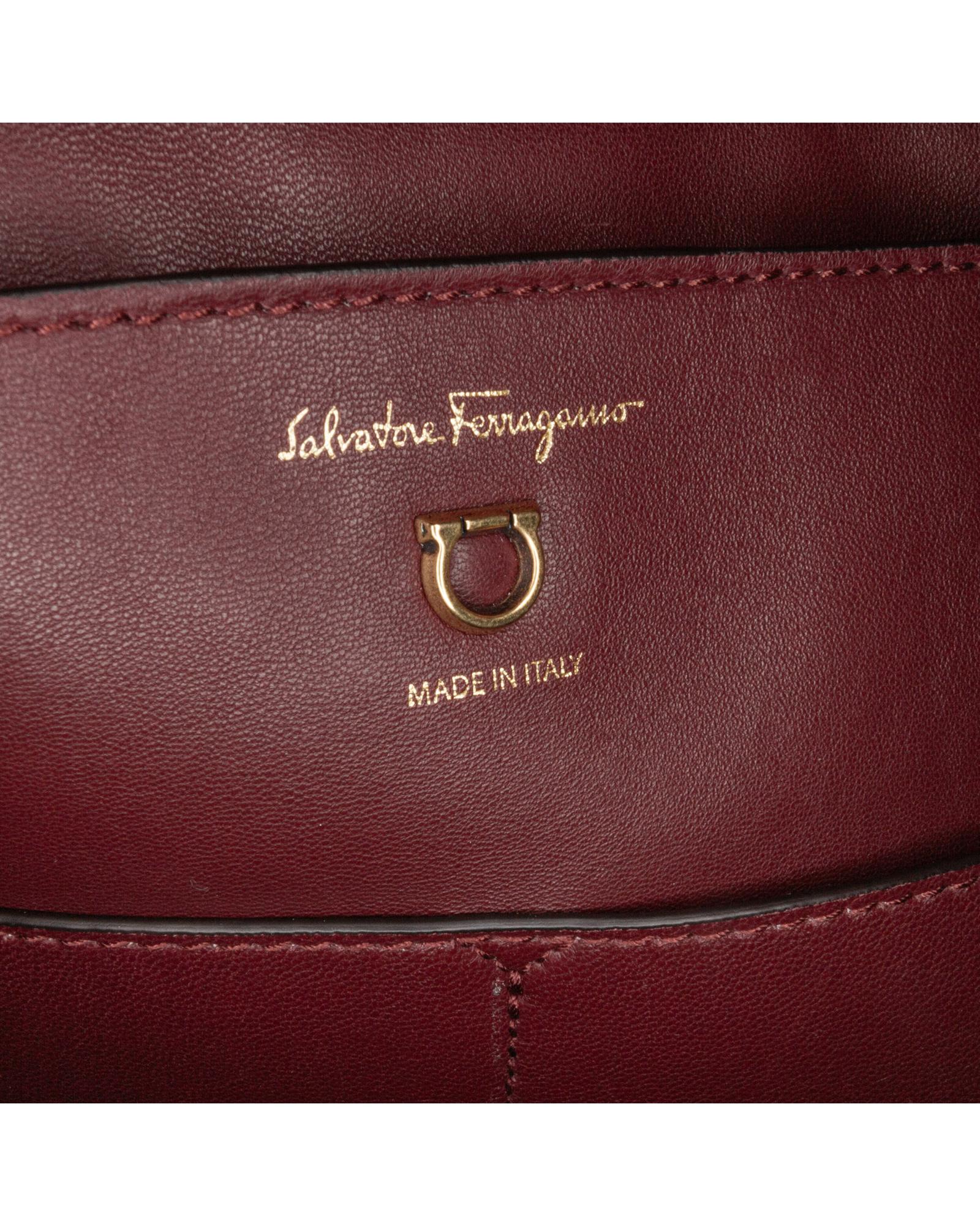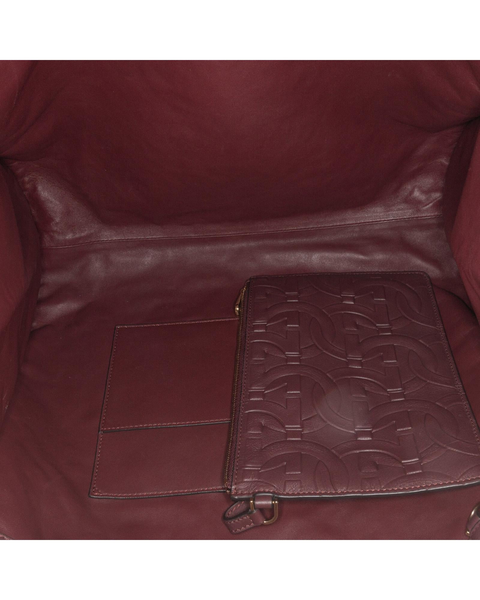 This tote features an embossed leather body flat leather handles with metal chain a removable pouch an open top and interior slip pockets.Brand: Ferragamo