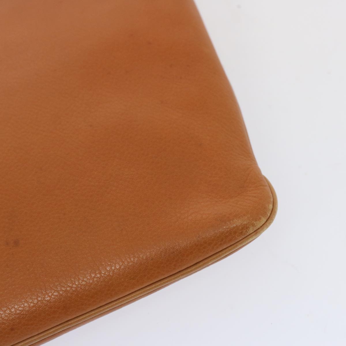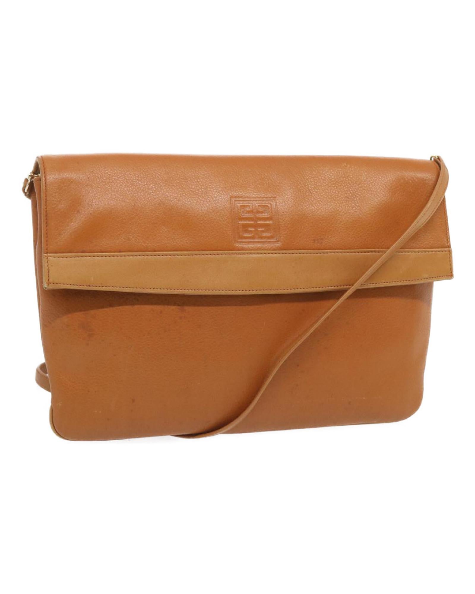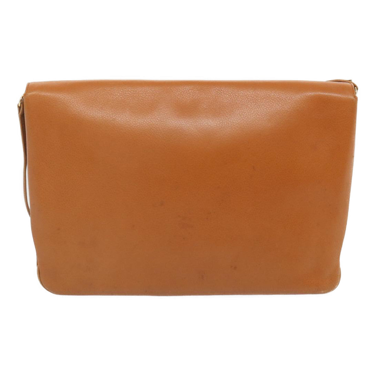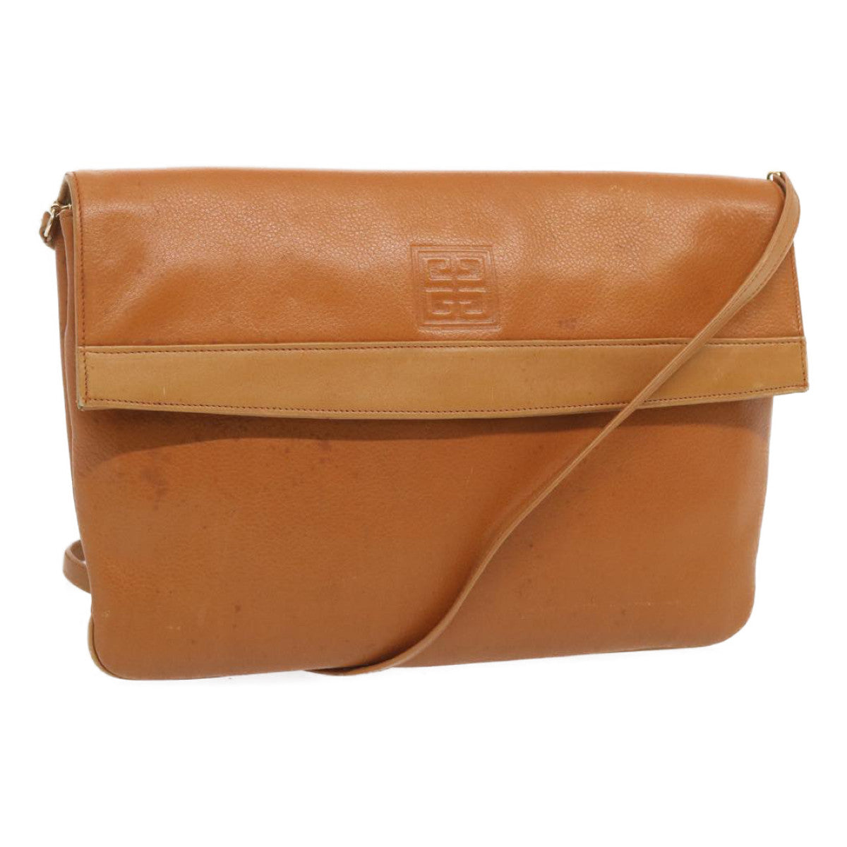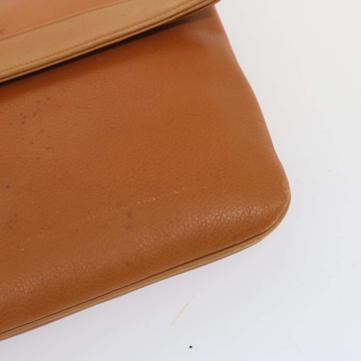 The exterior surface displays rubbing a slight loss of shape and a stain while the shoulder strap exhibits rubbing as well. There are slight scratches on the metal fittings and inside in the pockets and along the corners rubbing is noticeable. Additionally there is a persistent storage odor present within the item.